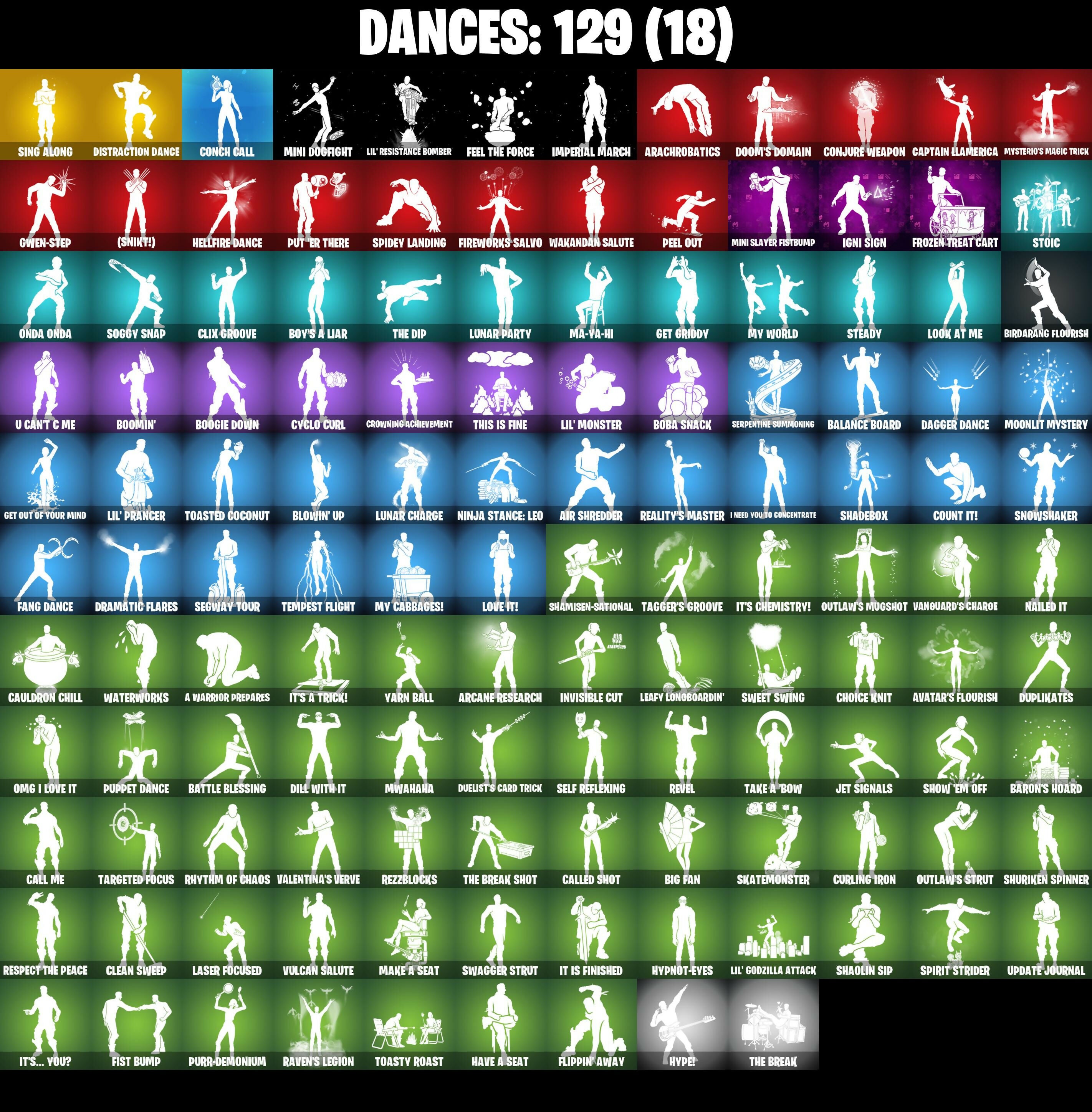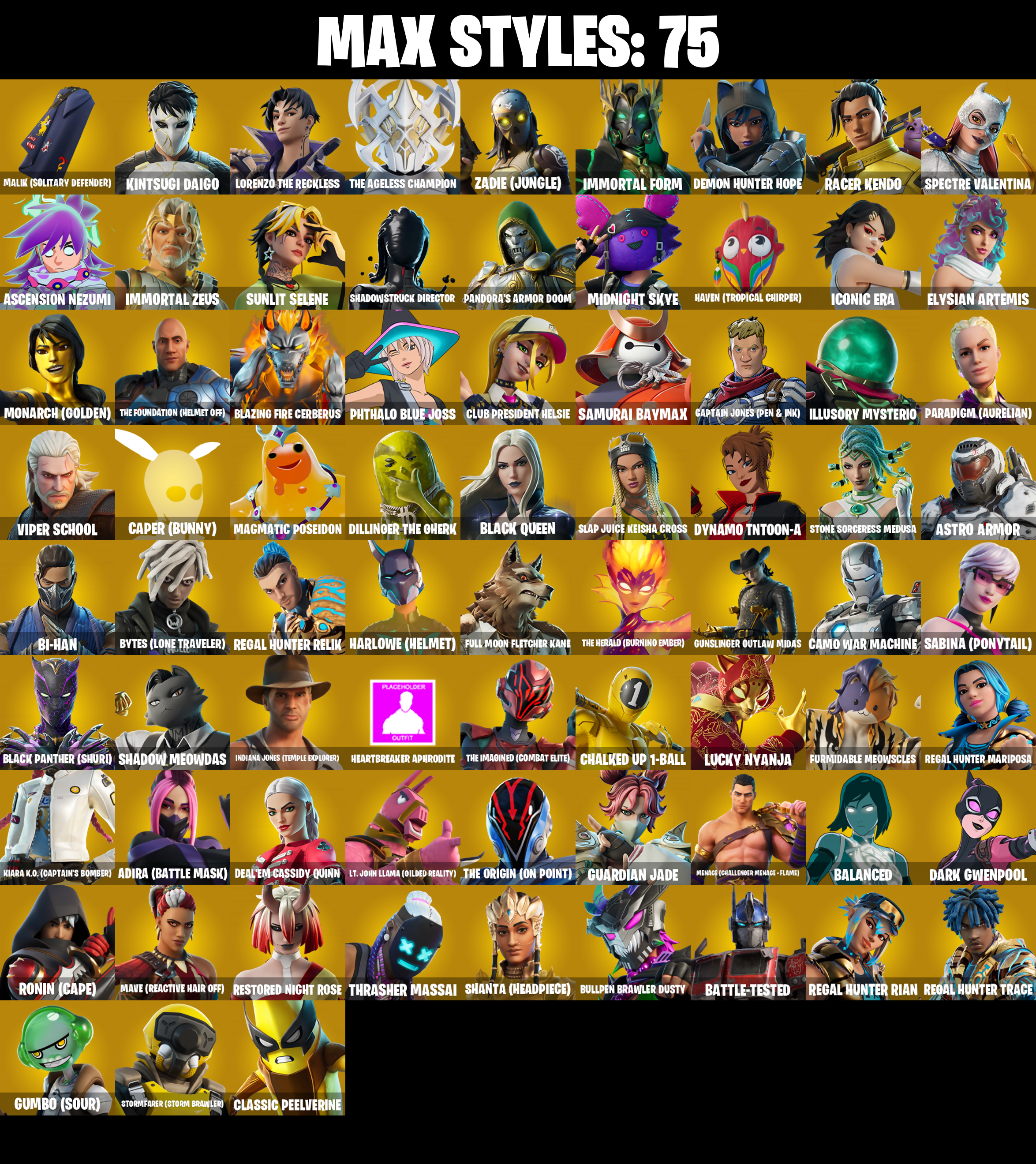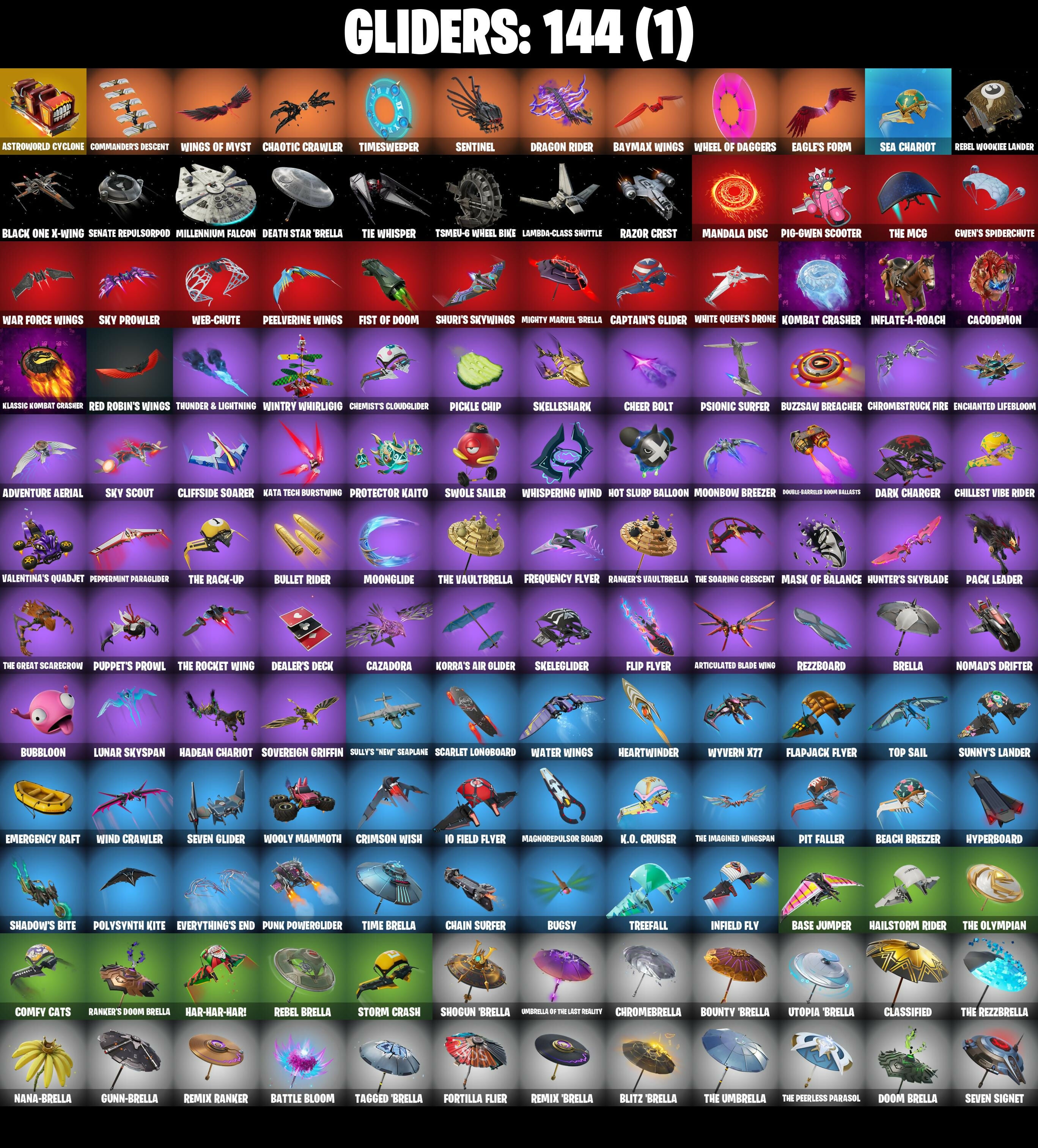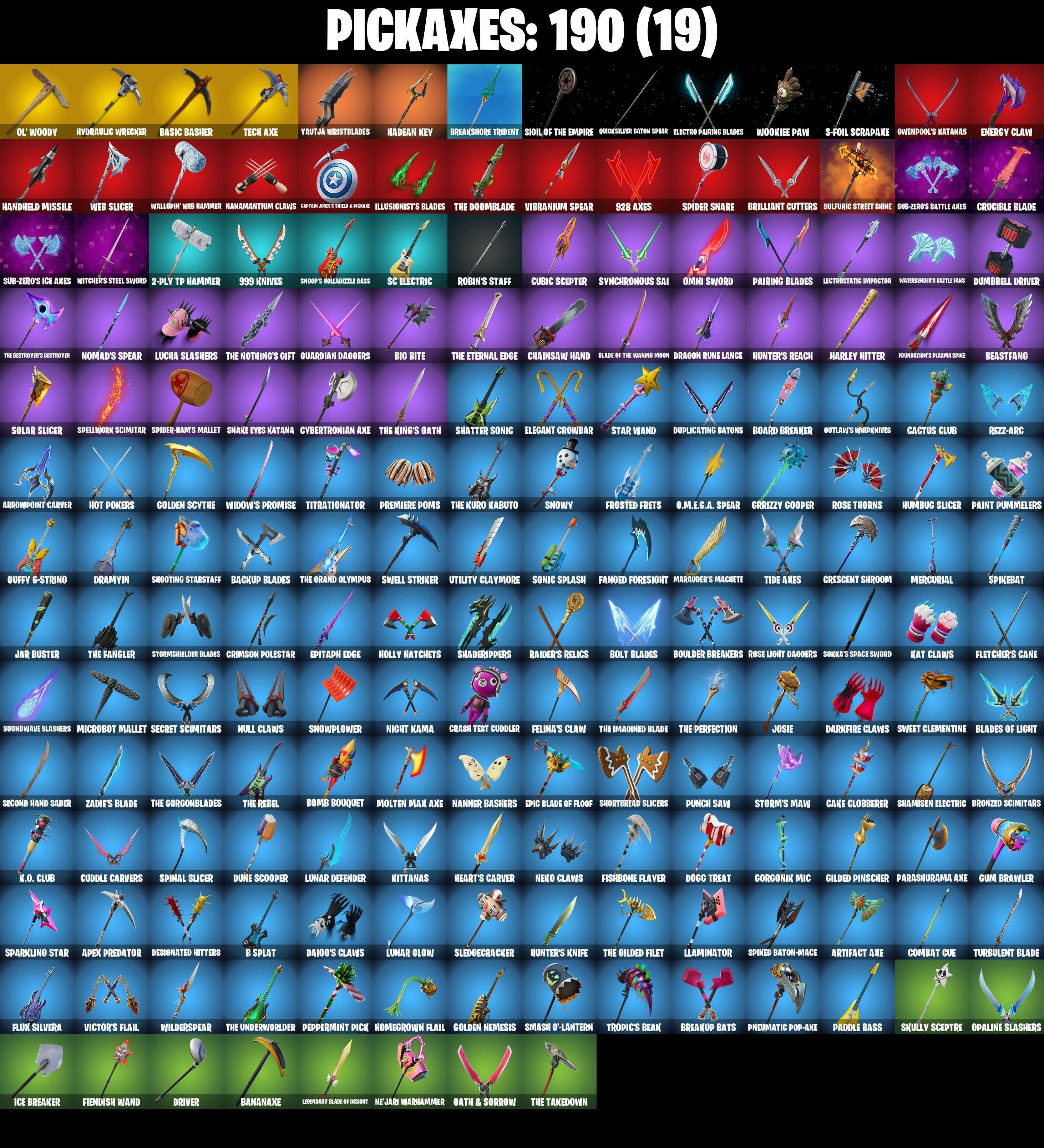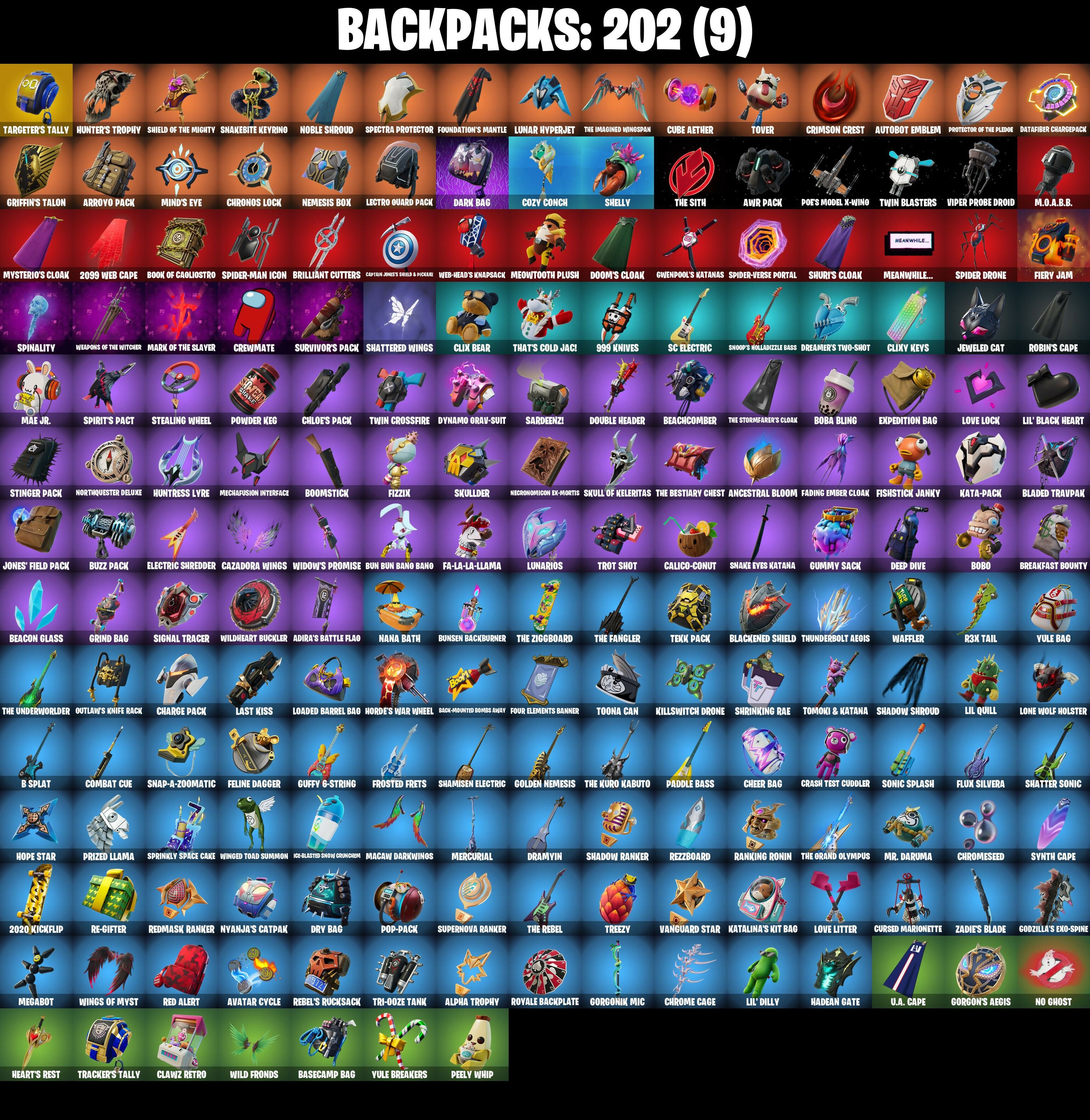 (Snikt!), 1-Ball, 2-Ply TP Hammer, 2020 Kickflip, 2099 Web Cape, 928 Axes, 999 Knives, A Warrior Prepares, AWR Pack, Adira, Adira (Battle Mask), Adira's Battle Flag, Adventure Aerial, Agent Jones, Air Shredder, Alpha Trophy, Ancestral Bloom, Apex Predator, Aphrodite, Apprentice Evie, Arachrobatics, Arcane Research, Arctic Adeline, Arrowpoint Carver, Arroyo Pack, Artemis, Articulated Blade Wing, Artifact Axe, Ascension Nezumi, Ash Williams, Astro Armor, Astroworld Cyclone, Aura, Autobot Emblem, Avatar Cycle, Avatar's Flourish, B Splat, Back-Mounted Bombs Away, Backlash, Backup Blades, Balance Board, Balanced, Bananaxe, Baron's Hoard, Base Jumper, Basecamp Bag, Basic Basher, Battle Blessing, Battle Bloom, Battle-Tested, Baymax Wings, Beach Breezer, Beachcomber, Beacon Glass, Beastfang, Bi-Han, Big Bite, Big Dill, Big Fan, Birdarang Flourish, Black One X-Wing, Black Panther (Shuri), Black Queen, Blackened Shield, Blade of the Waning Moon, Bladed Travpak, Blades of Light, Blazing Fire Cerberus, Blitz 'Brella, Blowin' Up, Board Breaker, Boba Bling, Boba Snack, Bobo, Bolt Blades, Bomb Bouquet, Boogie Down, Book of Cagliostro, Boomin', Boomstick, Boulder Breakers, Bounty 'Brella, Boy's A Liar, Breakaway, Breakfast Bounty, Breakshore Trident, Breakup Bats, Brella, Brilliant Cutters, Bronzed Scimitars, Bubbloon, Bugsy, Bullet Rider, Bullpen Brawler Dusty, Bun Bun Bang Bang, Bunsen Backburner, Buzz Pack, Buzzsaw Breacher, Bytes, Bytes (Lone Traveler), Cacodemon, Cactus Club, Cake Clobberer, Calico-Conut, Call Me, Called Shot, Camo War Machine, Caper, Caper (Bunny), Captain America's Shield & Pickaxe, Captain Jones, Captain Jones (Pen & Ink), Captain Jones's Shield & Pickle, Captain Llamerica, Captain's Glider, Cassidy Quinn, Catwoman Comic Book Outfit, Cauldron Chill, Cazadora, Cazadora Wings, Cerberus, Chain Surfer, Chainsaw Hand, Chalked Up 1-Ball, Chaos Director, Chaotic Crawler, Charge Pack, Cheer Bag, Cheer Bolt, Chemist's Cloudglider, Chill Challenger, Chillest Vibe Rider, Chloe Frazer, Chloe's Pack, Choice Knit, Chord Kahele, Chrome Cage, Chrome Punk, Chromebrella, Chromeseed, Chromestruck Fire, Chronos Lock, Classic Peelverine, Classified, Clawz Retro, Clean Sweep, Cliffside Soarer, Clix, Clix Bear, Clix Groove, Clixy Keys, Club President Helsie, Combat Cue, Comfy Cats, Commander's Descent, Conch Call, Conjure Weapon, Count It!, Cozy Conch, Crash Test Cuddler, Crescent Shroom, Crewmate, Crimson Crest, Crimson Polestar, Crimson Wish, Crowning Achievement, Crucible Blade, Cube Aether, Cubic Scepter, Cuddle Carvers, Curling Iron, Cursed Marionette, Cybertronian Axe, Cyclo Curl, Dagger Dance, Daigo, Daigo's Claws, Dark Bag, Dark Bomber, Dark Charger, Dark Gwenpool, Darkfire Claws, Darth Vader, Datafiber Chargepack, Deal'em Cassidy Quinn, Dealer's Deck, Death Star 'Brella, Deep Dive, Demon Hunter Hope, Designated Hitters, Dill With It, Dillinoer The Qherk, Distraction Dance, Doctor Strange, Dogg Treat, Doom, Doom Brella, Doom Slayer, Doom's Cloak, Doom's Domain, Double Header, Double-Barreled Boom Ballasts, Dragon Rider, Dragon Rune Lance, Dramatic Flares, Dramyin, Dreamer's Two-Shot, Driver, Dry Bag, Duelist's Card Trick, Dumbbell Driver, Dune Scooper, Dupli-Hate, Duplicating Batons, Duplikates, Dusk Knight, Dusty, Dynamo Grav-Suit, Dynamo Tntina, Dynamo Tntoon-A, Eagle's Form, Electric Shredder, Electro Pairing Blades, Electrostatic Impactor, Elegant Crowbar, Elysian Artemis, Emergency Raft, Emma Frost, Enchanted Lifebloom, Energy Claw, Epic Blade of Floof, Epitaph Edge, Era, Erisa, Everything's End, Evie, Expedition Bag, Fa-La-La-Llama, Fade, Fading Ember Cloak, Fang Dance, Fanged Foresight, Feel The Force, Felina, Felina's Claw, Feline Dagger, Fiendish Wand, Fiery Jam, Fireworks Salvo, Fishbone Flayer, Fishstick Janky, Fist Bump, Fist of Doom, Fizzix, Flapjack Flyer, Fletcher Kane, Fletcher's Cane, Flip Flyer, Flippin' Away, Flux Silvera, Fortilla Flier, Foundation's Mantle, Foundation's Plasma Spike, Four Elements Banner, Frequency Flyer, Frosted Frets, Frozen Treat Cart, Full Moon Fletcher Kane, Furridable Meowscles, Geralt Of Rivia, Get Griddy, Get Out Of Your Mind, Gilded Pinscher, Godzilla's Exo-Spine, Golden Nemesis, Golden Scythe, Gorgon's Aegis, Gorgonik Mic, Griffin's Talon, Grind Bag, Grizzly Gooper, Grriz, Guardian Daggers, Guardian Jade, Guffy 6-String, Gum Brawler, Gumbo, Gumbo (Sour), Gummy Sack, Gunn-Brella, Gunnar, Gunslinger Outlaw Midas, Gwen's Spiderchute, Gwen-Step, Gwenpool, Gwenpool's Katanas, Hadean Chariot, Hadean Gate, Hadean Key, Hades, Hailstorm Rider, Hana, Handheld Missile, Har-Har-Har!, Harley Hitter, Harlowe, Harlowe (Helmet), Have A Seat, Haven, Haven (Tropical Chirper), Haylee Skye, Heart's Carver, Heart's Rest, Heartbreaker Aphrodite, Heartwinder, Hellfire Dance, Helsie, Hero Baymax, Holly Hatchets, Homegrown Flail, Hope Star, Horde's War Wheel, Hot Pokers, Hot Slurp Balloon, Humbug Slicer, Hunter's Knife, Hunter's Reach, Hunter's Skyblade, Hunter's Trophy, Huntress Lyre, Hydraulic Wrecker, Hype!, Hyperboard, Hypnot-Eyes, I Need You To Concentrate, Ice Breaker, Ice-Blasted Snow Crunchin, Iconic Era, Igni Sign, Illusionist's Blades, Illusory Mysterio, Immortal Form, Immortal Zeus, Imperial March, Indiana Jones, Indiana Jones (Temple Explorer), Infield Fly, Inflate-A-Roach, Invisible Cut, Io Field Flyer, It Is Finished, It's A Trick!, It's Chemistry!, It's... You?, Jade, Jar Buster, Jet Signals, Jeweled Cat, Jones' Field Pack, Josie, Joss, Juliet, K.O. Club, K.O. Cruiser, Kat Claws, Kata Tech Burstwing, Kata-Pack, Katalina, Katalina's Kit Bag, Keisha Cross, Kendo, Kiara K.O., Kiara K.O. (Captain's Bomber), Killswitch, Killswitch Drone, Kintsugi Daigo, Kittanas, Klassic Kombat Crasher, Kombat Crasher, Kondor, Korra, Korra's Air Glider, Krisabelle, Lambda-Class Shuttle, Lara Croft, Laser Focused, Last Kiss, Leafy Longboardin', Lectro Guard Pack, Legendary Blade of Infinity, Lennox Rose, Lexa, Lightrider, Lil Quill, Lil' Black Heart, Lil' Dilly, Lil' Godzilla At