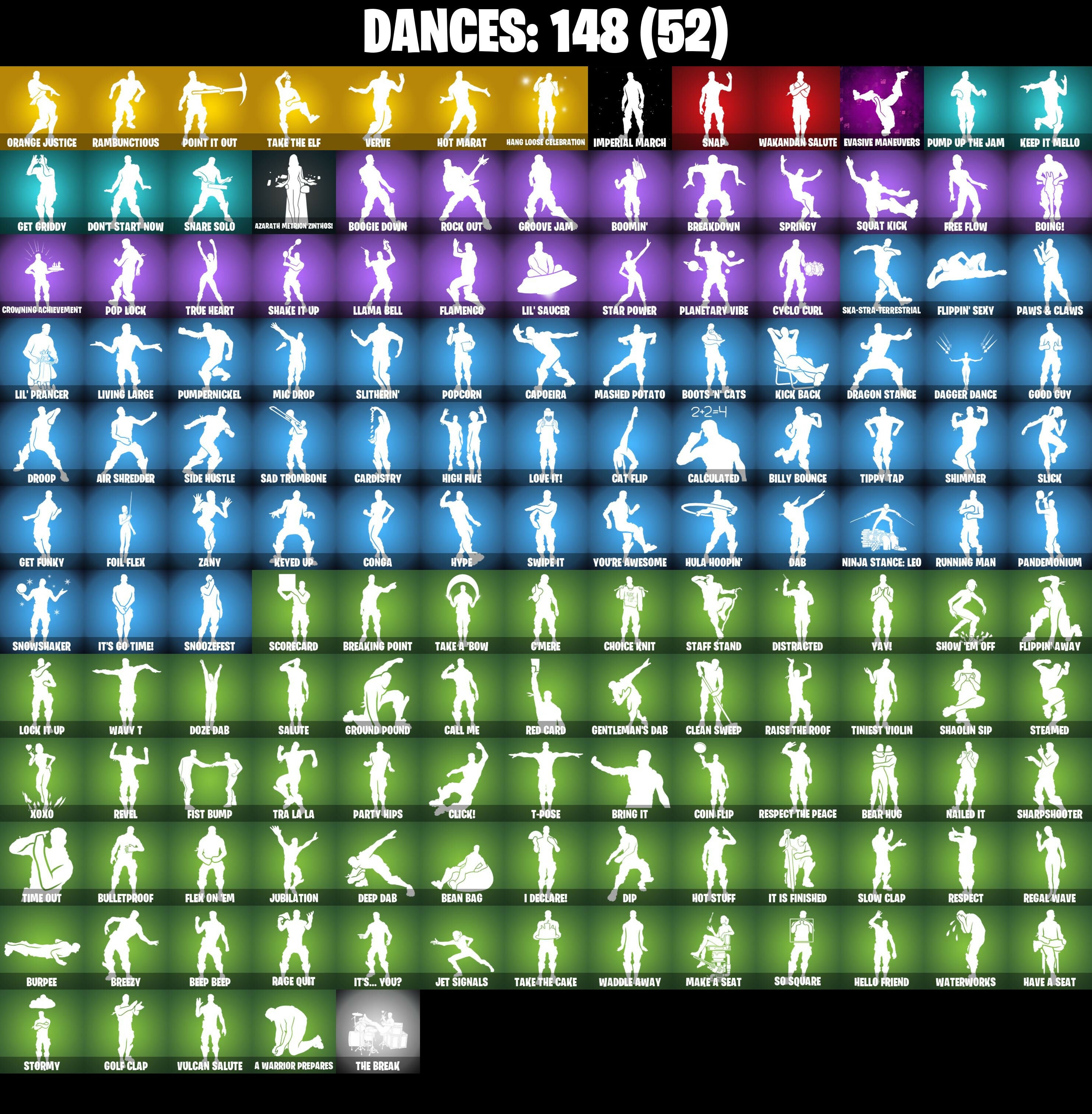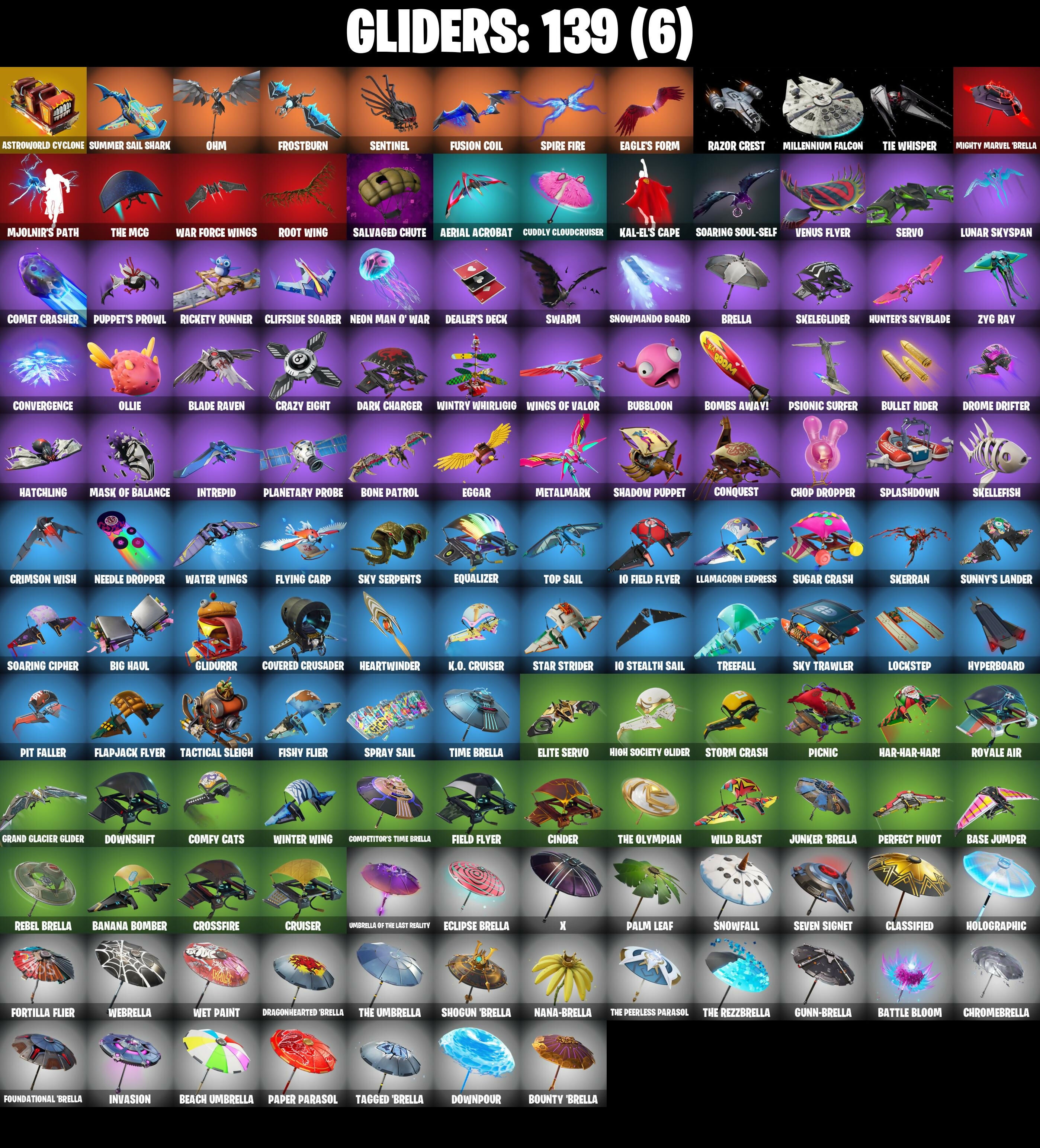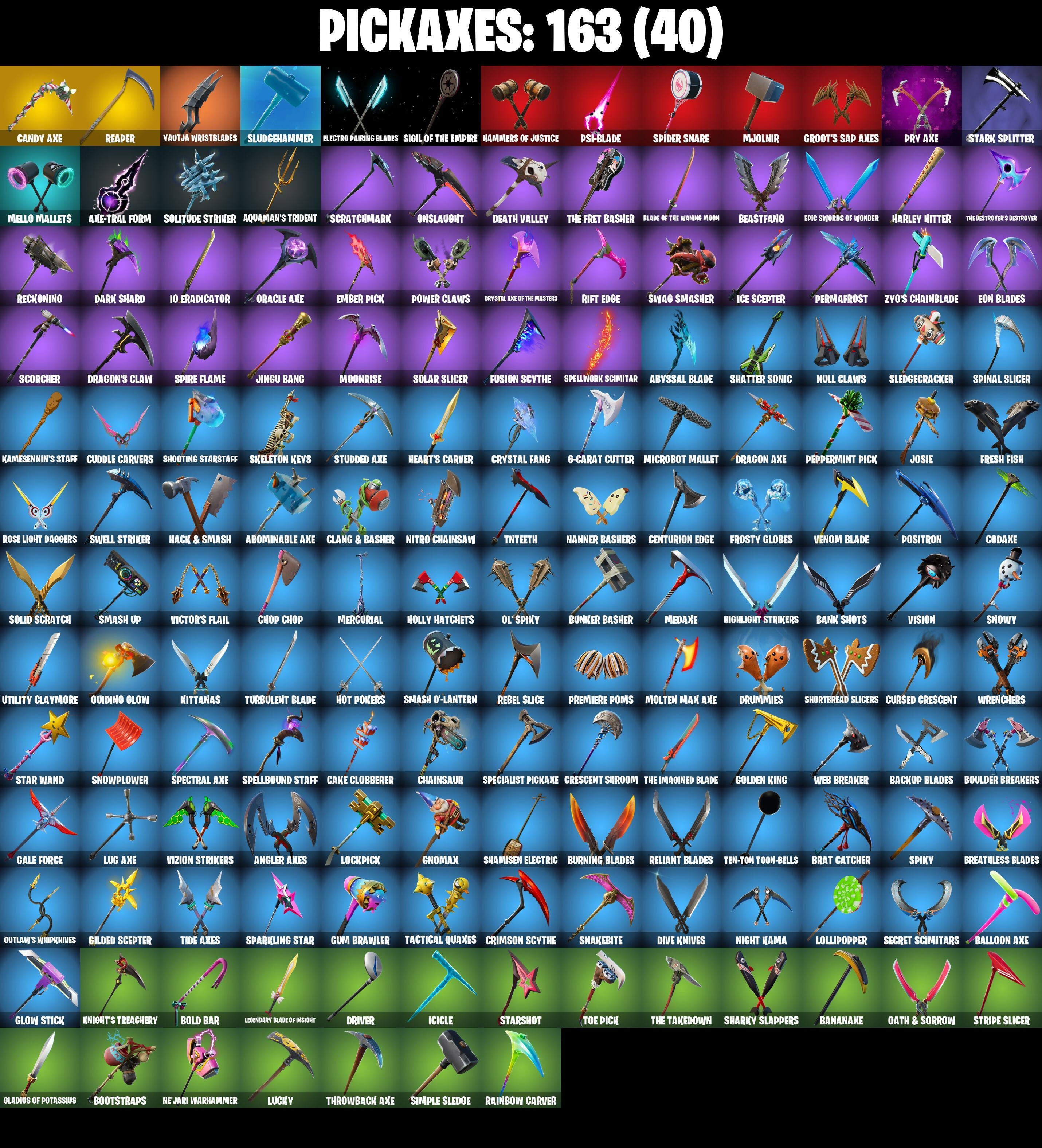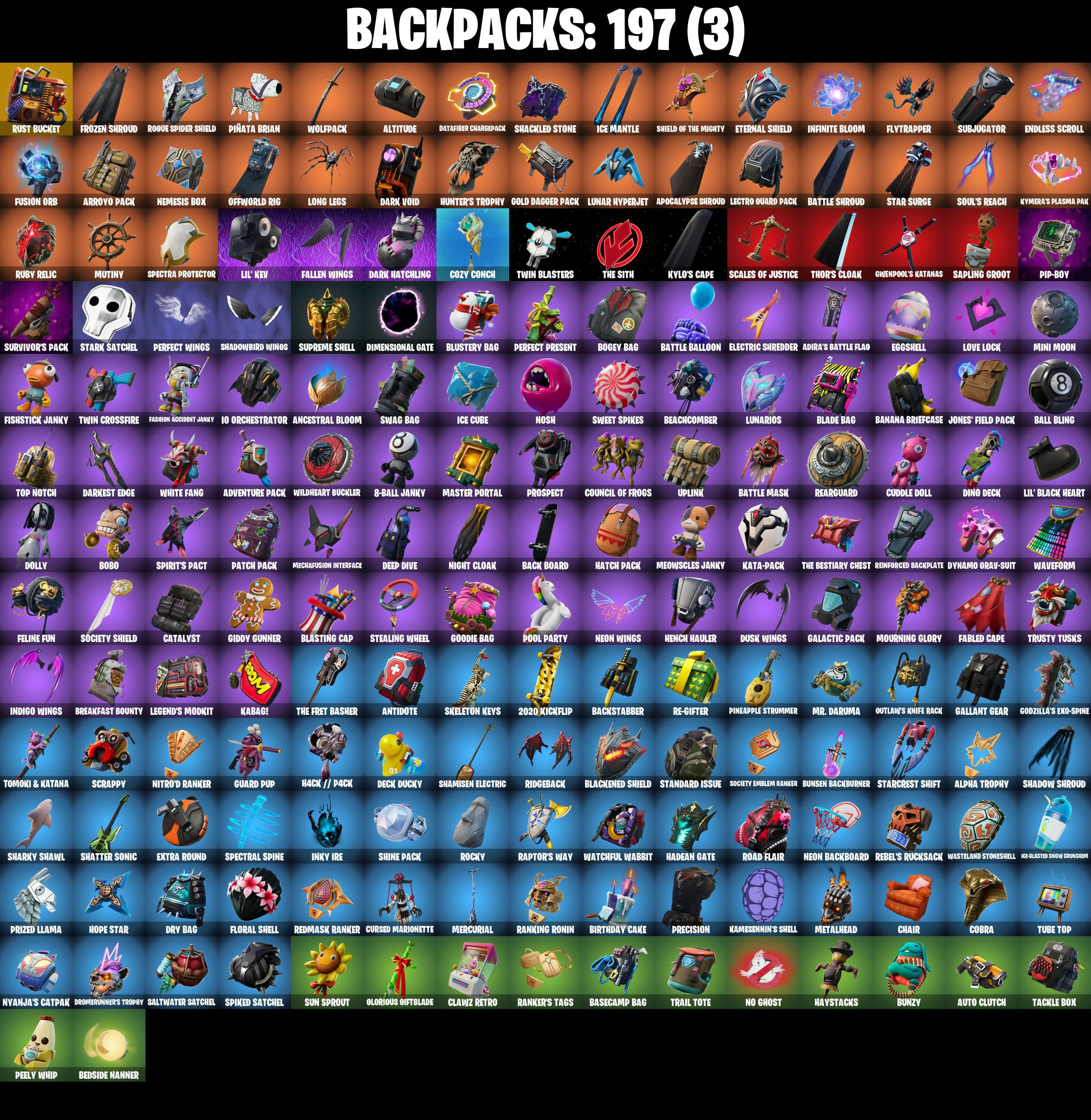 10 Orchestrator, 2020 Kickflip, 6-Carat Cutter, 8-Ball Janky, 8-Ball Vs Scratch, A Warrior Prepares, Abominable Axe, Absenz, Abyssal Blade, Adira's Battle Flag, Adventure Pack, Aerial Acrobat, Agent Jones, Agent Jones (Jump 31), Agent Peely, Air Shredder, Alpha Trophy, Altitude, Ancestral Bloom, Angler Axes, Antidote, Apocalypse Shroud, Aquaman, Aquaman's Trident, Arachne, Arctic Adeline, Arroyo Pack, Assault Trooper, Astroworld Cyclone, Auto Clutch, Axe-Tral Form, Axo, Back Board, Backstabber, Backup Blades, Ball Bling, Balloon Axe, Banana Bomber, Banana Briefcase, Bananaxe, Bank Shots, Base Jumper, Basecamp Bag, Battle Balloon, Battle Bloom, Battle Mask, Battle Shroud, Battlehawk, Beach Umbrella, Beachcomber, Bean Bag, Bear Hug, Beastfang, Bedside Nanner, Beep Beep, Big Haul, Big Mouth, Billy Bounce, Birthday Cake, Black, Black Werewolf, Blackened Shield, Blackheart, Blackheart (Stage 8), Blacklight, Blade Bag, Blade Of The Waning Moon, Blade Raven, Blasting Cap, Blustery Bag, Bobo, Bogey Bag, Boing!, Bold Bar, Bombs Away!, Bone Patrol, Bonny Brawler, Boogie Down, Boomin', Boots 'N' Cats, Bootstraps, Boulder Breakers, Bounty 'Brella, Boxy, Brat Catcher, Breakdown, Breakfast Bounty, Breaking Point, Breathless Blades, Breezy, Brella, Bring It, Brutus, Bubbloon, Bullet Rider, Bulletproof, Bullseye, Bunker Basher, Bunsen Backburner, Bunzy, Burning Blades, Burpee, C'mere, Cake Clobberer, Calamity, Calamity Stage 5, Calculated, Call Me, Cameo Vs Chic, Candy Axe, Capoeira, Carbide, Carbide Armor Stage 5, Cardistry, Cat Flip, Catalyst, Catrina, Centurion, Centurion Edge, Chainsaur, Chair, Chigusa, Choice Knit, Chop Chop, Chop Dropper, Chopper, Chromebrella, Cinder, Clang & Basher, Classified, Clawz Retro, Clean Sweep, Click!, Cliffside Soarer, Cloaked Star, Cluck, Cluck (Slurpy), Cobalt, Cobra, Codaxe, Coin Flip, Comet Crasher, Comfy Cats, Competitor's Time Brella, Conga, Conquest, Convergence, Council Of Frogs, Covered Crusader, Cozy Chomps, Cozy Conch, Crazy Eight, Crescent Shroom, Crimson Scythe, Crimson Wish, Crossfire, Crowning Achievement, Cruiser, Cryptic, Crystal, Crystal Axe Of The Masters, Crystal Fang, Cuddle Carvers, Cuddle Doll, Cuddly Cloudcruiser, Cursed Crescent, Cursed Marionette, Cyclo Curl, Dab, Dagger Dance, Dark Charger, Dark Hatchling, Dark Shard, Dark Tricera Ops, Dark Vanguard, Dark Void, Darkest Edge, Datafiber Chargepack, Deadfire, Deadpool, Dealer's Deck, Death Valley, Deck Ducky, Deep Dab, Deep Dive, Diamond Diva, Dimensional Gate, Dino Deck, Dip, Dire, Distracted, Dive Knives, Dizzie, Dj Yonder, Doctor Slone, Dolly, Don't Start Now, Doublecross, Downpour, Downshift, Doze Dab, Dragon Axe, Dragon Stance, Dragon's Claw, Dragonhearted 'Brella, Drift, Drift Stage 5, Driver, Drome Drifter, Dromerunner's Trophy, Droop, Drummies, Dry Bag, Dusk, Dusk Wings, Dynamic Dribbler, Dynamo Grav-Suit, Eagle's Form, Eclipse Brella, Eggar, Eggshell, Electric Shredder, Electro Pairing Blades, Elite Servo, Ember Pick, Endless Scroll, Enforcer, Eon Blades, Epic Swords Of Wonder, Equalizer, Eternal Knight, Eternal Shield, Evasive Maneuvers, Extra Round, Fable, Fabled Cape, Fade, Fallen Love Ranger, Fallen Wings, Fashion Accident Janky, Feline Fun, Field Flyer, Fireworks Team Leader, Fishstick, Fishstick Janky, Fishy Flier, Fist Bump, Flamenco, Flapjack Flyer, Flex On 'Em, Flippin' Away, Flippin' Sexy, Floral Shell, Flying Carp, Flytrap, Flytrapper, Foil Flex, Fortilla Flier, Foundational 'Brella, Free Flow, Fresh Fish, Frostburn, Frosty Globes, Frozen Shroud, Fusion, Fusion Coil, Fusion Orb, Fusion Scythe, Galactic Pack, Gale Force, Gallant Gear, Gear Specialist Maya, Gentleman's Dab, Get Funky, Get Griddy, Giddy Gunner, Giddy-up, Gilded Scepter, Ginger Gunner, Gladius Of Potassius, Glidurrr, Glorious Giftblade, Glow Stick, Gnomax, Godzilla's Exo-Spine, Gold Dagger Pack, Gold Midas, Golden King, Golf Clap, Good Guy, Goodie Bag, Grand Glacier Glider, Groot, Groot's Sap Axes, Groove Jam, Ground Pound, Guard Pup, Guggimon, Guiding Glow, Gum Brawler, Gunn-Brella, Gwenpool's Katanas, Hack & Smash, Hack // Pack, Hadean Gate, Hammers Of Justice, Hang Loose Celebration, Happy, Har-Har-Har!, Harley Hitter, Hatch Pack, Hatchling, Have A Seat, Haystacks, Haze, Head (Droopy), Heart's Carver, Heartwinder, Hello Friend, Hench Hauler, High Five, High Society Glider, Highlight Strikers, Holiday Boxy, Holly Hatchets, Holographic, Hope Star, Hot Marat, Hot Pokers, Hot Stuff, Hula Hoopin', Hunter's Skyblade, Hunter's Trophy, Huntress, Hybrid, Hybrid (Stage 4), Hype, Hyperboard, I Declare!, Ice Cube, Ice King (Gold), Ice Mantle, Ice Scepter, Ice-Blasted Snowy Crunch, Icicle, Imperial March, Indigo Wings, Inferno, Infinite Bloom, Inky Ire, Intrepid, Invasion, Io Eradicator, Io Field Flyer, Io Stealth Sail, It Is Finished, It's Go Time!, It's... You?, Jack Gourdon, Jennifer Walters, Jet Signals, Jingu Bang, Joey, Jones' Field Pack, Josie, Journey Vs Hazard, Jubilation, Jules, Jungle Scout, Junker 'Brella, K.O. Cruiser, Kabag!, Kal-El's Cape, Kamesennin's Shell, Kamesennin's Staff, Kane, Kata-Pack, Keep It Mello, Keyed Up, Kick Back, Kit, Kittanas, Knight's Treachery, Kondor, Krisabelle, Kylo Ren, Kylo's Cape, Kymera, Kymera's Plasma Pak, Laguna, Lara Croft, Lectro Guard Pack, Legend's Modkit, Legendary Blade Of Insight, Lexa, Lexa (Warstrike), Lil' Black Heart, Lil' Kev, Lil' Prancer, Lil' Saucer, Liteshow, Living Large, Llama Bell, Llamacorn Express, Lock It Up, Lockpick, Lockstep, Lollipopopper, Long Legs, Love It!, Love Lock, Lt. Evergreen, Lucky, Lug Axe, Lunar Hyperjet, Lunar Skyspan, Lunarios, Lynx, Lynx (Stage 4 - No Ponytail), Make A Seat, Mancake, Mandalorian, Mashed Potato, Mask Of Balance, Masked, Master Portal, Match Point, Mave, Mave (Reactive Hair Off), Mechafusion Interface, Medaxe, Megumi, Mello Mallets, Menace, Menace (Challenger Menace - Flame), Meowscles, Meowscles Janky, Mercurial, Metalhead, Metalmark, Mic Drop, Microbot Mallet, Mighty Marvel 'Brella, Millennium Falcon, Mini Moon, Mjolnir,