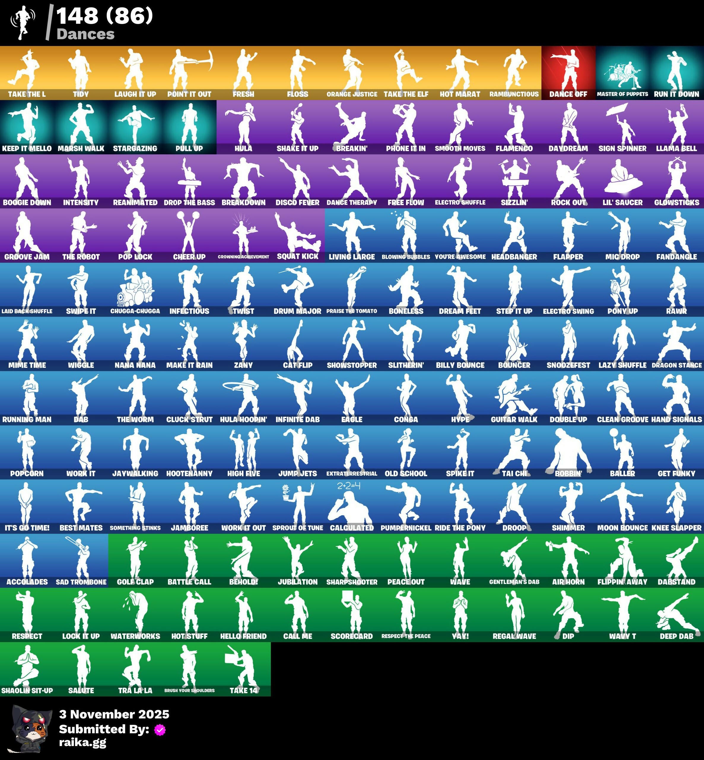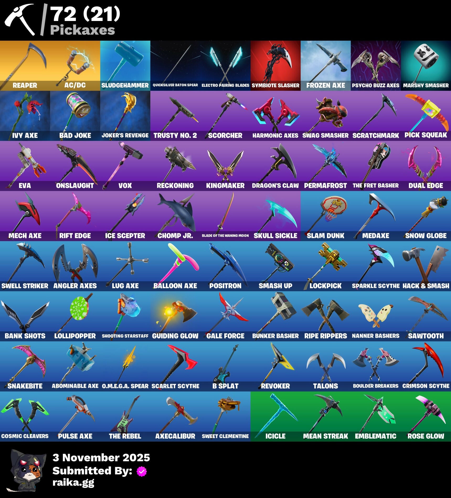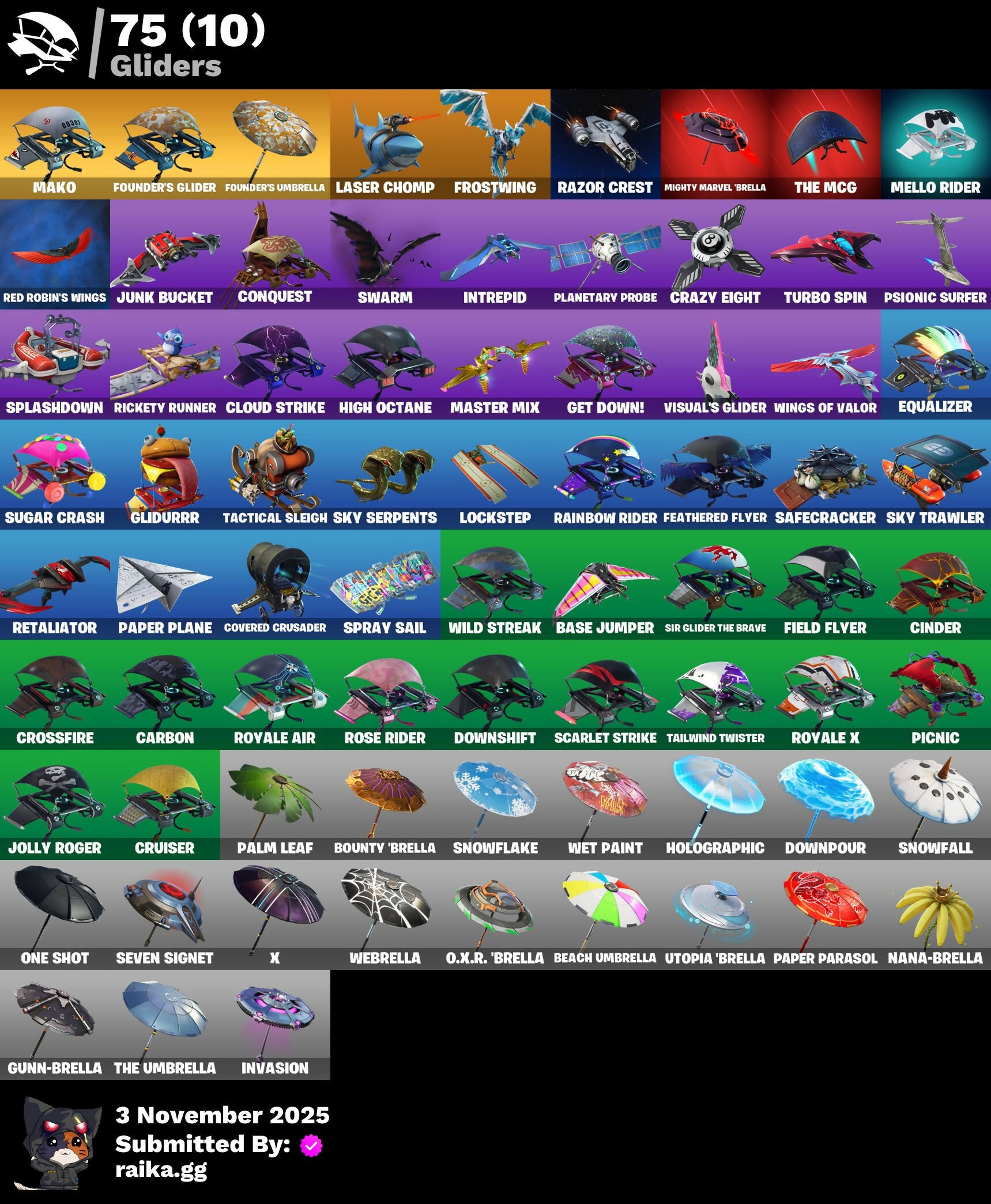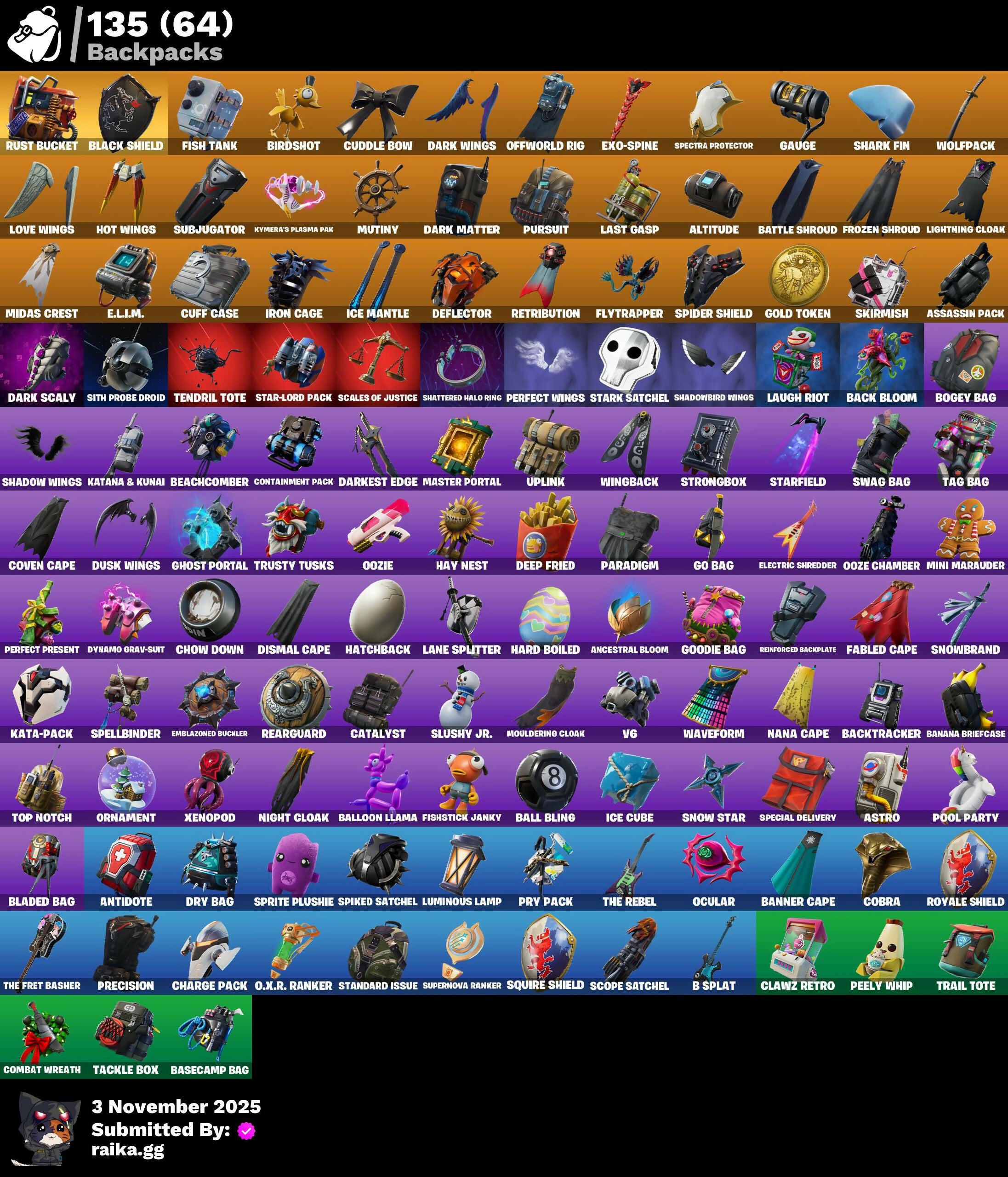 8-Ball Vs Scratch, A.I.M., AC/DC, Abominable Axe, Abstrakt, Accolades, Agent Peely, Air Horn, Altitude, Ancestral Bloom, Angler Axes, Antidote, Archetype, Asmodeus, Assassin Pack, Astro, Axecalibur, B Splat, B.R.U.T.E. Gunner, B.R.U.T.E. Navigator, Back Bloom, Backtracker, Bad Joke, Ball Bling, Baller, Balloon Axe, Balloon Llama, Banana Briefcase, Bank Shots, Banner Cape, Base Jumper, Basecamp Bag, Battle Call, Battle Shroud, Battlehawk, Beach Umbrella, Beachcomber, Beastmode, Beef Boss, Behold!, Best Mates, Billy Bounce, Birdshot, Black Knight, Black Ranger, Black Shield, Blackheart, Blade of the Waning Moon, Bladed Bag, Blowing Bubbles, Blue Squire, Bobbin', Bogey Bag, Boneless, Boogie Down, Boulder Breakers, Bouncer, Bounty 'Brella, Brainiac, Branded Brawler, Breakdown, Breakin', Brush Your Shoulders, Bunker Basher, Bunker Jonesy, Calamity, Calculated, Call Me, Carbide, Carbon, Castor, Cat Flip, Catalyst, Chaos Agent, Charge Pack, Cheer Up, Chomp Jr., Chomp Sr., Chow Down, Chugga-Chugga, Cinder, Clawz Retro, Clean Groove, Cloaked Shadow, Cloaked Star, Cloud Strike, Cluck Strut, Clutch, Cobalt, Cobra, Combat Wreath, Conga, Conquest, Containment Pack, Corrupted Voyager, Cosmic Cleavers, Coven Cape, Covered Crusader, Crackshot, Crazy Eight, Crimson Scythe, Crossfire, Cruiser, Cuddle Bow, Cuddle Team Leader, Cuff Case, DJ Yonder, Dab, Dabstand, Dance Off, Dance Therapy, Dark Matter, Dark Rex, Dark Scaly, Dark Voyager, Dark Wings, Darkest Edge, Darth Maul, Daydream, Deep Dab, Deep Fried, Deflector, Demi, Demogorgon, Dip, Dire, Disco Fever, Dismal Cape, Doggo, Double Up, Downpour, Downshift, Dragon Stance, Dragon's Claw, Dream Feet, Drift, Droop, Drop The Bass, Drum Major, Dry Bag, Dual Edge, Dusk, Dusk Wings, Dynamo Grav-Suit, E.L.I.M., Eagle, Electric Shredder, Electro Pairing Blades, Electro Shuffle, Electro Swing, Elite Agent, Ember, Emblazoned Buckler, Emblematic, Enforcer, Equalizer, Eva, Exo-Spine, Extraterrestrial, Fable, Fabled Cape, Fandangle, Feathered Flyer, Field Flyer, Firewalker, Fish Tank, Fishstick Janky, Flamenco, Flapper, Flippin' Away, Floss, Flytrap, Flytrapper, Founder's Glider, Founder's Umbrella, Free Flow, Fresh, Frostwing, Frozen Axe, Frozen Shroud, Gale Force, Gauge, Gear Specialist Maya, Gentleman's Dab, Get Down!, Get Funky, Ghost Portal, Giddy-Up, Glidurrr, Globe Shaker, Glowsticks, Go Bag, Gold Token, Golf Clap, Goodie Bag, Grimbles, Grind, Groove Jam, Guiding Glow, Guitar Walk, Gunn-Brella, Hack & Smash, Hand Signals, Hard Boiled, Harmonic Axes, Hatchback, Hay Man, Hay Nest, Headbanger, Hello Friend, High Five, High Octane, Hollowhead, Holographic, Hootenanny, Hot Marat, Hot Stuff, Hot Wings, Hula, Hula Hoopin', Huntress, Hybrid, Hype, Ice Cube, Ice Mantle, Ice Scepter, Icicle, Imperial Stormtrooper, Infectious, Inferno, Infinite Dab, Infinity, Intensity, Intrepid, Invasion, Iron Cage, It's Go Time!, Ivy Axe, Jaeger, Jake The Dog, Jamboree, Jaywalking, John Wick, Joker's Revenge, Jolly Roger, Journey Vs Hazard, Jubilation, Jump Jets, Junk Bucket, Kata-Pack, Katana & Kunai, Keep It Mello, Kenji, Kingmaker, Knee Slapper, Kymera, Kymera's Plasma Pak, Laid Back Shuffle, Lane Splitter, Laser Chomp, Last Gasp, Laugh It Up, Laugh Riot, Lazy Shuffle, Leviathan, Lightning Cloak, Lil' Saucer, Living Large, Llama Bell, Lock It Up, Lockpick, Lockstep, Lollipopper, Longshot, Love Ranger, Love Wings, Lug Axe, Luminous Lamp, Lynx, Make It Rain, Mako, Mandalorian, Marked Marauder, Marsh Walk, Marshmello, Marshy Smasher, Master Mix, Master Of Puppets, Master Portal, Mean Streak, Mech Axe, Medaxe, Mello Rider, Merry Marauder, Mic Drop, Midas Crest, Midas Rex, Midfield Maestro, Mighty Marvel 'Brella, Mime Time, Mini Marauder, Mission Specialist, Moon Bounce, Moonwalker, Mothmando, Mouldering Cloak, Mutiny, Nana Cape, Nana Nana, Nana-Brella, Nanner Bashers, Night Cloak, Nightshade, Nite Nite, O.M.E.G.A. Spear, O.X.R. 'Brella, O.X.R. Ranker, Ocular, Offworld Rig, Old School, Omega, Omen, One Shot, Onesie, Onslaught, Ooze Chamber, Oozie, Oppressor, Orange Justice, Ornament, Overtaker, Palm Leaf, Paper Parasol, Paper Plane, Paradigm, Peace Out, Peely, Peely Whip, Perfect Present, Perfect Shadow, Perfect Wings, Permafrost, Phone It In, Pick Squeak, Picnic, Plague, Planetary Probe, Plastic Patroller, Point It Out, Poison Ivy, Pony Up, Pool Party, Pop Lock, Popcorn, Positron, Powder, Praise The Tomato, Precision, Pry Pack, Psionic Surfer, Psycho Bandit, Psycho Buzz Axes, Pull Up, Pulse Axe, Pumpernickel, Pursuit, Quicksilver Baton Spear, Rabbit Raider, Ragnarok, Rainbow Rider, Rambunctious, Ravage, Raven, Rawr, Razor Crest, Reanimated, Reaper, Rearguard, Reckoning, Red Robin's Wings, Red Strike, Redline, Regal Wave, Reinforced Backplate, Remedy Vs Toxin, Respect, Respect The Peace, Retaliator, Retribution, Revoker, Rickety Runner, Ride The Pony, Rift Edge, Ripe Rippers, Rippley Vs Sludge, Rock Out, Rogue Agent, Rook, Rose Glow, Rose Rider, Rose Team Leader, Rox, Royale Air, Royale Knight, Royale Shield, Royale X, Run It Down, Running Man, Rust Bucket, Rust Lord, Sad Trombone, Safecracker, Salute, Sanctum, Sawtooth, Scales Of Justice, Scarlet Scythe, Scarlet Strike, Scope Satchel, Scorcher, Scorecard, Scoundrel, Scratchmark, Sentinel, Seven Signet, Sgt. Winter, Shadow Skully, Shadow Wings, Shadowbird, Shadowbird Wings, Shake It Up, Shaolin Sit-Up, Shark Fin, Sharpshooter, Shattered Halo Ring, Shimmer, Shooting Starstaff, Showstopper, Sidewinder, Sign Spinner, Sir Glider The Brave, Sith Probe Droid, Sizzlin', Skirmish, Skull Sickle, Skull Trooper, Sky Serpents, Sky Stalker, Sky Trawler, Slam Dunk, Sledgehammer, Slitherin', Sludgehammer, Slushy Jr., Slushy Soldier, Smash Up, Smooth Moves, Snakebite, Snoozefest, Snow Globe, Snow Star, Snowbrand, Snowfall, Snowflake, Snowfoot, Snowstrike, Something Stinks, Sparkle Scythe, Sparkle Specialist, Special Delivery, Spectra Protector, Spellbinder, Spider Knight, Spider Shield, Spike, Spike It, Spiked Satchel, Splashdown, Spray Sail, Sprite Plushi