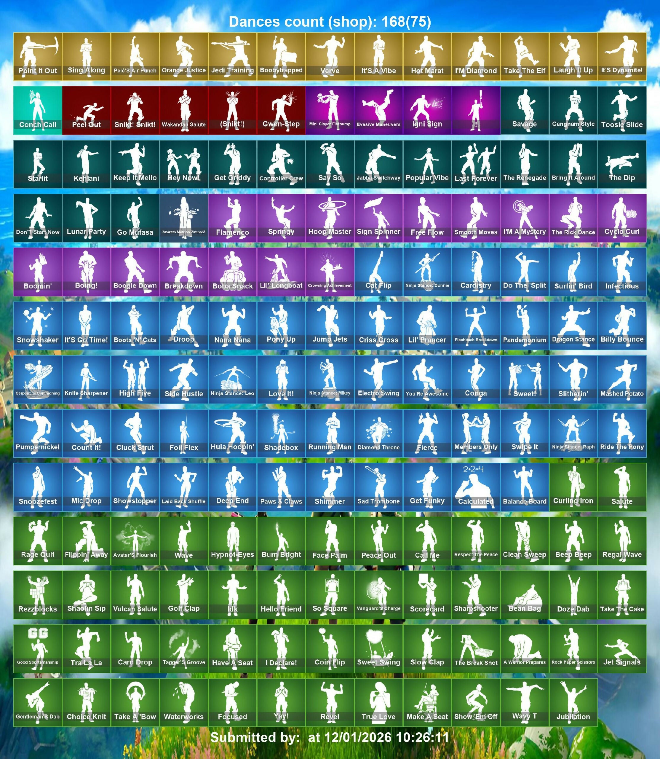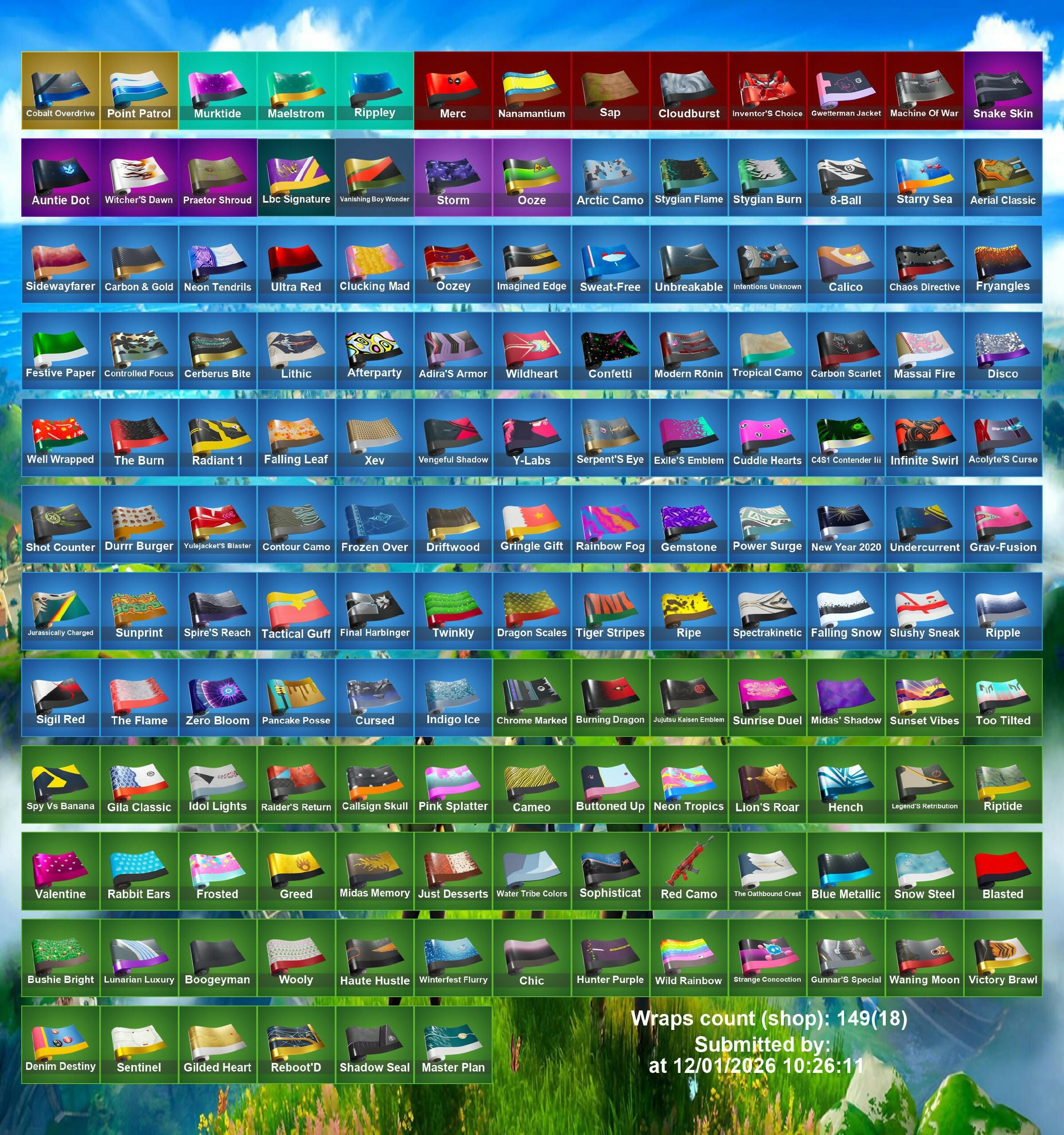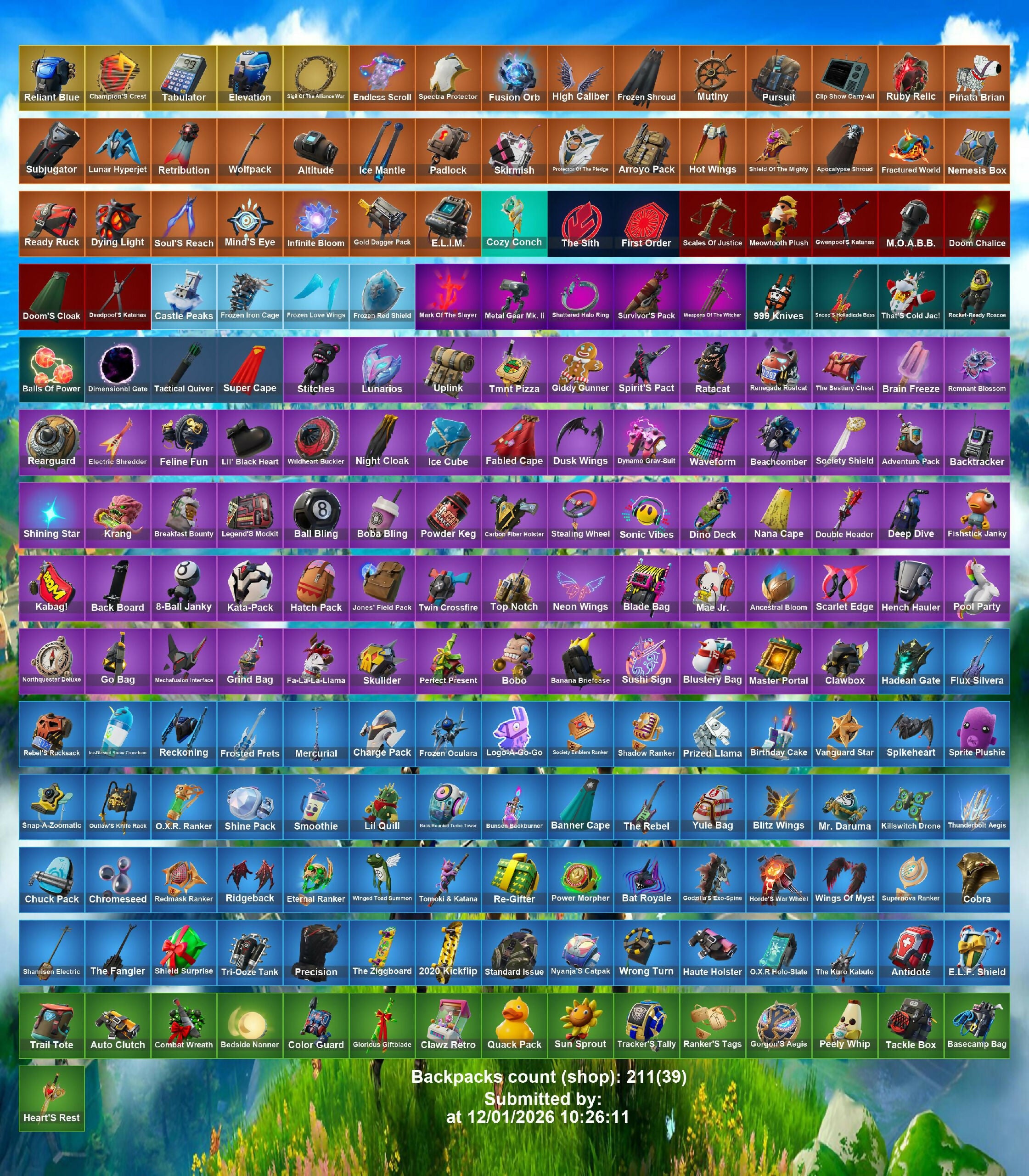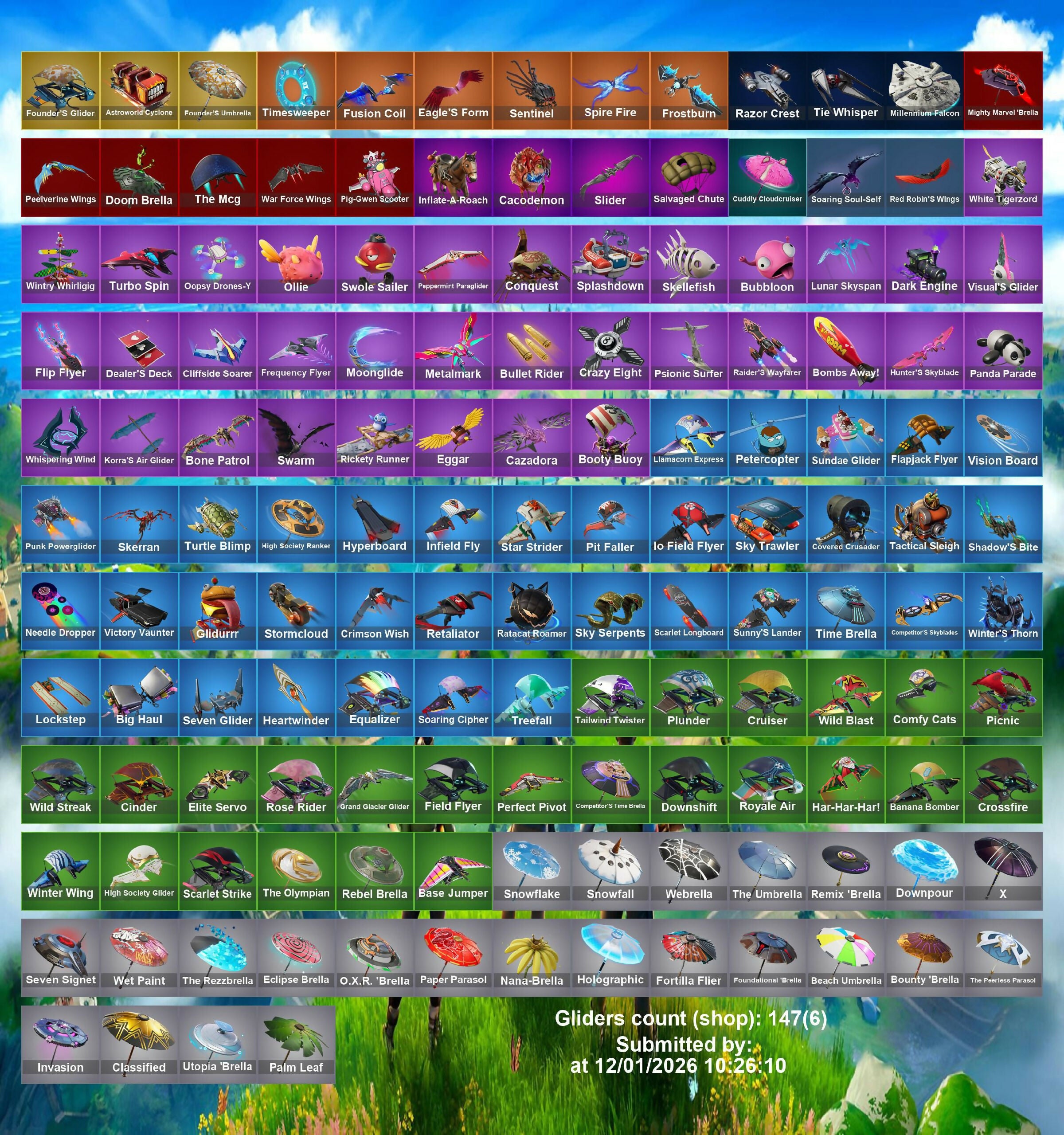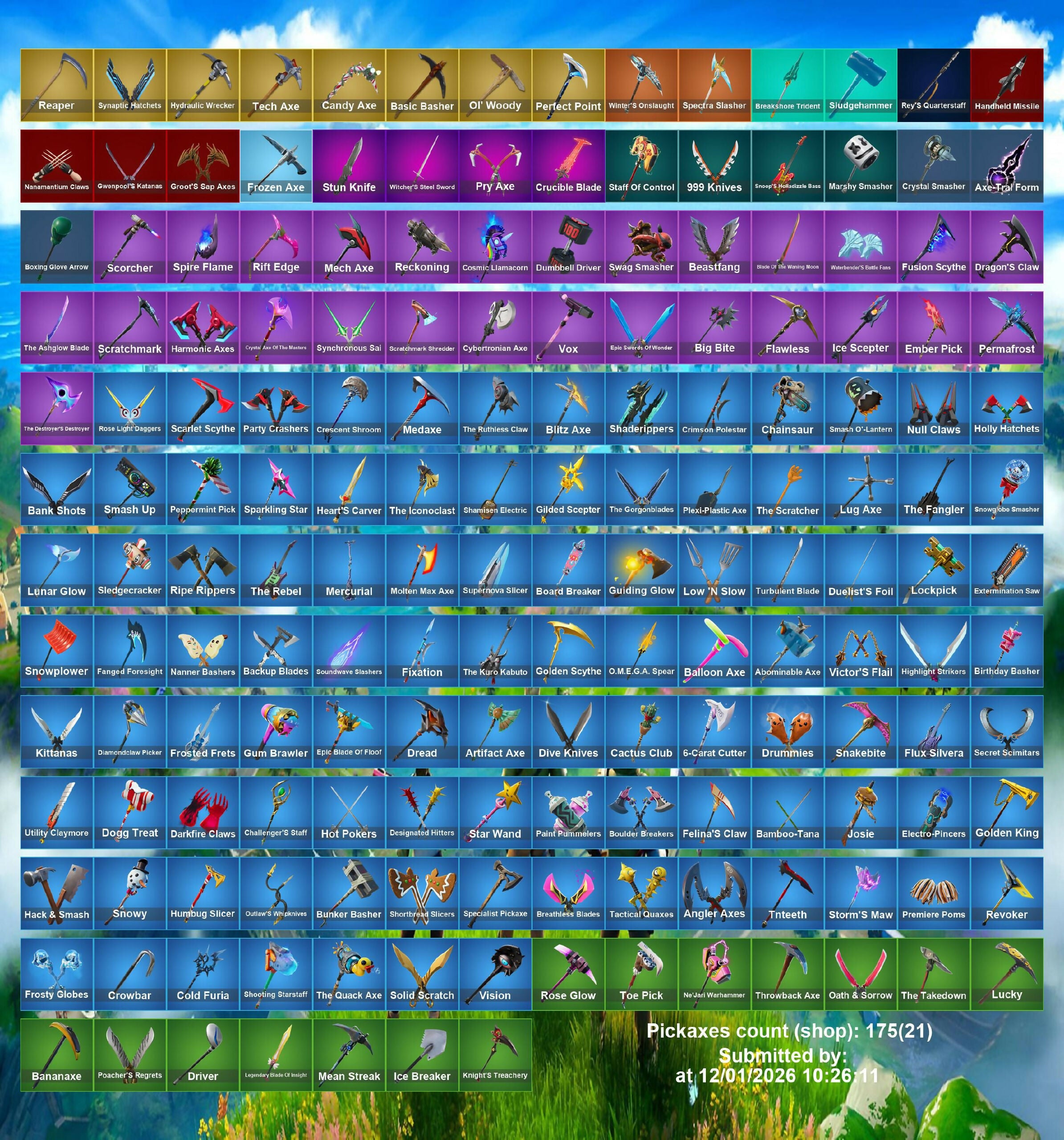 (Sh!rt), 1-Ball, 2020, 8-Ball Vs Scratch, 999 Knives, A Warrior Prepares, Advanced Math, Aerial Acrobat, Agent Jones, Agent Peely, Air Horn, Air Shredder, Alintan Fishstick, Amazing Cube, Angler Axes, Anniversary Axe, Aphrodite, Aquaman, Aquaman's Trident, Arachnobatics, Arcana, Arcane Energy Glider, Arctic Adeline, Ares, Around The Clock, Arrowpoint Carver, Artemis, Ascend!, Astro Jack, Astroworld Cyclone, Avatar's Flourish, Avengers Quinjet, Axe-Tral Form, Axeroni, Azarath Manton Dance!, B.R.U.T.E. Gunner, Backbeat Bow, Backup Blades, Bad Joke, Bait Bones, Balance Board, Banana Bomber, Bananaxe, Bank Shots, Baron's Hoard, Base Jumper, Basic Basher, Bat Signal, Batglider, Batman Pickaxe, Batsickle, Battle Axe, Battle Bloom, Batwing, Be Seeing You, Bean Bag, Bear Hug, Beastfang, Beef Bone, Beef Boss, Beep Beep, Bhangra Boogie, Big Bite, Big Fan, Big Haul, Bike To Go, Billy Bounce, Bitey, Black One X-Wing, Blackheart, Blade Of The Waning Moon, Blade Raven, Blinding Lights, Blinky Fishstick, Blinky Fugu Flail, Blitz Axe, Blowing Bubbles, Blue Viper, Board Breaker, Boba Snack, Boing!, Bolt Blades, Bomb Bouquet, Bombs Away!, Bone Boss, Bone Patrol, Bone Ravage, Boneless, Boobytrapped, Boogie Down, Boomin', Boots N Cats, Booty Buoy, Boulder Breakers, Bounce Berry, Bouncer, Bounty 'Brella, Boxing Glove Arrow, Breaking Point, Breaking Waves, Breakneck, Breakshore Trident, Breathless Blades, Brella, Brilliant Cutters, Bring It Around, Bruno Mars, Bryce 3000, Bubbloon, Bugha, Bullet Rider, Bunker Basher, Bunker Jonesy, Bushranger, Butcher'S Knife, Bytes, Cacodemon, Calamity, Call Me, Called Shot, Cameo Vs Chic, Candy Axe, Captain America, Captain America's Pickaxe, Captain Jones, Captain's Glider, Card Drop, Cardistry, Castaway Jonesy, Castor, Catalyst, Cauldron Chill, Celestia, Cerberus, Chainsaur, Chaos Agent, Chaos Director, Chaos Double Agent, Chaotic Crawler, Chef's Special, Chemist's Cloudglider, Chief Hopper, Chill-Axe, Chimichanga!, Choice Knit, Chop Chop, Chop Dropper, Chrome Punk, Chromebrella, Chromestruck Fire, Chugga-Chugga, Cinder, Clang & Basher, Clark Kent, Classified, Claw-Chucks, Clean Groove, Clean Sweep, Cliffside Soarer, Cloaked Shadow, Cloud Llama Board, Cluck, Cluck Strut, Coaxial Blue, Codename E.L.F., Coin Flip, Cold Front, Combat Cue, Comet Crasher, Comfy Cats, Commander's Descent, Company Jig, Competitor's Time Brella, Conch Call, Conga, Contract Giller, Controller Crew, Convergence, Coppens, Cosmic Cleavers, Cozy Jonesy, Cozy Knit Jonesy, Crab Walkin', Crabby, Crackdown, Crazy Eight, Crazy Feet, Crescent Shroom, Crimson Scythe, Crimson Wish, Crooked Claw, Crowning Achievement, Crucible Blade, Crystal Axe Of The Masters, Crystal Fang, Crystal Smasher, Cuddle Carvers, Cuddly Cloudcruiser, Cupid's Arrow, Curling Iron, Cycle Curl, DJ Yonder, Dadstand, Dagger Dance, Dance Off, Dancin' Domino, Dark Axe, Dark Jonesy, Dark Power Chord, Dark Red Knight, Dark Strikers, Dark Wild Card, Deadpool, Dealer's Deck, Deep End, Demi, Designated Hitters, Diamond Thorne, Diamondclaw Picker, Dire Flyer, Dirtbike Challenge, Disc Spinner, Disco Fever, Distraction Dance, Dive Knives, Doctor Doom, Doctor Slone, Don't Start Now, Doom, Doom Brella, Doom Slayer, Double Agent Hush, Double Agent Wildcard, Double Up, Double-Barreled Down Delesto, Downpour, Doze Dab, Dragacorn, Dragon Stance, Dragon'S Claw, Dragonhearted 'Brella, Dread, Dream Feet, Driver, Drome Drifter, Droop, Drop The Bass, Drum Major, Drummies, Duelist'S Foil, Dumb Ways To Die, Dusty, Dwarpool's Kalanas, Dynamic Shuffle, Dynamo Tintina, Eagle's Form, Eggar, El Chapulin Colorado, Electric Hammer, Electro Pairing Blades, Electro Swing, Elegant Crowbar, Elite Servo, Ember, Ember Baton, Ember Pick, Empress Fan Dance, Eon Blades, Epic Blade Of Floof, Epic Swords Of Wonder, Epitaph Edge, Equalizer, Eternal Knight, Eternal Voyager, Evasive Maneuvers, Everything's End, Evil Plan, Expressionism, Extra Cheese, Extraterrestrial, Fa-La-La Fishstick, Face Palm, Fade, Fancy Dandy Canes, Fang Saws, Fanged Foresight, Featherweight, Feelin' Jaunty, Felina, Felina'S Claw, Field Flyer, Fiendish Wand, Fierce, Finger Guns, Finger Wag, Firework Salvo, Fishbone Flayer, Fishskull, Fishy Flier, Fist Bump, Fist Of Doom, Flanders'H-Diddly-Hoe, Flapjack Flyer, Flapper, Flashback Breakdown, Flavor Saver Sailor, Flawless, Flip Flyer, Flippin' Away, Flying Slasher, Focused, Foil Flex, Follow The Butterfly, Forerunner, Fork Knife, Fortilla Flier, Foundational 'Brella, Founder's Glider, Founder's Umbrella, Foxfire Edge, Freedom Wheels, Freemix, Fright Funk, Frost Squad, Frostbite, Frozen Fishstick, Frozen Nog Ops, Fuel Rod And Tongs, Full Tilt, Funk Ops, Fusion, Fusion Coil, Fusion Scythe, Gangnam Style, Gathering Storm, Gear Specialist Maya, Geralt Of Rivia, Get Schwifty, Ghost Enforcer, Ghost Glider, Ghost Rider, Gilded Morphic Blades, Gilded Scepter, Gladius Of Protassus, Gli-Dar 3000, Globe Shaker, Glowsticks, Glyphic, Go Mufasa, Gold Brutus, Gold Meowscles, Gold Midas, Gold Skye, Gold Tintina, Golden King, Golden Scythe, Golf Clap, Good Guy, Grand Glacier Glider, Green Arrow, Green Banana Beam, Grill Sergeant, Grizz, Grizzly Gooper, Groot, Groot's Sap Axes, Guaco, Guernsey, Guff Gringle, Guggimon, Guitar Walk, Gum Brawler, Gunn-Brella, Gutbomb, Gwen Step, Gwen's Spiderchute, Gwenpool, Hack & Smash, Hadean Chariot, Hadean Key, Hades, Hammerhead Morty, Hammers Of Justice, Hand Of Lightning, Handheld Missile, Hang Loose, Hang Loose Celebration, Hang On, Har-Har-Har!, Harmonic Axes, Have A Seat, Hayseed, Haze, Head Banger, Heart Sign, Heart'S Carver, Heartburst, Heartwinder, Heist, Heist Flier, Hellfire Dance, Hello Friend, Helsie, Hey Now!, High Five, High Society Glider, Highlight Strikers, Highwire, Hitchhiker, Holiday Boxy, Holly Hatchets, Holographic, Homer Simpson, Hoop Master, Hope, Hot Pokers, Hot Slurp Balloon, Hugo, Hula Hoopin', Hulk Smashers, Humbug Slicer, Hunter'S Stake & Hammer, Hunter's Skyblade, Hybrid, Hydraulic Wrecker, Hydro Assault Trooper, H