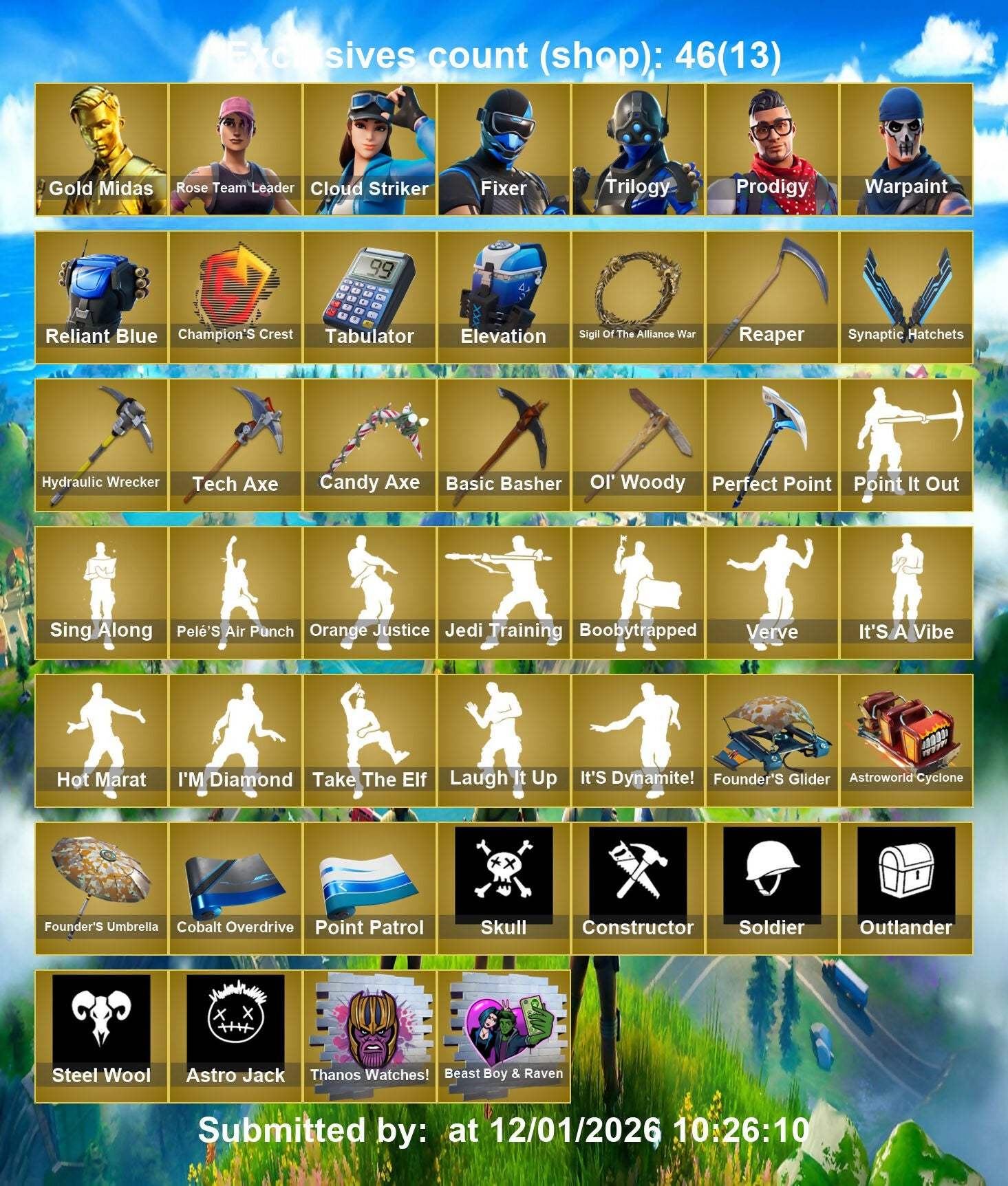 [PC/PSN/XBOX] 160 skins | OG STW | Gold Midas | Prodigy | Cloud Striker | Trilogy | Fixer | Spectra Knight | Sorana | Sentinel | Blackheart | Ragnarok | Valeria | 150 VB