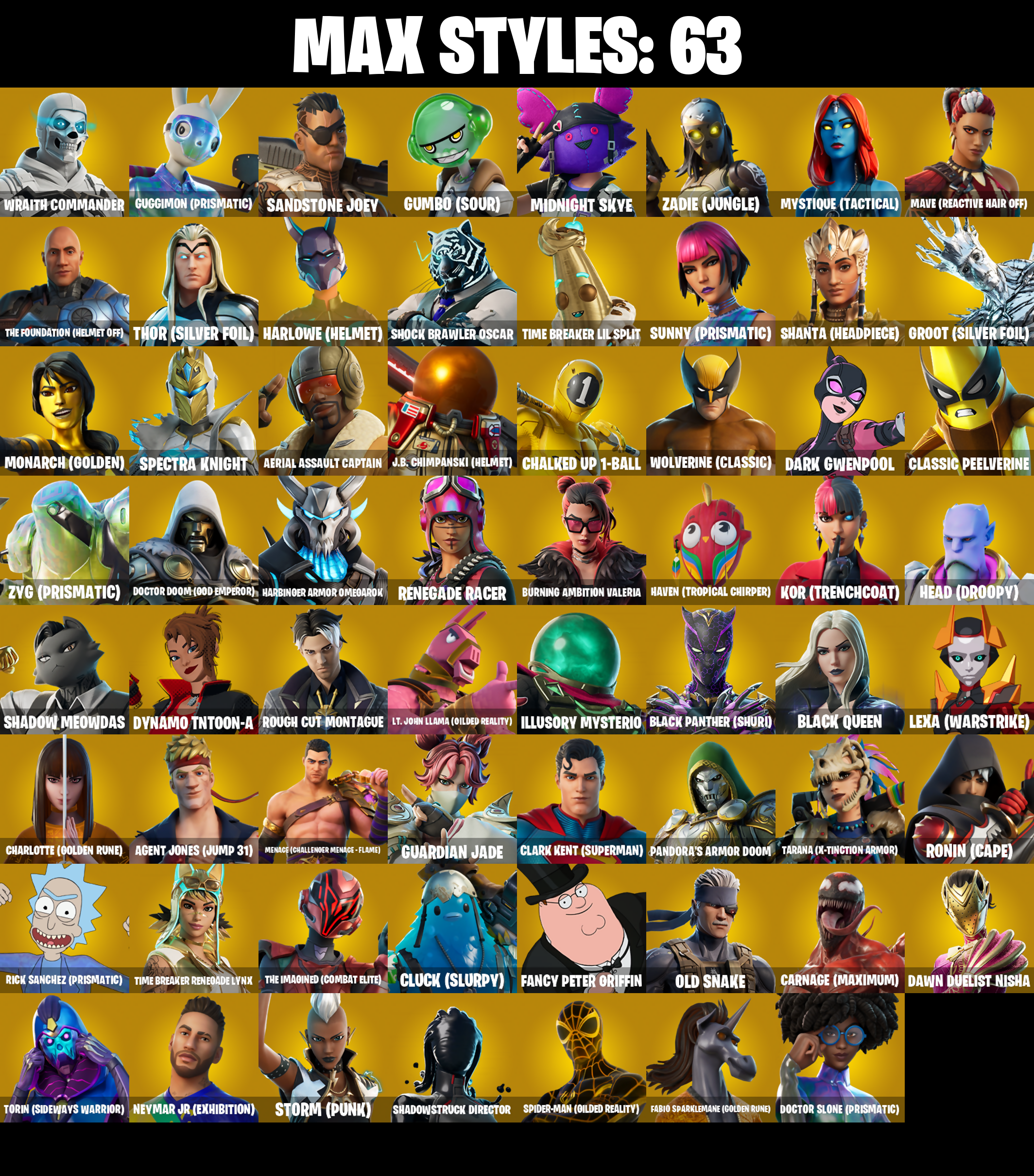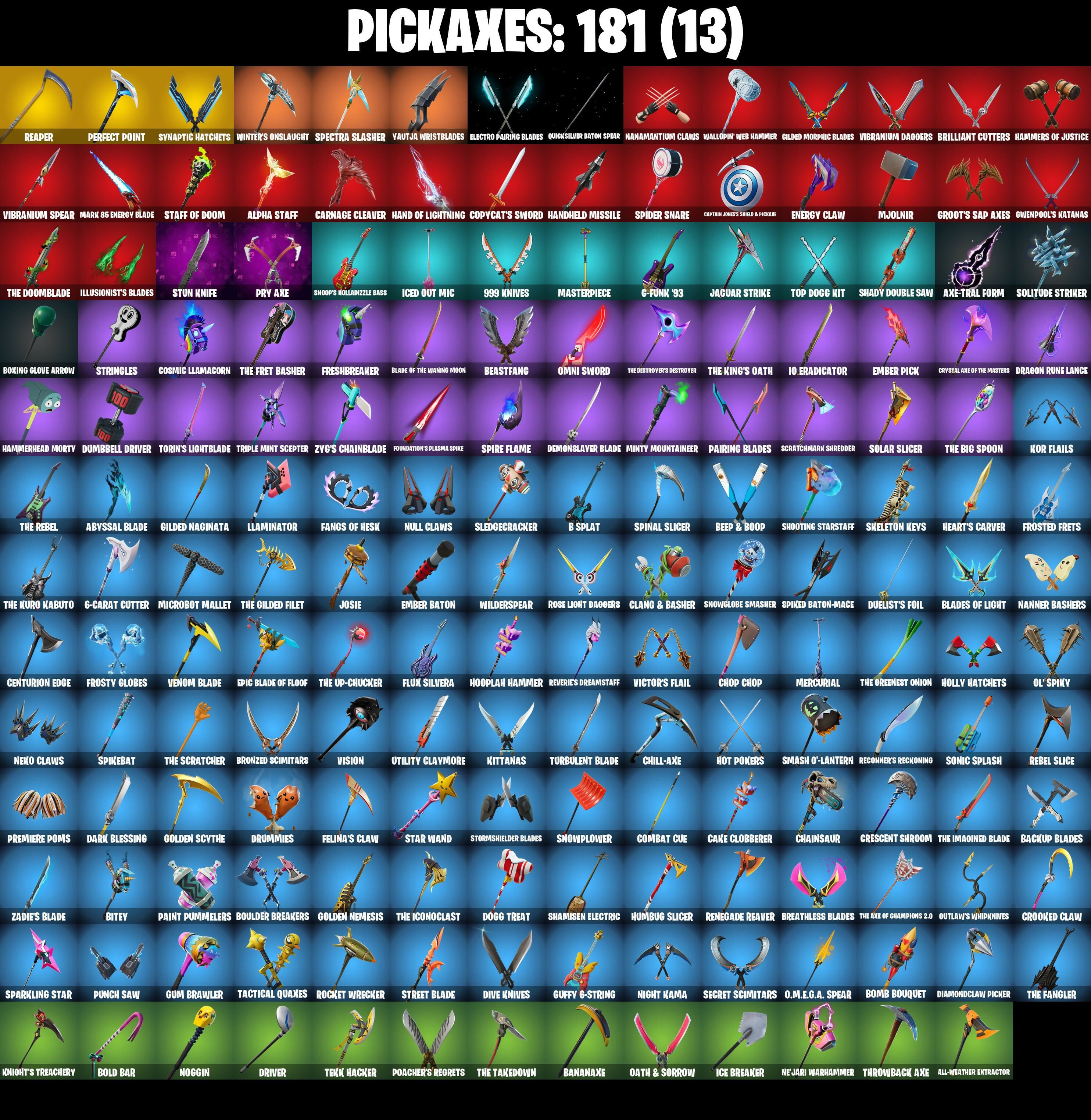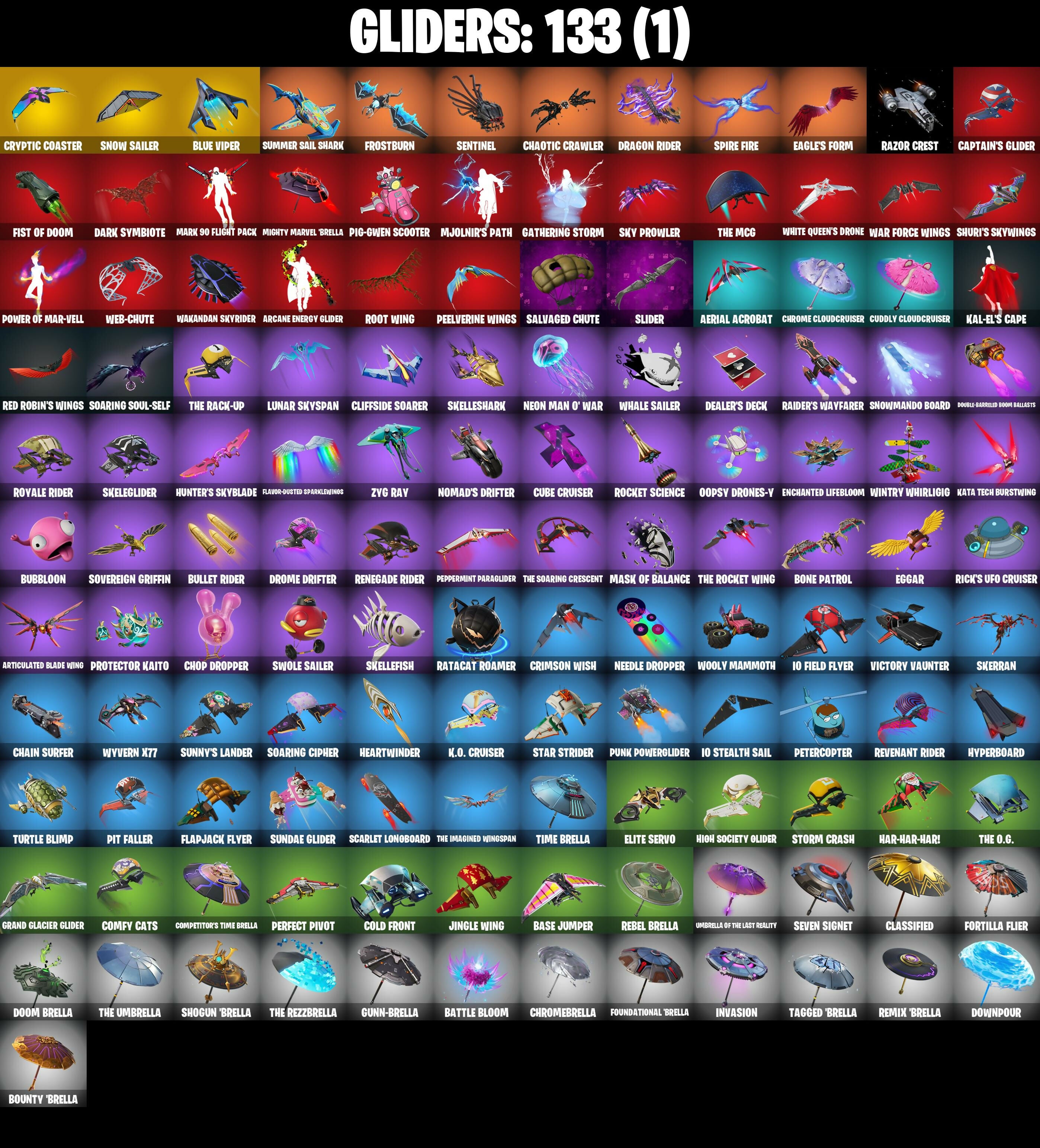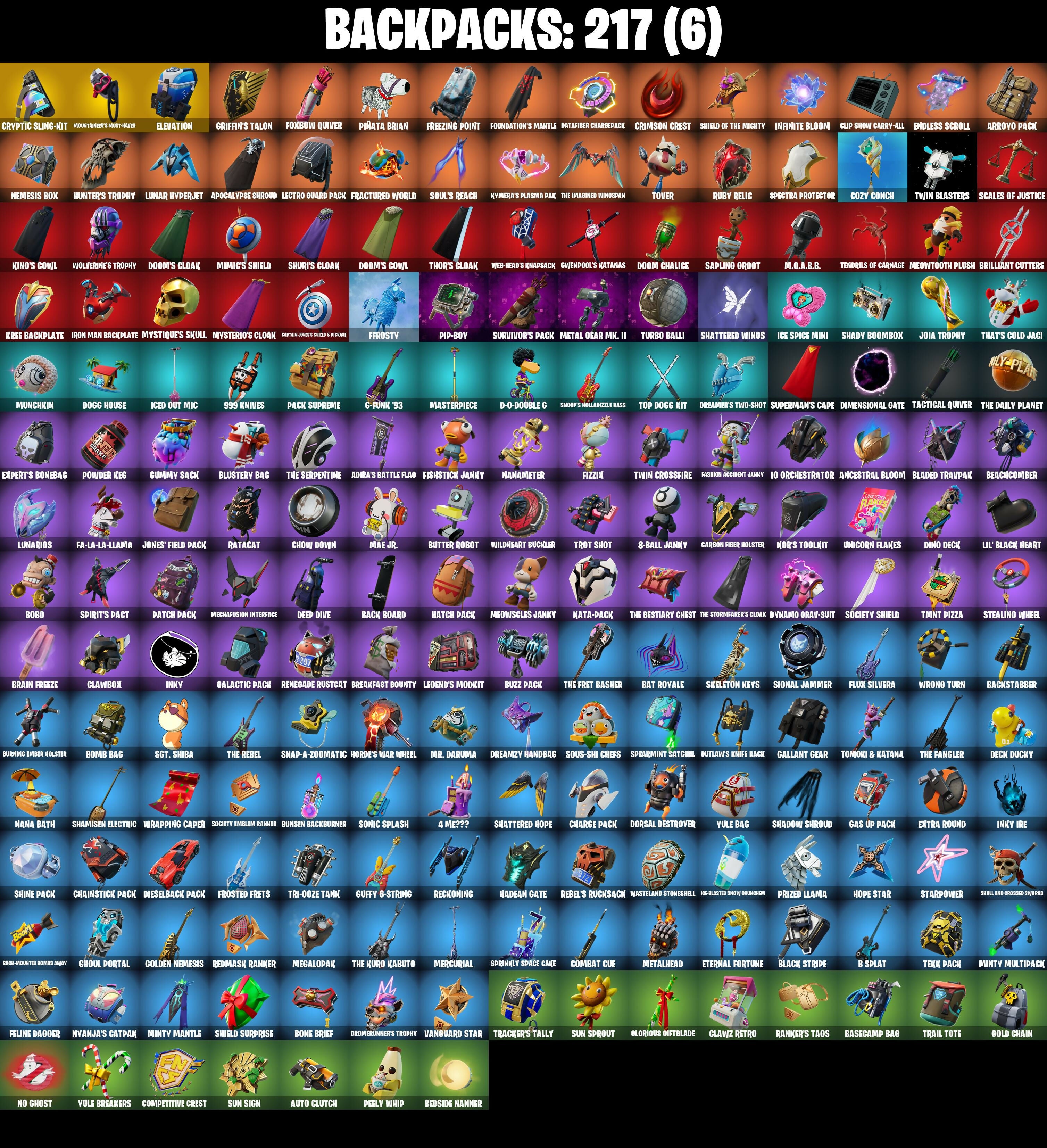 (SNIKT!), 1-Ball, 10 Field Flyer, 10 Orchestrator, 10 Stealth Sail, 4 Me???, 6-Carat Cutter, 8-ball Janky, 999 Knives, A Warrior Prepares, Absenz, Abyssal Blade, Adira, Adira's Battle Flag, Aerial Acrobat, Aerial Assault Bomber, Aerial Assault Captain, Agent Jones, Agent Jones (Jump 31), Air Horn, All-Weather Extractor, Alpha Staff, Amazing Cube, Ancestral Bloom, Andy Fangerson, Apocalypse Shroud, Arcane Energy Glider, Arctic Adeline, Arm The Pumpkin!, Arroyo Pack, Articulated Blade Wing, Aura, Auto Clutch, Axe-Tral Form, Azarath Metrion Zinthos!, B Splat, Back Board, Back-mounted Bomb Away, Backlash, Backstabber, Backup Blades, Bananaxe, Base Jumper, Basecamp Bag, Bat Royale, Battle Bloom, Beachcomber, Bean Bag, Bear Hug, Beast Blastin', Beastfang, Bedside Nanner, Beep & Boop, Beep Beep, Birdie, Bitey, Black Panther, Black Panther (Shuri), Black Queen, Black Stripe, Blade of the Waning Moon, Bladed Travpak, Blades of Light, Blizzard Bomber, Blowin' Up, Blue Viper, Blustery Bag, Bobo, Bold Bar, Bomb Bag, Bomb Bouquet, Bone Brief, Bone Patrol, Boomin', Boots 'N' Cats, Boulder Breakers, Bounty 'Brella, Boxing Glove Arrow, Brain Freeze, Breakfast Bounty, Breakpoint, Breathless Blades, Brilliant Cutters, Bronzed Scimitars, Bubbloon, Bullet Rider, Bunsen Backburner, Burning Ambition Valeria, Burning Ember Holster, Butter Robot, Buzz Pack, Cake Clobberer, Call Me, Captain Jones, Captain Jones's Shield & Pickaxe, Captain Llamerica, Captain Marvel, Captain's Glider, Carbon Fiber Holster, Card Drop, Cardistry, Carnage, Carnage (Maximum), Carnage Cleaver, Catalyst, Centurion, Centurion Edge, Chain Surfer, Chainsaur, Chainstick Pack, Chalked Up 1-Ball, Champion Kyra, Chaos Director, Chaotic Crawler, Charge Pack, Charlotte, Charlotte (Golden Rune), Chicken Wing It, Chill-Axe, Choice Knit, Chop Chop, Chop Dropper, Chow Down, Chrome Cloudcruiser, Chromebrella, Clang & Basher, Clark Kent, Clark Kent (Superman), Classic Peelveinre, Classified, Clawbox, Clawz Retro, Clean Sweep, Cliffside Soarer, Clip Show Carry-all, Cloud Striker, Cluck, Cluck (Slurpy), Cold Front, Combat Cue, Comfy Cats, Competitive Crest, Competitor's Time Brella, Contract Giller, Copycat's Sword, Cosmic Llamacorn, Cozy Commander, Cozy Conch, Crescent Shroom, Crimson Crest, Crimson Wish, Crooked Claw, Crowning Achievement, Cryptic Coaster, Cryptic Sling-kit, Crystal, Crystal Axe of the Masters, Cube Cruiser, Cuddly Cloudcruiser, Curling Iron, Cyclo Curl, D'Ark, D-o-double G, Dark Blessing, Dark Doggo, Dark Gwenpool, Dark Symbiote, Datafiber Chargepack, Dawn Duelist Nisha, Dealer's Deck, Deck Ducky, Deep Dive, Demonslayer Blade, Diamond Diva, Diamond Throne, Diamondclaw Picker, Dieselback Pack, Dimensional Gate, Dino Deck, Dive Knives, Dizzie, Do The Split, Doctor Doom, Doctor Doom (God Emperor), Doctor Slone, Doctor Slone (Prismatic), Dogg House, Dogg Treat, Doggo, Doom, Doom Brella, Doom Chalice, Doom's Cloak, Doom's Cowl, Doom's Domain, Dorsal Destroyer, Double-Barreled Boom Ballasts, Downpour, Doze Dab, Dragon Rider, Dragon Rune Lance, Dreamer's Two-shot, Dreamzy Handbag, Driver, Drome Drifter, Dromerunner's Trophy, Drummies, Duelist's Foil, Dumbbell Driver, Dummy, Durrr Taisho, Dynamo Grav-suit, Dynamo TNTina, Dynamo Tntoon-A, Eagle, Eagle's Form, Eggar, Electro Pairing Blades, Electro Shuffle, Elevation, Elite Servo, Ember Baton, Ember Pick, Emma Frost, Empty Out Your Pockets, Enchanted Lifebloom, Endless Scroll, Energy Claw, Epic Blade of Floof, Eternal Fortune, Evasive Maneuvers, Evie, Expert's Bonebag, Extra Round, Fa-la-la-llama, Fabio Sparklemane, Fabio Sparklemane (Golden Rune), Fancy Peter Griffin, Fangs of Hesk, Fashion Accident Janky, Felina, Felina's Claw, Feline Dagger, Fireworks Salvo, Fishstick Janky, Fist Bump, Fist Of Doom, Fixer, Fizzix, Flapjack Flyer, Flashback Breakdown, Flavor-Dusted Sparklewings, Flippin' Away, Flux Silvera, Foil Flex, Follow The Butterfly, Fortilla Flier, Foundation's Mantle, Foundation's Plasma Spike, Foundational 'Brella, Foxbow Quiver, Fractured World, Freezing Point, Fresh Aura, Freshbreaker, Frostbite, Frostburn, Frosted Frets, Frosty, Frosty Globes, G-Funk '93, Galactic Pack, Galaxia, Gallant Gear, Gas Up Pack, Gathering Storm, Get Griddy, Ghoul Portal, Gilded Morphic Blades, Gilded Naginata, Glorious Giftblade, Go Mufasa, Gold Chain, Golden Nemesis, Golden Scythe, Golf Clap, Good Guy, Grand Glacier Glider, Green Arrow, Griffin's Talon, Groot, Groot (Silver Foil), Groot's Sap Axes, Guardian Jade, Guffy 6-String, Guggimon, Guggimon (Prismatic), Gum Brawler, Gumbo, Gumbo (Sour), Gummy Sack, Gunn-Brella, Gunnar, Gwen-Step, Gwenpool, Gwenpool's Katanas, Hadean Gate, Hammerhead Morty, Hammers of Justice, Hand of Lightning, Hand-Forged, Handheld Missile, Hang Loose Celebration, Har-Har-Har!, Harbinger Armor Omegarok, Harlowe, Harlowe (Helmet), Hatch Pack, Have A Seat, Haven, Haven (Tropical Chirper), Head (Droopy), Heart Sign, Heart's Carver, Heartwinder, Helichopper, Hellfire Dance, High Society Glider, Hit It, Holiday Boxy, Holly Hatchets, Holly Jammer, Hooplah Hammer, Hope, Hope Star, Horde's War Wheel, Hot Pokers, How Sweet!, Howl, Humbug Slicer, Hunter's Skyblade, Hunter's Trophy, Hush, Hyperboard, I Declare!, I'm A Mystery, IO Eradicator, Ice Breaker, Ice Spice, Ice Spice Mini, Ice-blasted Snow Crunch, Iced Out Mic, Illusionist's Blades, Illusory Mysterio, In Ha Mood, Infinite Bloom, Inky, Inky Ire, Invasion, Invisible Cut, Iron Man Backplate, It Is Finished, It's A Vibe, It's... You?, J.B. Chimpanski, J.B. Chimpanski (Helmet), Jabba Switchway, Jackie, Jade, Jaguar Strike, Jazz Hands, Jennifer Walters, Jet Signals, Joey, Joia Trophy, Jolly Jammer, Jones' Field Pack, Josie, Jubilation, Jumbo Popcorn, Jun-Hwan, Jungle Wing, K.O. Cruiser, Kal-El's Cape, Kata Tech Burstwing, Kata-pack, Keep 'Em Crispy, Kendo, Kick Back, King's Cowl, Kittanas, Knife Sharpener, Knight's Treachery, Kondor, Kor, Kor (Trenchcoat), Kor Flails, Kor's Toolkit, Kree Backplate, Krisabelle, Kymera, Kymera's Plasma Pa