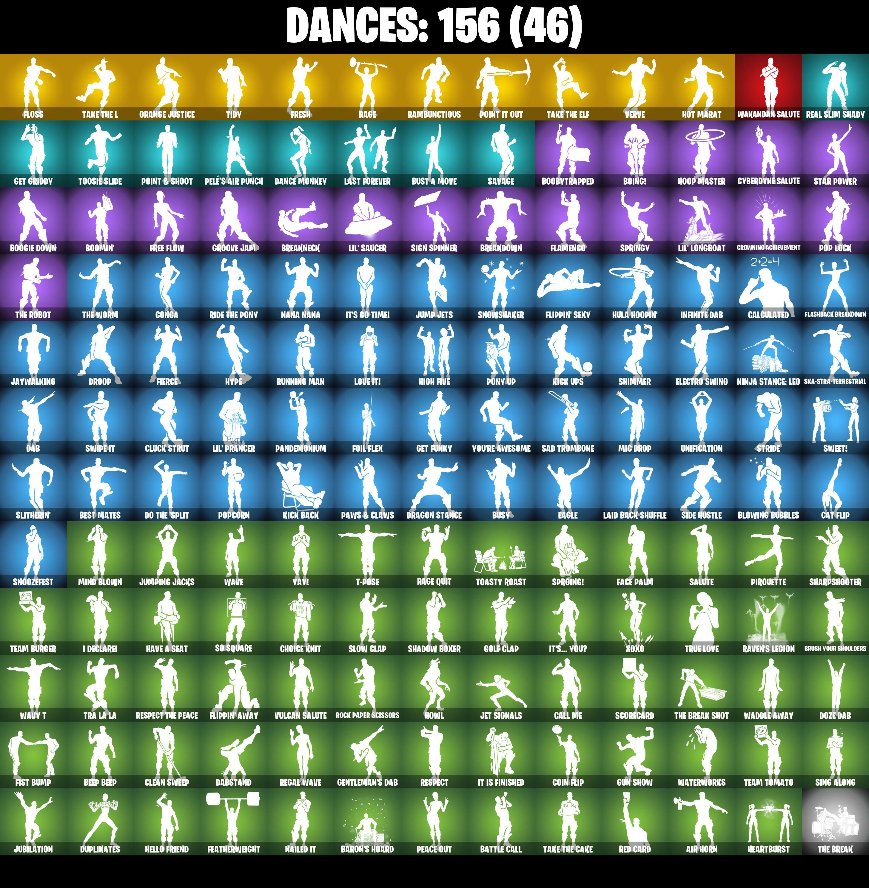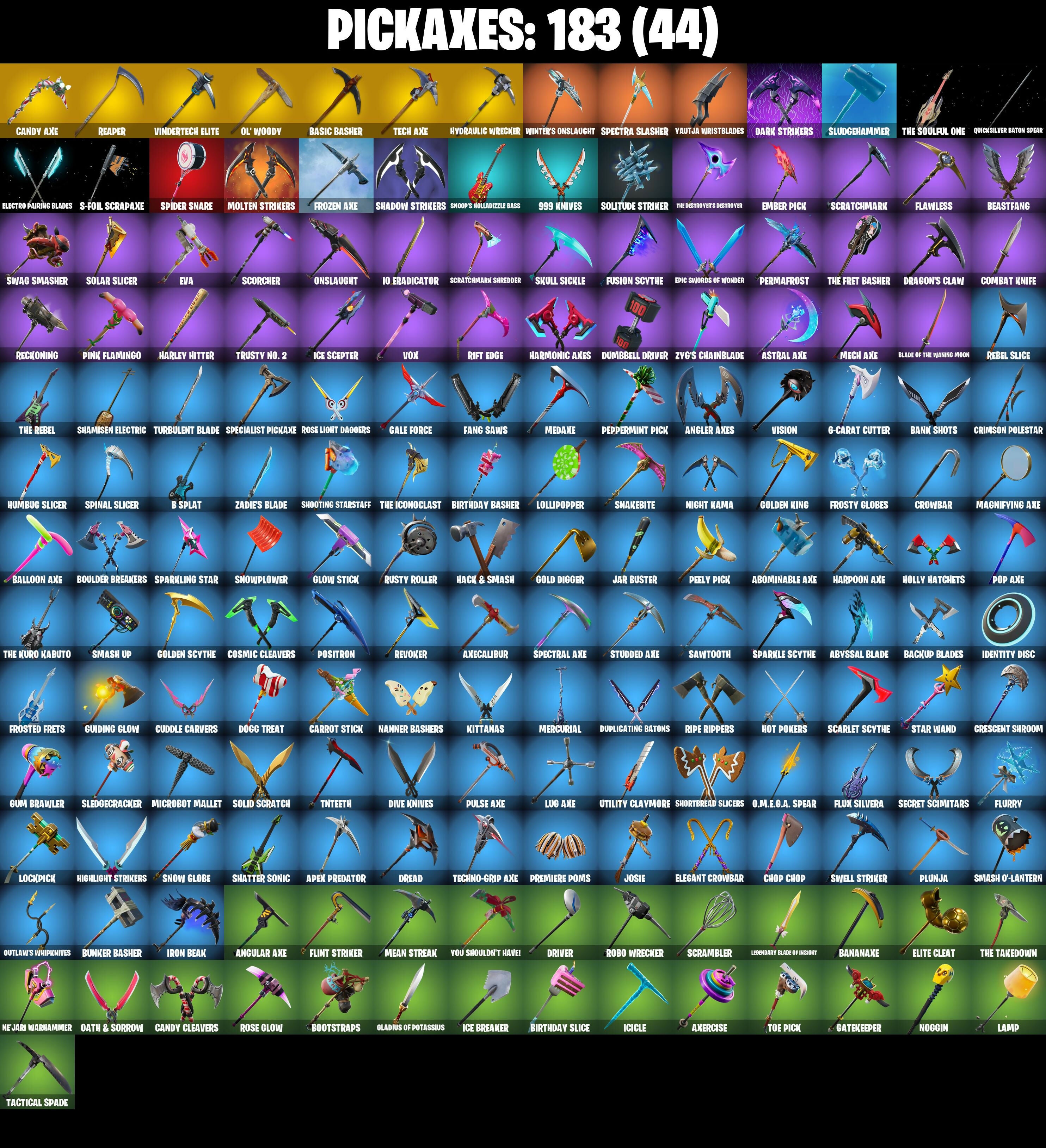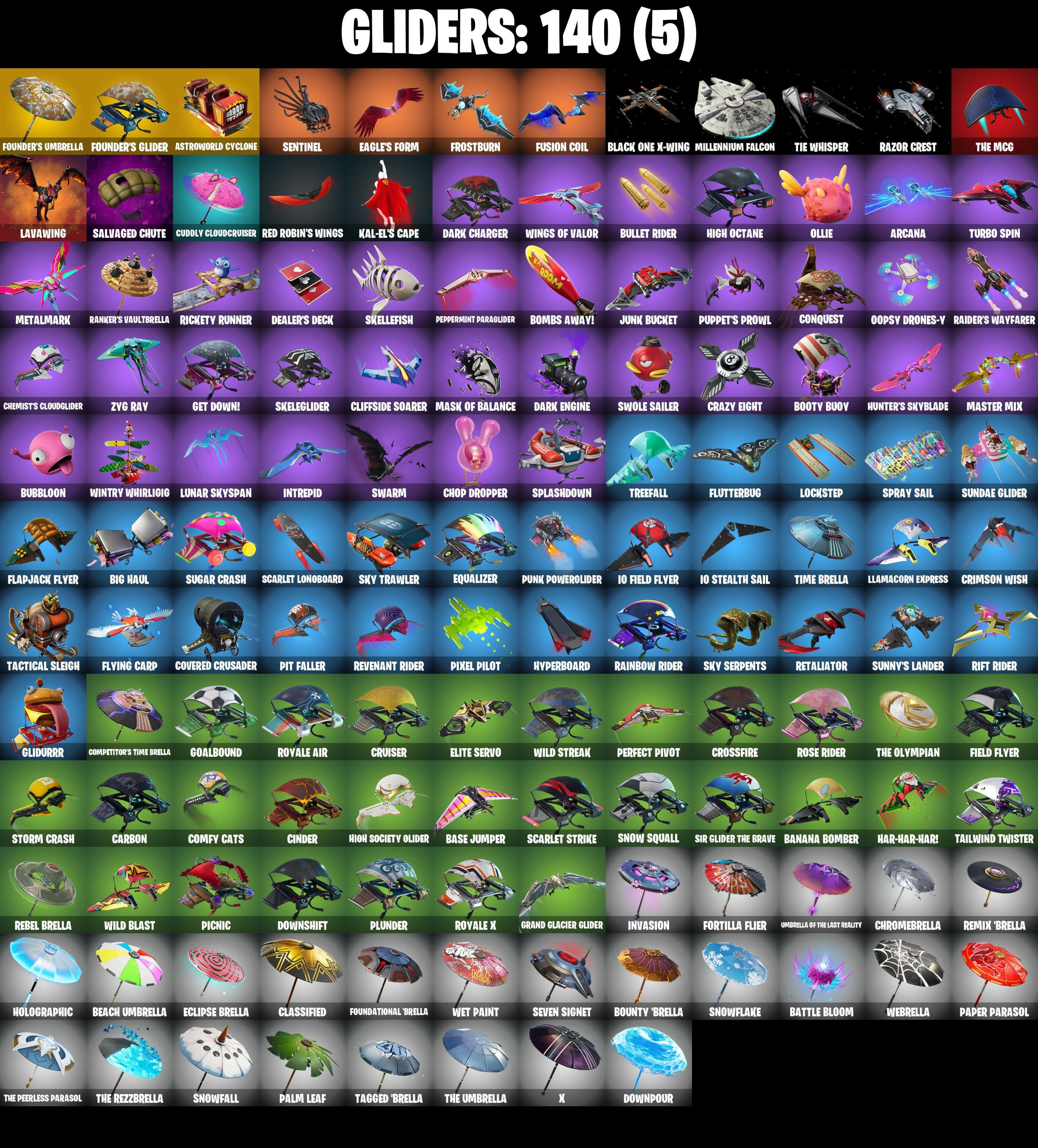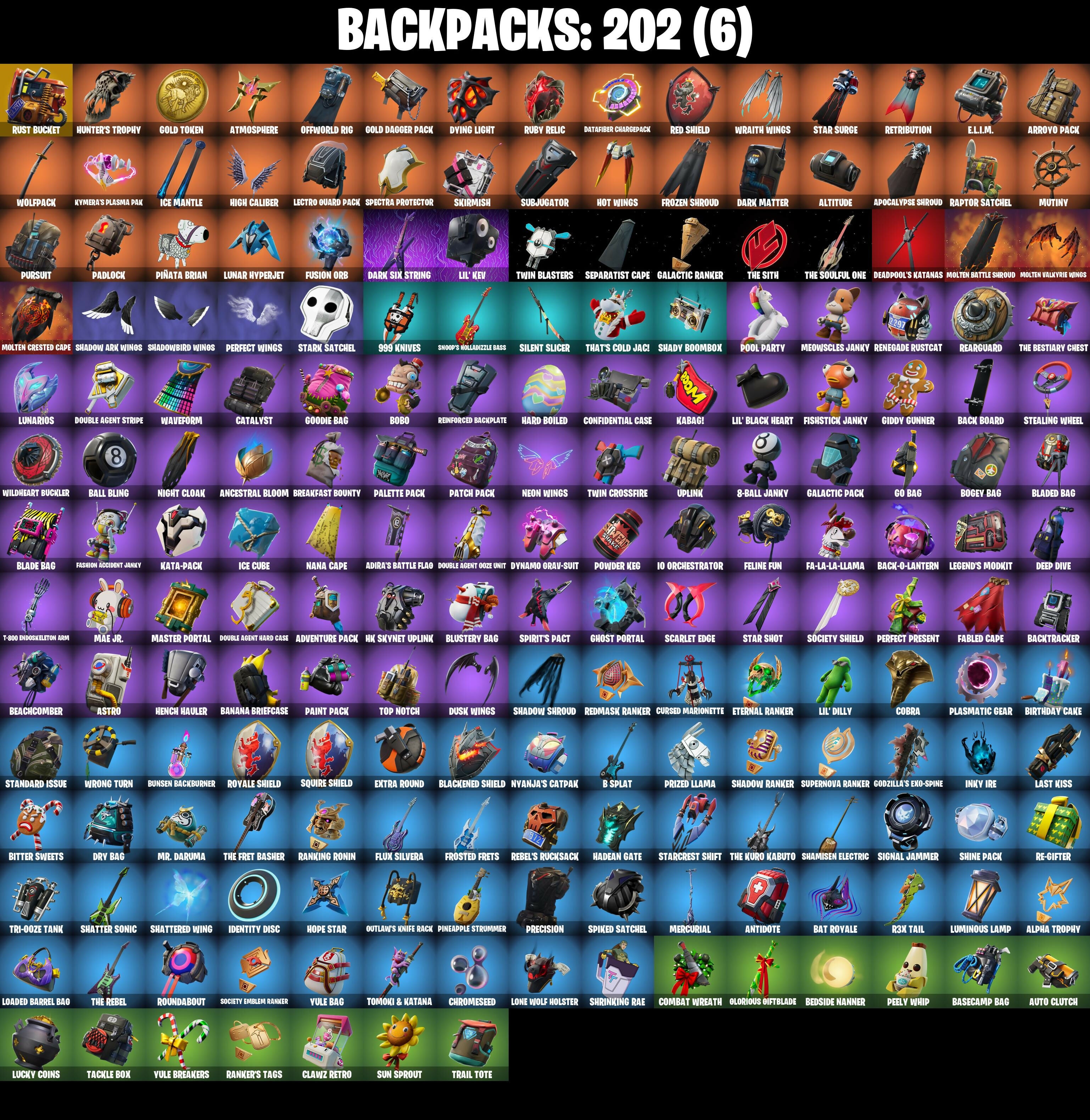 10 Field Flyer, 10 Stealth Sail, 6-Carat Cutter, 8-Ball Janky, 8-Ball vs Scratch, 999 Knives, A.I.M., Abominable Axe, Absenz, Abyssal Blade, Adira's Battle Flag, Adventure Pack, Agent Peely, Air Horn, Alpha Trophy, Altitude, Amplitude, Ancestral Bloom, Angler Axes, Angular Axe, Antidote, Apex Predator, Apocalypse Shroud, Arcana, Arctic Adeline, Arroyo Pack, Assault Trooper, Astral Axe, Astro, Astroworld Cyclone, Atmosphere, Aura, Auto Clutch, Axecalibur, Axercise, B Splat, Back Board, Back-O-Lantern, Backtracker, Backup Blades, Ball Bling, Balloon Axe, Banana Bomber, Banana Briefcase, Bananaxe, Bank Shots, Baron's Hoard, Base Jumper, Basecamp Bag, Basic Basher, Bat Royale, Battle Bloom, Battle Call, Battlehawk, Beach Jules, Beach Umbrella, Beachcomber, Beastfang, Bedside Nanner, Beep Beep, Best Mates, Big Haul, Birdie, Birthday Basher, Birthday Cake, Birthday Slice, Bitter Sweets, Black One X-Wing, Black Werewolf, Blackened Shield, Blackheart, Blackheart (Stage 8), Blade Bag, Blade of The Waning Moon, Bladed Bag, Blowing Bubbles, Blue Squire, Blustery Bag, Bobo, Bogey Bag, Boing!, Bombs Away!, Booby Trapped, Boogie Down, Boomin', Bootstraps, Booty Buoy, Boulder Breakers, Bounty 'Brella, Breakdown, Breakfast Bounty, Breakneck, Breakpoint, Brush Your Shoulders, Brutus, Bubbloon, Bullet Rider, Bunker Basher, Bunker Jonesy, Bunsen Backburner, Bust A Move, Busy, Calamity, Calamity Stage 5, Calculated, Call Me, Cameo vs Chic, Candy Axe, Candy Cleavers, Carbide, Carbon, Carrot Stick, Cat Flip, Catalyst, Catalyst (Overcharged), Chaos Double Agent, Chemist's Cloudglider, Choice Knit, Chop Chop, Chop Dropper, Chrome Punk, Chromebrella, Chromeseed, Cinder, Classified, Clawz Retro, Clean Sweep, Cliffside Soarer, Cluck Strut, Cobalt, Cobra, Coin Flip, Color Crush, Combat Knife, Combat Wreath, Comfy Cats, Commando, Competitor's Time Brella, Confidential Case, Conga, Conquest, Cosmic Cleavers, Covered Crusader, Crazy Eight, Crescent Shroom, Crimson Polestar, Crimson Wish, Crossfire, Crowbar, Crowning Achievement, Cruiser, Crystal, Cuddle Carvers, Cuddly Cloudcruiser, Cursed Marionette, Cyberdyne Salute, DJ Yonder, Dab, Dabstand, Dance Monkey, Dark Charger, Dark Engine, Dark Matter, Dark Power Chord, Dark Six String, Dark Strikers, Dark Voyager, Datafiber Chargepack, Deadpool, Deadpool Unmasked, Deadpool's Katanas, Dealer's Deck, Deep Dive, Demi, Demi (Night), Diamond Diva, Dire, Dive Knives, Dizzie, Do The Split, Doctor Slone, Dogg Treat, Double Agent Hard Case, Double Agent Hush, Double Agent Ooze Unit, Double Agent Stripe, Double Agent Wildcard, Downpour, Downshift, Doze Dab, Dragon Stance, Dragon's Claw, Dread, Dream, Drift, Drift Stage 5, Driver, Droop, Dry Bag, Dumbbell Driver, Dummy, Duplicates, Duplicating Batons, Dusk, Dusk Wings, Dying Light, Dynamo, Dynamo Grav-Suit, E.L.I.M., Eagle, Eagle's Form, Eclipse Brella, Electro Pairing Blades, Electro Swing, Elegant Crowbar, Elite Agent, Elite Cleat, Elite Servo, Ember, Ember Pick, Enforcer, Epic Swords of Wonder, Equalizer, Eternal Ranker, Eva, Extra Round, Fa-La-La-Llama, Fable, Fabled Cape, Face Palm, Fang Saws, Fashion Accident Janky, Featherweight, Feline Fun, Field Flyer, Fierce, Finesse Finisher, Fishstick Janky, Fist Bump, Flamenco, Flapjack Flyer, Flashback Breakdown, Flawless, Flint Striker, Flippin' Away, Flippin' Sexy, Floss, Flurry, Flutterbug, Flux Silvera, Flying Carp, Foil Flex, Fortilla Flier, Foundational Brella, Founder's Glider, Founder's Umbrella, Free Flow, Fresh, Frostburn, Frosted Frets, Frosty Globes, Frozen Axe, Frozen Shroud, Fusion, Fusion Coil, Fusion Orb, Fusion Scythe, Galactic Pack, Galactic Ranker, Gale Force, Gatekeeper, Gear Specialist Maya, Gentleman's Dab, Get Down!, Get Funky, Get Griddy, Ghost Portal, Giddy Gunner, Giddy-Up, Ginger Gunner, Gingerbread Raider, Gladius of Potassius, Glidurr, Glorious Giftblade, Glow Stick, Go Bag, Goalbound, Godzilla's Exo-Spine, Gold Dagger Pack, Gold Digger, Gold Midas, Gold Token, Golden King, Golden Scythe, Golf Clap, Goodie Bag, Grand Glacier Glider, Grimbles, Groove Jam, Guggimon, Guiding Glow, Gum Brawler, Gumshoe, Gun Show, HK Skynet Uplink, Hack & Smash, Hadean Gate, Har-Har-Har!, Harbinger Armor Omegarok, Hard Boiled, Harley Hitter, Harmonic Axes, Harpoon Axe, Have A Seat, Head (Droopy), Heartburst, Hello Friend, Hench Hauler, High Caliber, High Five, High Octane, High Society Glider, Highlight Strikers, Holiday Boxy, Holly Hatchets, Holographic, Hoop Master, Hope Star, Hot Marat, Hot Pokers, Hot Wings, Howl, Hula Hoopin', Humbug Slicer, Hunter's Skyblade, Hunter's Trophy, Huntress, Hybrid, Hybrid (Stage 4), Hydraulic Wrecker, Hype, Hyperboard, I Declare!, IO, IO Eradicator, IO Orchestrator, Ice Breaker, Ice Cube, Ice King (Gold), Ice Mantle, Ice Scepter, Icicle, Identity Disc, Infinite Dab, Inky Ire, Intrepid, Invasion, Iris, Iron Beak, It Is Finished, It's Go Time!, It's... You?, Jar Buster, Jaywalking, Jet Signals, Joey, Josie, Journey vs Hazard, Jubilation, Jump Jets, Jumping Jacks, Junk Bucket, Kabag!, Kal-El's Cape, Kata-Pack, Kick Back, Kick Ups, Kittanas, Kondor, Krisabelle, Kymera, Kymera's Plasma Pak, Laguna, Laid Back Shuffle, Lamp, Last Forever, Last Kiss, Lavawing, Lectro Guard Pack, Legend's Modkit, Legendary Blade of Insight, Lil Split, Lil' Black Heart, Lil' Dilly, Lil' Kev, Lil' Longboat, Lil' Prancer, Lil' Saucer, Llamacorn Express, Loaded Barrel Bag, Lockpick, Lockstep, Lollipopper, Lone Wolf Holster, Love It!, Lt. Evergreen, Lucky Coins, Lug Axe, Luminous Lamp, Lunar Hyperjet, Lunar Skyspan, Lunarios, Luxe, Luxe (Gold Clothing), Lynx, Lynx (Stage 4 - No Ponytail), Mae Jr., Magnifying Axe, Mancake, Mandalorian, Manic, Mask of Balance, Master Key, Master Key (Masked), Master Mix, Master Portal, Mave, Mave (Reactive Hair Off), Mean Streak, Mech Axe, Medaxe, Meowscles, Meowscles Janky, Mercurial, Metalmark, Mic Drop, Microbot Mallet, Millennium Falcon, Mind Blown, Mission Specialist, Molten Battle Hound, Molten Battle Shroud, Molten Crested Cape, Molten 