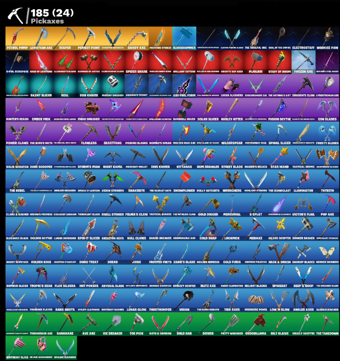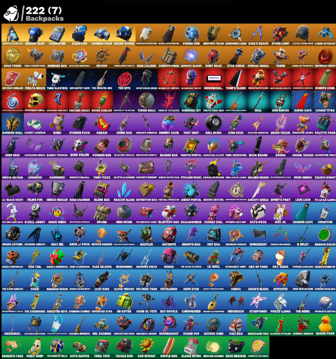 10 Field Flyer, 2020 Kidflip, 4-Pack, 8-Ball Janky, 999 Knives, Abominable Axe, Absenz, Absolute Zero Season, Abyssal Blade, Access Core, Adira, Admiral's Battle Flag, Adventure Aerial, Adventure Pack, Agent Peely, Air Shredder, Alpha Trophy, Alto, Ancestral Bloom, Andre, Angler Axes, Antidote, Antonia, Aquaman, Aquaman Trident, Arachrobatics, Arcane Energy Glider, Arctic Adeline, Arm The Purppine, Arroyo Pack, Assault Trooper, Astro Annexation, Astronaid Blaze Wings, Astroworld Cyclone, Aura, Auto Clutch, Autobot Emblem, Ave Axe, Axe-Tral Form, B Splat, B-Splat, B-gilla vs Scratch, Bachi, Back Board, Backlash, Balance Board, Ball Bling, Banana Bomber, Bananaxe, Bank Shots, Banner Cape, Base Jumper, Basecamp Bag, Bat Royale, Battle Bloom, Be amazed, Beach Breezer, Beachcomber, Beacon Glass, Bear Brained, Beast Boy, Beastrang, Beep Beep, Beep B’Boop, Bhangra Boogie, Big Fan, Big Haul, Billy Bounce, Birthday Basher, Birthday Slice, Black One X-Wing, Blackheart, Blade Bag, Blade Of The Mystic, Blade Raven, Bladed Bag, Bladed Trappak, Blitz Axe, Blowing Bubbles, Blown’ Up, Blustery Bag, Board Breaker, Bobo, Boing!, Bold Bar, Bombs Away!, Booby Trapped, Boogaloo Sunshines, Boogie Down, Boomin’, Boosting XI, Booty Buoy, Boundary Breakers, Bounty Brella, Brain Freeze, Breakfast Bunny, Brella, Brilliant Cutters, Broken Ice Hammer, Bronto, Bronto Bag, Bronze's Bonanza, Brutus, Bubloon, Buckets, Bullet Rider, Bullseye, Bunker Basher, Buzzsaw Breacher, Bytes, Cacodemon, Cake!, Calico-Count, Call Me, Cameo vs Chic, Candy Axe, Captain Almerica, Carbon Commando, Carbon Pack, Catwing, Cazadora, Cell-Lar-Beat, Chain's Satchel, Chainstick Pack, Chani, Chaos Agent, Chigusa, Chocollama, Choiceknit, Chrome Punk, Chromebrella, Chromestick Fire, Chronohero, Chronos Lock, Cinder, Circle Masquerade, Clang & Basher, Classified, Clawz Retro, Clean Sweep, Cloud Llama Board, Cloud Striker, Cluffside Soarer, Cobra, Coin Flip, Cold Snap, Color Crush, Combat Veteran, Comet Crasher, Comfy Cats, Competition Time Brella, Competitive Crest, Conga, Convergence, Coral Cruiser, Couch Titan, Count It!, Crack It, Crazy Eight, Crescent Sorrow, Crimson Wish, Crown & Ivy Movement, Cryptic Coaster, Crypto Slug-X1, Crystal, Cuddle Doll, Curling Iron, Cutout & Dagger, Cyberthorn Axe, Cyclo Curl, Dagger Dance, Darth Vader, Deadpool, Dealer's Deck, Deep Dab, Deep Dive, Deep End, Denied, Derby Dynamo, Dice Roll, Dietbike Challenge, Dignified Hammers, Dino Deck, Direclon Keys, Dive Knives, Doctor Doom, Dogg Treat, Domino Supreme, Doom Brella, Doom Chalice, Doom's Cowl, Doombot Stock, Downpour, Doze Dab, Dragon Bone Lance, Dragon Brigadeer, Dragon Crusader, Dragon Radar, Dragon Rider, Dragon Stance, Dragon's Claw, Dramatic Flares, Dread, Driver, Drome Drifter, Droop!, Dry Bag, Duffle Dog, Dumbbell Driver, Dune Scooper, DusK Knight, Dying Light, Dynamo, E.L.E. Ready Girl, Eagle's Form, Echo, Eclipse Brella, Electrix Shoulder, Electrostaff, Elegance Blade, Elevation, Elite Servo, Ember, Ember Pick, Emergency Raft, Enchanted Lifebloom, Eon Blades, Equalizer, Era, Eternal Knight, Eternal Shield, Eureka!, Evie, Expedition Bag, Fa-la-la-llama, Fade, Fang Dance, Feather Knives, Felina's Claw, Feline Fun, Field Flyer, Fierce, Fish Thicc, Fishbone Flayer, Fishy Flier, Fist Bump, Fixer, Flaky Feast, Flapjack Flyer, Flawless, Flight Risk, Flip Flyer, Flippin’ Away, Flux Silvera, Foil Flex, Fortilla Flier, Foundation & 'Brella, Frequency Flyer, Frostburn, Frosted Frets, Frosty Gloves, Frosty Janky, Frozen Axe, Frozen Obelara, Fusion, Fusion Coil, Fusion Orb, Fusion Scythe, Gamban Paladin, Gas Up Pack, Gathering Storm, Gazadora Venom, Gentleman’s Dab, Geralt of Rivia, Get Giddy, Get Loose, Get Out Your Shine, Getmarsh Chest, Ghost Portal, Ghoul Trooper, Gilded Scepter, Gildhart, Gilt Glaive, Glide Horizon Blade, Go Champ, Go Home!, Gold Digger, Gold Dragon Pack, Gold Fury, Gold Midas, Gold Totem, Golden Guard, Golden King, Golden Nemesis, Golden Scythe, Goldlord's Easter Chest, Gole Clap, Good Buy, Good Ol' Pete, Grand Glacier Glider, Griff's Talon, Grind Bao, Gritz, Grizzly Cooper, Groot, Groots Sap Axes, Guard Pup, Gum Brawler, Gummy Sack, Gunn-Brella, H.H.C., Hammers Of Justice, Hand Of Lightning, Hang Loose, Har-Har-Har!, Harley Hitter, Haven, Haze, Heart Breaker, Heart Sign, Heartburst, Heidi, Hello Friend, High A Crash, High Caliber, High Five, High Society Glider, Holiday Bow, Holly Hatchets, Holographic, Honchi Hauler, Hoop Master, Hope Star, Hot Pokers, Hot Slurp Balloon, Howl, Hula Hoopin’, Humbug Slicer, Hunter's Medallion, Hunter's Moon, Hunter's Reach, Hunter's Skyblade, Hybrid, Hyperboard, Hypnotic, I Declare!, Ice Breaker, Igni Sign, Illustrious Blades, Imperial March, Indiana Jones, Infinite Bloom, Inflate-a-Roach, Inky Irie, Introducing..., Invasion, Iris, It Is Finished, It’s... You?, J Balvin, Jennifer Walters, Jet Signals, John The Red, Josie, Journey vs Ryder, Jubilation, Jules, K.O. Cruiser, Kabao!, Keep It Mello, Keved Up, Khaby Lame, Kit, Kittanas, Kondor, Krank, Kresabelle, Laguna, Lambda-Class Shuttle, Laser Focused, Last Forever, Last Kiss, Lazer Blast, Legend's Indegent, Leka, Lennox Rose, Leviathan Axe, Lichtor Dragon Head, Lil Quill, Lil' Black Heart, Lil’ Monster, Lil’ Prancer, Lina Scorch, Llama-Con Express, Llaminator, Lockpick, Lockstep, Lorenzo, Love It!, Love Lock, Low n Slow, Lt. Evergreen, Lt. John Llama, Lucha Slashers, Lunar Charge, Lunar Defender, Lunar Glow, Lunar Hypercat, Lunar Party, Lunar Skyspan, Lunarios, Luxe, Luxury Lookbook, Mae, Maeve, Major Mancake, Make A Seat, Malik, Mancake, Mandalorian, Marco Reus, Mariposa, Mars 90 Flash Pack, Marshalled Mishap, Marshy Smasher, Mashed Potato, Mask of Balance, Massai, Master Key, Master Portal, Masterful Helmet, Meanwhile..., Medaxe, Megumi, Menace, Menacing Plush, Meow Skulls, Mercurial, Metalhead, Metalmarrk, Mezmer, Mid Drop, Midlight Strikers, Mighty Marvel Valor, Millennium Falcon, Min-Joon, Minecraft Mallet, Mini Dogfight, Mini Moon, Min