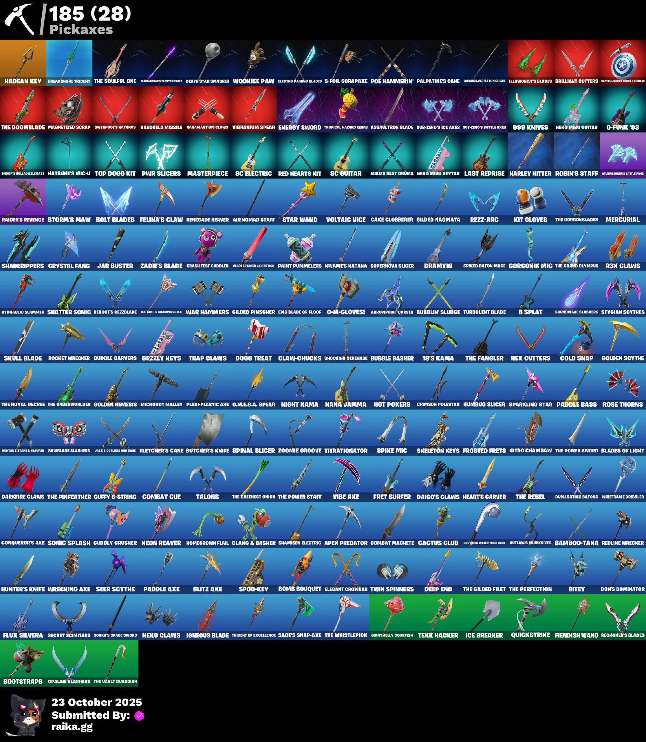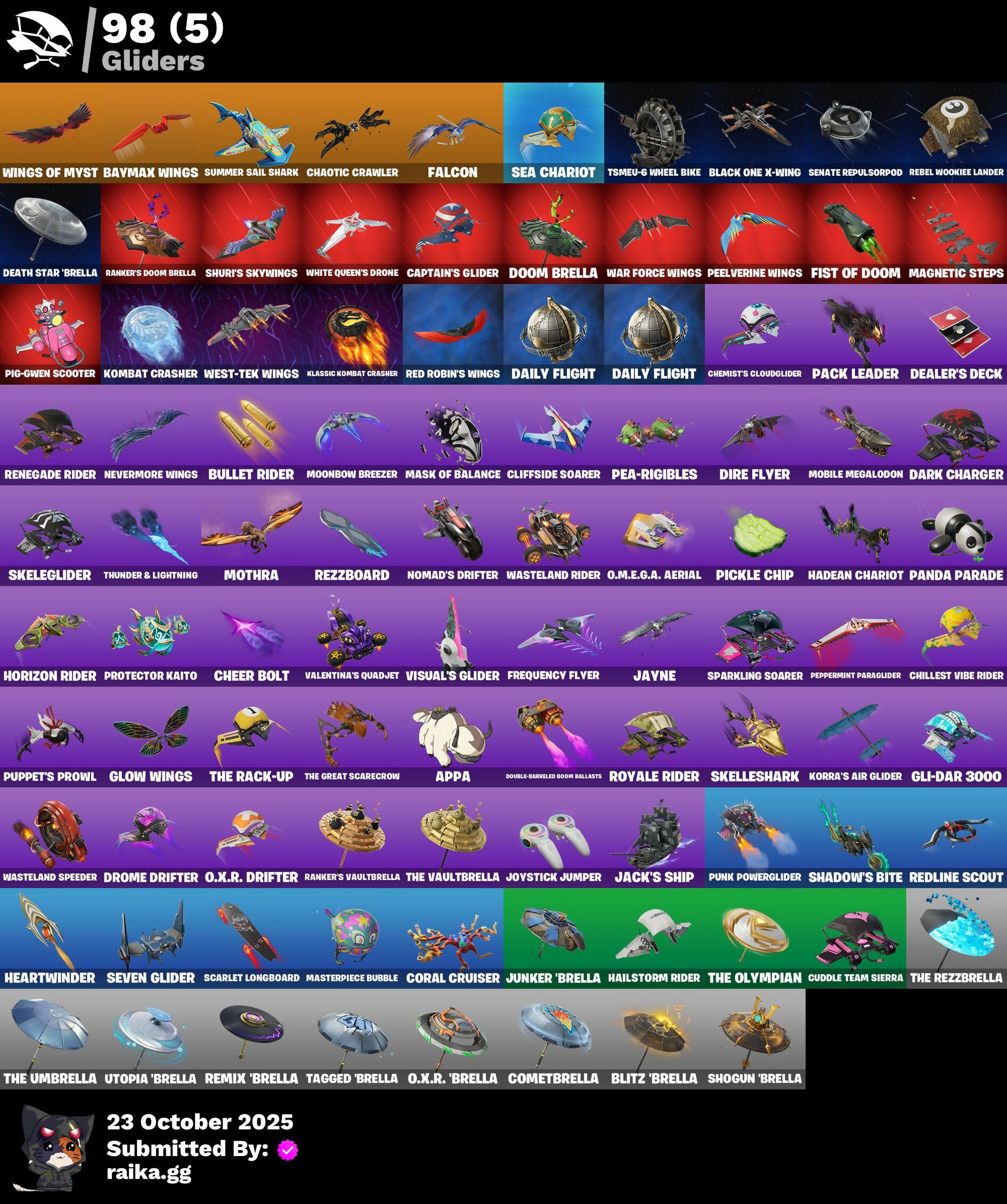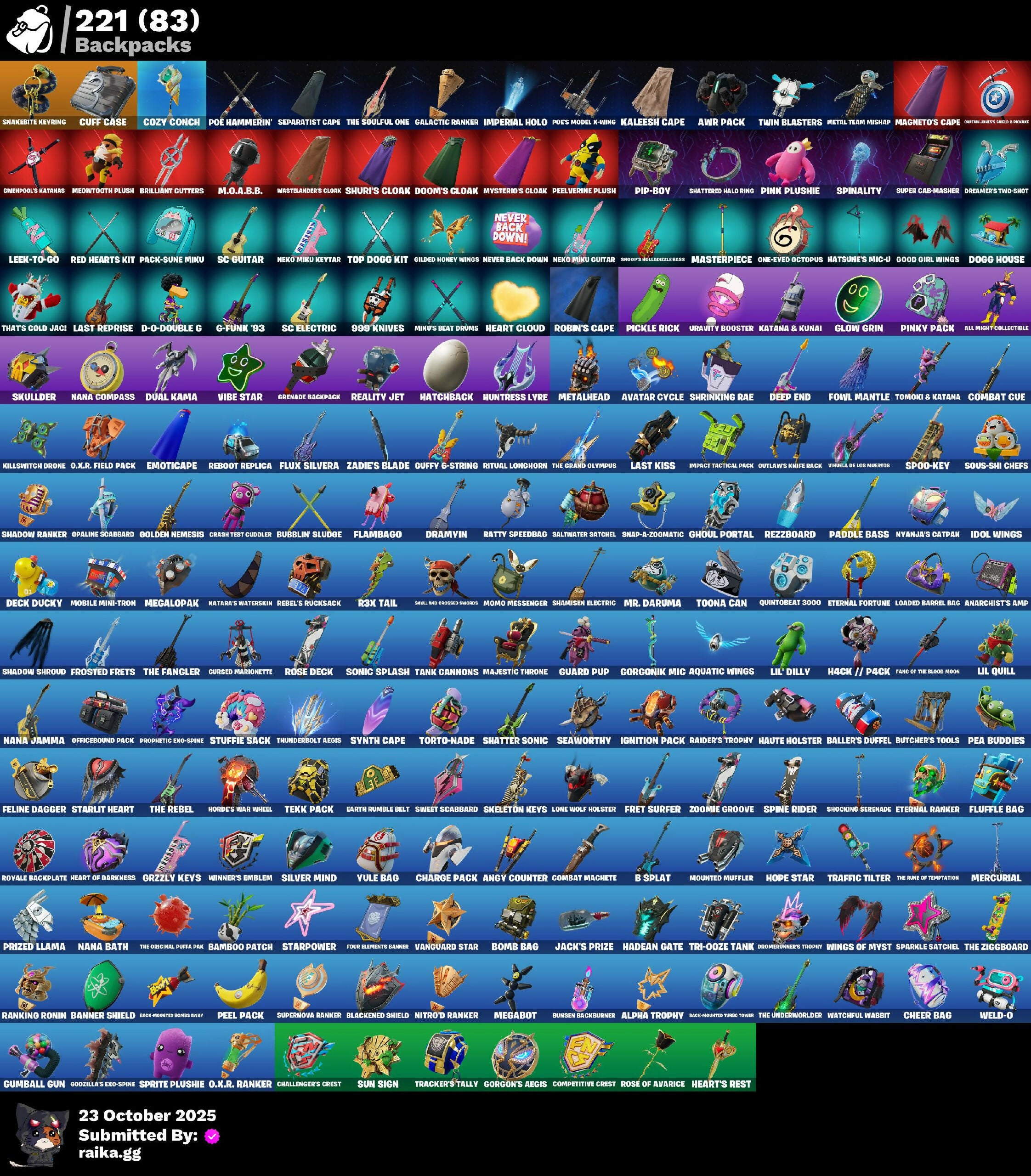 'Peel'd Face, (Snikt!), 1-Ball, 18's Kama, 999 Knives, AWR Pack, AWR Trooper, Aang, Aang's Air Sphere, Ace Pilot Poe, Ad Victoria M!, Adventure Peely, Aerial Assault Bomber, Aerial Classic, Aerial Swagger, Agent Patch, Air Nomad Staff, All I Want For Christmas Is You, All Might Collectible, Alpha Altimeter, Alpha Trophy, Anarchist's Amp, Andy Fangerson, Angy Counter, Apex Predator, Aphrodite, Appa, Apprentice Evie, Aquatic Wings, Arcane Research, Arctic Achiever, Armored Victory, Arrowpoint Carver, Art The Hack, Artemis, Ascend!, Assaultron Blade, Athleisure Assassin, Augury, Auntie Dot, Aura, Avatar Aang, Avatar Cycle, Avatar State Aang, Avatar's Flourish, Avla Winn, Aw, Shucks., Awr Armor, Axo's Big Moment, B Splat, B.R.U.T.E. Gunner, Babygirl!!, Back-Mounted Boss's Way, Back-Mounted Turbo Tower, Backlash, Balanced, Ball Control, Baller's Duffel, Bam-Boom!, Bamboo Patch, Bamboo-Tana, Banner Shield, Baron Kane, Baron's Hoard, Battle Blessing, Battle Bus Ballers Logo, Battle Gamer Mae, Battle Ready Poe, Baymax Wings, Beat Breaker, Belt It!, Bernie, Bi-Han, Big Dill, Big Smooch, Bike To Go, Bird Call, Birdarang Flourish, Birthday Bud, Bitev, Black Knight T-60 Power Armor, Black Leader, Black One X-Wing, Black Panther (Shuri), Black Queen, Blackened Shield, Blades of Light, Blazing Fire Cerberus, Blitz 'Brella, Blitz Axe, Bolt Blades, Bomb Bag, Bomb Bouquet, Bone Breaker, Bones, Boogie Down, Bootstraps, Bow Go, Break Point Ultra, Breakshore Trident, Brilliant Cutters, Brite & Speedy, Brite Bomber, Brite Hatsune Miku, Brite Moves, Brite Raider, Bruno's Blue Heart, Bubble Basher, Bubblin' Sludge, Buccaneer, Bullet Rider, Bunsen Backburner, Burning Sparks, Butcher's Knife, Butcher's Tools, Buzz Beat, By The Horns, Cactus Club, Cake Clobberer, Camo War Machine, Cap Attack, Caper, Captain Janew's Shield & Pickaxe, Captain Jones, Captain Jones (Pen & Ink), Captain Llamerica, Captain Phasma, Captain's Glider, Carbon Scarlet, Carmine Rosso, Cassidy Quinn, Cauldron Chill, Cerberus, Cerberus Bite, Cerberus Medallion, Chalked Up 1-Ball, Challenger Cerberus, Challenger's Crest, Chaos Directive, Chaos Director, Chaotic Crawler, Charge Pack, Cheer Bag, Cheer Bolt, Chemist's Cloudglider, Chigusa, Chillest Vibe Rider, Choose Naughty, Choose Your Alignment, Chord Kahele, Chun-Li, Clang & Basher, Classic Peelverine, Claw-Chucks, Cliffside Soarer, Codsworth's Cleanup, Cold Snap, Color Splash Jellie, Combat Cue, Combat Machete, Come Get Me!, Cometbrella, Competitive Crest, Competitor Medusa, Competitor Rust, Conch Call, Confident Iridia, Conjuring Mysterio, Conqueror's Axe, Conqueror's Charge, Conqueror's Claim, Conqueror's Stare, Controlled Chaos, Coral Cruiser, Corrosive Stripe, Corrosive Tag, Cosmic Legacy, Cosmos, Cournight Mares Logo, Courtside Axo, Cozy Conch, Cozy Holidays, Crash Test Cuddler, Crashed Chiller, Crashed Shield, Crimson Polestar, Cross Your Heart, Cross' Grand Entrance, Crowning Achievement, Crystal Fang, Ctl, Cuddle Bears Logo, Cuddle Carvers, Cuddle Team Sierra, Cuddle Team Specialist, Cuddle's Garden, Cuddly Crusher, Cuff Case, Cursed Marionette, D-O-Double G, Da Bomb, Daigo, Daigo's Claws, Daigo's Stance, Daily Flight, Dali, Dancefloor Diva, Dancin' Domino, Danica, Dark Charger, Dark Gwenpool, Dark Longhorn, Darkfire Claws, Darklands Brite Raider, Deal'em Cassidy Quinn, Dealer's Deck, Death Star 'Brella, Death Star Smasher, Deck Ducky, Deep End, Demon Hunter Hope, Determined Kendo, Determined Korra, Die With A Smile, Die with a Smile Bruno, Digital Dream, Dill With It, Dillicious, Dillinger The Gherk, Dino Megazord, Dire Flyer, Dire Goat, Dire Moon, Direct The Chaos, Disassemble, Diva Fever, Diva's Dancefloor, Diva's Grin, Dogg House, Dogg Treat, Don Of The Wastes, Don Target, Don's Dominator, Don't Mess With Patch, Doom, Doom Brella, Doom's Cloak, Doom's Domain, Doombringer's Trophy, Double-Barreled Boom Ballasts, Double-Suited Queen, Dough On The Go, Dramvin, Dreamer's Two-Shot, Drift Face, Drift Rifts Logo, Drip Queen, Drippin' Flavor, Drome Drifter, Dual Kama, Duelist's Card Trick, Dupli-Kate, Duplicating Batons, Duplikates, Durrr Face, Durrr Taisho, Dusk Knight, Dyna-Boom!, Dynamic Tintina, Dynamo, Dynamo Tintina, Dynamo Tntoon-A, Earth Rumble Belt, Eat Slurp, Electro Pairing Blades, Elegant Crowbar, Elemental Cycle, Elite's Sigil, Elysian Artemis, Elysium, Emma Frost, Emma's Influence, Emoticape, Emperor Palpatine, Emperor's Might, Energized Godzilla, Energy Sword, Epic Blade of Floof, Eternal Fortune, Eternal Hunt, Eternal Ranker, Eternal Renegade, Evie's Force Balance, Evie's Saber Attack, Evil Plan, Evolved Heat Ray, Eyes Of The Cuddle Team, Falcon, Fang of the Blood Moon, Feel The Force, Felina, Felina's Claw, Feline Dagger, Feral Finisher, Festival Lace, Fiendish Wand, Fire Show, Fireworks Salvo, Fish Face, Fishstick, Fishy, Fishy Flourish, Fist Bump, Fist Of Doom, Flambago, Flash Of Lightning, Fletcher Kane, Fletcher's Cane, Flow, Flow Bones, Fluffle Bag, Flux Silvera, For O.X.R.!, Force Lightning, Forsaken Eye, Four Elements Banner, Fowl Mantle, Frequency Flyer, Fret Surfer, Front Page Pose, Frosted Frets, Frozen Treat Cart, Full Moon Fletcher Kane, Future Goat, Futuristic, G-Funk '93, Galactic Ranker, General Grievous, Get Griddy, Get H.O.T., Gg Cuddlez, Ghoul Portal, Giant Jelly Sourfish, Gilded Heart, Gilded Honey Wings, Gilded Naginata, Gilded Pinscher, Gli-Dar 3000, Glory To Latveria, Glow Grin, Glow Wings, Go Megazord!, Goat Sticks Logo, Godzilla Awaits, Godzilla Evolved, Godzilla's Exo-Spine, Golden Conqueror, Golden Ghoul, Golden Grin, Golden Nemesis, Golden Scythe, Golden Wolf, Gong-Gi Great, Good Game!, Good Girl Wings, Good Sportsmanship, Gorgon's Aegis, Gorgonik Mic, Gothic Morgan, Grenade Backpack, Grievous Stare, Grim Grin, Grim King Hades, Groovy!, Grzzly Keys, Guard Pup, Guff, Guffy 6-String, Guffy G-String, Gumball Gun, Gummy Fishstick, Gunmetal Idol, Gwen-step, Gwenpool, Gwenpool's Glee, Gwenpool's Katanas, Gwetterman Jacket, Hack // Pack, Hadean Chariot