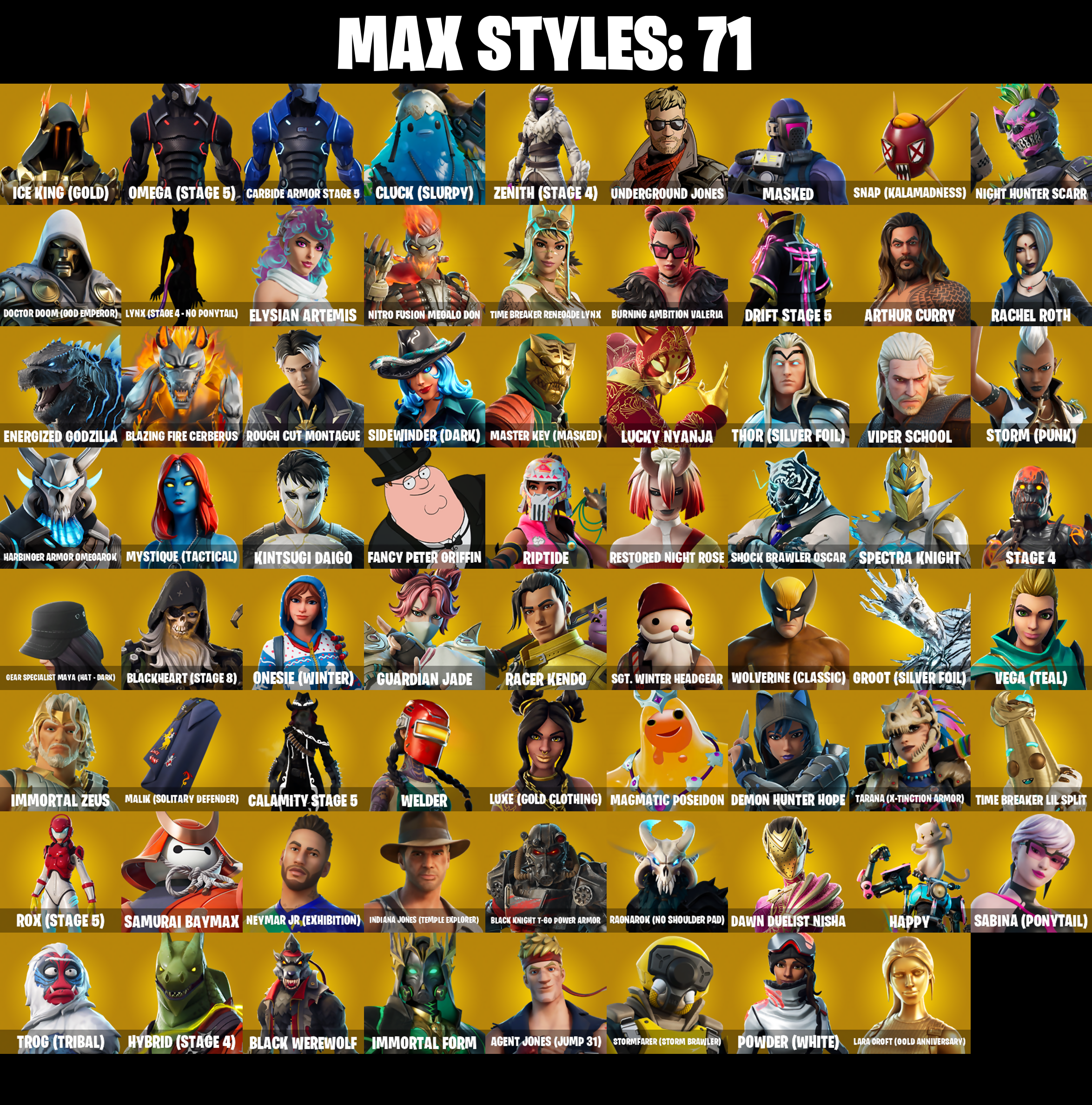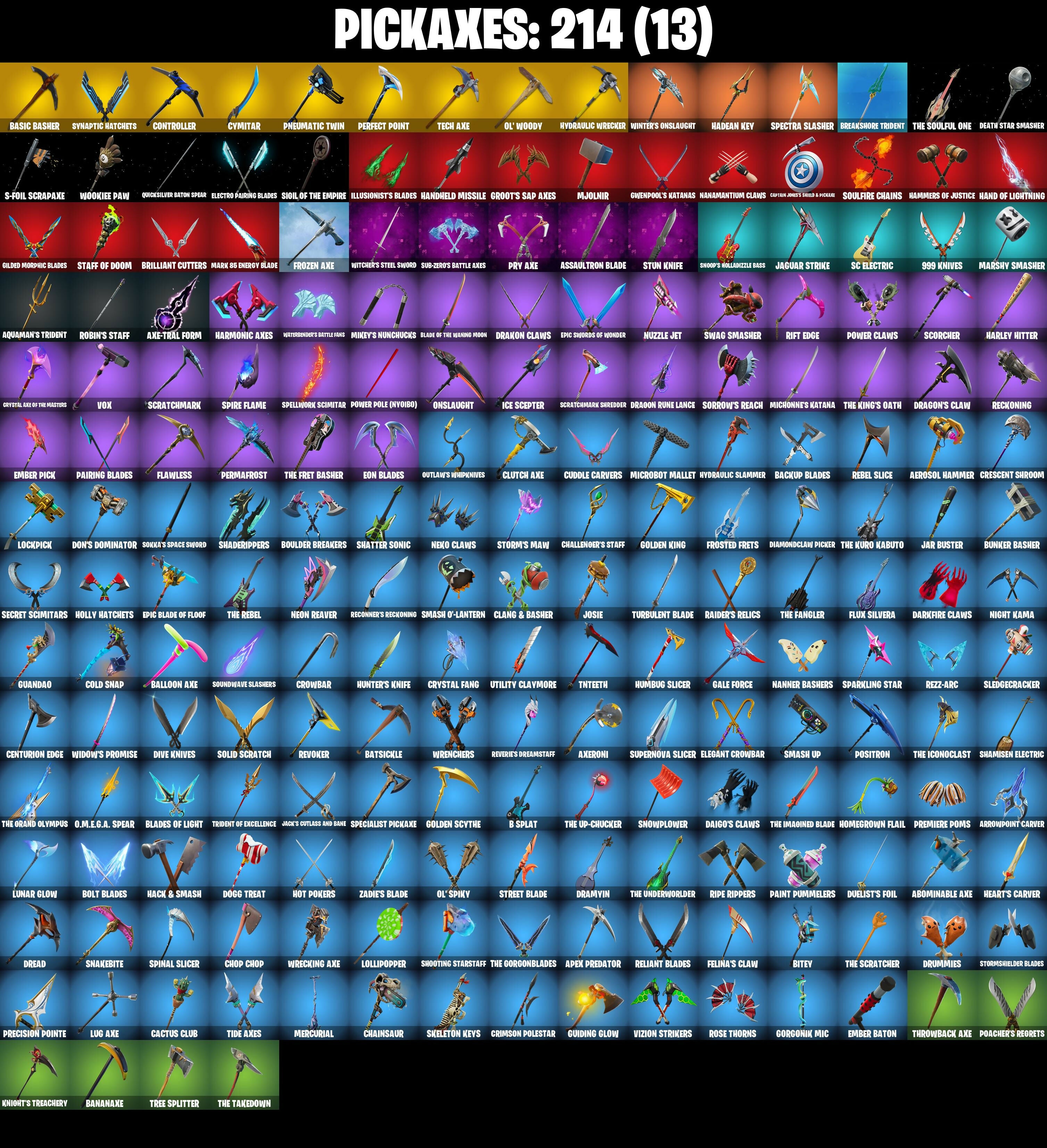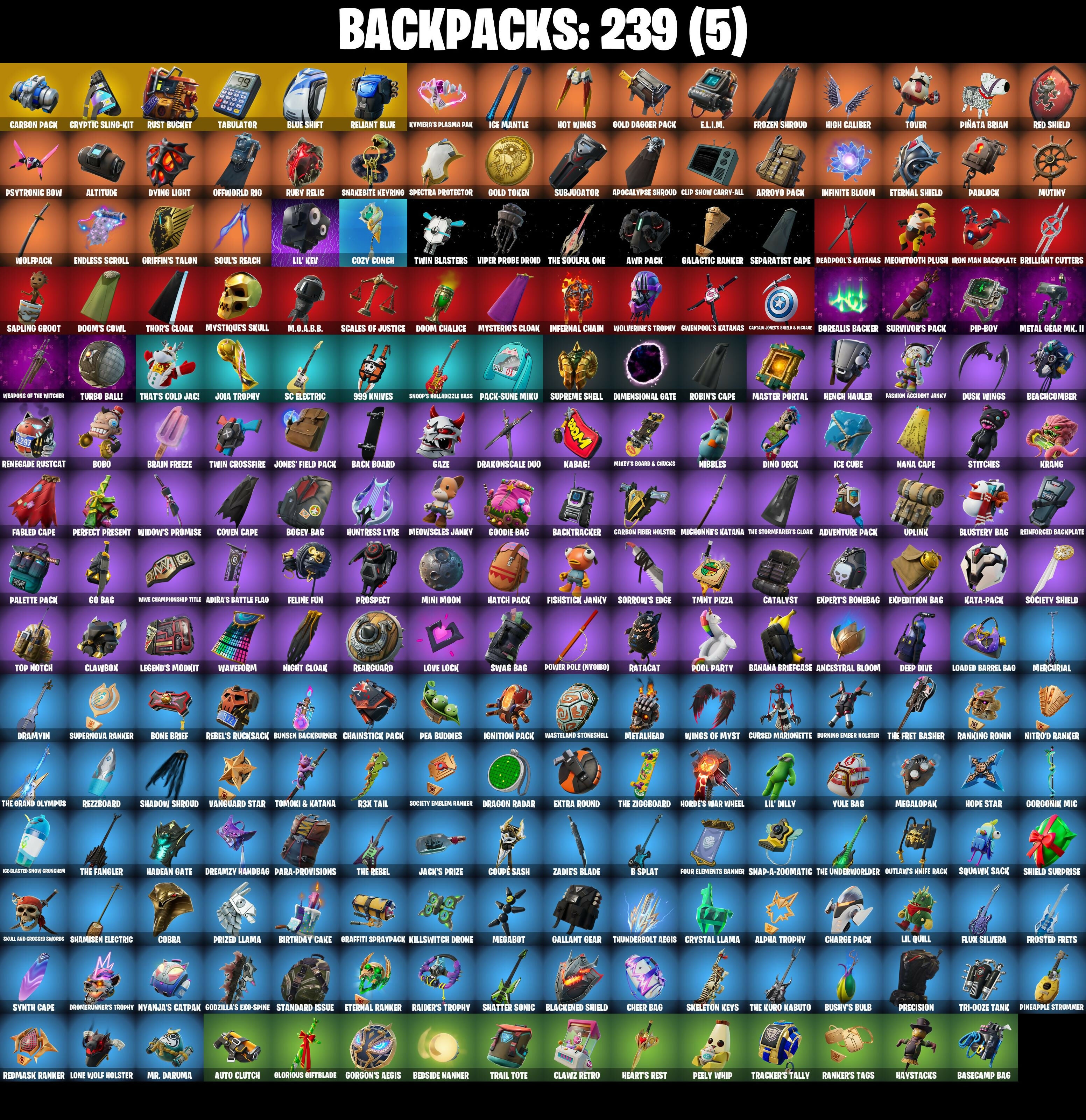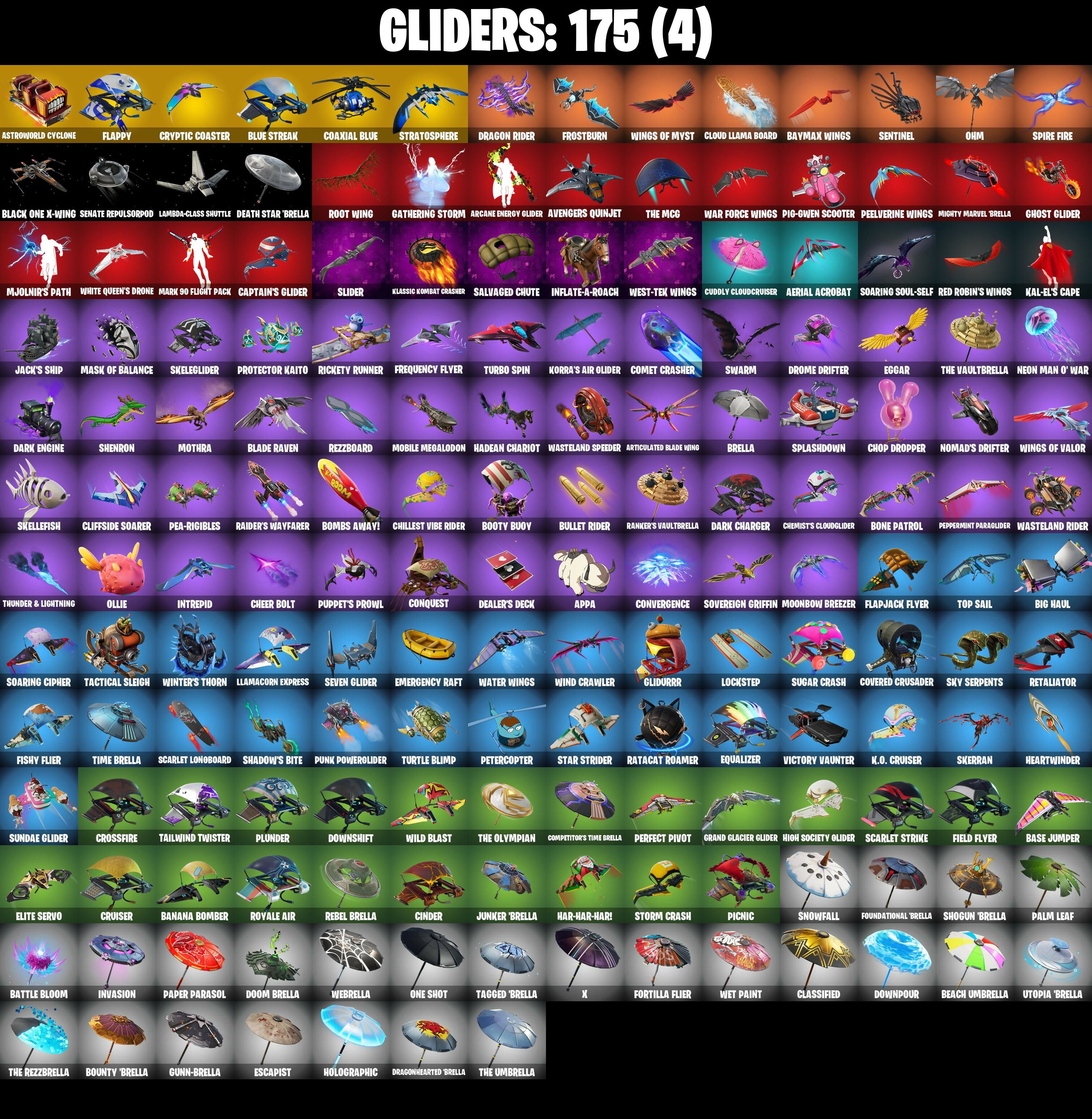 999 Knives, A.I.M., AWR Pack, Abominable Axe, Adira, Adira's Battle Flag, Adventure Pack, Aerial Acrobat, Aerosol Hammer, Agent Jones, Agent Jones (Jump 31), Agent Peely, Air Shredder, Alpha Trophy, Altitude, Ancestral Bloom, Apex Predator, Aphrodite, Apocalypse Shroud, Appa, Aquaman, Aquaman's Trident, Arcane Energy Glider, Arcane Research, Arrowpoint Carver, Arroyo Pack, Artemis, Arthur Curry, Articulated Blade Wing, Assault Trooper, Assaultron Blade, Astroworld Cyclone, Aura, Auto Clutch, Avatar's Flourish, Avengers Quinjet, Axe-tral Form, Axeroni, Azarath Metreon Zinthos!, B Splat, Back Board, Backtracker, Backup Blades, Balloon Axe, Banana Bomber, Banana Briefcase, Bananaxe, Baron's Hoard, Base Jumper, Basecamp Bag, Basic Basher, Batsickle, Battle Blessing, Battle Bloom, Battlehawk, Baymax Wings, Beach Umbrella, Beachcomber, Bean Bag, Bedside Nanner, Beep Beep, Big Haul, Billy Bounce, Birdarang Flourish, Birthday Cake, Bitey, Black Knight T-60 Power Armor, Black One X-Wing, Black Werewolf, Blackened Shield, Blackheart, Blackheart (Stage 8), Blade Raven, Blade of the Waning Moon, Blades of Light, Blazing Fire Cerberus, Blowin' Up, Blue Shift, Blue Streak, Blue Striker, Blue Team Leader, Blustery Bag, Bobo, Bogey Bag, Bolt Blades, Bombs Away!, Bone Brief, Bone Patrol, Boneless, Boobytrapped, Boogie Down, Boosting Ki, Boots 'N' Cats, Booty Buoy, Borealis Backer, Boulder Breakers, Bounty 'Brella, Brain Freeze, Breakdown, Breakshore Trident, Brella, Brilliant Cutters, Brite Moves, Brite Raider, Brutus, Budge, Bullet Rider, Bunker Basher, Bunker Jonesy, Bunny Hop, Bunsen Backburner, Burning Ambition Valeria, Burning Ember Holster, Bushy's Bulb, C'Mere, Cactus Club, Calamity, Calamity Stage 5, Calculated, Call Me, Cammy, Captain America's Shield & Pickaxe, Captain James's Shield & Pistol, Captain Jones, Captain Lamerica, Captain's Glider, Carbide, Carbide Armor Stage 5, Carbon Commando, Carbon Fiber Holster, Carbon Pack, Card Drop, Cardistry, Cat Flip, Catalyst, Catling Gun, Centurion, Centurion Edge, Cerberus, Chainsaur, Chainstick Pack, Challenger's Staff, Charge Pack, Charging Up, Cheer Bag, Cheer Bolt, Chemist's Cloudglider, Chess Master, Chillest Vibe Rider, Choice Knit, Chop Chop, Chop Dropper, Cinder, Clang & Basher, Clara, Classified, Clawbox, Clawz Retro, Clean Groove, Clean Sweep, Cliffside Soarer, Clip Show Carry-All, Cloud Llama Board, Cluck, Cluck (Slurpy), Cluck Strut, Clutch Axe, Coaxial Blue, Cobalt, Cobra, Codsworth's Cleanup, Coin Flip, Cold Snap, Comet Crasher, Competitor's Time Brella, Conch Call, Confused, Conga, Conquest, Controller, Convergence, Coupé Sash, Coven Cape, Covered Crusader, Cozy Conch, Crabby, Crescent Shroom, Crimson Polestar, Crossfire, Crowbar, Crowning Achievement, Cruiser, Cryptic Coaster, Cryptic Sling-Kit, Crystal Axe of the Masters, Crystal Fang, Crystal Llama, Cuddle Carvers, Cuddly Cloudcruiser, Cursed Marionette, Cyclo Curl, Cymitar, DJ Yonder, Dagger Dance, Daigo, Daigo's Claws, Dark Charger, Dark Doggo, Dark Engine, Darkfire Claws, Darth Vader, Davdream, Dawn Duelist Nisha, Deadpool, Deadpool's Katanas, Dealer's Deck, Death Star 'Brella, Death Star Smasher, Deep Dive, Deep End, Deimos, Demi, Demon Hunter Hope, Diamond Throne, Diamondclaw Picker, Dimensional Gate, Dino Deck, Dip, Dire, Dive Knives, Dizzie, Do The 'Split, Doctor Doom, Doctor Doom (God Emperor), Dogg Treat, Don's Dominator, Doom Brella, Doom Chalice, Doom's Cowl, Downpour, Downshift, Doze Dab, Dragon Radar, Dragon Rider, Dragon Rune Lance, Dragon Stance, Dragon Steel Hybrid, Dragon's Claw, Dragonhearted 'Brella, Drakon Claws, Drakonscale Duo, Dramyin, Dread, Dreamzy Handbag, Drift, Drift Stage 5, Drome Drifter, Dromerunner's Trophy, Drummies, Duelist's Foil, Dusk, Dusk Knight, Dusk Wings, Dying Light, E.L.I.M., Eggar, Electro Pairing Blades, Electro Shuffle, Electro Swing, Elegant Crowbar, Elite Servo, Elysian Artemis, Ember, Ember Baton, Ember Pick, Emergency Raft, Emma Frost, Endless Scroll, Energized Godzilla, Enforcer, Eon Blades, Epic Blade of Floof, Epic Swords of Wonder, Equalizer, Escapist, Eternal Knight, Eternal Ranker, Eternal Shield, Evasive Maneuvers, Evie, Expedition Bag, Expert's Bonebag, Extra Round, Extraterrestrial, Ezio Auditore, Fable, Fabled Cape, Face Palm, Fade, Fancy Feet, Fancy Peter Griffin, Fashion Accident Janky, Feelin' Jaunty, Felina, Felina's Claw, Feline Fun, Field Flyer, Fierce, Fire Show, Fishstick Janky, Fishy Flier, Fist Bump, Flamenco, Flapjack Flyer, Flapjackie, Flappy, Flashback Breakdown, Flawless, Flippin' Away, Flippin' Incredible, Flux Silvera, Foil Flex, Fortilla Flier, Foundational 'Brella, Four Elements Banner, Free Flow, Frequency Flyer, Frostburn, Frosted Frets, Frozen Axe, Frozen Shroud, Galactic Ranker, Gale Force, Gallant Gear, Gathering Storm, Gaze, Gear Specialist Maya, Gear Specialist Maya (Hat - Dark), Gentleman's Dab, Geralt of Rivia, Get Funky, Ghost Glider, Ghost Rider, Giddy-Up, Gilded Morphic Blades, Glidurrr, Glorious Giftblade, Go Bag, Go Home!, Godzilla Evolved, Godzilla's Exo-Spine, Gold Dagger Pack, Gold Token, Golden King, Golden Scythe, Golf Clap, Goodie Bag, Gorgon's Aegis, Gorgonik Mic, Gorgonz Mic, Graffiti Spraypack, Grand Glacier Glider, Griffin's Talon, Groot, Groot (Silver Foil), Groot's Sap Axes, Groove Jam, Guandao, Guardian Jade, Guiding Glow, Guitar Walk, Gunn-Brella, Gwen-Step, Gwenpool, Gwenpool's Katanas, Gwenpools Katanas, Hack & Smash, Hadean Chariot, Hadean Gate, Hadean Key, Hades, Hammers of Justice, Hand of Lightning, Handheld Missile, Hang Loose Celebration, Happy, Har-Har-Har!, Harbinger Armor Omegarok, Harley Hitter, Harmonic Axes, Hatch Pack, Hatsune Miku, Have A Seat, Haylee Skye, Haystacks, Headbanger, Heart's Carver, Heart's Rest, Heartwinder, Heelfire Dance, Hello Friend, Hench Hauler, Hero Baymax, High Caliber, High Society Glider, Holiday Boxy, Holly Hatchets, Holographic, Homegrown Flail, Hoop Master, Hope, Hope Star, Horde's War Wheel, Hot Marat, Hot Pokers, Hot Wings, Humbug Slic