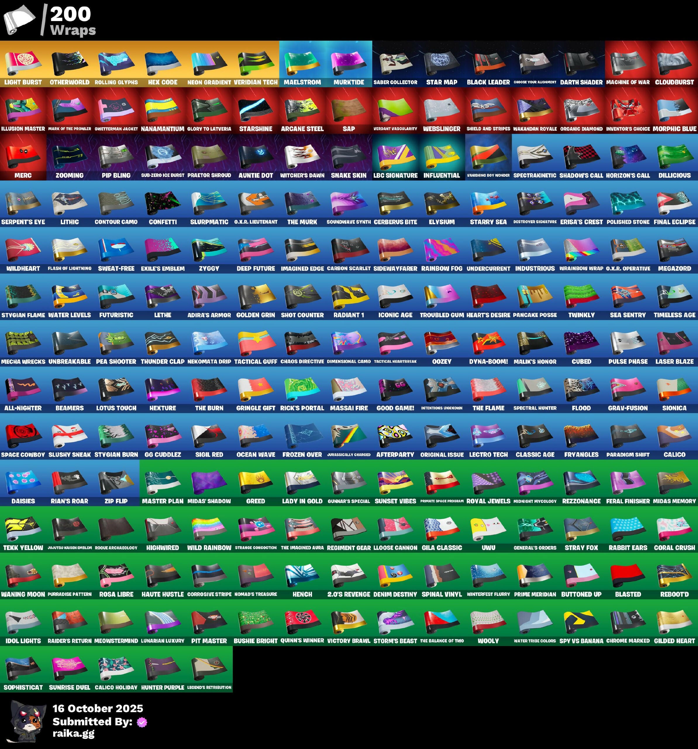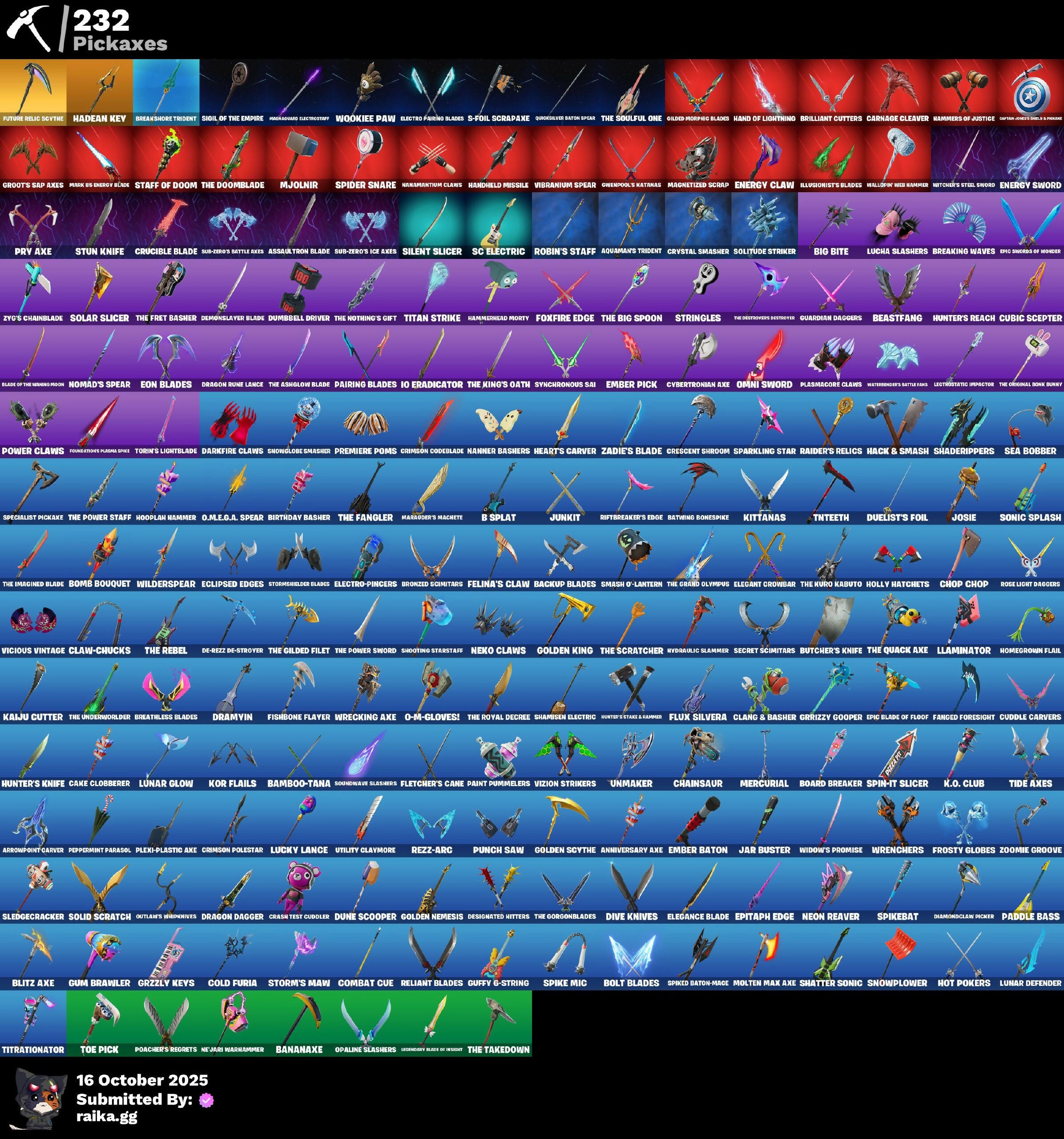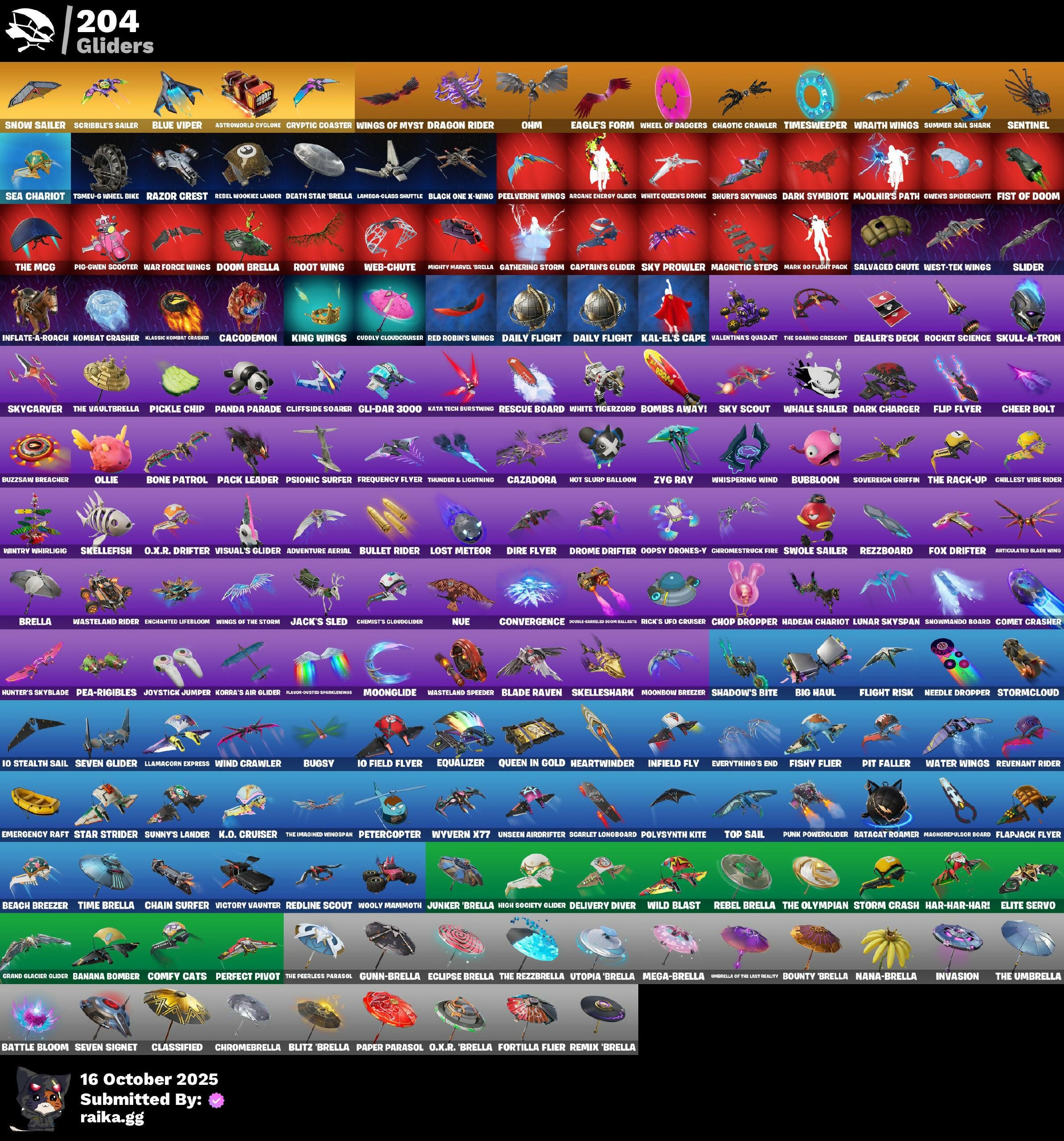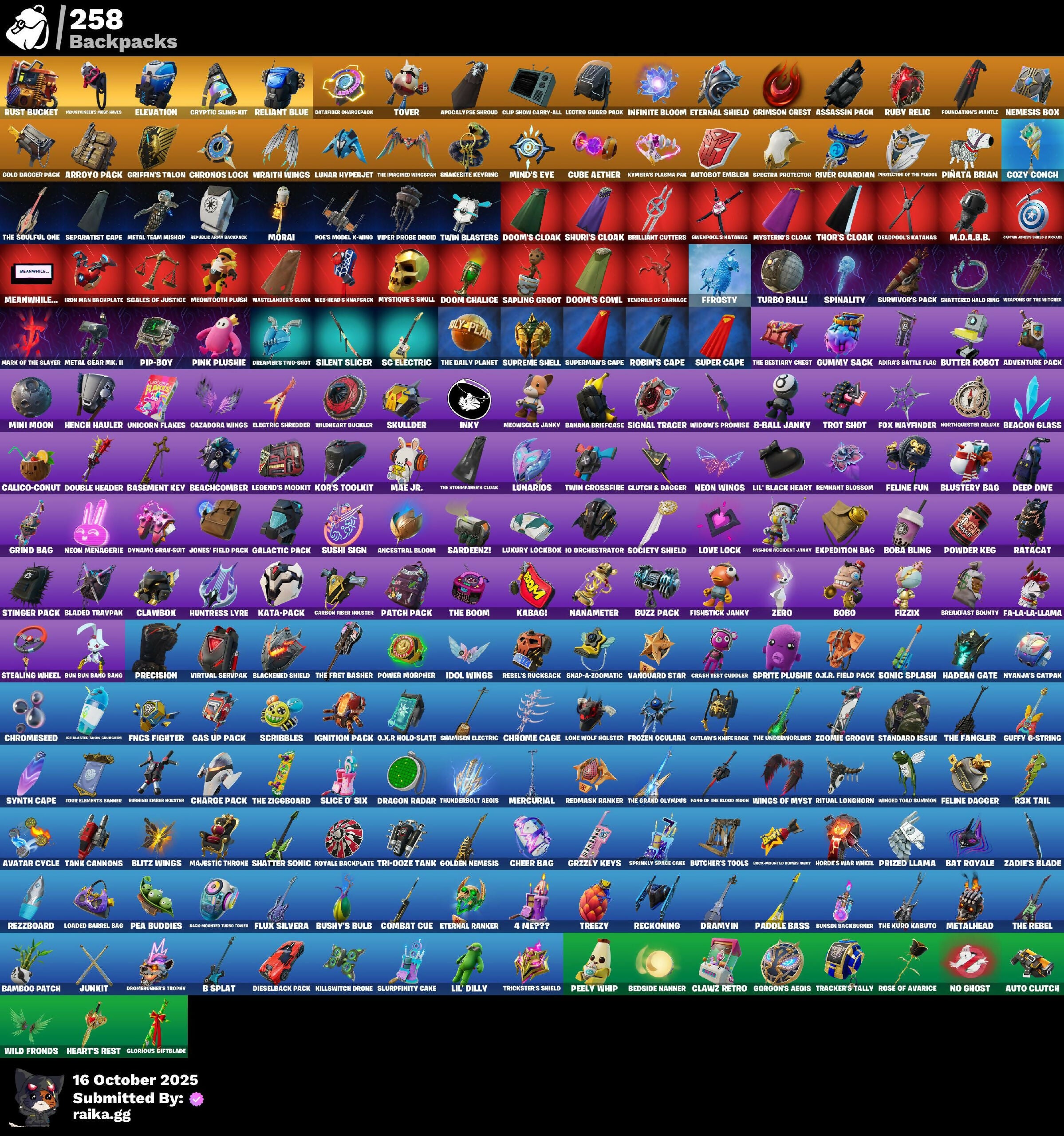 (SNIKT!), 1-Ball, 10 Field Flyer, 10 Stealth Sail, 2.0's Revenge, 4 Me???, 8-Ball Janky, Abduction, Ace Pilot Poe, Adira, Adira's Armor, Adira's Battle Flag, Adventure Aerial, Adventure Pack, Aerial, Afterparty, Agent Jones, Agent Nana, Agent Patch, Agent Peel V, Agent Peely, Ahsoka Tano, Air Shredder, All-Nighter, Ancestral Bloom, Anniversary Axe, Antonia, Antonia in Action, Aphrodite, Apocalypse Shroud, Appeeling Drive, Apprentice Evie, Aquaman, Aquaman's Trident, Arachrobatics, Arcade Cat, Arcane Energy Glider, Arcane Research, Arcane Steel, Arctic Adeline, Armored Victory, Arrowpoint Carver, Arroyo Pack, Art The Hack, Artemis, Artemis Insignia, Articulated Blade Wing, Assassin Pack, Assaultron Blade, Astro Antidote, Astro Armor, Astro Jack, Astroworld Cyclone, Auntie Dot, Aurelian, Auto Clutch, Autobot, Autobot Emblem, Avatar Cycle, Avatar's Flourish, B Splat, Babygirl!!, Backup Blades, Balance Board, Balanced, Bam-Boom!, Bamboo Patch, Bamboo-Tana, Banana Bomber, Banana Briefcase, Bananaxe, Banner, Banner Icon, Baron's Hoard, Baseball, Basement Key, Bat Royale, Battle Ball, Battle Bloom, Battle Gamer Mae, Battle Mode, Battle Ready Era, Battle Ready Poe, Battle-Tested, Batwing Bonespike, Be Seeing You, Beach Breezer, Beachcomber, Beacon Glass, Beamers, Beastfang, Beatzbunny, Bedside Nanner, Beep Beep, Belt It!, Berserker Barrage, Bi-Han, Big Bite, Big Dill, Big Fan, Big Guns, Big Haul, Bike To Go, Birdarang Flourish, Birthday Basher, Birthday Bud, Birthday Dash, Black Eternal Knight, Black Hole, Black Leader, Black One X-Wing, Black Panther (Shuri), Black Queen, Blackened Shield, Blade Of The Waning Moon, Blade Raven, Bladed Travpak, Blasted, Blinding Lights, Blitz Axe, Blitz Wings, Blitz ‘Brella, Blizzard Bomber, Blocko, Blowin' Up, Blue Viper, Blustery Bag, Board Breaker, Boba Bling, Boba Snack, Bobo, Bolt Blades, Bomb Bouquet, Bombs Away!, Bombstic Winterfest, Bone Patrol, Boogie Down, Boomin', Boosting Ki, Boot It, Both Eyes Open, Bounty 'Brella, Breakfast Bounty, Breaking Waves, Breakshore Trident, Breathless Blades, Brella, Brilliant Cutters, Bronzed Scimitars, Brutus, Bubblegum Highwire, Bubbloon, Buffer Fish, Bug Off, Bug Spray, Bugsv, Build Up, Bullet Rider, Bun Bun Bang Bang, Bun Bun Blast, Bunsen Backburner, Burn Bright, Burning Ambition Valeria, Burning Ember Molten, Bushie Bright, Bushy's Bulb, Butcher's Knife, Butcher's Tools, Butter Robot, Buttoned Up, Buzz Pack, Buzzsaw Breacher, By The Horns, Bytes, Bytes' Sigil, Cacodemon, Cake Clobberer, Calico, Calico Holiday, Calico-Coconut, Calico-Conut, Call Me, Captain America, Captain America's Shield & Pickaxe, Captain James Shield & Pedestal, Captain Jones, Captain's Glider, Carbon Fiber Holster, Carbon Scarlet, Card Drop, Cardistry, Carnage, Carnage Cleaver, Cash Grab, Cassidy Quinn, Cazadora, Cazadora Wings, Cerberus, Cerberus Bite, Cerberus Medallion, Chain Surfer, Chainsaur, Chalked Up 1-Ball, Challenger Cerberus, Champonkasi View, Chaos Directive, Chaos Director, Chaotic Crawler, Charge Pack, Charlotte, Charlotte's Logo, Cheer Bag, Cheer Bolt, Chef's Special, Chemist's Cloudglider, Chillest Vibe Rider, Choice Knit, Chomp Cudi, Chop Chop, Chop Dropper, Choppy, Chrome Cage, Chrome Marked, Chrome Punk, Chromebrella, Chromeseed, Chromestruck Fire, Chronos Lock, Chugga-Chugga, Ciri, Clang & Basher, Clark Kent, Classic Age, Classic Peelverine, Classified, Claw-Chucks, Clawbox, Clawz Retro, Clean Sweep, Cliffside Soarer, Clip Show Carry-All, Cloud Striker, Cloudburst, Clutch & Dagger, Codsworth's Cleanup, Coin Flip, Cold Furia, Collector Kado Thorne, Combat Cue, Combat Elite, Comet, Comet Crasher, Comfy Cats, Competitor Medusa, Conch Call, Confetti, Conjuring Mysterio, Console Cup, Contour Camo, Controlled Chaos, Convergence, Copines, Coral Commando, Coral Crush, Corrosive Stripe, Corrosive Tag, Count It!, Courageous Mikasa, Cowboy Chat, Cozy Conch, Crabby King, Crack It, Crash Test Cuddler, Crashed Shield, Crazy Castle, Crescent Shroom, Crimson Codeblade, Crimson Crest, Crimson Polestar, Cross' Grand Entrance, Crowning Achievement, Crucible Blade, Cryptic Coaster, Cryptic Sigil, Cryptic Sling-Kit, Crystal Smasher, Cube Aether, Cubed, Cubic Scepter, Cuddle Carvers, Cuddles Garden, Cuddly Cloudcruiser, Cybertronian Axe, Cyclo Curl, D.C. 63, Daft Punk Profile, Dagger Dance, Daily Flight, Daisies, Dance Monkey, Dark Charger, Dark Gwenpool, Dark Symbiote, Darkfire Claws, Darth Shader, Darth Vader, Datafiber Chargepack, Datafier Chargepack, Dawn Duelist Nisha, De-Rezz De-Stroyer, Deadpool, Deadpool's Katanas, Dealer's Deck, Death Star ‘Brella, Debuggin, Deep Dive, Deep Future, Delivery Diver, Demons Beware, Demonslayer Blade, Denim Destiny, Designated Hitters, Destroyer Signature, Determined Korra, Diamond Throne, Diamondclaw Picker, Dice Roll, Dieselback Pack, Dillicious, Dillinger The Gherk, Dimensional Camo, Dino Megazord, Dire Flyer, Dirtbike Challenge, Diva's Grin, Dive Knives, Doctor Doom, Doctor Slone, Dolphin, Don't Mess With Patch, Don't Start Now, Doom, Doom Brella, Doom Chalice, Doom Slayer, Doom's Cloak, Doom's Cowl, Doom's Domain, Double Header, Double-Barreled Boom Ballasts, Doze Dab, Dragon Dagger, Dragon Daggers Song, Dragon Radar, Dragon Rider, Dragon Rune Lance, Dragon Rune Lances, Dragon Spirit, Dragonrunner's Trophy, Dramatic Flares, Dramvin, Dramyin, Dreamer's Two-Shot, Drome Drifter, Droopy, Dropout, Duelist's Card Trick, Duelist's Foil, Dumbbell Driver, Dumbell Driver, Dune Scooper, Dusk Knight, Dusty, Dyna-Boom!, Dynamite, Dynamo, Dynamo Grav-Suit, Dynamo Tntina, Dynamo Tntoon-A, Eagle's Form, Eclipse Brella, Eclipsed Edges, Electric Shredder, Electro Pairing Blades, Electro-Pincers, Elegance Blade, Elegant Crowbar, Elemental Cycle, Elevation, Elite Servo, Elysium, Ember Baton, Ember Pick, Emergency Raft, Emma Frost, Emma's Influence, Empress Fan Dance, Enchanted Lifebloom, Energy Claw, Energy Sword, Eon Blades, Epic Blade Of Floof, Epic Swords Of Wonder, Epitaph Edge, Equalizer, Era, Eren Jaeger, Eren's