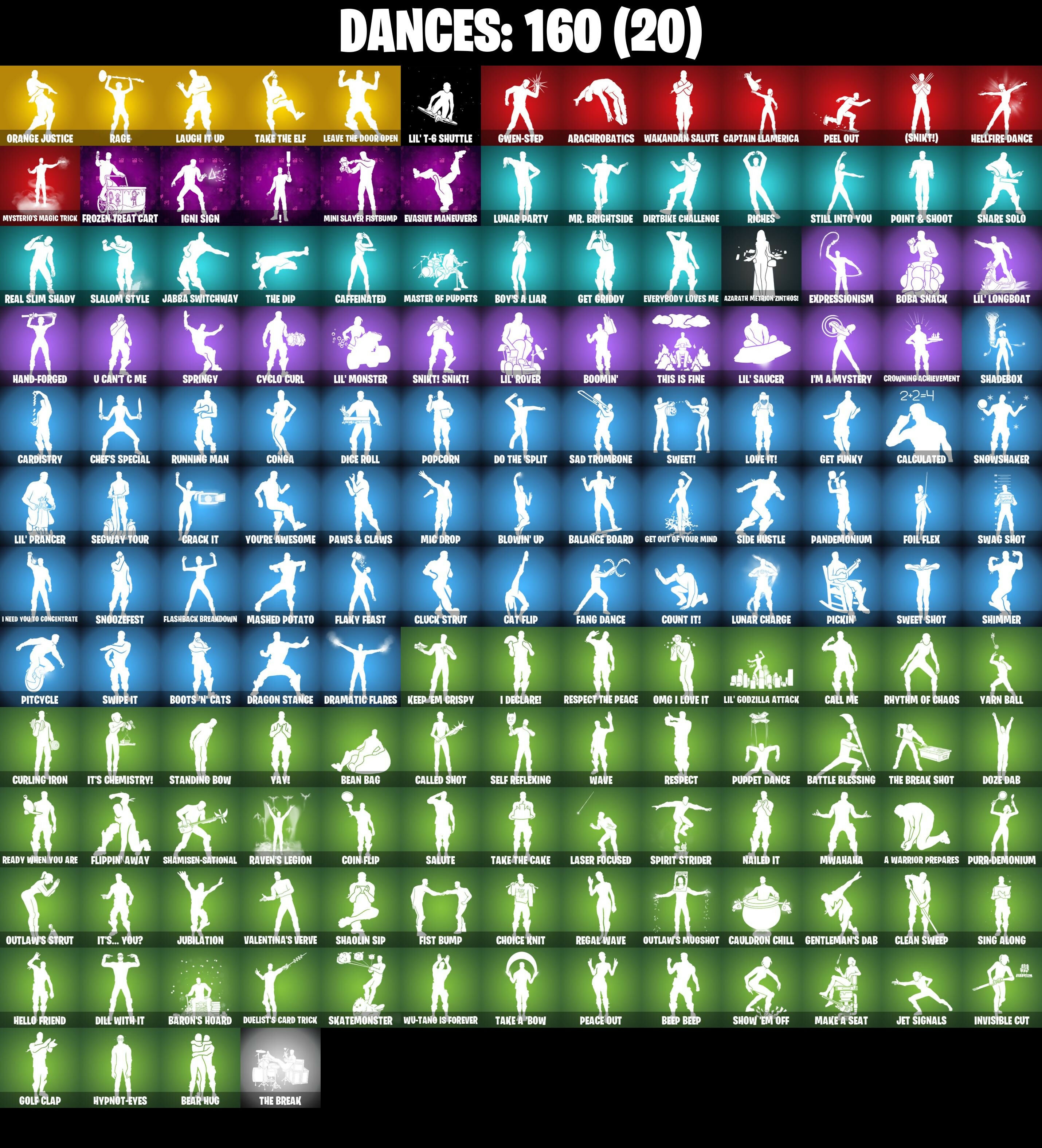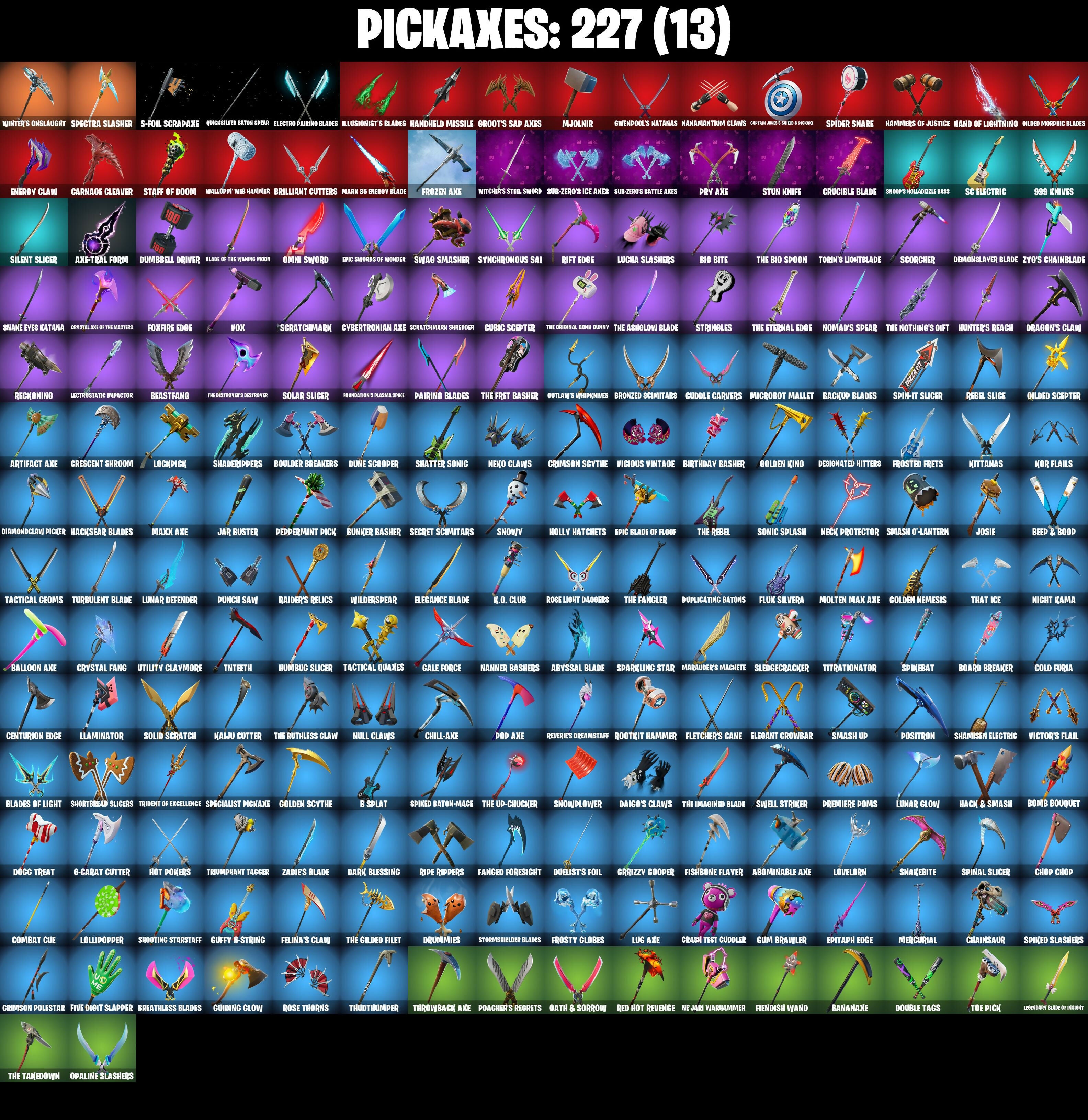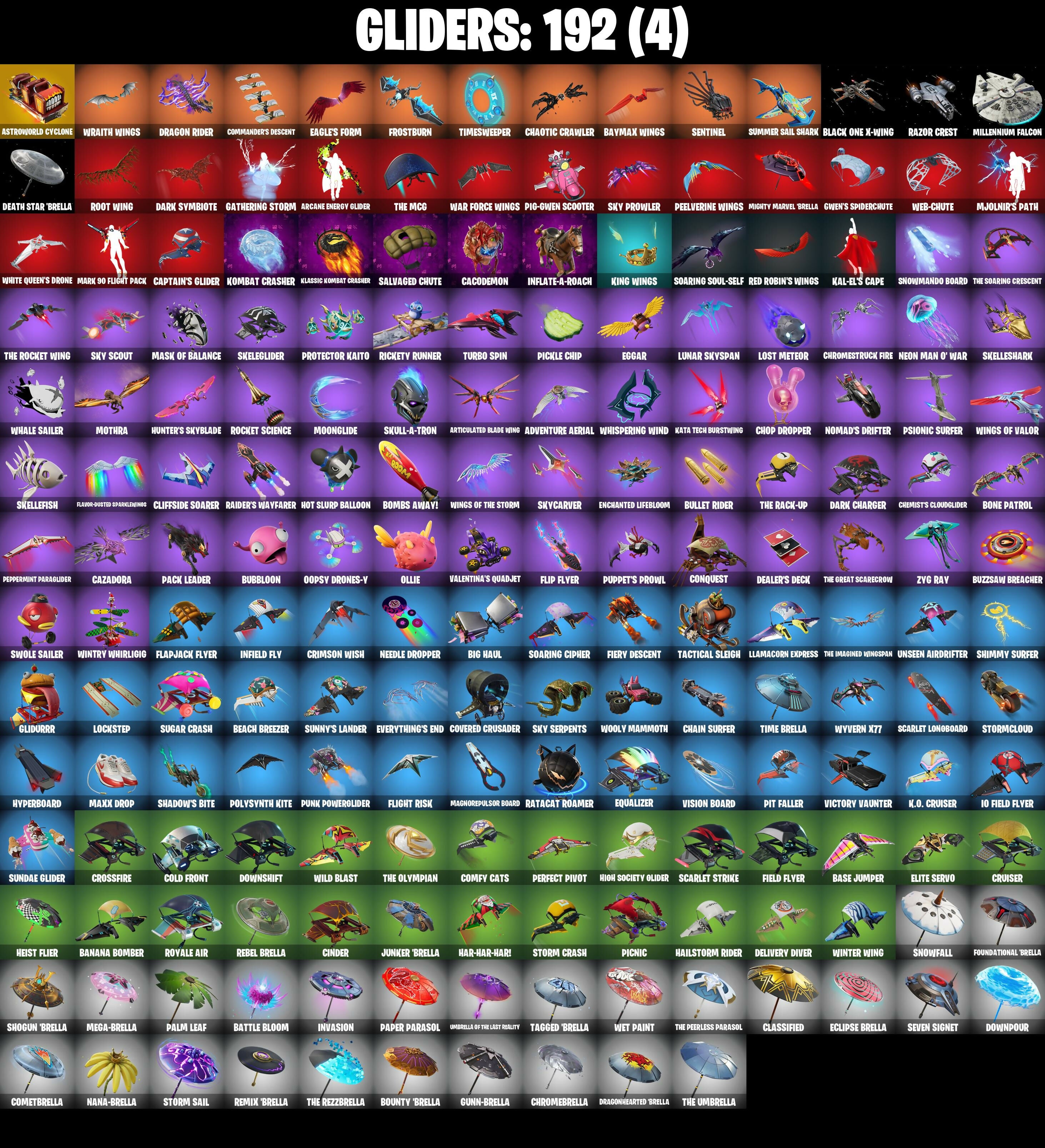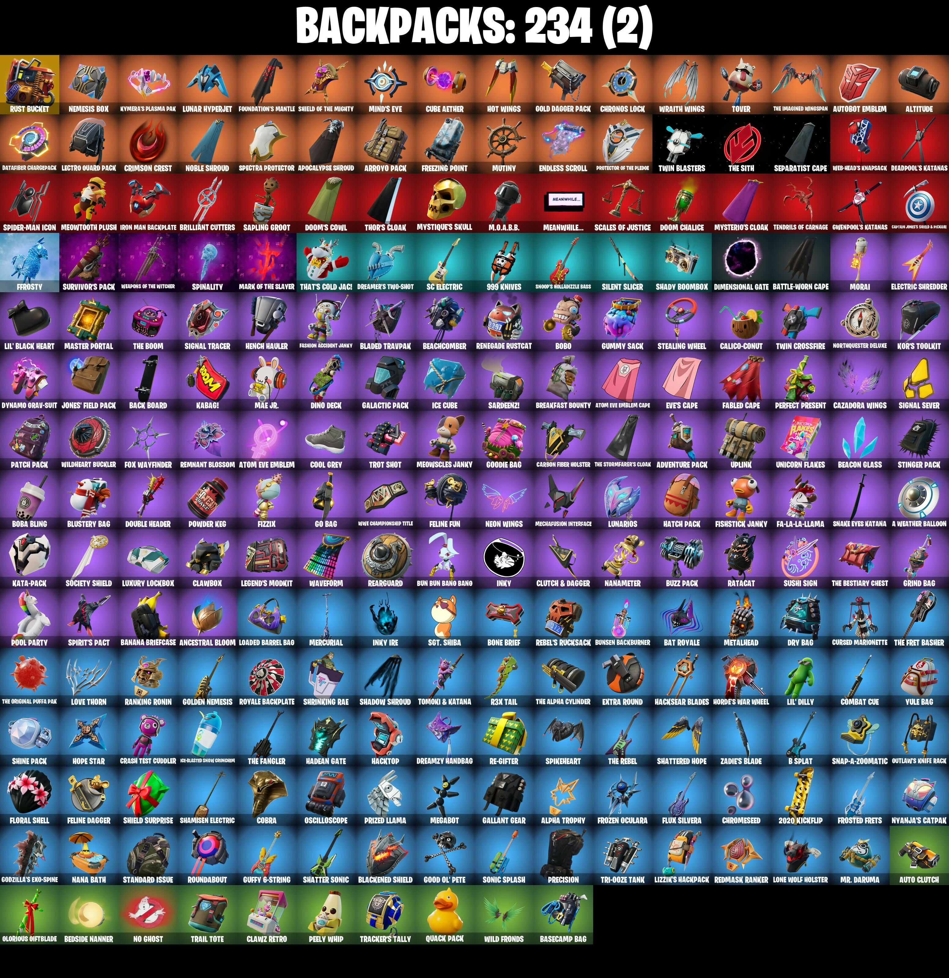 (SnikT!), 1-Ball, 10 Field Flyer, 2020 Kickflip, 6-Carat Cutter, 999 Knives, A Warrior Prepares, A Weather Balloon, Abominable Axe, AbseNz, Abyssal Blade, Adventure Aerial, Adventure Pack, Agent Jones, Agent Jones (Jump 31), Agent Peely, Alpha Trophy, Altitude, Ancestral Bloom, Antonia, Apocalypse Shroud, Arachnobatics, Arcane Energy Glider, Arctic Adeline, Arroyo Pack, Articulated Blade Wing, Artifact Axe, Ascension Nezumi, Astro Armor, Astroworld Cyclone, Atom Eve, Atom Eve Emblem, Atom Eve Emblem Cape, Auto Clutch, Autobot Emblem, Axe-Tral Form, Azarath Metrion Zinthos!, B Splat, Back Board, Backup Blades, Balance Board, Balloon Axe, Banana Bomber, Banana Briefcase, Bananaxe, Baron's Hoard, Base Jumper, Basecamp Bag, Bat Royale, Batman Zero, Battle Blessing, Battle Bloom, Battle-Worn Cape, Battlehawk, Baymax Wings, Beach Breezer, Beachcomber, Beacon Glass, Bean Bag, Bear Hug, Beastfang, Bedside Nanner, Beep & Boop, Beep Beep, Bi-Han, Big Bite, Big Dill, Big Haul, Birthday Basher, Black One X-Wing, Blackened Shield, Blackheart, Blackheart (Stage 8), Blade Of The Waning Moon, Bladed Travpak, Blades Of Light, Blowin' Up, Blustery Bag, Board Breaker, Boba Bling, Boba Snack, Bobo, Bomb Bouquet, Bombs Away!, Bone Brief, Bone Patrol, Boomin', Boots 'N' Cats, Boulder Breakers, Bounty 'Brella, Boy's A Liar, Breakfast Bounty, Breathless Blades, Brilliant Cutters, Bronzed Scimitars, Brutus, Bubloon, Bullet Rider, Bullpen Brawler Dusty, Bun Bun Bano Bang, Bunker Basher, Bunker Jonesy, Bunsen Backburner, Buzz Pack, Buzzsaw Breacher, Bytes, Bytes (Lone Traveler), Cacodemon, Caffeinated, Calamity, Calamity Stage 5, Calculated, Calico-Conut, Call Me, Called Shot, Captain America’s Shield & Buckler, Captain James's Shield & Pickaxe, Captain Jones, Captain Llamerica, Captain’s Glider, Carbide, Carbon Fiber Holster, Cardistry, Carnage, Carnage (Maximum), Carnage Cleaver, Cassidy Quinn, Cat Flip, Catalyst, Cauldron Chill, Cazadora, Cazadora Wings, Centurion, Centurion Edge, Cerberus, Chain Surfer, Chainsaur, Chalked Up 1-Ball, Chaos Director, Chaotic Crawler, Charlotte, Chef's Special, Chemist’s Cloudglider, Chill-Axe, Choice Knit, Chop Chop, Chop Dropper, Chrome Punk, Chromebrella, Chromeseed, Chromestruck Fire, Chronos Lock, Cinder, Classified, Clawbox, Clawz Retro, Clean Sweep, Cliffside Soarer, Club President Helsie, Cluck, Cluck (Slurpy), Cluck Strut, Clutch & Dagger, Cobra, Coin Flip, Cold Front, Cold Furia, Combat Cue, Combat Tech Jules, Cometbrella, Comfy Cats, Commander’s Descent, Conga, Conquest, Cool Grey, Count It!, Covered Crusader, Cozy Jonesy, Crack It, Crash Test Cuddler, Crescent Shroom, Crimson Crest, Crimson Polestar, Crimson Scythe, Crimson Wish, Crossfire, Crowning Achievement, Crucible Blade, Cruiser, Crystal Axe Of The Masters, Crystal Fang, Cube Aether, Cubic Scepter, Cuddle Carvers, Curling Iron, Cursed Marionette, Cybertronian Axe, Cyclo Curl, DJ Yonder, Daigo, Daigo's Claws, Dark Blessing, Dark Charger, Dark Doggo, Dark Symbiote, Datafiber Chargepack, Deadpool, Deadpool Unmasked, Deadpool’s Katanas, Dealer’s Deck, Death Star 'Brella, Delivery Diver, Demon Hunter Hope, Demonslayer Blade, Designated Hitters, Diamond Diva, Diamondclaw Picker, Dice Roll, Dill With It, Dillinger The Otherk, Dimensional Gate, Dino Deck, Dirtbike Challenge, Dizzie, Do The Split, Doctor Doom, Doctor Doom (God Emperor), Dogg Treat, Doom Chalice, Doom Slayer, Doom’s Cowl, Double Header, Double Tags, Doublecross, Downpour, Downshift, Doze Dab, Dragon Rider, Dragon Stance, Dragon's Claw, Dragonnreated 'Brella, Dramatic Flares, Dreamer’s Two-Shot, Dreamzy Handbag, Drift, Drift Stage 5, Drummies, Dry Bag, Duelist's Card Trick, Duelist's Foil, Dumbbell Driver, Dune Scooper, Duplicating Batons, Dusty, Dynamo Grav-Suit, D’ark, Eagle’s Form, Eclipse Brella, Eggar, Electric Shredder, Electro Pairing Blades, Electrostatic Impactor, Elegance Blade, Elegant Crowbar, Elite Servo, Emma Frost, Enchanted Lifebloom, Endless Scroll, Energized Godzilla, Energy Claw, Epic Blade Of Floof, Epic Swords Of Wonder, Epitaph Edge, Equalizer, Era, Evasive Maneuvers, Everybody Loves Me, Everything’s End, Eve’s Cape, Evie, Expressionism, Extra Round, Fa-La-La-Llama, Fabio Sparklemane, Fabled Cape, Fang Dance, Fanged Foresight, Fashion Accident Janky, Felina, Felina's Claw, Feline Dagger, Feline Run, Ffrosty, Field Flyer, Fiendish Wand, Fiery Descent, Fish Thicc, Fishbone Flayer, Fishstick Janky, Fist Bump, Five Digit Slapper, Fizzix, Flaky Feast, Flapjack Flyer, Flashback Breakdown, Flavor-Dusted Sparklings, Fletcher Kane, Fletcher's Cane, Flight Risk, Flip Flyer, Flippin' Away, Floral Shell, Flux Silvera, Foil Flex, Foundation's Plasma Spike, Foundational 'Brella, Foundation’s Mantle, Fox Wayfinder, Foxfire Edge, Freezing Point, Frostbite, Frostburn, Frosted Frets, Frosty Globes, Frozen Axe, Frozen Oculura, Frozen Treat Cart, Full Moon Fletcher Kane, Galactic Pack, Gale Force, Gallant Gear, Gathering Storm, Gear Specialist Maya, Gear Specialist Maya (Hat - Dark), Gentleman's Dab, Geralt Of Rivia, Get Funky, Get Griddy, Get Out Of Your Mind, Giddy-Up, Gilded Morphic Blades, Gilded Scepter, Glidurr, Glitch, Go Bag, Godzilla Evolved, Godzilla’s Exo-Spine, Gold Dagger Pack, Gold Midas, Golden King, Golden Nemesis, Golden Scythe, Golf Clap, Good Ol’ Pete, Goodie Bag, Grind Bag, Grizz, Grizzly Gooper, Groot, Groot's Sap Axes, Guardian Jade, Guffy 6-String, Guffy G-String, Guggimon, Guiding Glow, Gum Brawler, Gumbo, Gumbo (Sour), Gummy Fishstick, Gummy Sack, Gunn-Brella, Gunnar, Gunslinger Outlaw Midas, Gwen-Step, Gwenpool, Gwenpool's Katanas, Gwenpool’s Katanas, Gwen’s Spiderchute, Hack & Smash, Hacksear Blades, Hacktop, Hadean Gate, Hailstorm Rider, Hammers Of Justice, Hand Of Lightning, Hand-Forged, Handheld Missile, Hangtime, Hangtime (Playmaker), Har-Har-Har!, Harbinger Armor Omegaraok, Harlowe, Harlowe (Helmet), Hatch Pack, Haven, Haven (Tropical Chirper), Haxsaur, Heist Flier, Hellfire Dance, Hello 