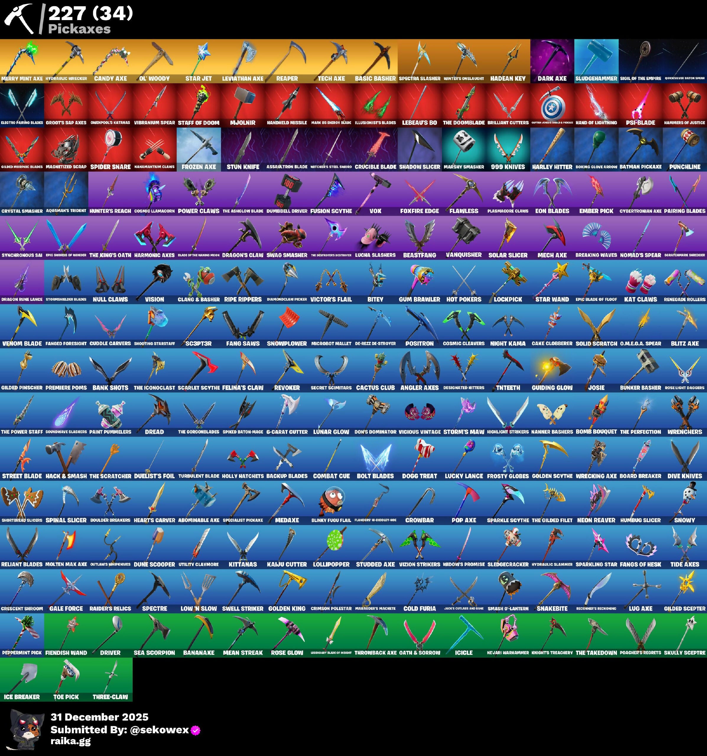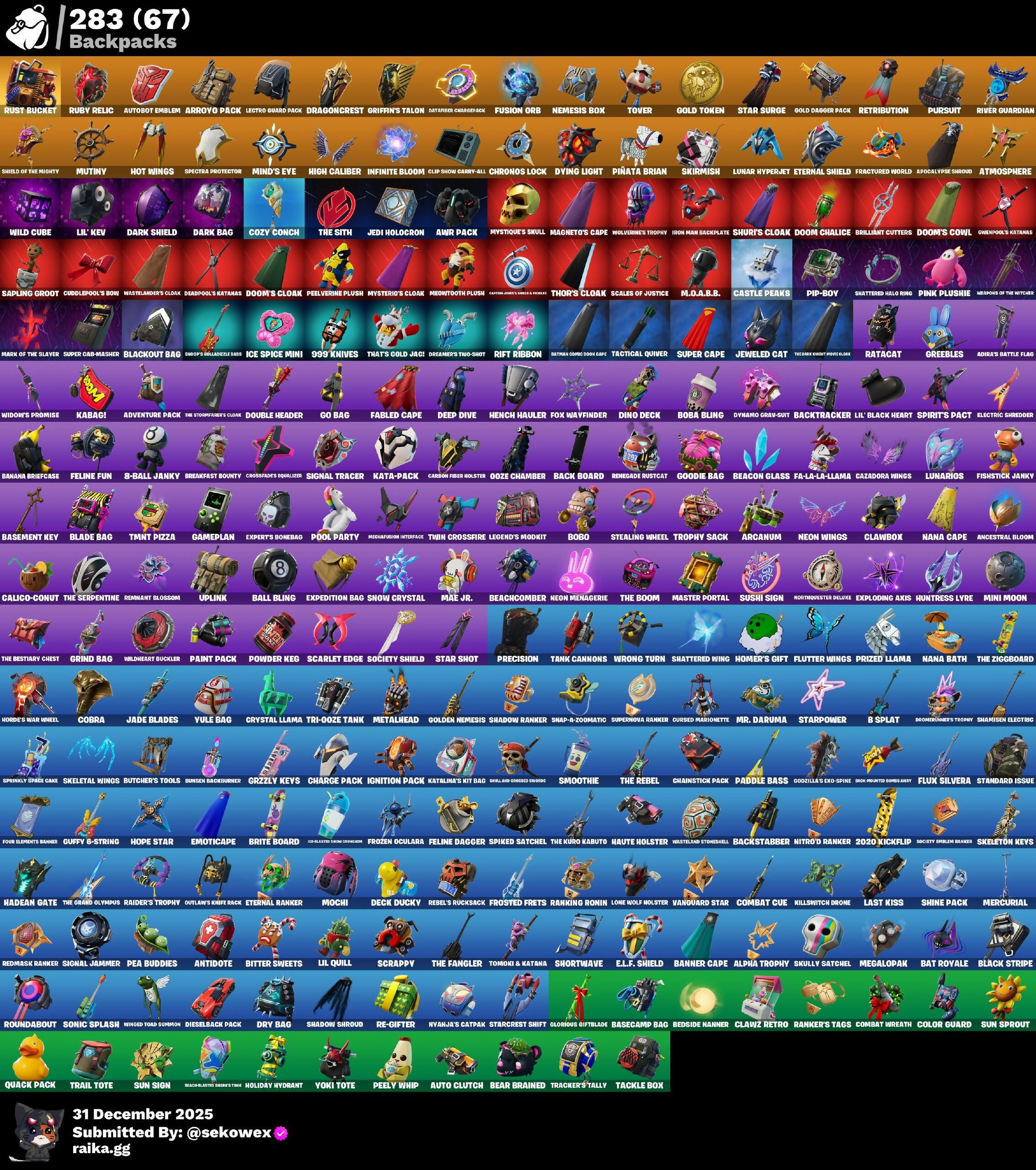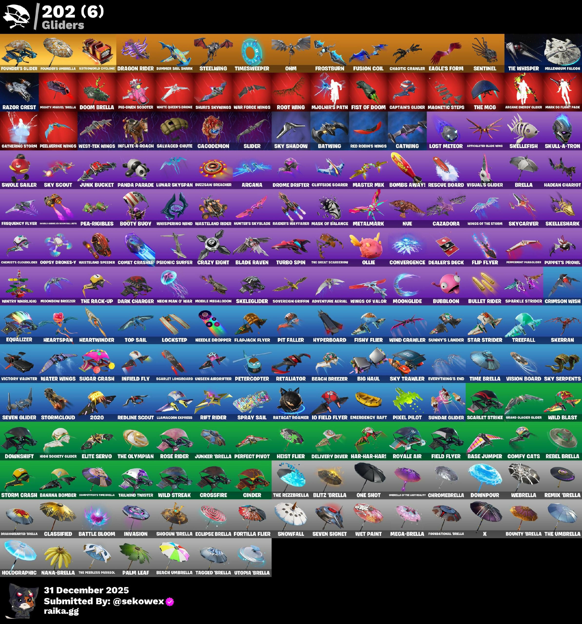 (SNIKT!), 1-Ball, 10 Field Flyer, 2020, 2020 Kickflip, 6-Carat Cutter, 8-Ball Janky, 8-Ball Vs Scratch, 999 Knives, A Warrior Prepares, AWR Pack, Abominable Axe, Adira, Adira's Battle Flag, Adventure Aerial, Adventure Pack, Agent Peely, Air Horn, Air Shredder, Alpha Trophy, Amazing Cube, Anakin Skywalker, Ancestral Bloom, Angler Axes, Antidote, Apocalypse Shroud, Aquaman's Trident, Arcana, Arcane Energy Glider, Arcanum, Arctic Adeline, Arroyo Pack, Articulated Blade Wing, Assaultron Blade, Astroworld Cyclone, Athleisure Assassin, Atmosphere, Aura, Auto Clutch, Autobot Emblem, B Splat, Bachii, Back Board, Backstabber, Backtracker, Backup Blades, Bad Guy, Balance Board, Ball Bling, Banana Bomber, Banana Briefcase, Bananake, Bank Shots, Banner Cape, Baron's Hoard, Base Jumper, Basecamp Bag, Basement Key, Basic Basher, Bat Royale, Batman Comic Book Cape, Batman Comic Book Outfit, Batman Pickaxe, Battle Bloom, Battlehawk, Batwing, Beach Bomber, Beach Breezer, Beach Umbrella, Beach-Blasted Skurvy's Tink, Beachcomber, Beacon Glass, Bear Brained, Beastfang, Bedside Nanner, Beep Beep, Bhangra Boogie, Big Fan, Big Haul, Bike To Go, Billy Bounce, Bim Bam Boom, Birdie, Bitey, Bitter Sweets, Black Stripe, Blackheart, Blackout Bag, Blade Bag, Blade Raven, Blade of the Waning Moon, Blinky Fugu Flail, Blitz 'Brella, Blitz Axe, Blizzabelle, Blowin' Up, Blowing Bubbles, Board Breaker, Boba Bling, Bobo, Boing!, Bolt Blades, Bomb Bouquet, Bombs Away!, Boogie Down, Boomin', Booty Buoy, Boulder Breakers, Bounty 'Brella, Boxing Glove Arrow, Bracer, Branded Brigadier, Brawler, Breakfast Bounty, Breaking Point, Breaking Waves, Breakneck, Breakpoint, Breezy, Brella, Brilliant Cutters, Bring It Around, Brite Board, Brite Moves, Brite Raider, Bubbloon, Bullet Rider, Bunker Basher, Bunker Jonesy, Bunsen Backburner, Butcher's Tools, Buzzsaw Breacher, Cacodemon, Cactus Club, Caffeinated, Cake Clobberer, Calculated, Calico-Conut, Call Me, Cameo Vs Chic, Candy Axe, Cap Kick, Caper, Captain AlAmerica, Captain America's Shield & Pickaxe, Captain Jones, Captain's Glider, Carbide, Carbon Fiber Holster, Card Drop, Carefree, Castle Peaks, Catalyst, Catwing, Catwoman Comic Book Outfit, Cauldron Chill, Cazadora, Cazadora Wings, Chainstick Pack, Chaos Agent, Chaos Director, Chaotic Crawler, Charge Pack, Chef's Special, Chemist's Cloudglider, Choice Knit, Chromebrella, Chronos Lock, Chun-Li, Cinder, Clang & Basher, Clash, Classified, Clawbox, Clawz Retro, Clean Sweep, Cliffside Soarer, Cluck Strut, Clutch, Cobra, Codename E.L.F., Coin Flip, Cold Furia, Color Guard, Color Splash Jellie, Combat Cue, Combat Wreath, Comet Crasher, Comfy Cats, Committed, Competitor's Time Brella, Conga, Convergence, Cosmic Cleavers, Cosmic Llamacorn, Count It!, Cozy Conch, Cozy Jonesy, Crazy Eight, Crescent Shroom, Crimson Polestar, Crimson Wish, Crossfade's Equalizer, Crossfire, Crowbar, Crowning Achievement, Crucible Blade, Crusher, Crystal, Crystal Llama, Crystal Smasher, Cuddle Carvers, Cuddlepool, Cuddlepool's Bow, Curling Iron, Cursed Marionette, Cybertronian Axe, Dab Stand, Dance Off, Dark Axe, Dark Bag, Dark Bomber, Dark Charger, Dark Jonesy, Dark Red Knight, Dark Shield, Dark Wild Card, Databiner Charger Pod, De-Rezz De-Stroyer, Deadpool, Deadpool's Katanas, Dealer's Deck, Deck Ducky, Deep Dive, Deep End, Delivery Diver, Demi, Denied, Designated Hitters, Diamond Diva, Diamond Throne, Diamondclaw Picker, Dieselback Pack, Dino Deck, Dip, Disassemble, Dive Knives, Do The Split, Doctor Doom, Dogg Treat, Don's Dominator, Doom, Doom Brella, Doom Chalice, Doom Slayer, Doom's Cloak, Doom's Cowl, Double Header, Double-Barred Doom Bells, Downpour, Downshift, Doze Dab, Dragon Rider, Dragon Rune Lance, Dragon Stance, Dragon's Claw, Dragoncrest, Dragonhearted 'Brella, Dragonsteel's Trophy, Dramatic Flares, Dread, Dream, Dreamer's Two-Shot, Driver, Drome Drifter, Droop, Dry Bag, Duelist's Foil, Dumbbell Driver, Dummy, Dune Scooper, Dusk Knight, Dusty, Dying Light, Dynamo Grav-Suit, Dynamo Tntina, E.L.F. Shield, Eagle's Form, Eclipse Brella, Electric Shredder, Electro Pairing Blades, Elite Servo, Ember, Ember Pick, Emergency Raft, Emma Frost, Emoticape, Empress Fan Dance, Eon Blades, Epic Blade of Floof, Epic Swords of Wonder, Equalizer, Era, Eternal Knight, Eternal Ranker, Eternal Shield, Eternal Voyager, Everything's End, Evie, Expedition Bag, Expert's Bonebag, Exploding Axis, Explorer Emile, Expressionism, Fa-La-La-Llama, Fabled Cape, Face Palm, Fade, Fang Dance, Fang Saws, Fanged Foresight, Fangs of Hesh, Featherweight, Feel It, Feeling Jaunty, Felina, Felina's Claw, Feline Dagger, Feline Fun, Festival Lace, Field Flyer, Fiendish Wand, Fierce, Fire Show, Fireworks Salvo, Fishstick Janky, Fishy Flier, Fist Bump, Fist of Doom, Flanders' #-Diddley-Hoe, Flapjack Flyer, Flashback Breakdown, Flawless, Flip Flyer, Flippin' Away, Flutter, Flutter Wings, Flux Silvera, Fncs Renegade, Foil Flex, Fortilla Flier, Foundational 'Brella, Founder's Glider, Founder's Umbrella, Four Elements Banner, Fox Wayfinder, Foxfire Edge, Fractured World, Frequency Flyer, Frostburn, Frosted Frets, Frosty Globes, Frozen Axe, Frozen Fishstick, Frozen Nog Ops, Frozen Oculora, Fusion, Fusion Coil, Fusion Orb, Fusion Scythe, Galaxia, Galaxy Crossfade, Gale Force, Gameplan, Gathering Storm, Gear Specialist Maya, Gentleman's Dab, Geralt Of Rivia, Get Griddy, Get Out Of Your Mind, Ghoul Trooper, Gilded Morphic Blades, Gilded Pinscher, Gilded Scepter, Gingerbread Raider, Glitter, Glorious Giftblade, Go Bag, Godsworth's Cleanup, Godzilla's Exo-Spine, Gold Brutus, Gold Dagger Pack, Gold Meowscles, Gold Midas, Gold Token, Golden King, Golden Nemesis, Golden Scythe, Golf Clap, Goodie Bag, Grand Glacier Glider, Greebles, Green Arrow, Green Roots Billie, Griffin's Talon, Grind, Grind Bag, Grizzly Keys, Groot, Groot's Sap Axes, Guff Gringle, Guffy 6-String, Guiding Glow, Gum Brawler, Gwen-Step, Gwenpool, Gwenpool's Katanas, Hack & Smash, Hadean Chariot, Hadean Gate, Hadean Key, Hammers of Justice, 