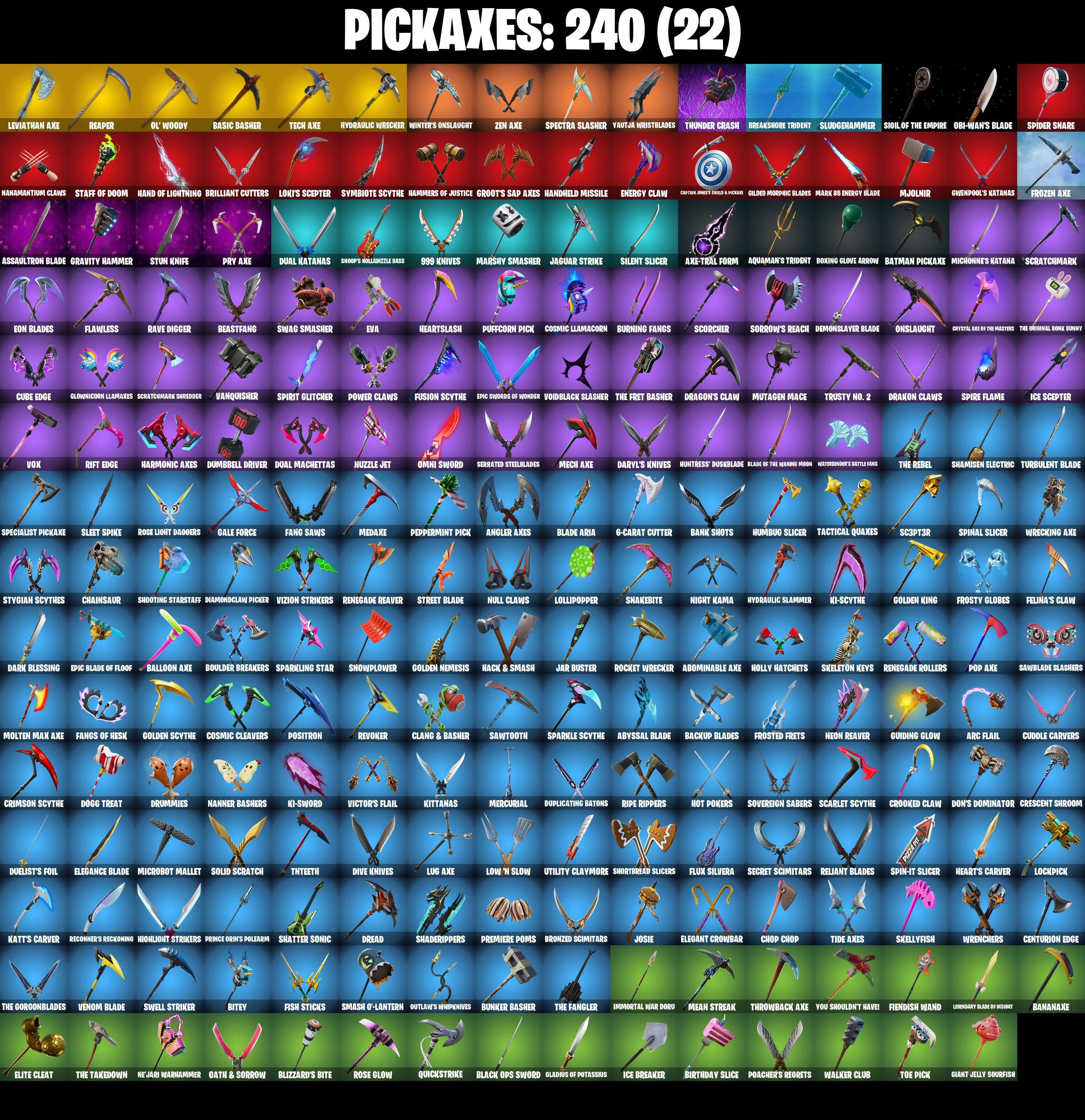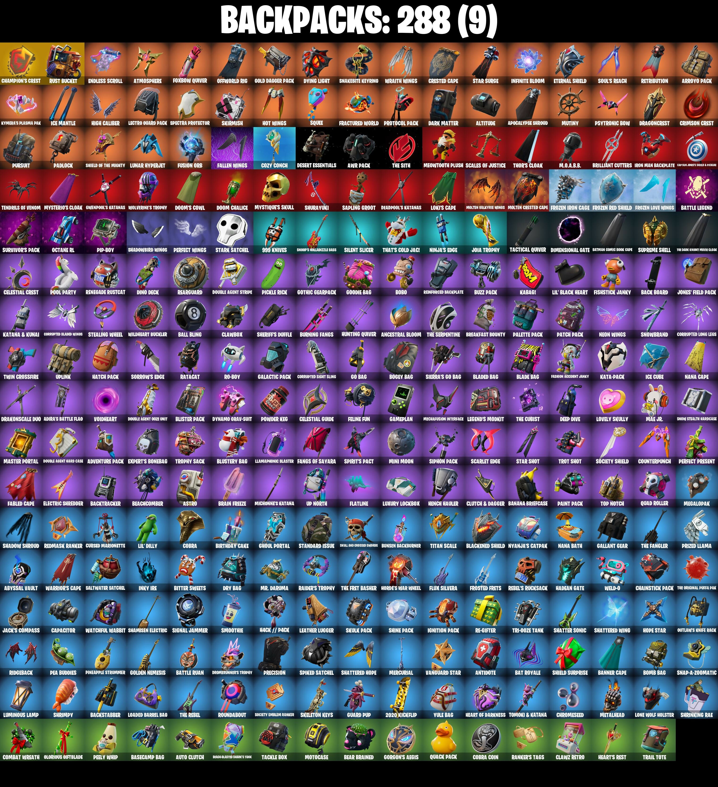 (Snikit!), 2020 Kickflip, 6-Carat Cutter, 8-Ball Vs Scratch, 999 Knives, A Warrior Prepares, AWR Pack, Abominable Axe, Absenz, Abyssal Blade, Abyssal Vault, Adira's Battle Flag, Adventure Pack, Aerial Assault Bomber, Aerial Assault Captain, Aerial Threat, Aftermath, Agent Jones, Agent Jones (Jump 31), Agent Peely, Air Shredder, Alli, Altitude, Ancestral Bloom, Angler Axes, Antidote, Antonia, Aphrodite, Apocalypse Shroud, Aquaman, Aquaman's Trident, Arc Flail, Arcana, Arcane Energy Glider, Ares, Arroyo Pack, Arthur Curry, Assaultron Blade, Astrea, Astro, Astroworld Cyclone, Atlantean Fishstick, Atmosphere, Aura, Auto Clutch, Avatar's Flourish, Avengers Quinjet, Axe-Tral Form, Azarath Metrion Zinthos, Back Board, Backstabber, Backtracker, Backup Blades, Ball Bling, Balloon Axe, Banana Bomber, Banana Briefcase, Bananaxe, Bank Shots, Banner Cape, Baron's Hoard, Base Jumper, Basecamp Bag, Basic Basher, Basic-Edged Duck's Tank, Bat Royale, Bat Signal, Batman Comic Book Cape, Batman Comic Book Outfit, Batman Pickaxe, Battle Bloom, Battle Call, Battle Hound, Battle Legend, Battle Ryan, Battlehawk, Batwing, Be Seeing You, Beach Umbrella, Beachcomber, Bean Bag, Bear Brained, Bear Hug, Beastfang, Beatzbunny, Beep Beep, Best Mates, Big Fan, Big Haul, Billy Bounce, Bim Bam Boom, Birthday Cake, Birthday Slice, Bitey, Bitter Sweets, Black Belt Brawler, Black Ops Sword, Blackened Shield, Blackheart, Blackheart (Stage 8), Blade Aria, Blade Bag, Blade Of The Waning Moon, Blade Raven, Bladed Bag, Blinding Lights, Blister Pack, Blizzard's Bite, Bloomin' Bouquet, Blowing Bubbles, Blustery Bag, Bobo, Bogey Bag, Boing!, Bomb Bag, Bombs Away!, Bone Patrol, Boobytrapped, Bood Up Groove, Boogie Down, Boomin', Boosting Ki, Boots 'N' Cats, Booty Buoy, Boulder Breakers, Bounty Brella, Boxing Clove Arrow, Brain Freeze, Branded Broadier, Breakfast Bounty, Breakin', Breakneck, Breakpoint, Breakshore Trident, Brella, Brilliant Cutters, Brite Moves, Brite Raider, Bronzed Scimitars, Brush Your Shoulders, Brutus, Bullet Rider, Bunker Basher, Bunker Jonesy, Bunsen Backburner, Burning Fangs, Business Up Front, Buzz Pack, Calculated, Call Me, Cameo Vs Chic, Cap Kick, Capacitor, Captain Clamerica, Captain Jones, Captain Jones's Shield & Pickel, Carbide, Carbide Armor Stage 5, Carbon, Cardistry, Cat Flip, Catalyst, Catalyst (Overcharged), Cauldron Chill, Celestial Crest, Celestial Guide, Centurion, Centurion Edge, Cerberus, Chain Surfer, Chainsaur, Chainstick Pack, Champion's Crest, Chaos Double Agent, Chaos Origins, Chaos Origins (Shadow), Charlotte, Chemist's Cloudglider, Chicken Wing It, Chigusa, Chitauri Chariot, Choice Knit, Chop Chop, Chop Dropper, Chromebrella, Chromeseed, Cinder, Clang & Basher, Classified, Clawbox, Clean Sweep, Cliffside Soarer, Clock Strut, Cluck, Cluck (Slurpy), Clutch & Dagger, Cobalt, Cobra, Cobra Coin, Coin Flip, Combat Wreath, Comet Crasher, Cometbrella, Comfy Cats, Competitor's Time Brella, Conch Call, Conga, Conquest, Controller Crew, Convergence, Corrupted Arachne, Corrupted Bladed Wings, Corrupted Insight, Corrupted Long Legs, Corrupted Shogun, Corrupted Sight Sling, Cosmic Cleavers, Cosmic Llamacorn, Cosworth's Cleanup, Counterpunch, Cozy Conch, Crabby, Crack It, Crackdown, Crashing Satellite, Crazy Eight, Crescent Shroom, Crested Cape, Crimson Crest, Crimson Scout, Crimson Scythe, Crimson Wish, Crooked Claw, Crossfire, Crowning Achievement, Cruiser, Crystal Axe Of The Masters, Cube Assassin, Cube Edge, Cuddle Carvers, Cursed Marionette, D'ark, Dab, Dabstand, Dark Blessing, Dark Charger, Dark Matter, Dark Voyager, Daryl Dixon, Daryl's Knives, Deadpool, Deadpool Unmasked, Deadpool's Katanas, Dealer's Deck, Deep Dive, Deep End, Deimos, Demi, Demi (Night), Demonslayer Blade, Derby Dynamo, Desert Essentials, Diamond Diva, Diamondclaw Picker, Dice Roll, Dimensional Gate, Dino Deck, Dive Knives, Do The Split, Doctor Doom, Doctor Doom (God Emperor), Dogg Treat, Don's Dominator, Don't Start Now, Doom Brella, Doom Chalice, Doom's Cowl, Double Agent Hard Case, Double Agent Hush, Double Agent Ooze Unit, Double Agent Stripe, Double Agent Wildcard, Double Up, Downpour, Downshift, Doze Dab, Dragon Stance, Dragon Steel Hybrid, Dragon's Claw, Dragoncrest, Drakon Claws, Drakon Steel Hybrid (Cosmic Legacy), Drakonscale Duo, Dread, Dream, Drift, Drift Stage 5, Drome Drifter, Dromerunner's Trophy, Droop, Drop The Bass, Drummies, Dry Bag, Dual Katanas, Dual Machettas, Duelist's Foil, Dumbbell Driver, Dunk On 'Em, Duplicates, Duplicating Batons, Dying Light, Dynamic Shuffle, Dynamo Grav-Suit, Eagle's Form, Eclipse Brella, Eddie Brock, Eggar, Electric Shredder, Electro Shuffle, Electro Swing, Elegance Blade, Elegant Crowbar, Elite Agent, Elite Cleat, Elite Servo, Ember, Ember (Night), Emma Frost, Enchanted Lifebloom, Endless Scroll, Energy Claw, Eon Blades, Epic Blade Of Floof, Epic Swords Of Wonder, Equalizer, Eternal Knight, Eternal Shield, Eternal Voyager, Eternal Voyager (Eternal), Eva, Evasive Maneuvers, Everything's End, Expert's Bonebag, Fabled Cape, Fade, Fallen Love Ranger, Fallen Wings, Fang Saws, Fangs of Hesk, Fangs of Sayara, Fashion Accident Janky, Featherweight, Felina, Felina's Claw, Feline Fun, Field Flyer, Fiendish Wand, Fierce, Finger Guns, Fire Show, Fish Sticks, Fish Thicc, Fishstick (World Cup), Fishstick Janky, Fishy Flier, Fist Bump, Flaky Feast, Flapjack Flyer, Flashback Breakdown, Flatline, Flawless, Flight Risk, Flippin' Away, Flux Silvera, Focused, Foil Flex, Fortilla Flier, Foundational Brella, Founder's Glider, Founder's Umbrella, Foxbow Quiver, Fractured World, Free Flow, Frolic, Frost Squad, Frostburn, Frosted Frets, Frosty Globes, Frozen Axe, Frozen Iron Cage, Frozen Love Ranger, Frozen Love Wings, Frozen Raven, Frozen Red Knight, Frozen Red Shield, Full Tilt, Fusion, Fusion Coil, Fusion Orb, Fusion Scythe, Fusion! Hah!, Galactic Pack, Galaxia, Gale Force, Gallant Gear, Gameplan, Gangnam Style, Gathering Storm, Gear Specialist Maya, Gentleman's Dab, Get Funky, Get Griddy, Get Schwi