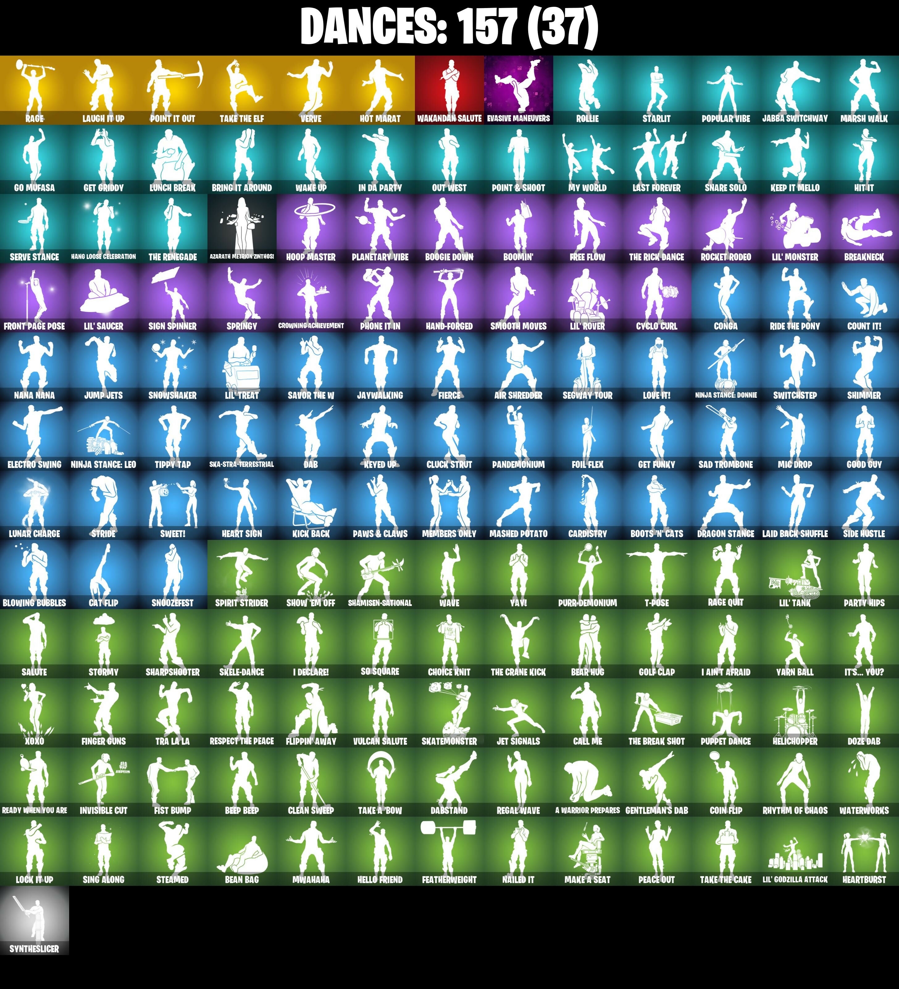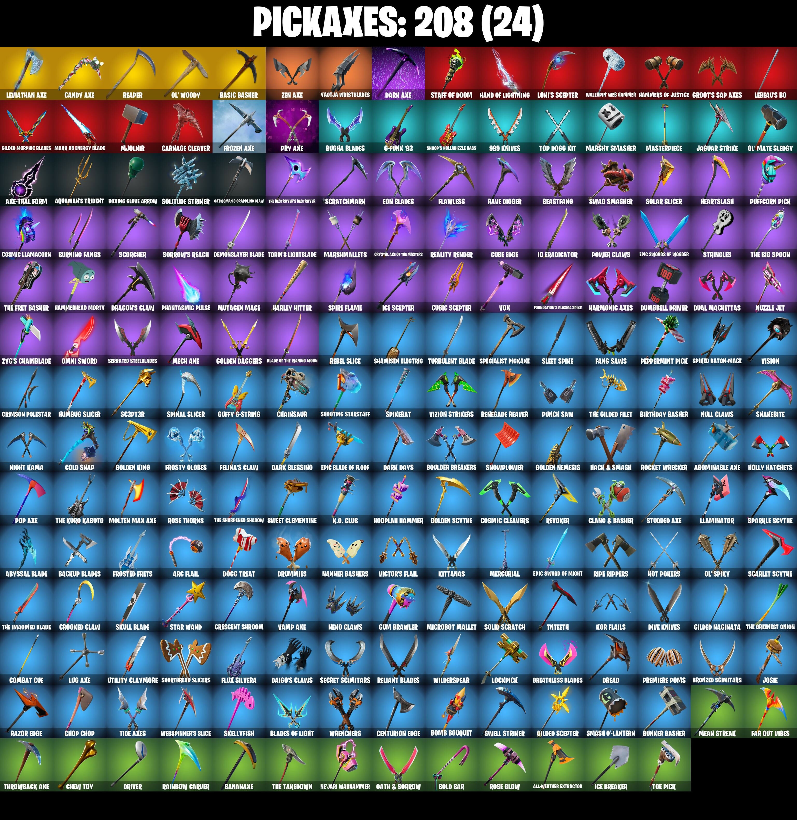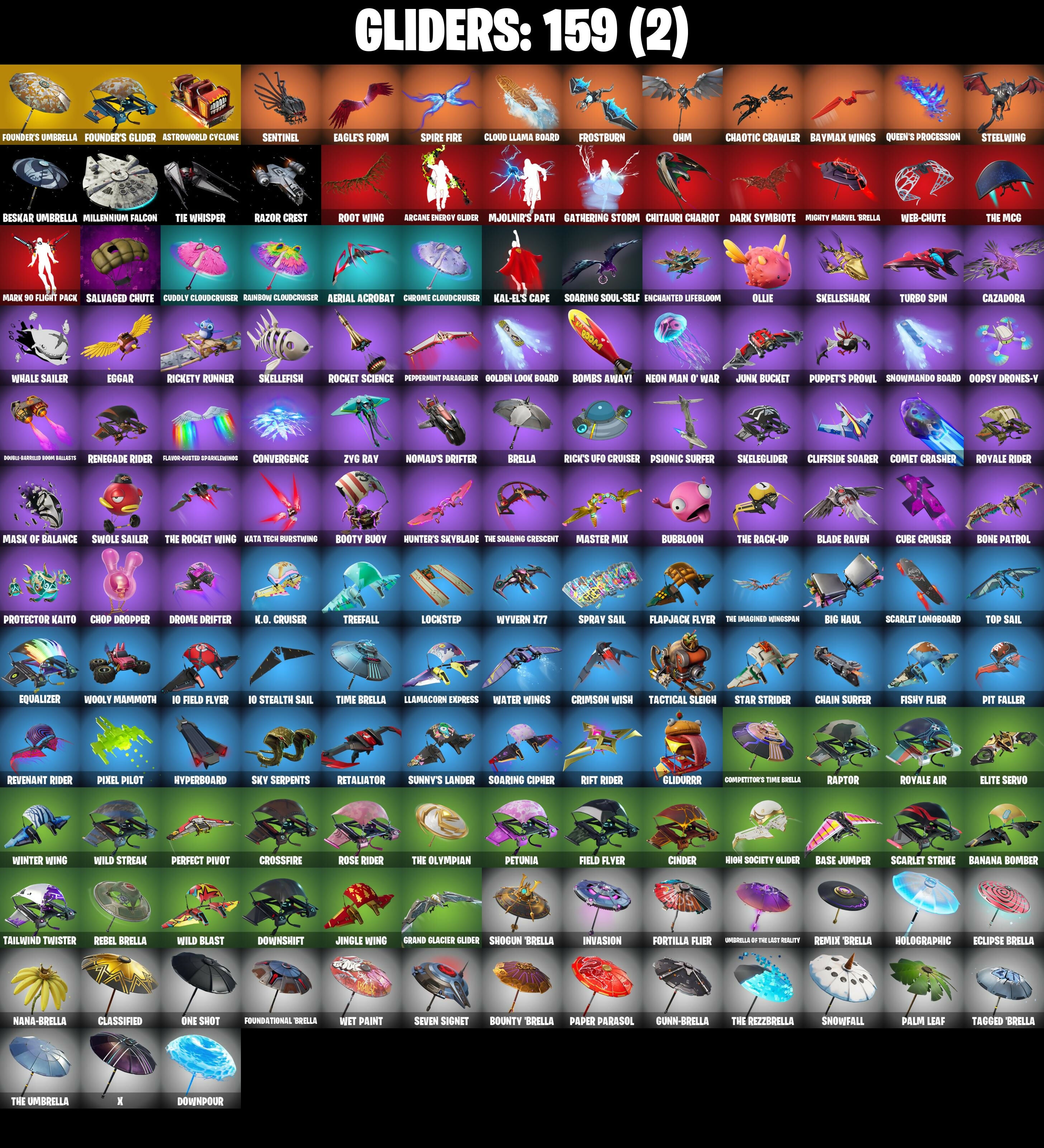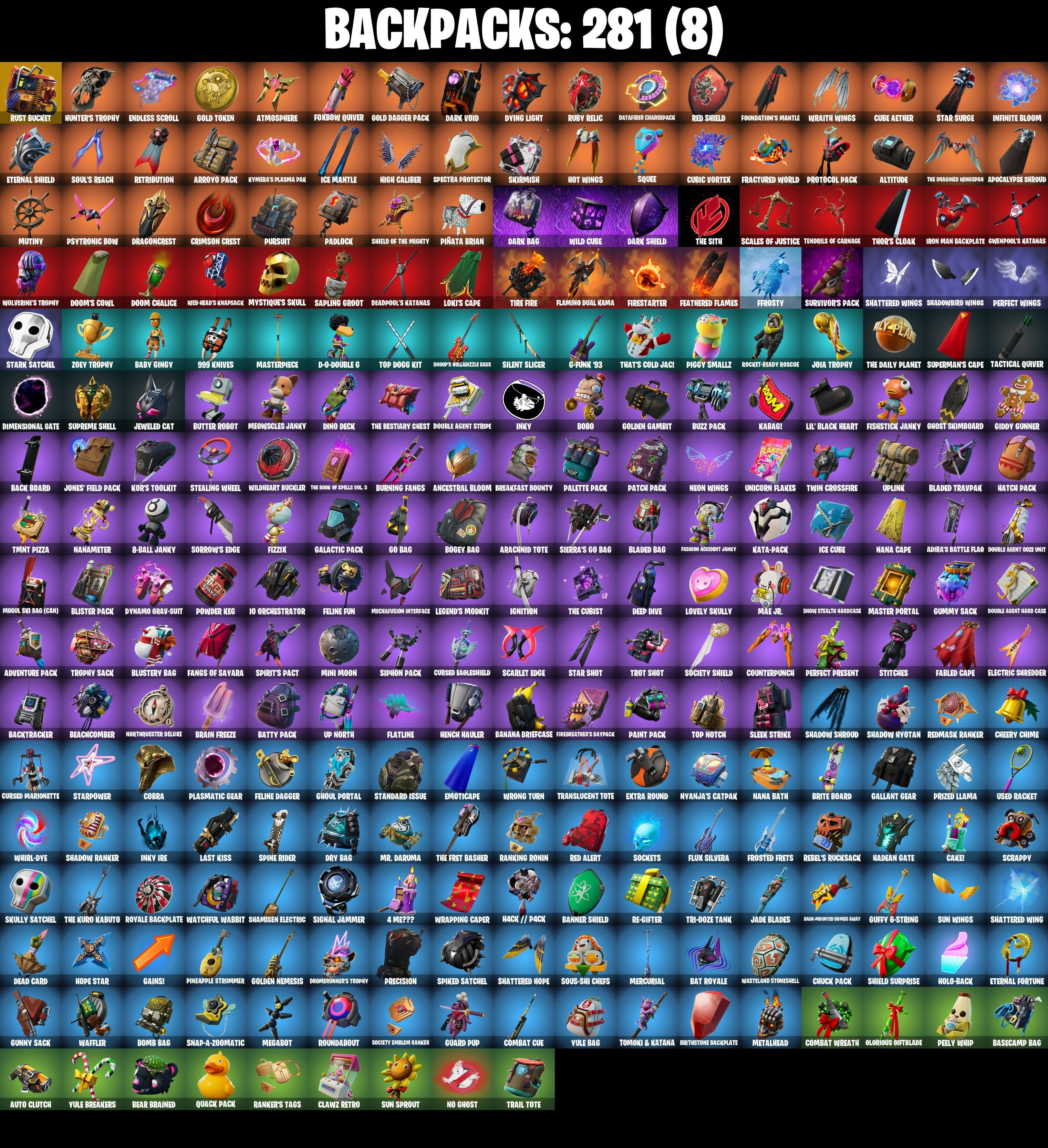 10 Field Flyer, 10 Stealth Sail, 4 Me???, 7-Ball, 8-Ball Janky, 999 Knives, A Warrior Prepares, Abominable Axe, AbseNz, Abyssal Blade, Adira's Battle Flag, Adventure Pack, Aerial Acrobat, Aerial Assault Bomber, Aerial Assault Captain, Aerial Assault Trooper, Aftermath, Agent Jones, Agent Jones (Jump 31), Agent Peely, Air Shredder, All-Weather Extractor, Alli, Altitude, Ancestral Bloom, Andy Fangserson, Apocalypse Shroud, Aquaman, Aquaman's Trident, Arachne Couture, Arachnid Tote, Arc Flail, Arcane Energy Glider, Ariana Grande, Arroyo Pack, Arthur Curry, Astroworld Cyclone, Atmosphere, Aura, Auto Clutch, Axe-Tral Form, Azarath Metron Zinthos, Baby Cincy, Back Board, Back-Mounted Bombs Away, Backtracker, Backup Blades, Banana Bomber, Banana Briefcase, Bananaxe, Banker's Tags, Banner Shield, Banner Trooper, Base Jumper, Basecamp Bag, Basic Basher, Bat Royale, Batty Pack, Baymax Wings, Beach Bomber, Beach Jules, Beachcomber, Bean Bag, Bear Brained, Bear Hug, Beastfang, Beep Beep, Beskar Umbrella, Big Haul, Birdie, Birthday Basher, Birthstone Backplate, Black, Blackheart, Blackheart (Stage 8), Blade Raven, Blade of the Waning Moon, Bladed Bag, Bladed Travpak, Blades of Light, Blaze, Blister Pack, Blowing Bubbles, Blustery Bag, Boardwalk Ruby, Bobo, Bogey Bag, Bold Bar, Bolt, Bomb Bag, Bomb Bouquet, Bombs Away!, Bone Patrol, Bones, Boogie Down, Boomin', Boots 'N' Cats, Booty Buoy, Boulder Breakers, Bounty 'Brella, Boxing Glove Arrow, Brain Freeze, Breakfast Bounty, Breakneck, Breakpoint, Breathless Blades, Brella, Bring It Around, Brite Board, Brite Bomber, Bronzed Scimitars, Bubbloon, Bugha, Bugha Blades, Bullseye, Bunker Basher, Bunker Jonesy, Burning Fangs, Butter Robot, Buzz Pack, Cake!, Call Me, Candy Axe, Cardistry, Carnage, Carnage (Maximum), Carnage Cleaver, Cassidy Quinn, Cat Flip, Catalyst, Catalyst (Overcharged), Catwoman's Grappling Claw, Cazadora, Centurion, Centurion Edge, Chain Surfer, Chainsaur, Chalked Up 1-Ball, Chaos Director, Chaos Double Agent, Chaos Origins, Chaos Origins (Shadow), Chaotic Crawler, Charlotte, Charlotte (Golden Rune), Cheery Chime, Chew Toy, Chigusa, Chill Count, Chitauri Chariot, Choice Knit, Chop Chop, Chop Dropper, Chrome Cloudcruiser, Chuck Pack, Cinder, Clang & Basher, Clark Kent, Clark Kent (Superman), Classified, Clawz Retro, Clean Sweep, Cliffside Soarer, Clock Strut, Cloud Llama Board, Cluck, Cluck (Slurpy), Cobra, Coin Flip, Cold Snap, Color Crush, Combat Cue, Combat Wreath, Comet Crasher, Commando, Competitor's Time Brella, Conga, Convergence, Cosmic Cleavers, Cosmic Llamacorn, Count It!, Counterpunch, Crescent Shroom, Crimson Crest, Crimson Polestar, Crimson Wish, Crooked Claw, Crossbar Crusher, Crossfire, Crowning Achievement, Crystal, Cube Aether, Cube Assassin, Cube Cruiser, Cube Edge, Cubic Scepter, Cubic Vortex, Cuddly Cloudcruiser, Cursed Eagleshield, Cursed Marionette, Cyclo Curl, D-O-Double G, Dab, Dabstand, Daigo, Daigo's Claws, Dark Axe, Dark Bag, Dark Blessing, Dark Bomber, Dark Days, Dark Jonesy, Dark Red Knight, Dark Shield, Dark Symbiote, Dark Vanguard, Dark Void, Dark Wild Card, Datafiber Chargepack, Dead Card, Deadpool, Deadpool Unmasked, Deadpool's Katanas, Decaying Dribbler, Deep Dive, Deimos, Demi, Demonslayer Blade, Diamond Hanz, Dimensional Gate, Dino Deck, Dive Knives, Dizzie, Doctor Doom, Doctor Doom (God Emperor), Doctor Slone, Doctor Slone (Prismatic), Dogg Treat, Doom Chalice, Doom's Cowl, Double Agent Hard Case, Double Agent Hush, Double Agent Ooze Unit, Double Agent Stripe, Double Agent Wildcard, Double-Barreled Boom Ballasts, Downpour, Downshift, Doze Dab, Dragon Stance, Dragon's Claw, Dragoncrest, Dread, Dream, Driver, Drome Drifter, Dromerunner's Trophy, Drummies, Dry Bag, Dual Machettas, Dumbbell Driver, Dummy, Durrr Taisho, Dyed Breeze, Dying Light, Dynamo, Dynamo Grav-Suit, Dynamo Tntina, Dynamo Tntoon-A, D’Ark, Eagle's Form, Eclipse Brella, Eggar, Electric Shredder, Electro Swing, Elite Servo, Ember, Ember (Night), Emoticape, Enchanted Lifebloom, Endless Scroll, Eon Blades, Epic Blade of Floof, Epic Sword of Might, Epic Swords of Wonder, Equalizer, Eternal Fortune, Eternal Knight, Eternal Shield, Eternal Voyager, Evasive Maneuvers, Extra Round, Fabio Sparklemane, Fabio Sparklemane (Golden Rune), Fabled Cape, Fade, Fang Saws, Fangs Of Sayara, Far Out Vibes, Fashion Accident Janky, Feathered Flames, Featherweight, Felina, Felina's Claw, Feline Dagger, Feline Fun, Field Flyer, Fierce, Finger Guns, Firebreaker's Daypack, Firestarter, Fishstick Janky, Fishy Flier, Fist Bump, Fizzix, Flaming Dual Kama, Flapjack Flyer, Flatline, Flavor-Dusted Sparklewing, Flawless, Flippin' Away, Flux Silvera, Focus, Foil Flex, Fortilla Flier, Foundation's Mantle, Foundation's Plasma Spike, Foundational 'Brella, Founder's Glider, Founder's Umbrella, Foxbow Quiver, Fractured World, Free Flow, Front Page Pose, Frost Squad, Frostburn, Frosted Frets, Frosty, Frosty Globes, Frozen Axe, G-Funk '93, Gains!, Galactic Pack, Galaxia, Gallant Gear, Gathering Storm, Gear Specialist Maya, Gear Specialist Maya (Hat - Dark), Gentleman's Dab, Get Funky, Get Griddy, Ghost Skinboard, Ghoul Portal, Ghoul Trooper, Giddy Gunner, Gilded Morphic Blades, Gilded Naginata, Gilded Scepter, Ginger Gunner, Glidurr, Glorious Giftblade, Go Bag, Go Mufasa, Gold Brutus, Gold Dagger Pack, Gold Meowscles, Gold Midas, Gold Token, Golden Daggers, Golden Gambit, Golden King, Golden Look Board, Golden Nemesis, Golden Scythe, Golf Clap, Good Guy, Grand Glacier Glider, Green Arrow, Groot, Groot (Silver Foil), Groot's Sap Axes, Guard Pup, Guardian Jade, Guffy 6-String, Guffy G-String, Guggimon, Guggimon (Prismatic), Gum Brawler, Gumbo, Gumbo (Sour), Gummy Sack, Gunn-Brella, Gunnar, Gunny Sack, Gwenpool's Katanas, Hack & Smash, Hack // Pack, Hadean Gate, Hammerhead Morty, Hammers of Justice, Hand of Lightning, Hand-Forged, Hang Loose Celebration, Happy, Harley (Always Fantabulous), Harley Hitter, Harley Quinn, Harlowe, Harlowe (Helmet), Harmonic Axes, Haruka of the Masks, H