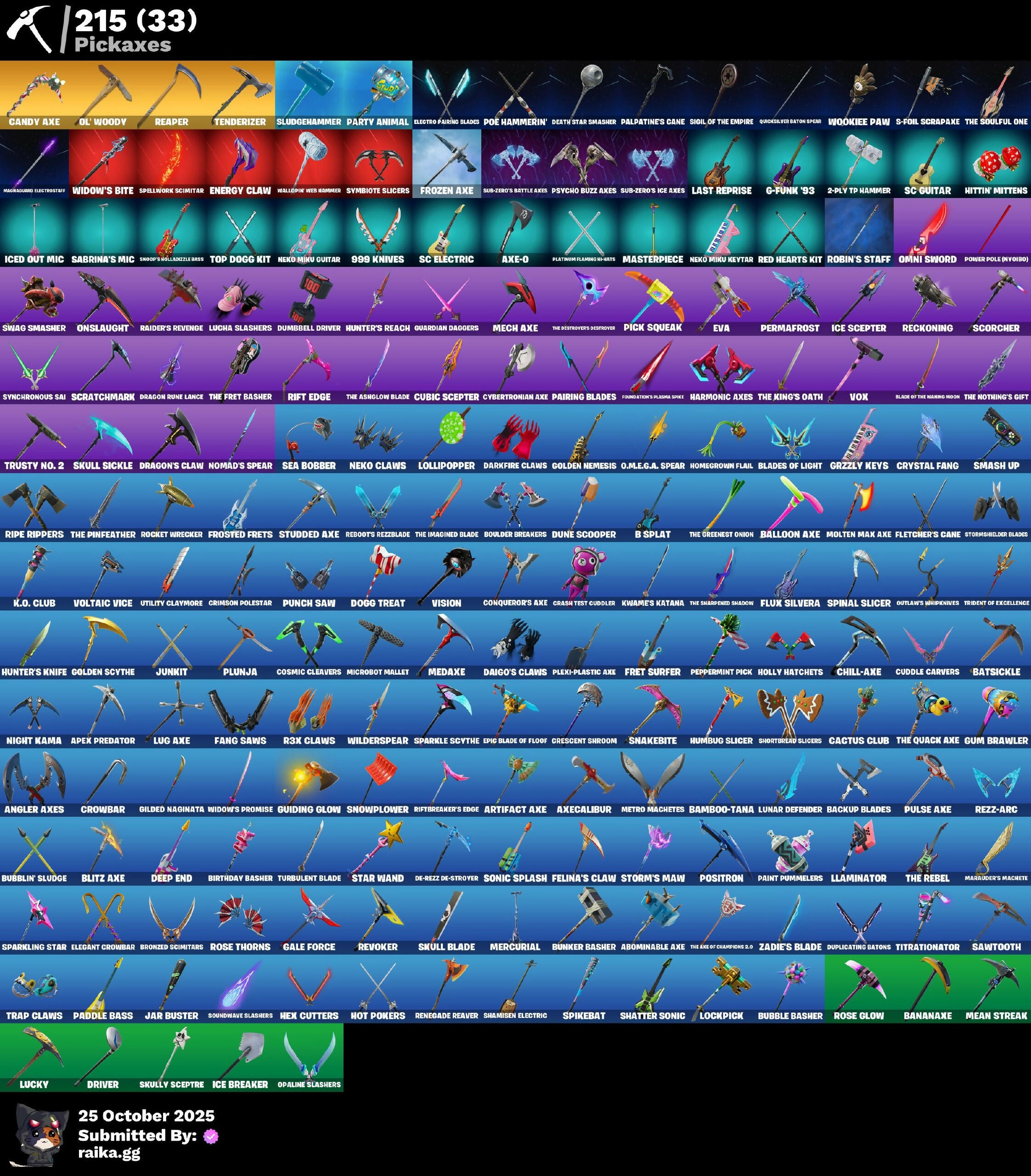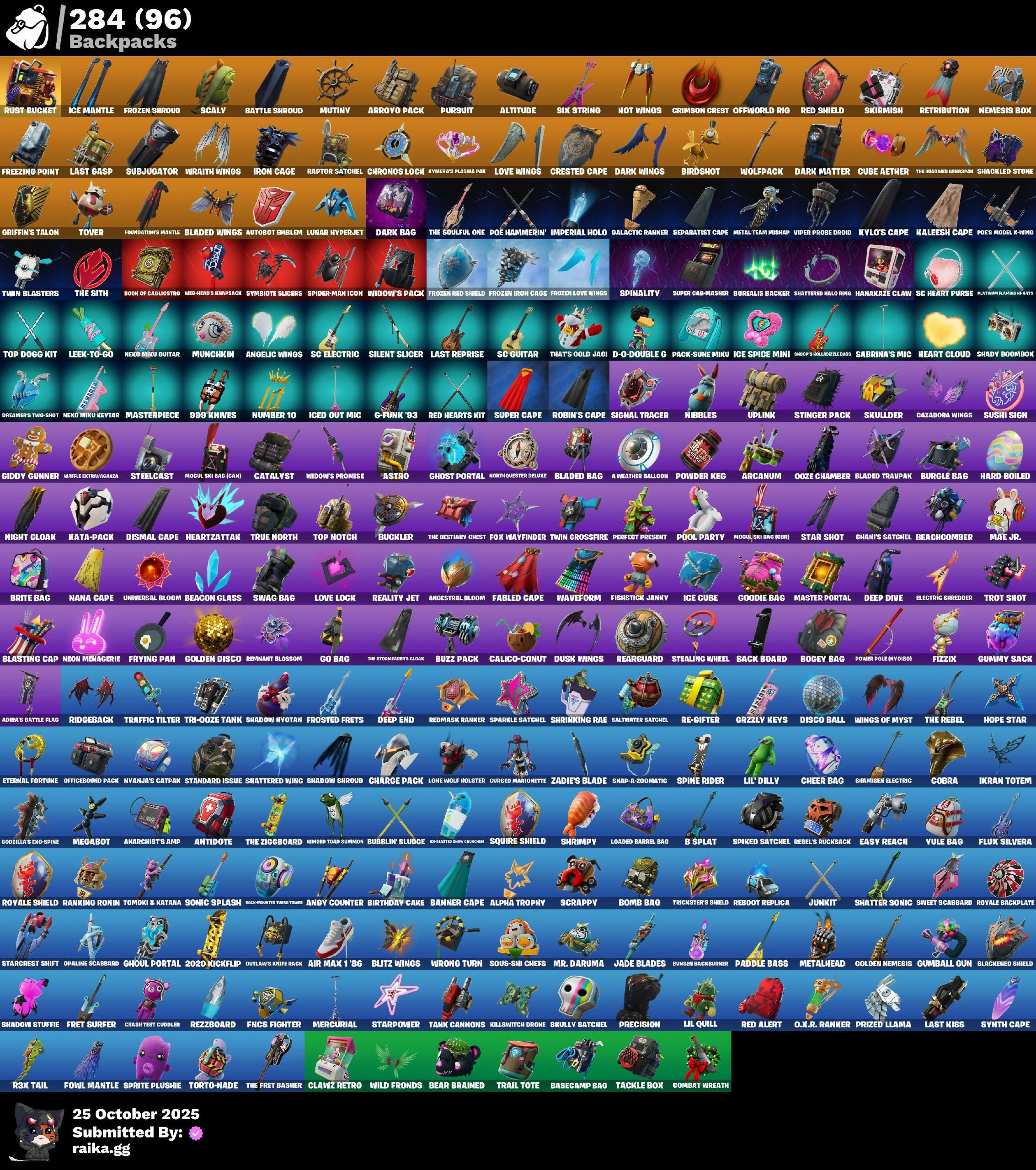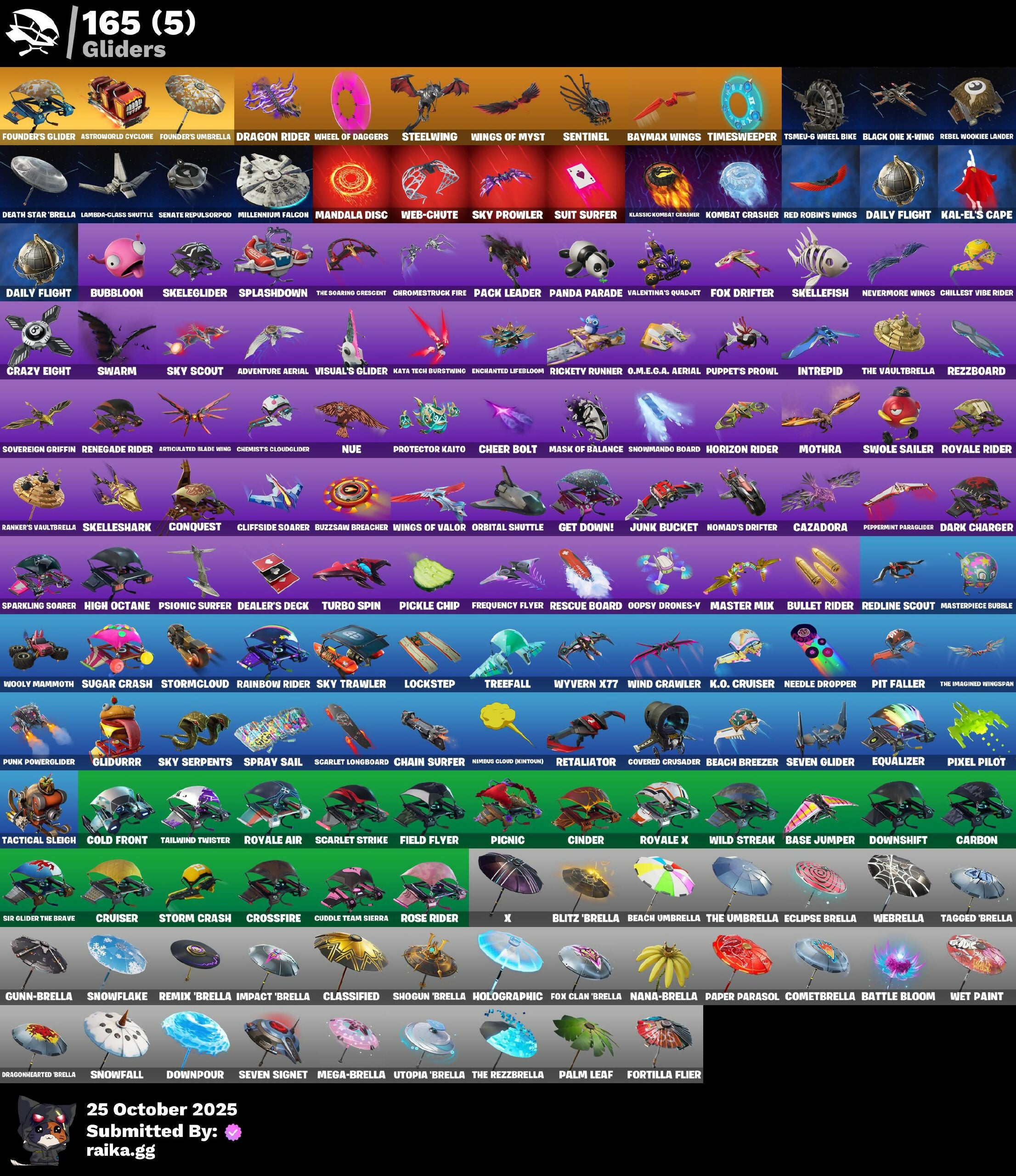 2-Ply TP Hammer, 2020 Kickflip, 360, 999 Knives, A Gota, A Team Of Specials (Unique), A Weather Balloon, Abominable Axe, Adira, Adira's Battle Flag, Adventure Aerial, Aerial Assault Bomber, Air Max 1 '86, All Red, Alpha Trophy, Altitude, Anarchist's Amp, Ancestral Bloom, Andy FangerSon, Angelic Wings, Angler Axes, Angy Counter, Antidote, Apex Predator, Apprentice Evie, Apt., Arcane Research, Arcanum, Arctic Assassin, Arroyo Pack, Articulated Blade Wing, Artifact Axe, Astro, Astroworld Cyclone, Aura, Autobot Emblem, Aw, Shucks., Axe-O, Axecalibur, Ayla Winn, B Splat, B.R.U.T.E. Gunner, Back Board, Back-Emoted Turbo Toner, Backlash, Backup Blades, Balloon Axe, Bamboo-Tana, Bananaxe, Banner Cape, Baron's Hoard, Base Jumper, Basecamp Bag, Batsickle, Battle Blessing, Battle Bloom, Battle Hound, Battle Shroud, Battlehawk, Baymax Wings, Beach Breezer, Beach Umbrella, Beachcomber, Beacon Glass, Bear Brained, Beep Beep, Bernie, Best Mates, Big Dill, Bike To Go, Billy Bounce, Birdarang Flourish, Birdie, Birdshot, Birthday Basher, Birthday Cake, Black One X-Wing, Black Widow Outfit, Blackened Shield, Blackheart, Blade of the Waking Moon, Bladed Bag, Bladed Trapvak, Bladed Wings, Blades of Light, Blasting Cap, Blitz 'Brella, Blitz Axe, Blitz Wings, Blowin' Up, Blowing Bubbles, Blue Squire, Bogey Bag, Bomb Bag, Bonde Do Brunão, Bone Breaker, Boneless, Bones, Boney Bounce, Boogie Down, Book of Cagliostro, Borealis Backer, Boulder Breakers, Bow Go, Boy's A Liar, Bratty, Brawler, Breakdown, Breakin', Breakneck, Bring It Around, Brite Bag, Brite Bomber, Brite Gunner, Bronzed Scimitars, Bruno-San, Bubble Basher, Bubblin' Sludge, Bubgloon, Buckler, Bullet Rider, Bunker Basher, Bunker Jonesy, Bunsen Backburner, Burgle Bag, Buzz Pack, Buzzsaw Breacher, Bytes, Cactus Club, Caffeinated, Calamity, Calculated, Calico-Coconut, Call Me, Camille, Cammy, Candy Axe, Caper, Captain Phasma, Carbide, Carbon, Carmine Rosso, Cassidy Quinn, Catalyst, Catflip, Cazadora, Cazadora Wings, Chain Surfer, Challenge, Chan's Satchel, Chani, Chaos Agent, Charge Pack, Chase Me Down, Cheer Bag, Cheer Bolt, Chemist's Cloudglider, Chicken Wing It, Chill-Axe, Chillest Vibe Rider, Choice Knit, Chromestruck Fire, Chronos Lock, Chun-Li, Cinder, Classified, Classy, Clawz Retro, Cliffside Soarer, Clix, Clix Groove, Close To You, Cluck Strut, Clutch, Cobra, Coffin, Cold Front, Combat Wreath, Cometbrella, Commando, Conga, Conjure Weapon, Conqueror's Axe, Conqueror's Claim, Conquest, Copines, Cosmic Cleavers, Count It!, Covered Crusader, Cozy Commander, Crackdown, Crackshot, Crash Test Cuddler, Crazy Eight, Crescent Shroom, Crested Cape, Crimson Crest, Crimson Polestar, Crossfire, Crowbar, Crowning Achievement, Crude Team Specialist, Cruiser, Crystal Fang, Cube Aether, Cubic Scepter, Cuddle Carvers, Cuddle Team Sierra, Cupid's Arrow, Cursed Marionette, Cybertronian Axe, Cyclo Curl, D-O-Double G, D.M.E.G.A. Suit Alpha, DJ Yonder, Dab, Dab Stand, Dagger Dance, Daigo, Daigo's Claws, Daily Flight, Dance Therapy, Dancin' Domino, Danica, Dark Bag, Dark Bomber, Dark Charger, Dark Matter, Dark Voyager, Dark Wings, Darkfire Claws, Darth Vader, Dazzle, De-Rezz De-Stroyer, Deadfire, Dealer's Deck, Death Star 'Brella, Death Star Smasher, Deep Dive, Deep End, Demi, Desirable, Die With A Smile, Dilli With It, Dire, Disco Ball, Disco Diva, Disco Fever, Dismal Cape, Diva Fever, Doctor Strange, Dogg Treat, Dominator, Don't Start Now, Downpour, Downshift, Dr Meta & Ghillie Bomb, Dragon Rider, Dragon Rune Lance, Dragon Stance, Dragon's Claw, Dragonheartd Brella, Dramatic Flares, Dream, Dreamers Two-Shot, Drift, Driver, Droop, Duelist's Card Trick, Dumbbell Driver, Dummy, Dune Scooper, Dupli-Kate, Duplicating Batons, Duplikates, Durrr Taisho, Dusk, Dusk Knight, Dusk Wings, Dynamic Dribbler, EVA, Easy Reach, Eclipse Brella, Electric Shredder, Electro Pairing Blades, Elegant Crowbar, Eleven, Elite Agent, Emperor Palpatine, Empty Out Your Pockets, Enchanted Lifebloom, Energy Claw, Enforcer, Epic Blade of Floof, Equalizer, Era, Erisa, Eternal Fortune, Eternal Voyager, Evie, Evil Plan, FFC Sparkplug, FNCS Fighter, Fable, Fabled Cape, Face Palm, Fang Dance, Fang Saws, Featherweight, Feel It, Feel The Force, Felina, Felina's Claw, Field Flyer, Finesse Finisher, Fireworks Team Leader, Fishstick Janky, Fist Bump, Fizzix, Flamenco, Flapjackie, Flatfoot, Fletcher Kane, Fletcher's Cane, Flippin' Away, Flux Silvera, Force Lightning, Fortilla Flier, Foundation's Mantle, Foundation's Plasma Spike, Founder's Glider, Founder's Umbrella, Fowl Mantle, Fox Clan 'Brella, Fox Drifter, Fox Wayfinder, Free Flow, Freestylin', Freezing Point, Frequency Flyer, Fret Surfer, Front Page Pose, Frostbite, Frosted Frets, Frozen Axe, Frozen Iron Cage, Frozen Love Ranger, Frozen Love Wings, Frozen Raven, Frozen Red Knight, Frozen Red Shield, Frozen Shroud, Frozen Treat Cart, Frying Pan, Funk Ops, G-Funk '93, Galactic Ranker, Gale Force, Geek Time, General Grievous, Gentleman's Dab, Get Down!, Get Funky, Get Griddy, Get Out Of Your Mind, Ghost Portal, Ghoul Portal, Ghoul Trooper, Giddy Gunner, Giddy-Up, Gilded Naginata, Ginger Gunner, Glidurr, Go Bag, Godzilla Evolved, Godzilla's Exo-Spine, Golden Disco, Golden Nemesis, Golden Scythe, Golf Clap, Good Sportsmanship, Goodie Bag, Griffin's Talon, Grind, Grizzly Keys, Groove Destroyer, Groove Jam, Grzzly Keys, Guardian Daggers, Guiding Glow, Gum Brawler, Gumball Gun, Gumbo, Gummy Sack, Gunn-Brella, Gunnar, Hanakaze Claw, Hard Boiled, Harlowe, Harmonic Axes, Haruka of The Masks, Hatsune Miku, Haven, Haylee Skye, Haze, Heart Chopper, Heart Cloud, Heart Sign, Heartzattak, Heel Click Breakdown, Helichopper, Hello Friend, Hero Baymax, Heron Stance Hero, Hex Cutters, High Five, High Octane, Highland Warrior, Hit It, Hittin' Mittens, Holly Hatchets, Holographic, Homegrown Flail, Hope Star, Horizon Rider, Hot Pokers, Hot Stuff, Hot Wings, Human Bill, Humbug Slicer, Hunter's Knife, Hunter's Reach, Huntress, Hybrid, Hype, Hype!, I Declare!, Ice Breaker, Ice Cube,