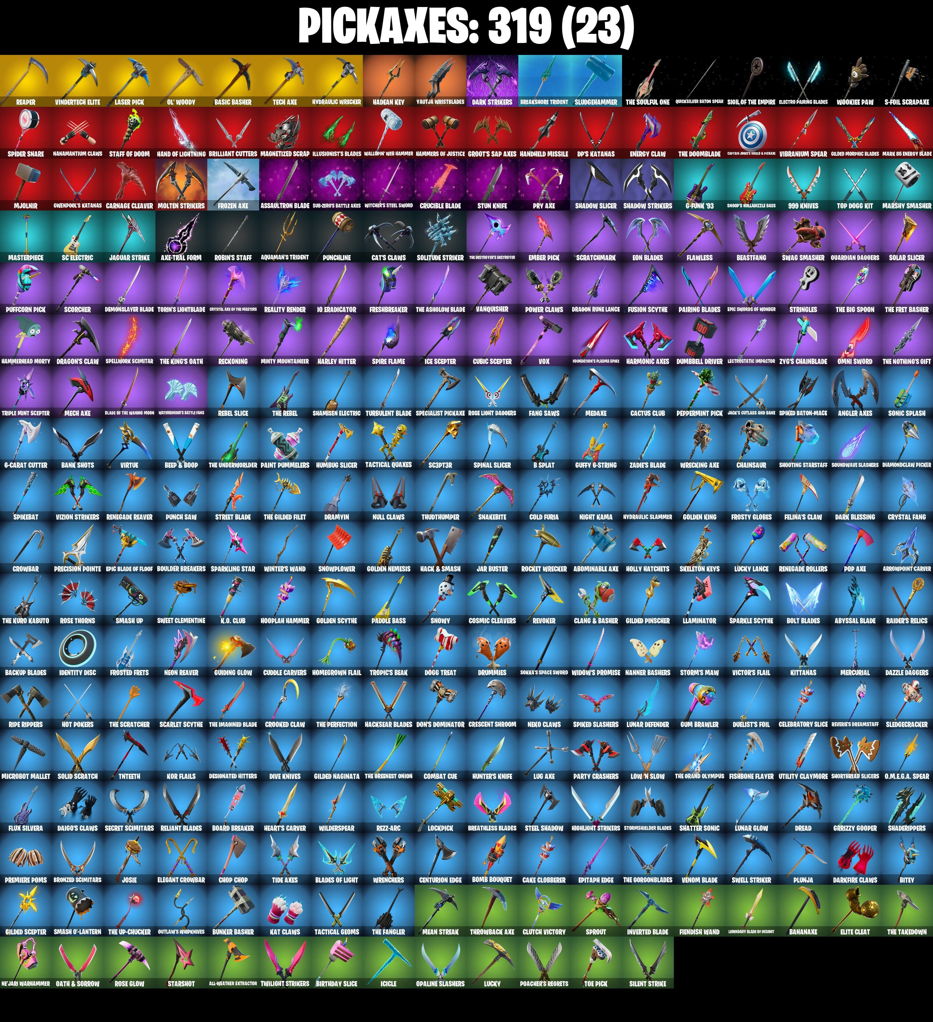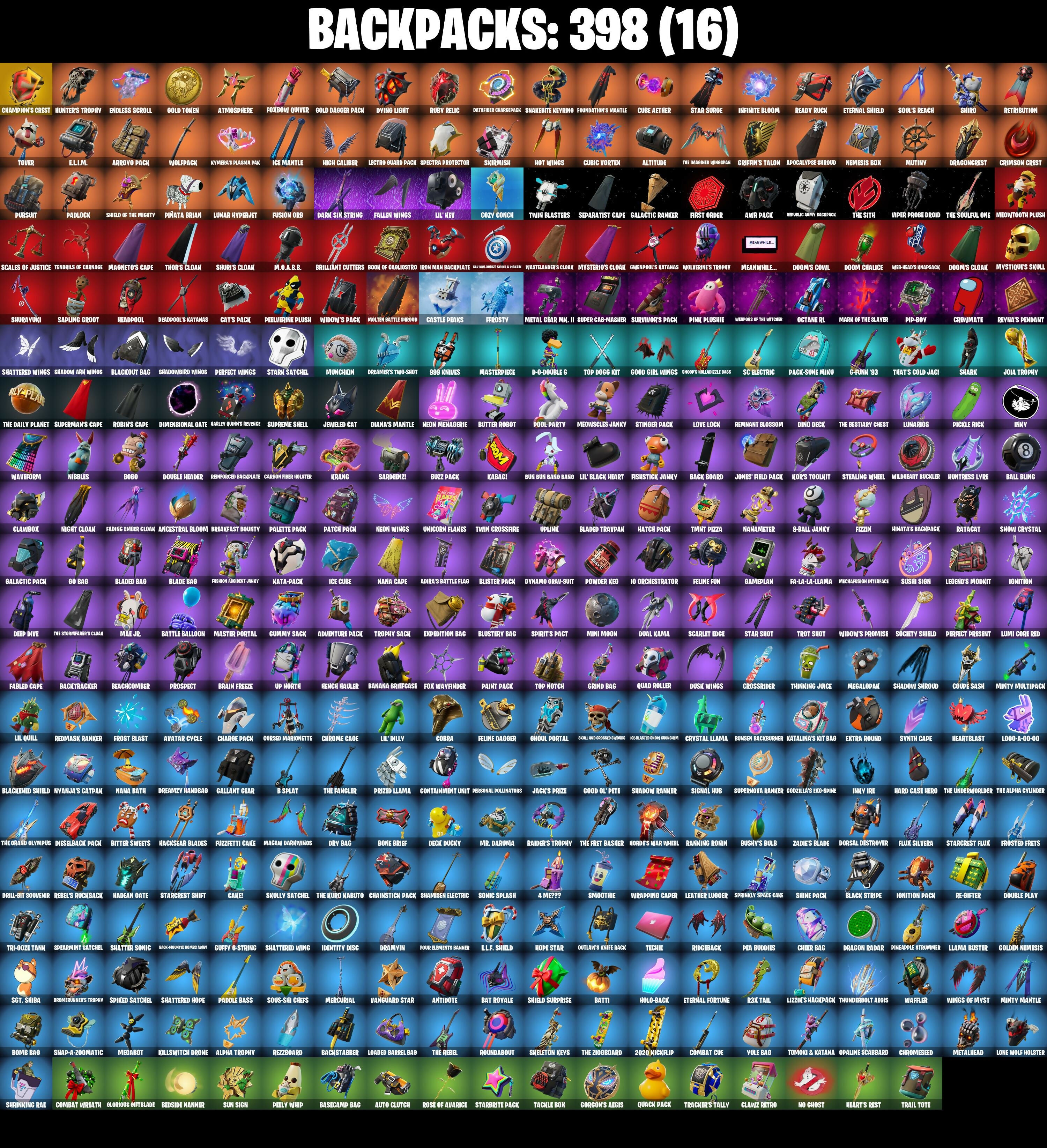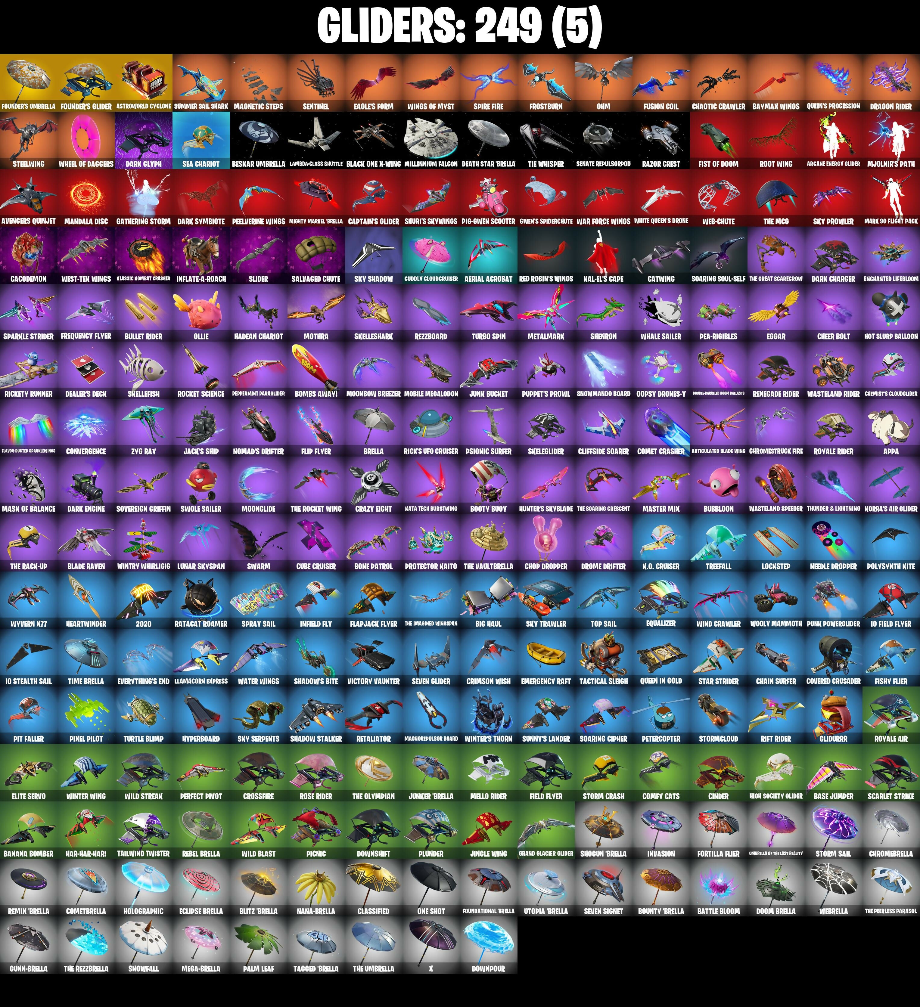 (Shift!), 1-Ball, 10 Field Flyer, 10 Orchestrator, 10 Stealth Sail, 2020, 2020 Vickflip, 4 Me???, 6-Carat Cutter, 8-Ball Janky, 8-Ball vs Scratch, 999 Knives, A Warrior Prepares, AWR Pack, Abominable Axe, Absenz, Abyssal Blade, Acrobatics, Adira, Adira (Battle Mask), Adira's Battle Flag, Adventure Pack, Aerial Acrobat, Aerial Assault Bomber, Aerial Assault Captain, Agent Jones, Agent Jones (Jump 31), Agent Peely, Air Horn, Air Shredder, All I Want For Christmas Is You, All-Weather Extractor, Alm., Alpha Trophy, Altitude, Ancestral Bloom, Andy Fanguerson, Angler Axes, Antidote, Aphrodite, Apocalypse Shroud, Appa, Apt., Aquaman, Aquaman's Trident, Arcane Energy Glider, Arcane Research, Arctic Adeline, Arrowpoint Carver, Arroyo Pack, Artemis, Arthur Curry, Articulated Blade Wing, Assaultron Blade, Astro Armor, Astroworld Cyclone, Atmosphere, Auto Clutch, Avatar Cycle, Avatar's Flourish, Avengers Quinjet, Axe-Tral Form, Azorath Meteor Zinthos, B Splat, B-Splat, B.R.U.T.E Gunner, Back Board, Back-4Omatic 3000's Bags, Backstabber, Backtracker, Backup Blades, Balance Board, Balanced, Ball Bling, Banana Bomber, Banana Briefcase, Bananaxe, Bank Shots, Baron's Hoard, Bartley Quinn's Revenge, Base Jumper, Basecamp Bag, Basic Basher, Bat Royale, Bat Signal, Batti, Battle Balloon, Battle Blessing, Battle Bloom, Battle Call, Baymax Wings, Be Seeing You, Beachcomber, Bean Bag, Bear Hug, Beastfang, Beep & Boop, Beep Beep, Berside Manner, Beskar Umbrella, Bhangra Boogie, Big Fan, Big Haul, Billy Bounce, Birdarang Flourish, Birdie, Birthday Slice, Bitey, Bitstream, Bitter Sweets, Black, Black Cat, Black Knight T-60 Power Armor, Black One X-Wing, Black Panther (Shuri), Black Queen, Black Stripe, Black Werewolf, Black Widow Outfit, Blackened Shield, Blackheart, Blackheart (Stage 8), Blackout Bag, Blade Bag, Blade Raven, Blade of the Waning Moon, Bladed Bag, Bladed Trapvak, Blades of Light, Blazing Fire Cerberus, Blister Pack, Blitz 'Brella, Blowin' Up, Blowing Bubbles, Blustery Bag, Board Breaker, Bobo, Boing!, Bolt, Bolt Blades, Bomb Bag, Bomb Bouquet, Bombs Away!, Bonde Do Brunão, Bone Brief, Bone Patrol, Boobytrapped, Boogie Down, Book Of Cauldrostro, Boomin', Boosting Ki, Boots 'n' Cats, Booty Buoy, Boulder Breakers, Bounce Berry, Bounty 'Brella, Boxy, Bracer, Brain Freeze, Breakfast Bounty, Breakneck, Breakshore Trident, Breathless Blades, Brella, Brilliant Cutters, Brite Agent, Brite Bomber, Brite Moves, Brite Raider, Bronzed Scimitars, Bubbloon, Buckets, Build-Up, Bullet Rider, Bulletproof, Bullseye, Bun Bun Banjo Banjo, Bunker Basher, Bunker Jonesy, Bunnymoon, Bunsen Backburner, Burning Ambition Valeria, Bushy's Bulb, Butter Robot, Buzz Pack, Bytes, Bytes (Lone Traveler), Cacodemon, Cactus Club, Cake Clobberer, Cake!, Calamity, Calamity Stage 5, Calculated, Call Me, Cameo vs Chic, Camo War Machine, Cap Kick, Captain America's Shield & Holster, Captain America's Shield & Pickle, Captain Jones, Captain Jones (Pen & Ink), Captain Lamerica, Captain's Glider, Carbon Fiber Holster, Card Drop, Cardistry, Carnage, Carnage (Maximum), Carnage Cleaver, Castle Peaks, Cat Flip, Cat's Claws, Cat's Pack, Catalyst, Catalyst (Overcharged), Caterpillar Combo Back 98, Catwing, Cauldron Chill, Celebrate Me, Celebratory Slice, Centurion, Centurion Edge, Cerberus, Chain Surfer, Chainsaur, Chainstick Pack, Chalked Up 1-Ball, Champion's Crest, Chaos Director, Chaotic Crawler, Charge Pack, Charging Up, Charlotte, Charlotte (Golden Rune), Cheer Bag, Cheer Bolt, Chemist's Cloudglider, Chic (Yellow), Chicken, Chicken Wing It, Choice Knit, Chop Chop, Chop Dropper, Chrome Cage, Chrome Punk, Chromeseed, Chromestruck Fire, Chromobrella, Chun-Li, Cinder, Clang & Basher, Clara, Clark Kent, Clark Kent (Superman), Classic Peelverine, Classified, Clawbox, Clawz Retro, Clean Sweep, Cliffside Soarer, Clinical Crosser, Cluck, Cluck (Slurpy), Cluck Strut, Clutch Victory, Cobalt, Cobra, Codename ELF., Coin Flip, Cold Furia, Combat Cue, Combat Tech Jules, Combat Wreath, Comet Crasher, Cometbrella, Comfy Cats, Conch Call, Conga, Conjure Weapon, Containment Unit, Contract Giller, Controller Crew, Convergence, Cosmic Cleavers, Cosworth's Cleanup, Coupé Sash, Covered Crusader, Cozy Conch, Crazy Eight, Crescent Shroom, Crewmate, Crimson Crest, Crimson Wish, Crooked Claw, Crossfire, Crossrider, Crowbar, Crowning Achievement, Crucible Blade, Crusher, Crystal, Crystal Axe of the Masters, Crystal Fang, Crystal Llama, Cube Aether, Cube Cruiser, Cubic Scepter, Cubic Vortex, Cuddle Carvers, Cuddly Cloudcruiser, Cursed Marionette, Cyclo Curl, D'ark, D-O-Double G, DJ Yonder, DPS Katanas, Dabstand, Dagger Dance, Daigo, Daigo's Claws, Dance Off, Danger Zone, Danger Zone (Blue), Dark Blessing, Dark Charger, Dark Doggo, Dark Engine, Dark Glyph, Dark Gwenpool, Dark Power Chord, Dark Six String, Dark Strikers, Dark Symbiote, Darkfire Claws, Darklands Brite Raider, Darth Vader, Datapier Chompback, Dawn Duelist Nisha, Dazzle Daggers, Deadpool, Deadpool Pen & Ink, Deadpool Unmasked, Deadpool's Katanas, Dealer's Deck, Death Star 'Brella, Deck Ducky, Deep Dab, Deep Dive, Deep End, Demi, Demon Hunter Hope, Demonslayer Blade, Derby Dynamo, Designated Hitters, Diamond Diva, Diamond Throne, Diamondclaw Picker, Diana's Mantle, Dieselback Pack, Dimensional Gate, Dino Deck, Dire, Dirtbike Challenge, Disassemble, Distraction Dance, Dive Knives, Dizzie, Doctor Doom, Doctor Doom (Hood Emperor), Doctor Slone, Doctor Strange, Doctor Strange (Stealth Silver), Dogg Treat, Don's Dominator, Don't Start Now, Doom, Doom Brella, Doom Chalice, Doom Slayer, Doom's Cloak, Doom's Cowl, Doom's Domain, Dorsal Destroyer, Double Header, Double Play, Downpour, Downshift, Doze Dab, Dragon Radar, Dragon Rider, Dragon Rune Lance, Dragon Stance, Dragon's Claw, Dragoncrest, Dramvin, Dramyin, Dread, Dream, Dream Feet, Dreamer's Two-Shot, Dreamzy Bandbag, Drill-Bit Souvenir, Dromominer's Trophy, Drone Drifter, Droop, Drummies, Dry Bag, Dual Axe Crossed Swords, Dual Kama, Duelist’s Foil, Dumbbell 