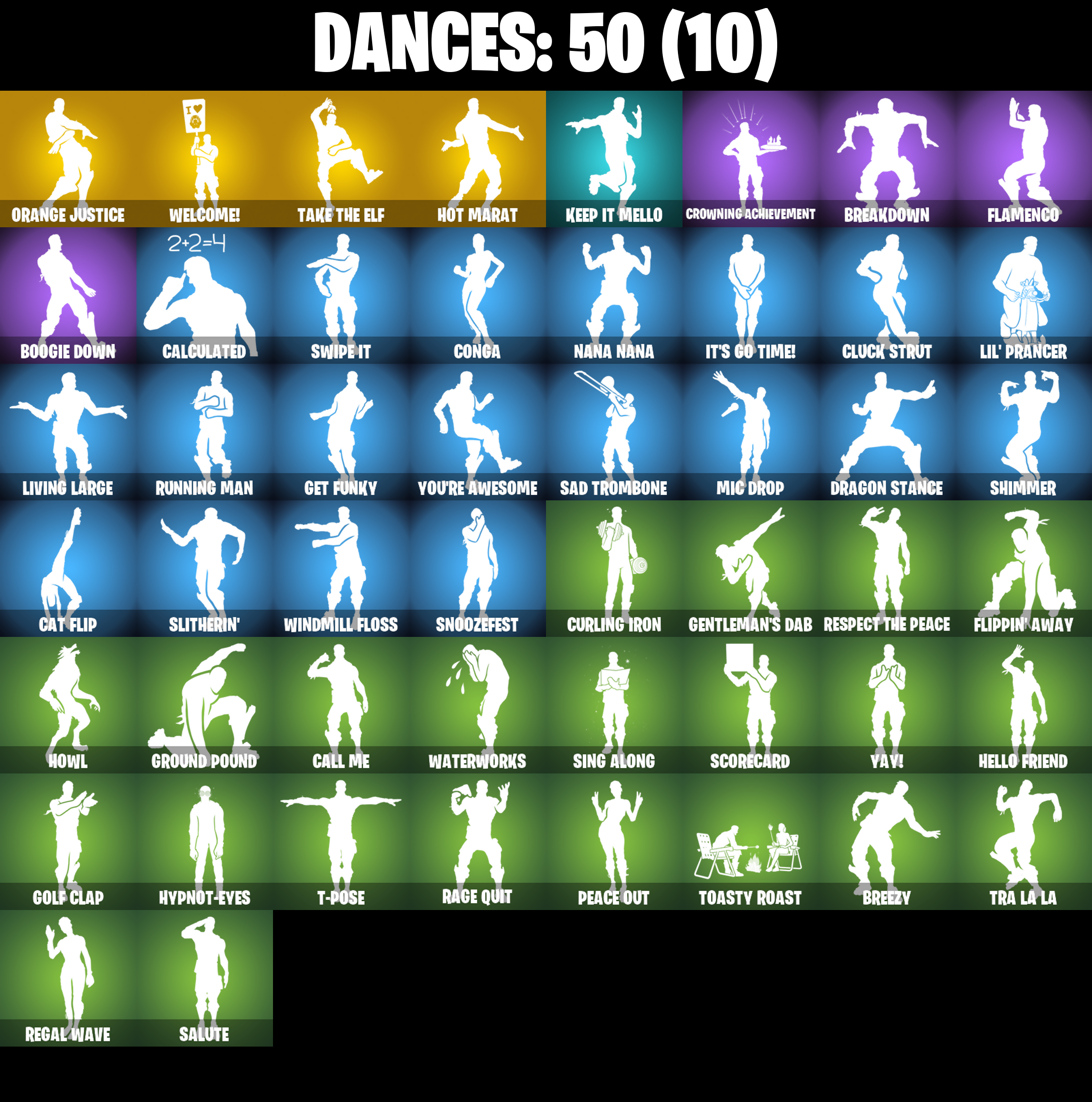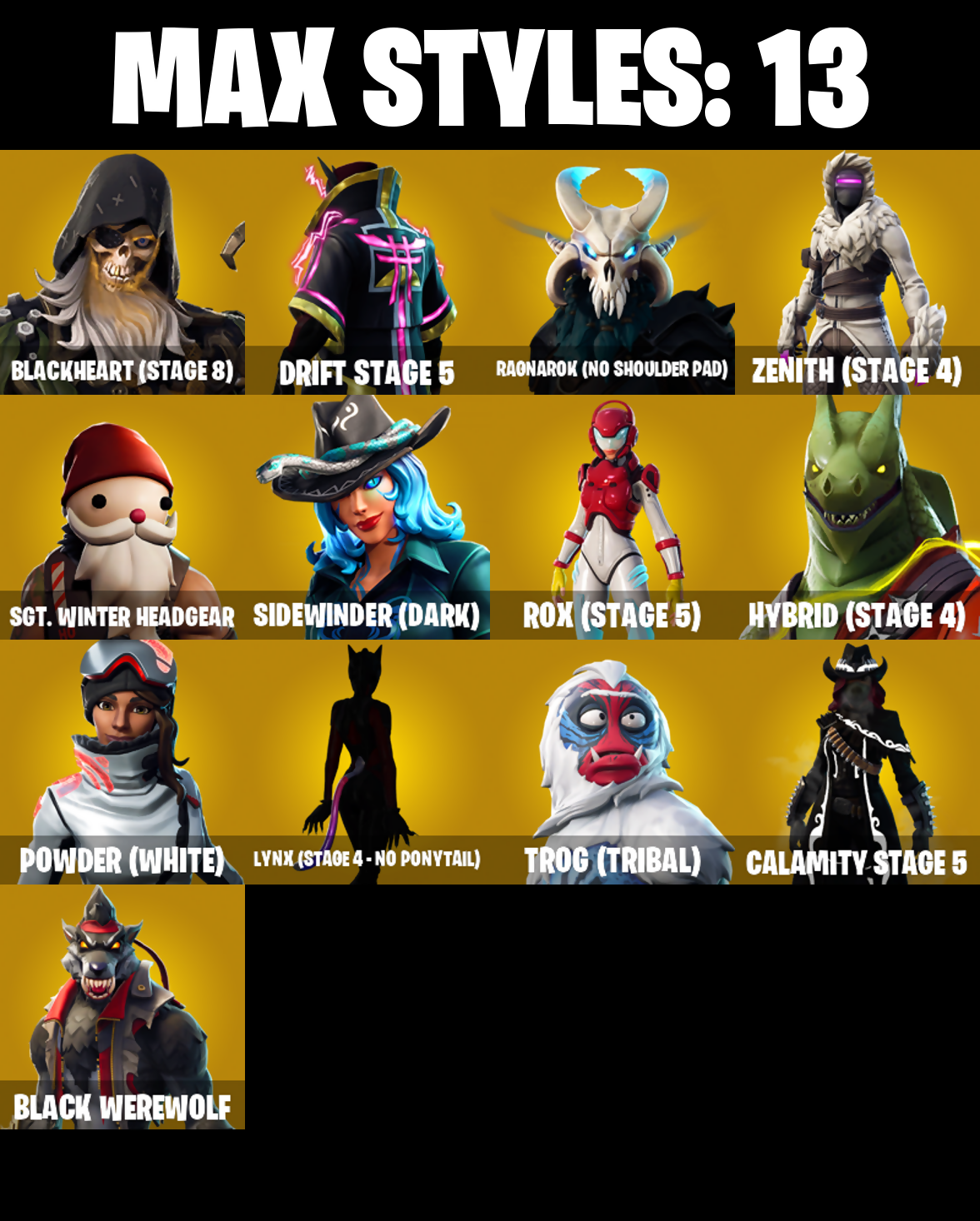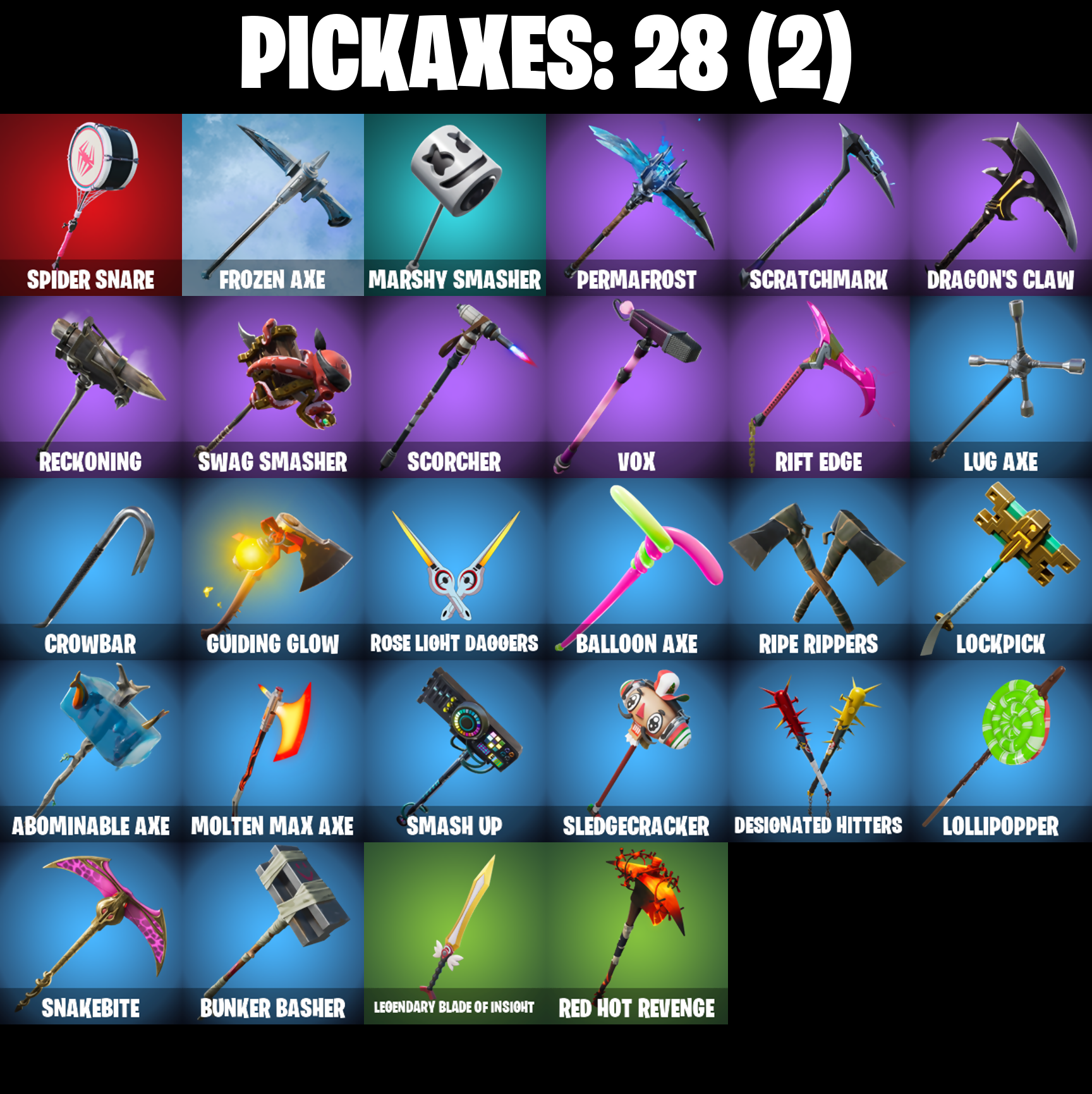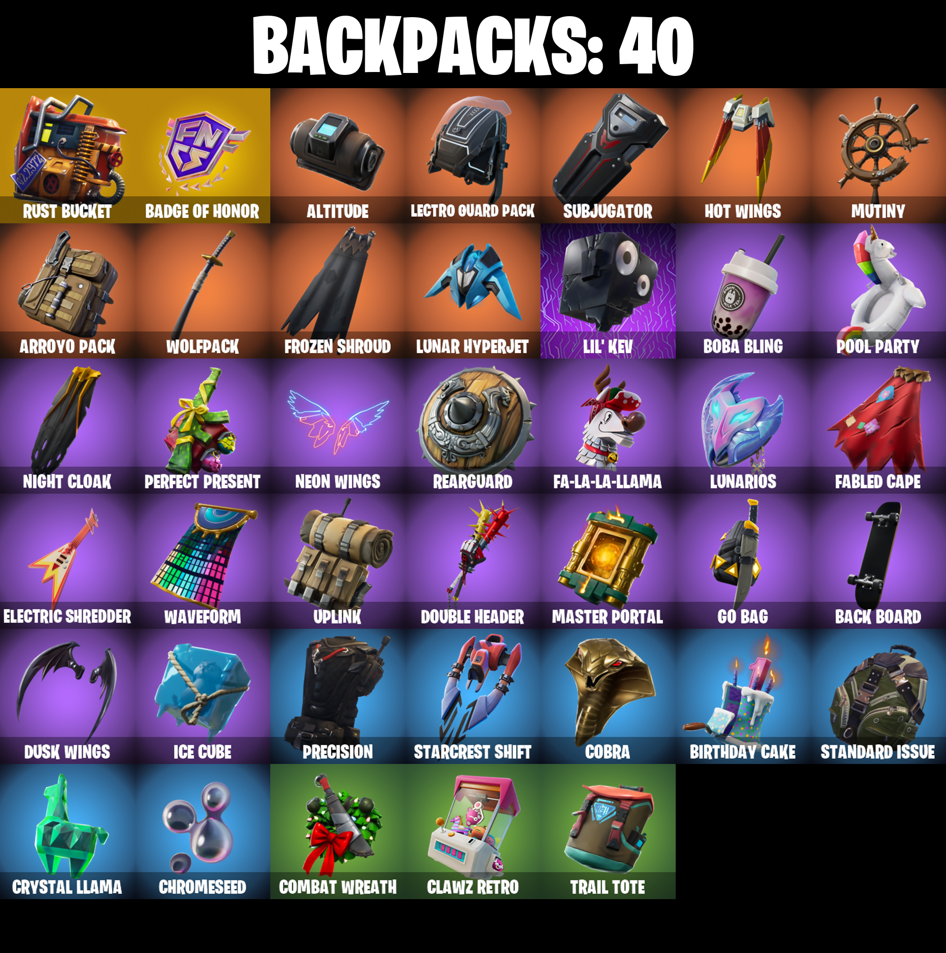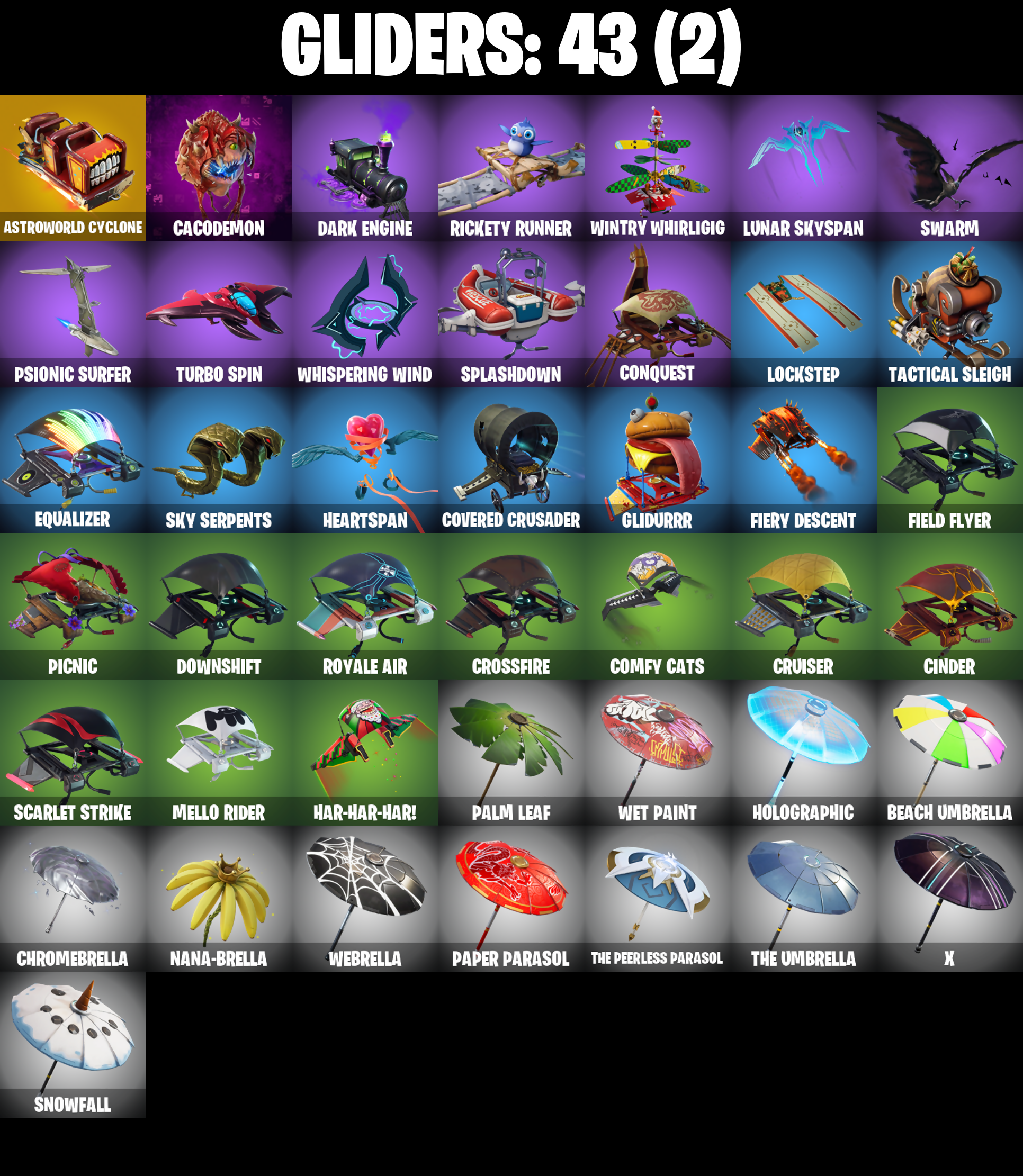 Abominable Axe, Altitude, Arctic Adeline, Arroyo Pack, Astroworld Cyclone, Back Board, Badge Of Honor, Balloon Axe, Banner Trooper, Beach Umbrella, Birthday Cake, Black Werewolf, Blackheart, Blackheart (Stage 8), Boba Bling, Boogie Down, Breakdown, Breezy, Bunker Basher, Bunker Jonesy, Cacodemon, Calamity, Calamity Stage 5, Calculated, Call Me, Cat Flip, Chrome Punk, Chromebrella, Chromeseed, Cinder, Clawz Retro, Cluck Strut, Cobra, Combat Wreath, Comfy Cats, Conga, Conquest, Covered Crusader, Crossfire, Crowbar, Crowning Achievement, Cruiser, Crystal Llama, Curling Iron, DJ Yonder, Dark Engine, Designated Hitters, Dire, Double Header, Downshift, Dragon Stance, Dragon's Claw, Drift, Drift Stage 5, Dusk, Dusk Wings, Electric Shredder, Ember, Enforcer, Equalizer, Fa-La-La-Llama, Fable, Fabled Cape, Field Flyer, Fiery Descent, Flamenco, Flippin' Away, Frozen Axe, Frozen Shroud, Gentleman's Dab, Get Funky, Giddy-Up, Glidurrr, Go Bag, Golf Clap, Ground Pound, Guiding Glow, Har-Har-Har!, Heartspan, Hello Friend, Holographic, Hot Marat, Hot Wings, Howl, Huntress, Hybrid, Hybrid (Stage 4), Hypnot-Eyes, Ice Cube, It's Go Time!, Jungle Scout, Keep It Mello, Lectro Guard Pack, Legendary Blade Of Insight, Lil' Kev, Lil' Prancer, Living Large, Lockpick, Lockstep, Lollipopper, Lug Axe, Lunar Hyperjet, Lunar Skyspan, Lunarios, Lynx, Lynx (Stage 4 - No Ponytail), Marshy Smasher, Master Portal, Mello Rider, Mic Drop, Molten Max Axe, Mutiny, Nana Nana, Nana-Brella, Neon Wings, Night Cloak, Nightshade, Onesie, Orange Justice, Palm Leaf, Paper Parasol, Peace Out, Peely, Perfect Present, Permafrost, Picnic, Pool Party, Powder, Powder (White), Precision, Psionic Surfer, Rage Quit, Ragnarok, Raonaron (No Shoulder Pad), Rearguard, Reckoning, Red Hot Revenge, Redline, Regal Wave, Respect The Peace, Rickety Runner, Rift Edge, Ripe Rippers, Rook, Rose Light Daggers, Rox, Rox (Stage 5), Royale Air, Running Man, Rust Bucket, Sad Trombone, Salute, Scarlet Strike, Scorcher, Scorecard, Scratchmark, Sentinel, Sgt. Winter, Sgt. Winter Headgear, Shimmer, Sidewinder, Sidewinder (Dark), Sing Along, Sky Serpents, Sled Ready Guff, Sledgecracker, Sledgehammer, Slitherin', Smash Up, Snakebite, Snoozefest, Snowfall, Spider Snare, Splashdown, Standard Issue, Starcrest Shift, Subjugator, Sun Strider, Swag Smasher, Swarm, Swipe It, T-Pose, Tactical Sleigh, Take The Elf, The Peerless Parasol, The Umbrella, Toasty Roast, Tra La La, Trail Tote, Trog, Trog (Tribal), Turbo Spin, Uplink, Vega, Vox, Waterworks, Waveform, Webrella, Welcome!, Wet Paint, Whispering Wind, Windmill Floss, Wintry Whirligig, Wolfpack, X, Yay!, You're Awesome, Zenith, Zenith (Stage 4)