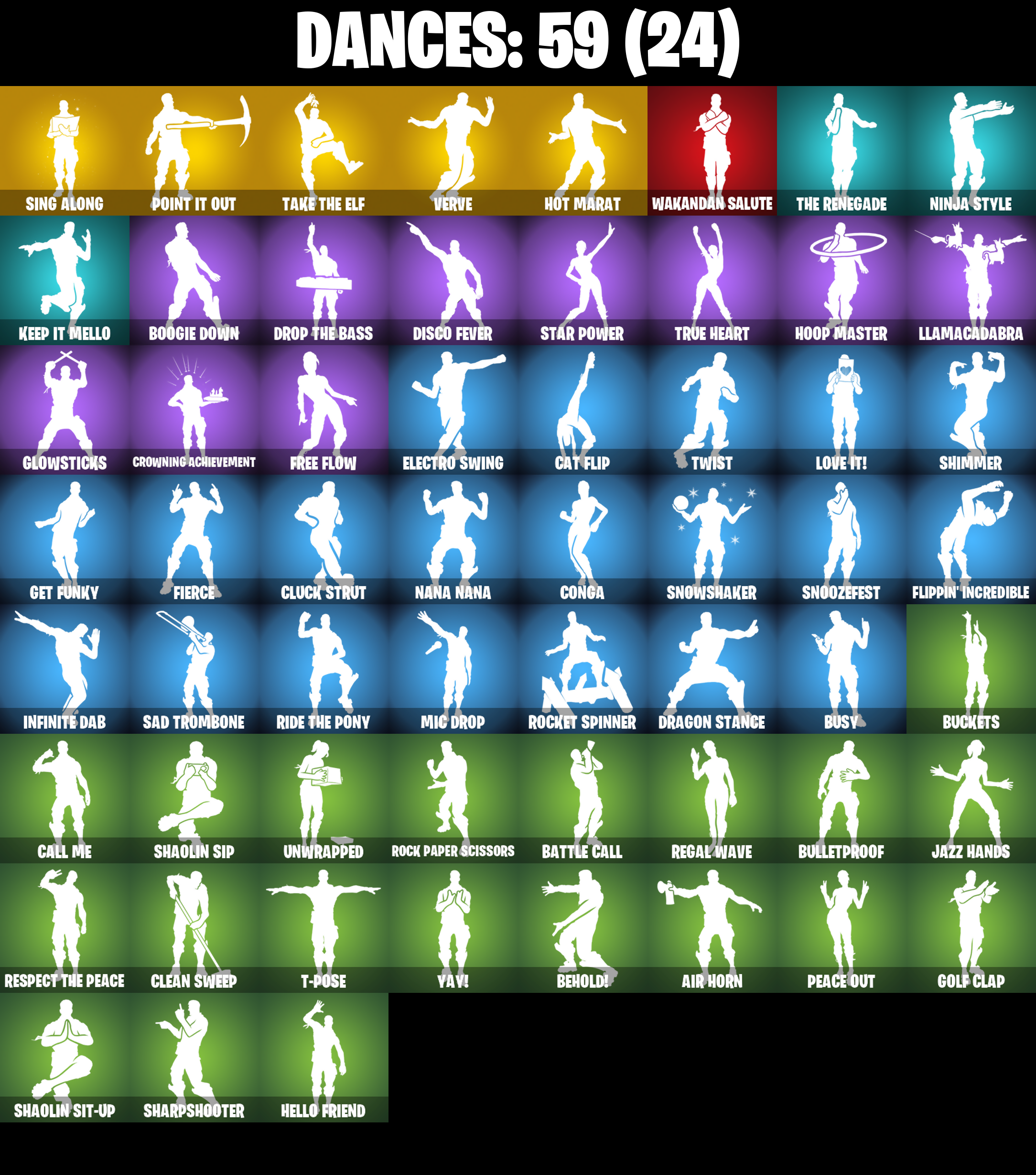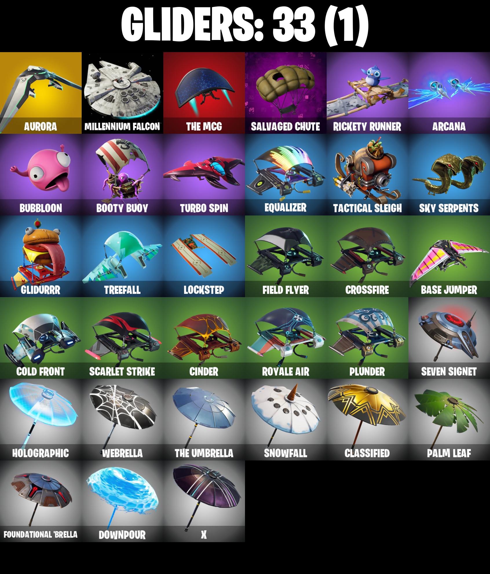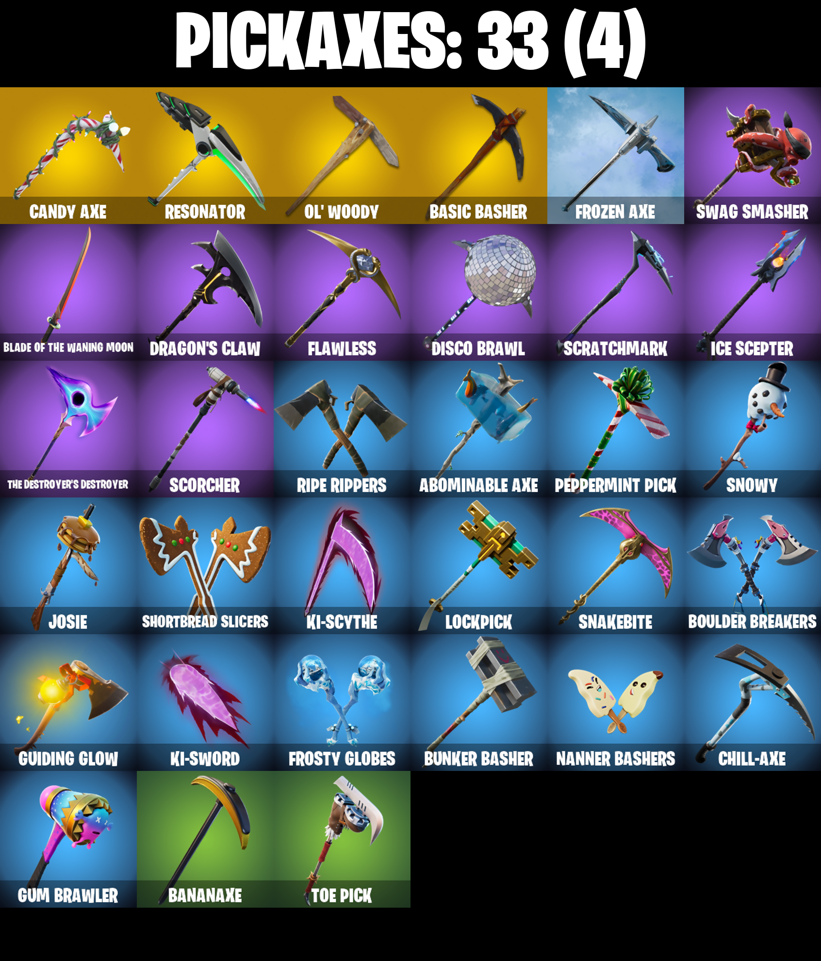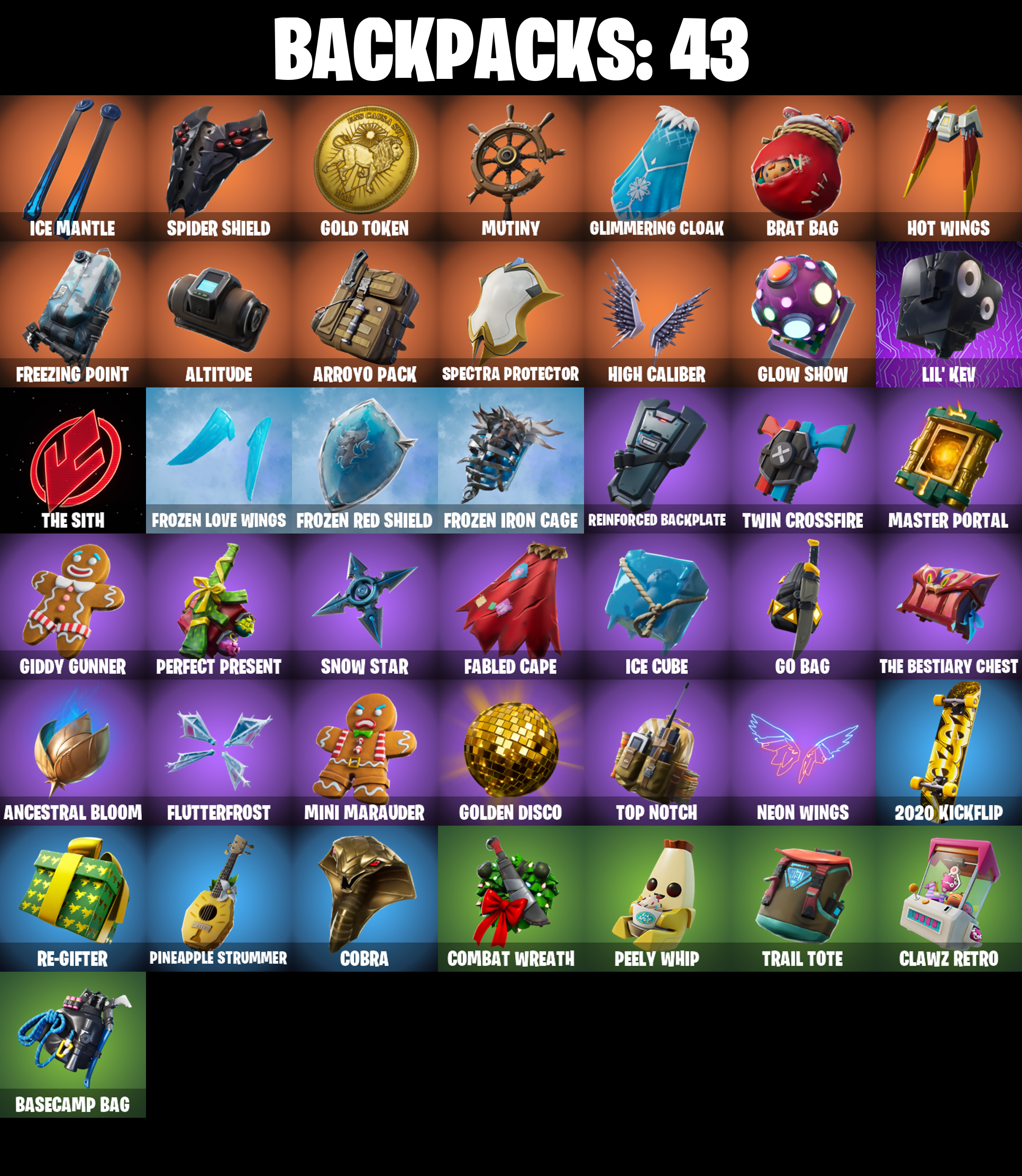 2020 Kickflip, Abominable Axe, Air Horn, Altitude, Ancestral Bloom, Arcana, Arroyo Pack, Aurora, Bananaxe, Bandolette, Base Jumper, Basecamp Bag, Basic Basher, Battle Call, Behold!, Blackheart, Blackheart (Stage 8), Blade Of The Waning Moon, Boogie Down, Booty Buoy, Boulder Breakers, Brat Bag, Bubbloon, Buckets, Bulletproof, Bunker Basher, Bunker Jonesy, Busy, Call Me, Candy Axe, Cat Flip, Chill-Axe, Cinder, Classified, Clawz Retro, Clean Sweep, Cluck Strut, Cobalt, Cobra, Cold Front, Combat Wreath, Commando, Conga, Crossfire, Crowning Achievement, DJ Bop, Disco Brawl, Disco Fever, Downpour, Dragon Stance, Dragon's Claw, Drop The Bass, Electro Swing, Ember, Eon, Equalizer, Fabled Cape, Field Flyer, Fierce, Flawless, Flippin' Incredible, Flutterfrost, Foundational 'Brella, Free Flow, Freezing Point, Frostbite, Frosty Globes, Frozen Axe, Frozen Iron Cage, Frozen Love Ranger, Frozen Love Wings, Frozen Raven, Frozen Red Knight, Frozen Red Shield, Funk Ops, Get Funky, Giddy Gunner, Ginger Gunner, Glidurr, Glimmer, Glimmering Cloak, Glow Show, Glowsticks, Go Bag, Goku Black, Gold Token, Golden Disco, Golf Clap, Guiding Glow, Gum Brawler, Hello Friend, High Caliber, Holographic, Hoop Master, Hot Marat, Hot Wings, Hybrid, Hybrid (Stage 4), Ice Cube, Ice King (Gold), Ice Mantle, Ice Scepter, Infinite Dab, Jazz Hands, Josie, Keep It Mello, Ki-Scythe, Ki-Sword, Krampus, Laguna, Lil' Kev, Llamacadabra, Lockpick, Lockstep, Love It!, Lt. Evergreen, Luxe, Luxe (Gold Clothing), Lynx, Lynx (Stage 4 - No Ponytail), Master Key, Master Key (Masked), Master Portal, Merry Marauder, Mic Drop, Millennium Falcon, Mini Marauder, Mutiny, Nana Nana, Nanner Bashers, Neon Wings, Ninja Style, Ol' Woody, Onesie, Palm Leaf, Pastel, Peace Out, Peely, Peely Whip, Peppermint Pick, Perfect Present, Pineapple Strummer, Plunder, Point It Out, Powder, Powder (White), Re-Gifter, Red-Nosed Raider, Regal Wave, Reinforced Backplate, Resonator, Respect The Peace, Rickety Runner, Ride The Pony, Ripe Rippers, Rock Paper Scissors, Rocket Spinner, Rox, Rox (Stage 5), Royale Air, Sad Trombone, Salvaged Chute, Scarlet Strike, Scorcher, Scratchmark, Sentinel, Seven Signet, Sgt. Winter, Sgt. Winter Headgear, Shaolin Sip, Shaolin Sit-Up, Sharpshooter, Shimmer, Shortbread Slicers, Sidewinder, Sidewinder (Dark), Sing Along, Sky Serpents, Snakebite, Snoozefest, Snorkel Ops, Snow Star, Snowfall, Snowfoot, Snowshaker, Snowy, Spectra Protector, Spider Knight, Spider Shield, Star Power, Sugarplum, Summit Striker, Swag Smasher, T-Pose, Tactical Sleigh, Take The Elf, The Bestiary Chest, The Destroyer's Destroyer, The Ice King, The Mcg, The Renegade, The Sith, The Umbrella, Toe Pick, Top Notch, Tower Recon Specialist, Trail Tote, Treefall, Trog, Trog (Tribal), True Heart, Turbo Spin, Twin Crossfire, Twist, Unwrapped, Vega, Verve, Wakandan Salute, Webrella, Whistle Warrior, Wooly Warrior, X, Yay!, Zenith, Zenith (Stage 4)