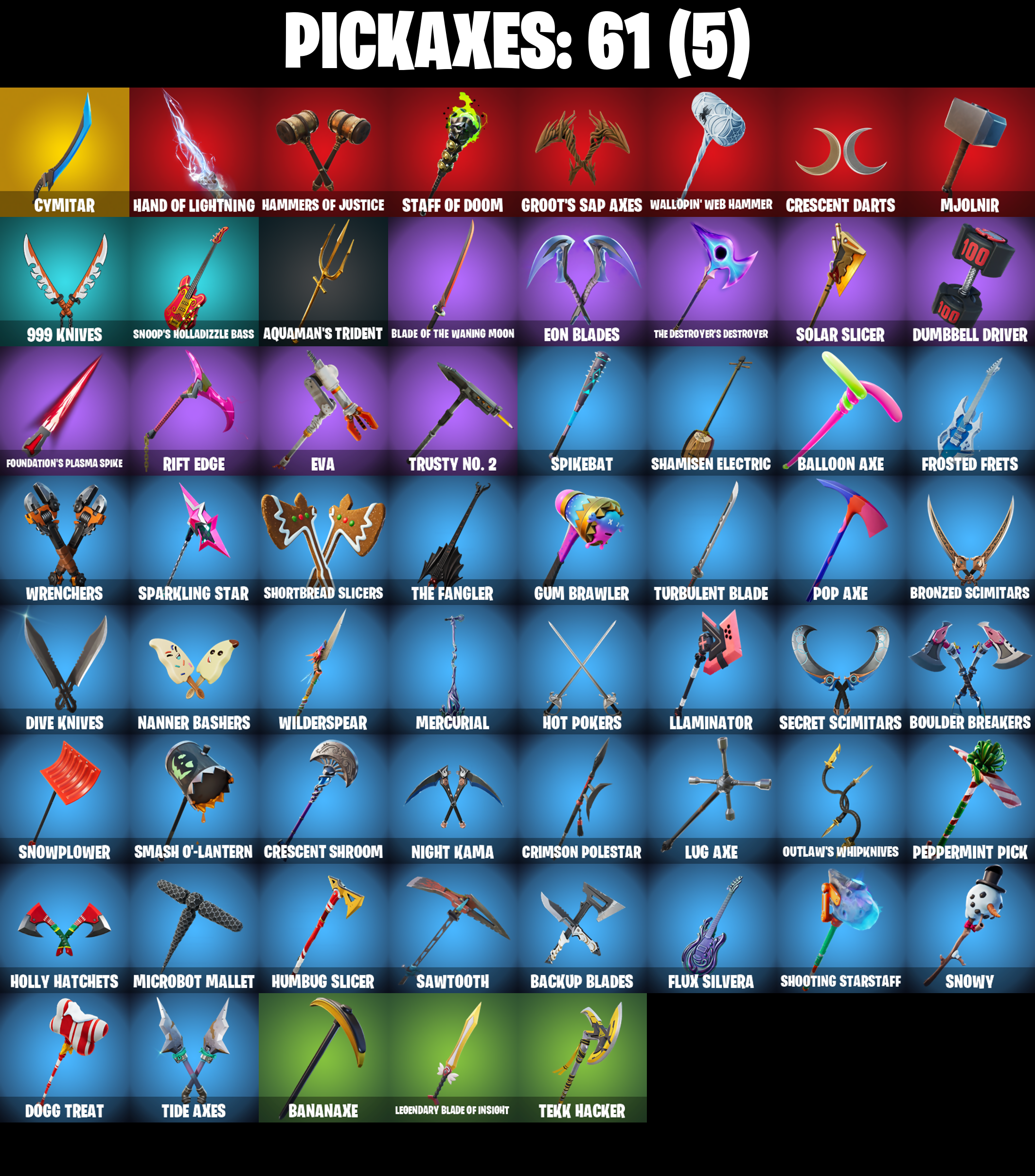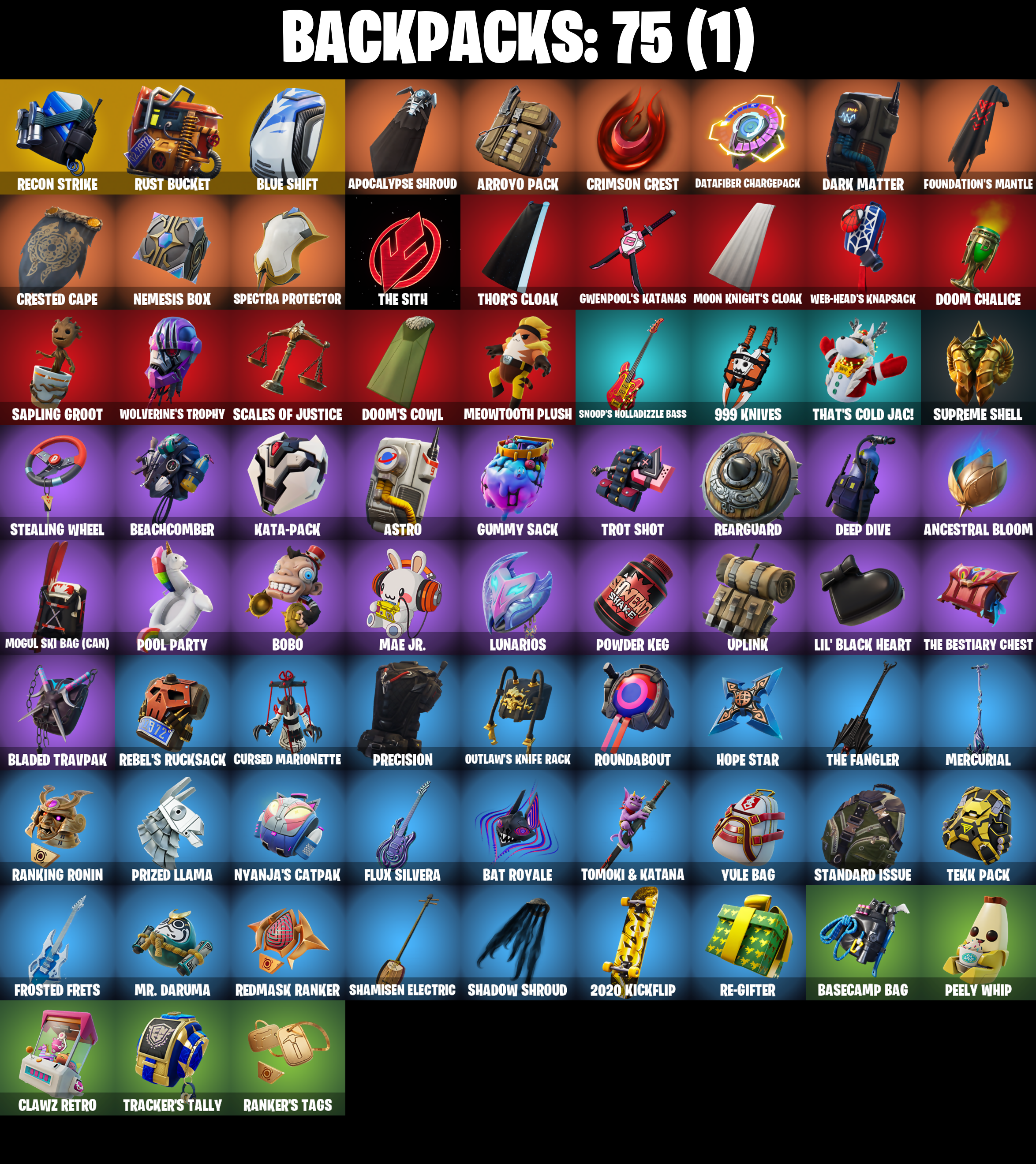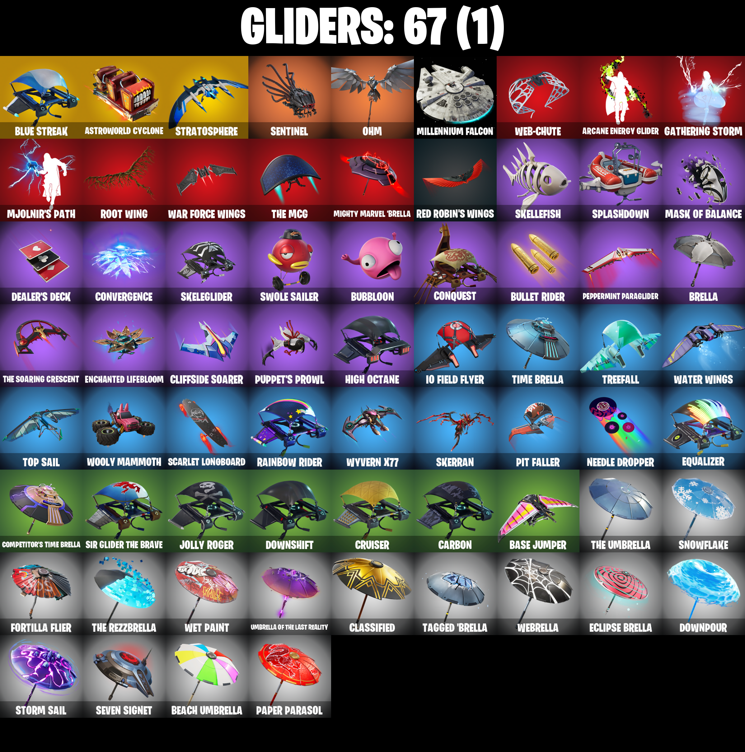 2020 Kickflip, 999 Knives, Air Shredder, Ancestral Bloom, Apocalypse Shroud, Aquaman, Aquaman's Trident, Arcane Energy Glider, Arroyo Pack, Arthur Curry, Astro, Astroworld Cyclone, Backup Blades, Balloon Axe, Bananaxe, Base Jumper, Basecamp Bag, Bat Royale, Battle Hound, Beach Umbrella, Beachcomber, Beep Beep, Best Mates, Blade Of The Waning Moon, Bladed Travpak, Blue Shift, Blue Streak, Blue Striker, Blue Team Leader, Bobo, Boulder Breakers, Breakin', Brella, Brite Bomber, Bronzed Scimitars, Brush Your Shoulders, Bubbloon, Bullet Rider, Calculated, Call Me, Carbon, Choice Knit, Classified, Clawz Retro, Cliffside Soarer, Competitor’s Time Brella, Conquest, Convergence, Crescent Darts, Crescent Shroom, Crested Cape, Crimson Crest, Crimson Polestar, Crowning Achievement, Cruiser, Cursed Marionette, Cyclo Curl, Cymitar, Dark Matter, Dark Voyager, Datafiber Chargepack, Dealer’s Deck, Deep Dive, Dive Knives, Doctor Doom, Dogg Treat, Doom Chalice, Doom's Cowl, Downpour, Downshift, Doze Dab, Drift, Drift Stage 5, Dumbbell Driver, Eclipse Brella, Elite Agent, Enchanted Lifebloom, Eon Blades, Equalizer, Eva, Fade, Fist Bump, Flippin' Away, Flux Silvera, Fortilla Flier, Foundation's Mantle, Foundation's Plasma Spike, Frosted Frets, Gathering Storm, Gentleman's Dab, Groot, Groot's Sap Axes, Gum Brawler, Gumbo, Gummy Sack, Gwenpool's Katanas, Hammers Of Justice, Hand Of Lightning, Harlowe, Haven, High Octane, Holly Hatchets, Hope Star, Hot Pokers, Humbug Slicer, Huntress, I Declare!, IO Field Flyer, Introducing..., Iris, It's... You?, Jennifer Walters, Jet Signals, Jolly Roger, Jules, Kata-Pack, Keep It Mello, Kit, Krisabelle, Legendary Blade Of Insight, Lil' Black Heart, Lil' Monster, Llaminator, Love It!, Lt. Evergreen, Lt. John Llama, Lug Axe, Lunar Charge, Lunarios, Mae Jr., Mask of Balance, Masked, Meowtooth Plush, Mercurial, Microbot Mallet, Mighty Marvel ‘Brella, Millennium Falcon, Mission Specialist, Mjolnir, Mjolnir’s Path, Mogul Master (CAN), Mogul Ski Bag (Can), Moon Knight, Moon Knight's Cloak, Moonwalker, Mr. Daruma, Mwahaha, Nailed It, Nanner Bashers, Needle Dropper, Nemesis Box, Night Kama, Nyanja's Catpak, Ocean, Ohm, Orange Justice, Outlaw's Knife Rack, Outlaw's Whipknives, Paper Parasol, Peely Whip, Peppermint Paraglider, Peppermint Pick, Pit Faller, Point Patroller, Polar Peely, Pony Up, Pool Party, Pop Axe, Powder Keg, Precision, Prized Llama, Puppet’s Prowl, Rainbow Rider, Ranker's Tags, Ranking Ronin, Re-Gifter, Rearguard, Rebel's Rucksack, Recon Strike, Red Robin’s Wings, Redline, Redmask Ranker, Regal Wave, Respect The Peace, Ride The Pony, Rift Edge, Riptide, Rock Paper Scissors, Ronin, Ronin (Cape), Rook, Root Wing, Roundabout, Rust Bucket, Rust Lord, Salute, Santa Dogg, Sapling Groot, Sawtooth, Scales Of Justice, Scarlet Longboard, Scuba Jonesy, Secret Scimitars, Sentinel, Seven Signet, Shadow Shroud, Shamisen Electric, Shanta, Shaolin Sip, Sharpshooter, Shooting Starstaff, Shortbread Slicers, Sir Glider The Brave, Skeleglider, Skellefish, Skerran, Slayer Juice Wrld, Sledgehammer, Smash O'-Lantern, Snoop's Holladizzle Bass, Snowflake, Snowplower, Snowshaker, Snowy, So Square, Solar Slicer, Sparkling Star, Spectra Protector, Spider-Man, Spikebat, Splashdown, Staff Of Doom, Standard Issue, Stealing Wheel, Storm, Storm (Punk), Storm Sail, Stratosphere, Sultura, Sun Strider, Supreme Shell, Sweet!, Swipe It, Swole Sailer, Tagged ‘Brella, Take The Cake, Take The L, Tekk Hacker, Tekk Pack, That's Cold Jac!, The Bestiary Chest, The Destroyer's Destroyer, The Fangler, The Foundation, The McG, The Reaper, The Rezzbrella, The Robot, The Sith, The Soaring Crescent, The Umbrella, Thor, Thor's Cloak, Tide Axes, Time Brella, Tippy Tap, Tomoki & Katana, Top Sail, Tracker's Tally, Treefall, Trot Shot, Trusty No. 2, Turbulent Blade, Umbrella Of The Last Reality, Uplink, Verve, Wallopin' Web Hammer, War Force Wings, Water Wings, Wave, Web-Chute, Web-Head's Knapsack, Webrella, Welder, Wet Paint, Wilderspear, Wolverine's Trophy, Wooly Mammoth, Wooly Warrior, Wrenchers, Wyvern X77, You're Awesome, Yule Bag, Yulejacket