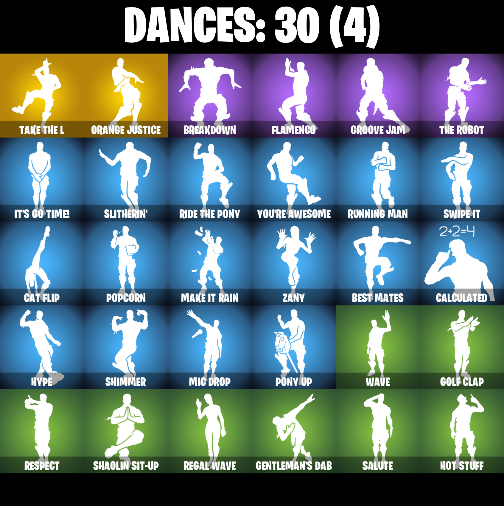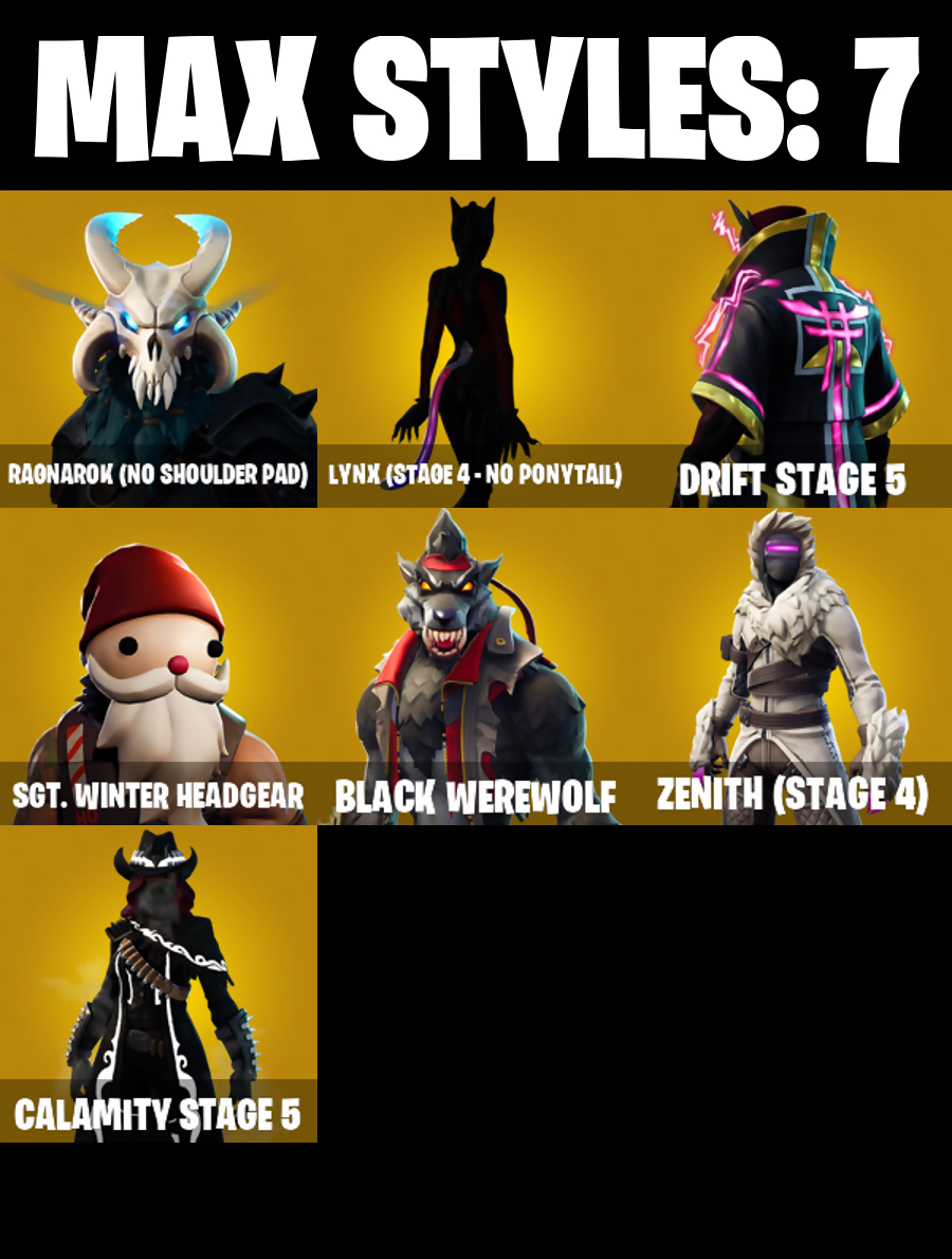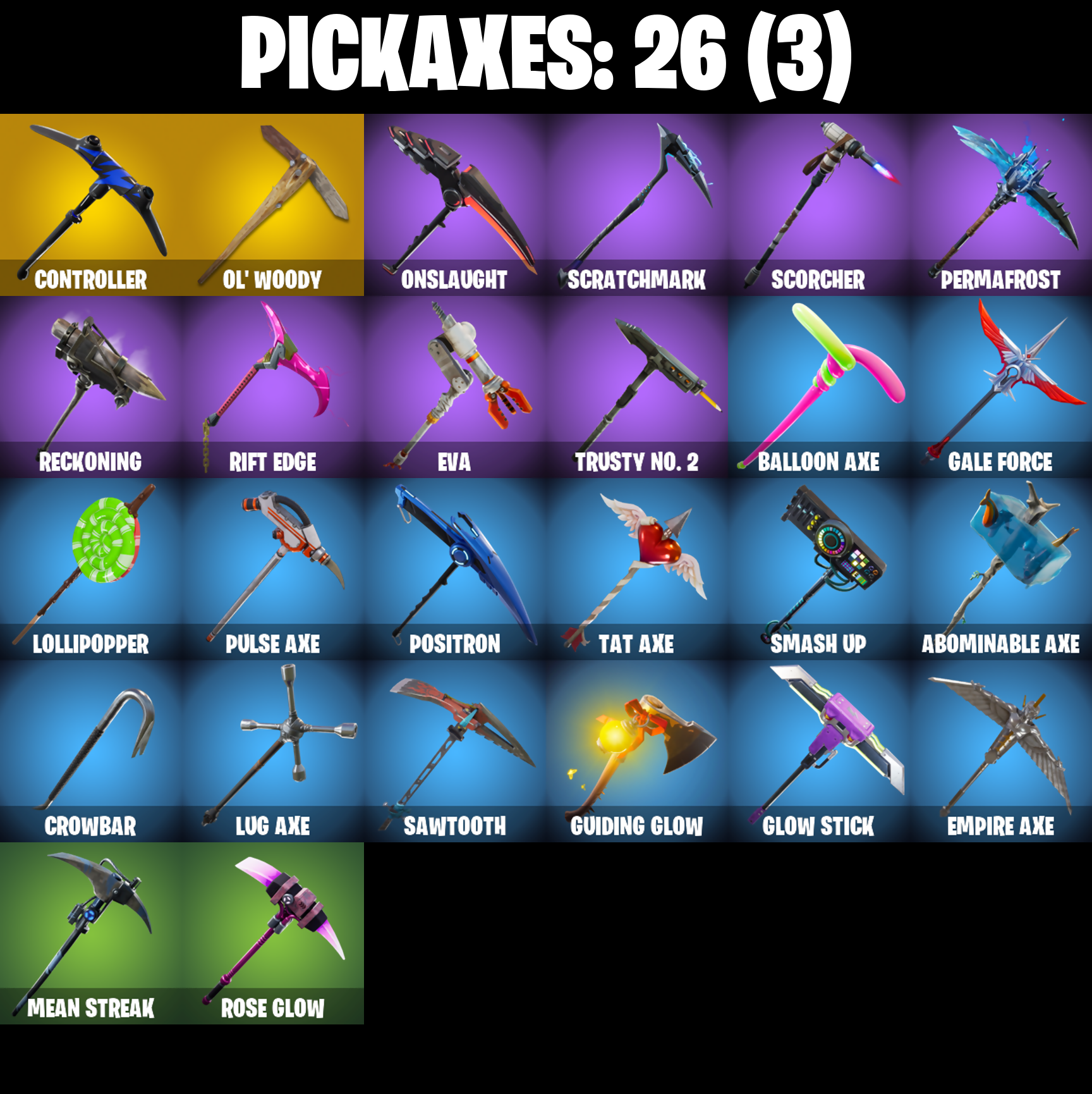 A.I.M., Abominable Axe, Altitude, Archetype, Astro, Balloon Axe, Battlehawk, Beach Umbrella, Best Mates, Birdshot, Black Werewolf, Blue Shift, Blue Squire, Blue Streak, Blue Striker, Blue Team Leader, Bogey Bag, Breakdown, Calamity, Calamity Stage 5, Calculated, Carbide, Carbon, Cat Flip, Clawz Retro, Combat Wreath, Conquest, Controller, Covered Crusader, Crackshot, Crossfire, Crowbar, Cruiser, DJ Yonder, Dark Matter, Dark Voyager, Dire, Downshift, Drift, Drift Stage 5, Dusk, Dusk Wings, E.L.I.M., Elite Agent, Empire Axe, Enforcer, Equalizer, Eva, Fable, Fabled Cape, Flamenco, Flappy, Founder's Glider, Founder's Umbrella, Frozen Shroud, Gale Force, Gentleman's Dab, Get Down!, Ghost Portal, Giddy-Up, Glidurr, Glow Stick, Golf Clap, Goodie Bag, Groove Jam, Guiding Glow, High Octane, Hot Stuff, Huntress, Hype, Intrepid, It's Go Time!, Lollipopper, Lug Axe, Lynx, Lynx (Stage 4 - No Ponytail), Make It Rain, Mean Streak, Merry Marauder, Mic Drop, Mini Marauder, Mission Specialist, Moonwalker, Night Cloak, Nightshade, Offworld Rig, Ol' Woody, Omega, Onslaught, Orange Justice, Paper Parasol, Paradigm, Perfect Present, Permafrost, Picnic, Pony Up, Pool Party, Popcorn, Positron, Powder, Precision, Pulse Axe, Pursuit, Ragnarok, Rainbow Rider, Raonarok (No Shoulder Pad), Rearguard, Reckoning, Redline, Regal Wave, Respect, Ride The Pony, Rift Edge, Rook, Rose Glow, Rose Rider, Rose Team Leader, Royale Air, Royale Knight, Royale Shield, Running Man, Rust Bucket, Rust Lord, Salute, Sawtooth, Scorcher, Scratchmark, Sgt. Winter, Sgt. Winter Headgear, Shaolin Sit-Up, Shimmer, Skirmish, Skull Trooper, Sledgehammer, Slitherin', Smash Up, Snowfall, Snowflake, Splashdown, Squad Leader, Squire Shield, Standard Issue, Subjugator, Sugar Crash, Summit Striker, Sun Strider, Swag Bag, Swarm, Swipe It, Tactical Sleigh, Take The L, Tat Axe, Teknique, The Ace, The Reaper, The Robot, The Umbrella, The Visitor, Top Notch, Trail Tote, Trusty No. 2, Uplink, Valor, Warpaint, Wave, Waveform, Webrella, Wet Paint, Wild Streak, Wingman, Wings Of Valor, Wolfpack, You're Awesome, Yuletide Ranger, Zany, Zenith, Zenith (Stage 4), Zoey