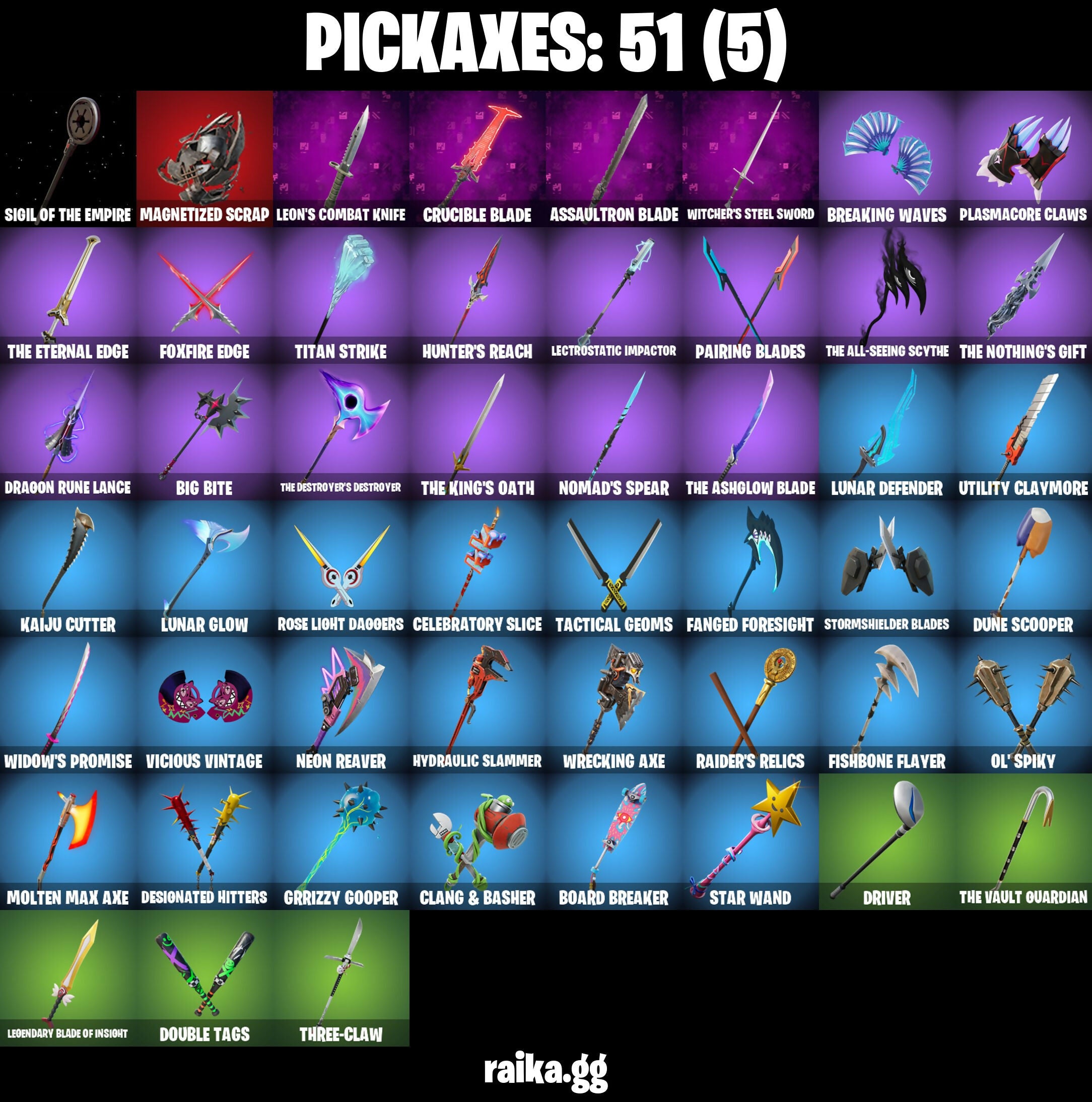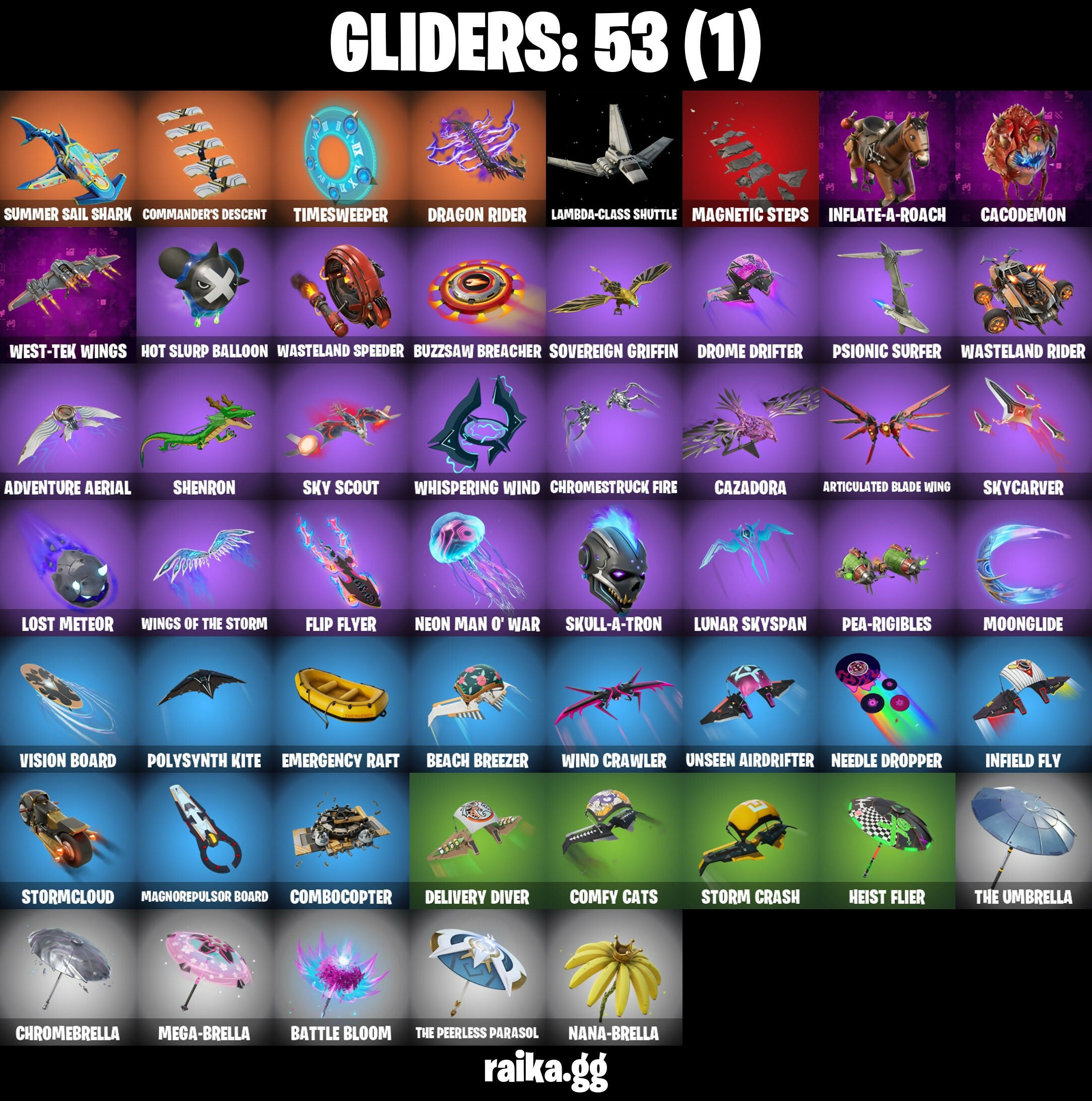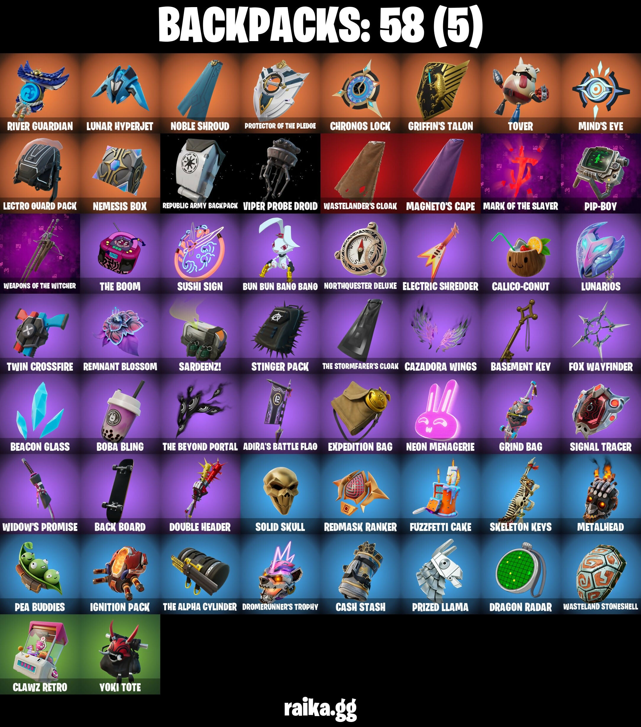 Adira's Battle Flag, Adventure Aerial, Articulated Blade Wing, Ascension Nezumi, Assaultron Blade, Astro Armor, Aurelian, Back Board, Backlash, Balance Board, Basement Key, Battle Bloom, Beach Breezer, Beacon Glass, Bear Hug, Big Bite, Blowin' Up, Board Breaker, Boba Bling, Boba Snack, Boogie Down, Boosting Ki, Breaking Waves, Bullpen Brawler Dusty, Bullseye, Bun Bun Bang Bang, Buzzsaw Breacher, Cacodemon, Calico-Conut, Called Shot, Cash Stash, Cazadora, Cazadora Wings, Celebratory Slice, Charging Up, Chef's Special, Chromebrella, Chromestruck Fire, Chronos Lock, Clang & Basher, Clawz Retro, Club President Helsie, Codsworth's Cleanup, Cold Blooded Ace, Combocopter, Comfy Cats, Commander's Descent, Crowning Achievement, Crucible Blade, Cyborg, Darklands Brite Raider, Darth Vader, Delivery Diver, Designated Hitters, Disassemble, Double Header, Double Tags, Dragon Radar, Dragon Rider, Dragon Rune Lance, Driver, Drome Drifter, Dromerunner's Trophy, Dune Scooper, Electric Shredder, Emergency Raft, Empress Fan Dance, Era, Eren Jaeger, Expedition Bag, Expressionism, Fanged Foresight, Fire Show, Fishbone Flayer, Flip Flyer, Fox Wayfinder, Foxfire Edge, Fuzzfetti Cake, Get Out Of Your Mind, Griffin's Talon, Grind Bag, Grriz, Grrizzy Gooper, Heist Flier, Highwire, Hot Slurp Balloon, Hunter's Reach, Hydraulic Slammer, Hypnot-Eyes, I Need You To Concentrate, Igni Sign, Ignition Pack, Imani, Imperial March, Infield Fly, Inflate-A-Roach, It Is Finished, Kaiju Cutter, Lambda-Class Shuttle, Laser Focused, Lectro Guard Pack, Lectrostatic Impactor, Legendary Blade Of Insight, Lennox Rose, Leon's Combat Knife, Lost Meteor, Lunar Defender, Lunar Glow, Lunar Hyperjet, Lunar Party, Lunar Skyspan, Lunarios, Magmatic Mizuki (Cover-Up Off), Magnetic Steps, Magnetized Scrap, Magneto, Magneto's Cape, Magnorepulsor Board, Make A Seat, Manic, Mariposa, Mark Of The Slayer, Mega-Brella, Meow Skulls, Metalhead, Min-Joon, Mind's Eye, Mini Slayer Fistbump, Molten Max Axe, Moonglide, Nana-Brella, Needle Dropper, Nemesis Box, Neon Man O' War, Neon Menagerie, Neon Reaver, Noble Shroud, Nomad's Spear, Northquester Deluxe, Ol' Spiky, Omg I Love It, On, Pairing Blades, Pea Buddies, Pea Part Harmony, Pea-Rigibles, Pip-Boy, Plasmacore Claws, Polysynth Kite, Pony Tails, Ponytail, Prized Llama, Protector Of The Pledge, Psionic Surfer, Purradise Meowscles, Rage Quit, Raider's Relics, Redmask Ranker, Relik, Remnant Blossom, Republic Army Backpack, Rian, Ringmaster Scarr, River Guardian, Rococo Cloak-O, Rose Light Daggers, Rust, Sardeenz!, Scarlet Commander, Scout Regiment Salute, Self Reflexing, Shenron, Shuriken Spinner, Sigil Of The Empire, Signal Tracer, Skeleton Keys, Skull-A-Tron, Sky Scout, Skycarver, Slurp Peabody, Snap, Solid Skull, Solitary Defender, Sovereign Griffin, Standing Bow, Star Wand, Steady, Stealth Stray, Stinger Pack, Storm Brawler, Storm Crash, Stormcloud, Stormshielder Blades, Summer Sail Shark, Summer Strider, Sunlit Selene, Sushi Sign, Swag Shot, Sweet Shot, T-60 Power Armor, Tactical Geoms, Take A'Bow, Temple Explorer, The Ageless Champion, The All-Seeing Scythe, The Alpha Cylinder, The Ashglow Blade, The Beyond Portal, The Boom, The Destroyer's Destroyer, The Dip, The Eternal Edge, The King's Oath, The Machinist, The Nothing's Gift, The Peerless Parasol, The Stormfarer's Cloak, The Umbrella, The Vault Guardian, This Is Fine, Thrasher Massai, Three-Claw, Thunder, Timesweeper, Titan Strike, Tover, Trace, Twin Crossfire, Twyn, Unseen Airdrifter, Utility Claymore, Vicious Vintage, Viper Probe Droid, Viper School, Vision Board, Wasteland Rider, Wasteland Rock, Wasteland Speeder, Wasteland Stoneshell, Wastelander's Cloak, Weapons Of The Witcher, West-Tek Wings, Whispering Wind, Widow's Promise, Wind Crawler, Wings Of The Storm, Wintersong Mystica, Witcher's Steel Sword, Wrecking Axe, Yoki Tote