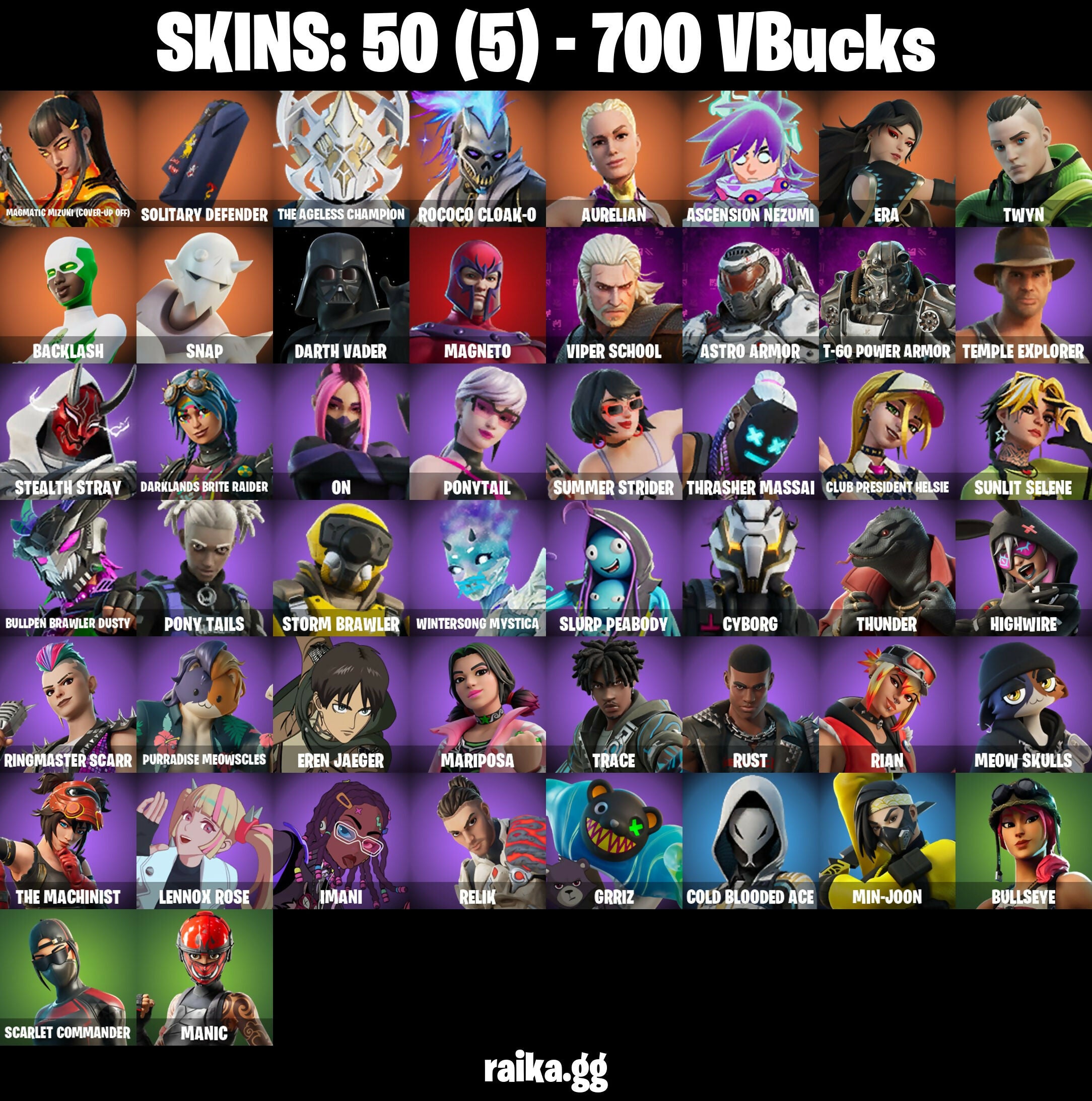 [PC/PSN/XBOX] 50 skins | Magmatic Mizuki (Cover-up Off) | Phantasm | Eren Jaeger | Rococo Cloak-o | Indiana Jones | Leon Combat Knife | Stray | Bullseye 700 VB
