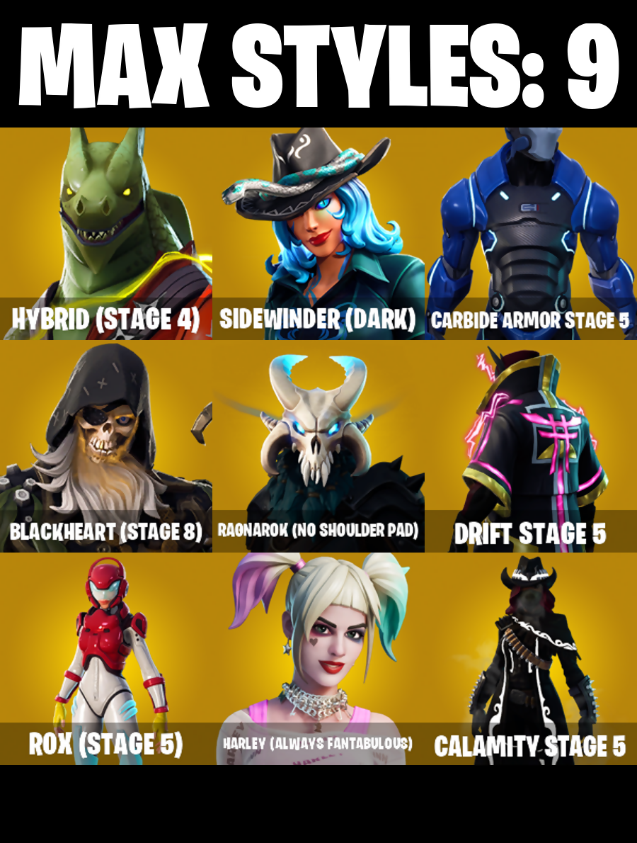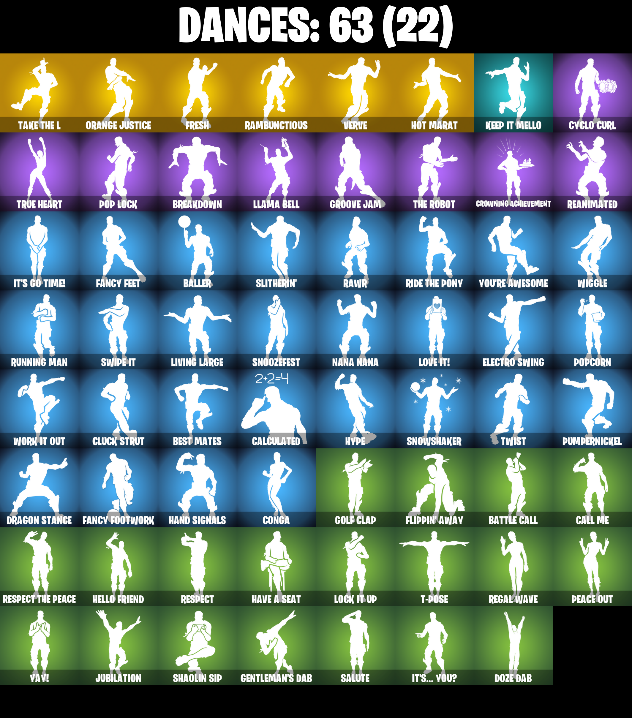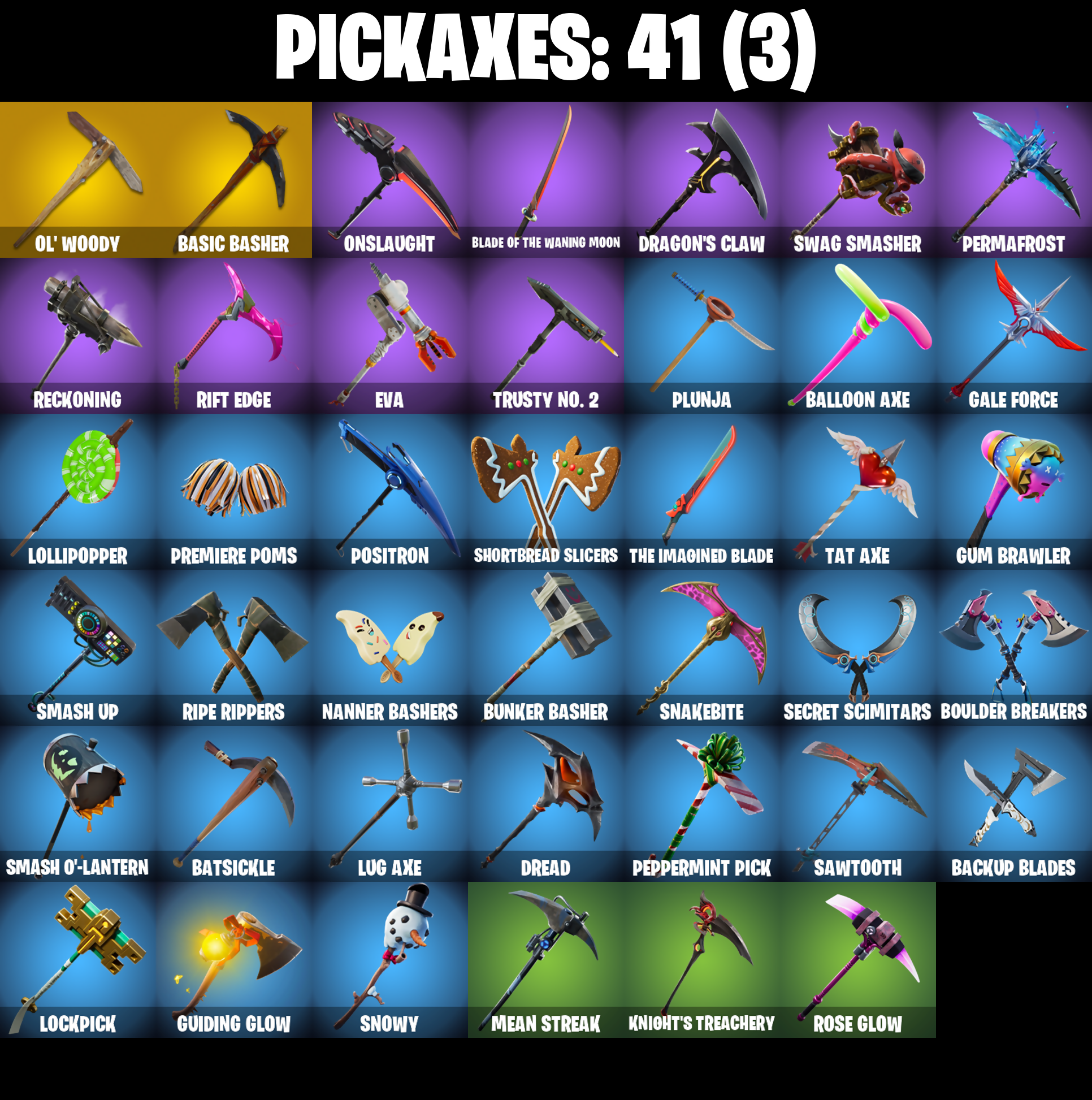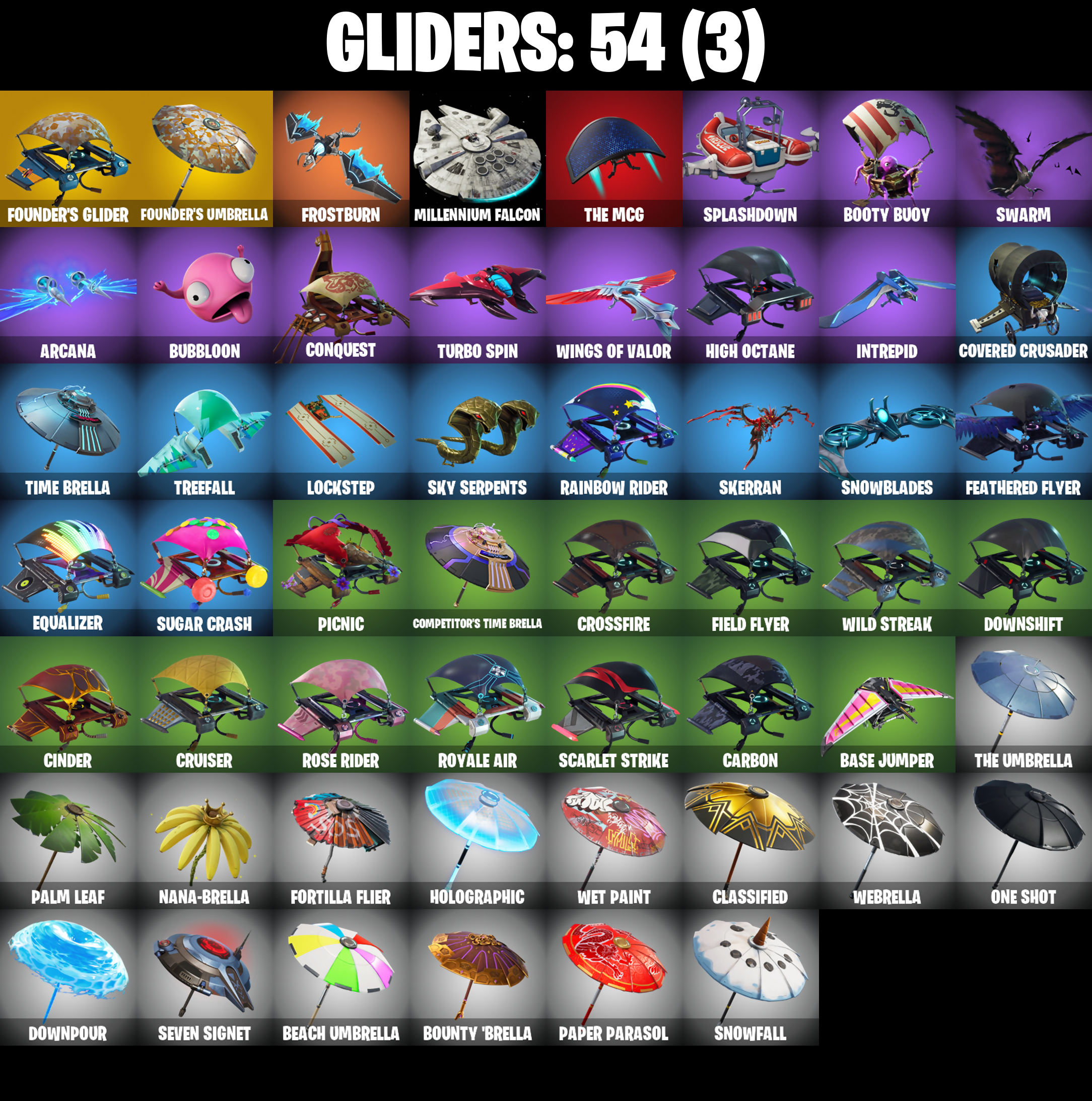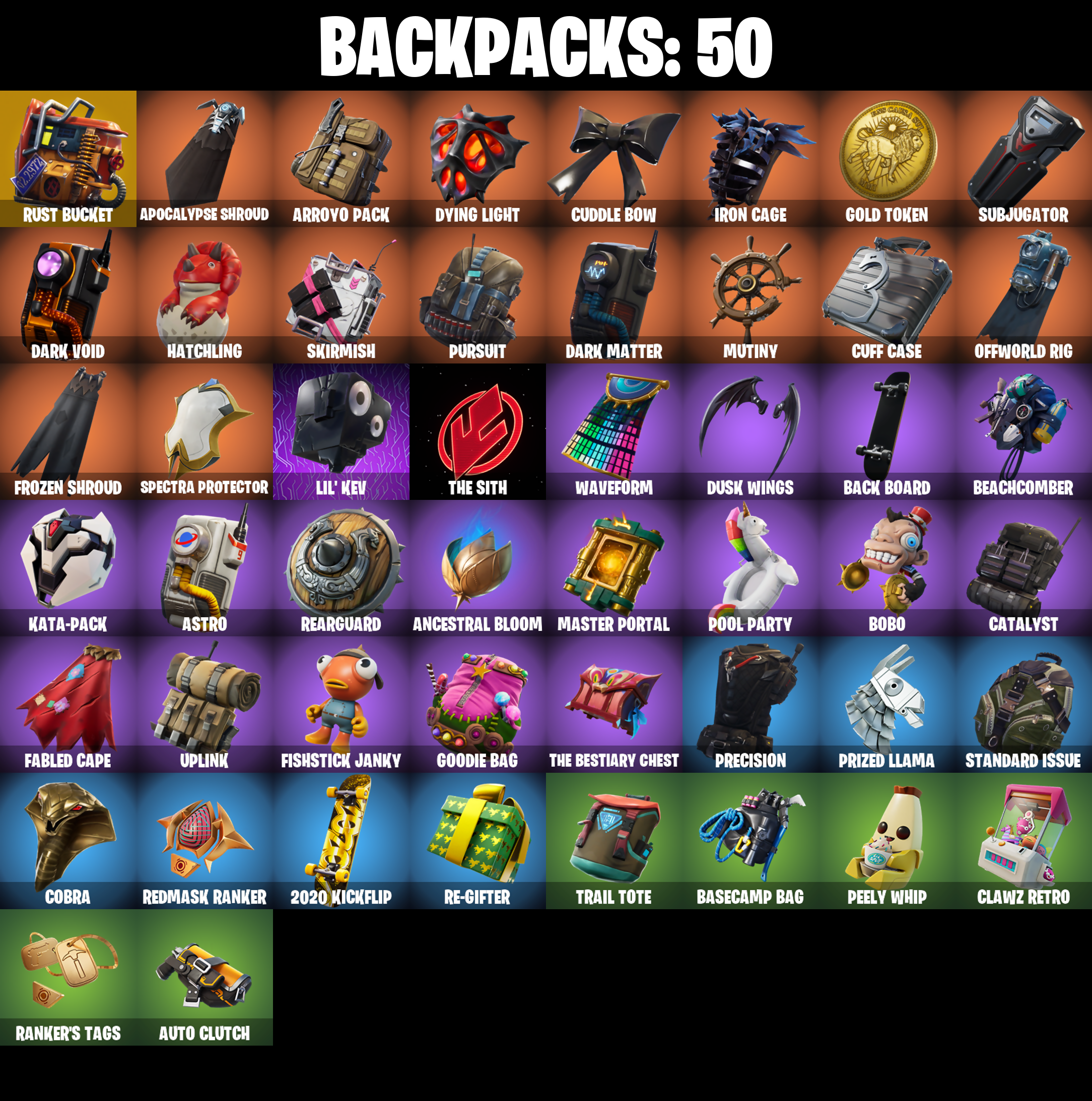 2020 Kickflip, Ancestral Bloom, Apocalypse Shroud, Arcana, Arroyo Pack, Astro, Auto Clutch, Back Board, Backup Blades, Baller, Balloon Axe, Base Jumper, Basecamp Bag, Basic Basher, Batsickle, Battle Call, Battlehawk, Beach Umbrella, Beachcomber, Best Mates, Blackheart, Blackheart (Stage 8), Blade Of The Waning Moon, Bobo, Booty Buoy, Boulder Breakers, Bounty 'Brella, Breakdown, Brite Bomber, Bubbloon, Bunker Basher, Bunker Jonesy, Calamity, Calamity Stage 5, Calculated, Call Me, Carbide, Carbide Armor Stage 5, Carbon, Catalyst, Cinder, Classified, Clawz Retro, Cluck Strut, Cobra, Competitor's Time Brella, Conga, Conquest, Covered Crusader, Crossfire, Crowning Achievement, Cruiser, Cuddle Bow, Cuddle Team Leader, Cuff Case, Cyclo Curl, DJ Yonder, Dark Matter, Dark Vanguard, Dark Void, Dark Voyager, Downpour, Downshift, Doze Dab, Dragon Stance, Dragon's Claw, Dread, Drift, Drift Stage 5, Dusk, Dusk Wings, Dying Light, Electro Swing, Elite Agent, Ember, Enforcer, Equalizer, Eva, Fable, Fabled Cape, Fancy Feet, Fancy Footwork, Feathered Flyer, Field Flyer, Fishstick Janky, Flippin' Away, Fortilla Flier, Founder's Glider, Founder's Umbrella, Fresh, Frostburn, Frozen Shroud, Gale Force, Gentleman's Dab, Giddy-Up, Gold Token, Golf Clap, Goodie Bag, Groove Jam, Guiding Glow, Gum Brawler, Hand Signals, Harley (Always Fantabulous), Harley Quinn, Hatchling, Have A Seat, Hello Friend, High Octane, Holographic, Hot Marat, Huntress, Hybrid, Hybrid (Stage 4), Hype, Intrepid, Iron Cage, It's Go Time!, It's... You?, Jubilation, Kata-Pack, Keep It Mello, Knight's Treachery, Lil' Kev, Living Large, Llama Bell, Lock It Up, Lockpick, Lockstep, Lollipopper, Love It!, Lt. Evergreen, Lug Axe, Master Key, Master Portal, Mean Streak, Millennium Falcon, Mission Specialist, Moonwalker, Mutiny, Nana Nana, Nana-Brella, Nanner Bashers, Offworld Rig, Ol' Woody, Omega, One Shot, Onslaught, Orange Justice, Palm Leaf, Paper Parasol, Peace Out, Peely, Peely Whip, Peppermint Pick, Permafrost, Picnic, Plunja, Pool Party, Pop Lock, Popcorn, Positron, Precision, Premiere Poms, Prized Llama, Pumpernickel, Pursuit, Ragnarok, Rainbow Rider, Rambunctious, Ranker's Tags, Raonarok (No Shoulder Pad), Raven, Rawr, Re-Gifter, Reanimated, Rearguard, Reckoning, Redline, Redmask Ranker, Regal Wave, Respect, Respect The Peace, Ride The Pony, Rift Edge, Ripe Rippers, Rogue Agent, Rook, Rose Glow, Rose Rider, Rose Team Leader, Rox, Rox (Stage 5), Royale Air, Ruin, Running Man, Rust Bucket, Rust Lord, Salute, Sawtooth, Scarlet Defender, Scarlet Strike, Secret Scimitars, Sentinel, Seven Signet, Shaolin Sip, Shortbread Slicers, Sidewinder, Sidewinder (Dark), Skerran, Skirmish, Sky Serpents, Sledgehammer, Slitherin', Smash O'-lantern, Smash Up, Snakebite, Snoozefest, Snorkel Ops, Snowblades, Snowfall, Snowshaker, Snowy, Spectra Protector, Splashdown, Squad Leader, Standard Issue, Subjugator, Sugar Crash, Sun Strider, Swag Smasher, Swarm, Swipe It, T-Pose, Take The L, Tat Axe, Teknique, The Bestiary Chest, The Imagined Blade, The McG, The Reaper, The Robot, The Sith, The Umbrella, The Visitor, Time Brella, Trail Tote, Treefall, Tricera Ops, True Heart, Trusty No. 2, Turbo Spin, Twist, Uplink, Valor, Verve, Warpaint, Waveform, Webrella, Wet Paint, Wiggle, Wild Card, Wild Streak, Wings Of Valor, Wooly Warrior, Work It Out, Yay!, You're Awesome, Zoey