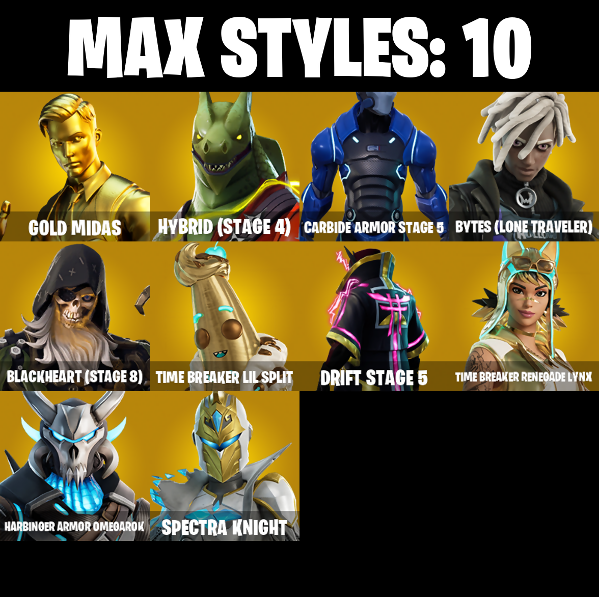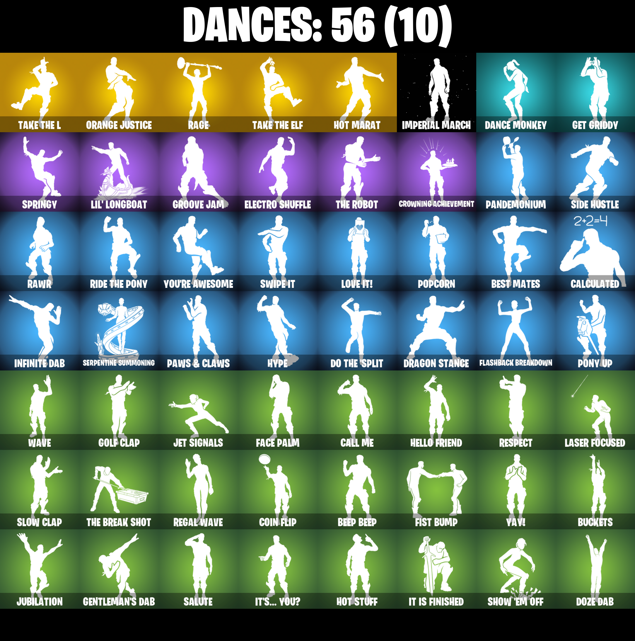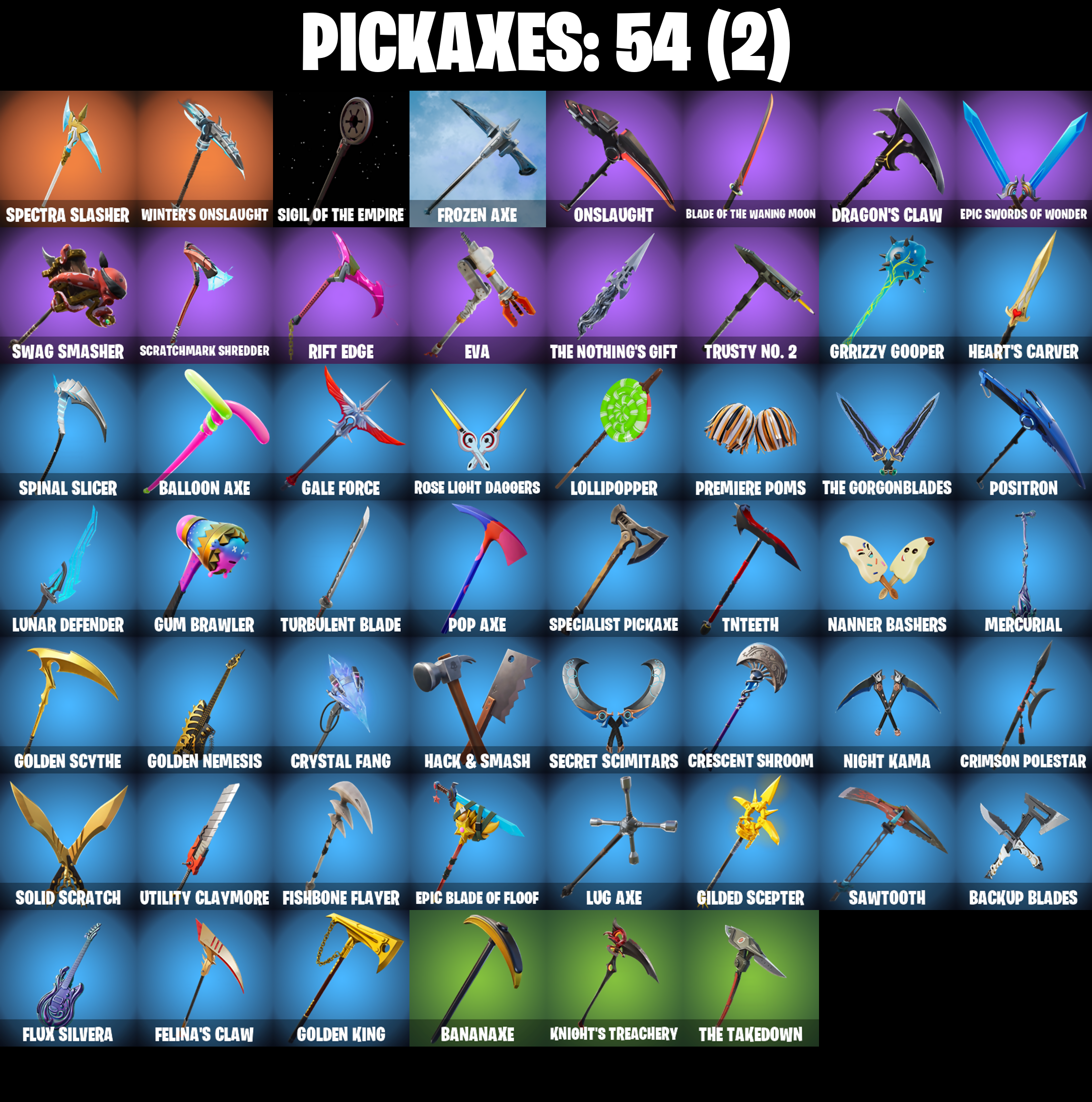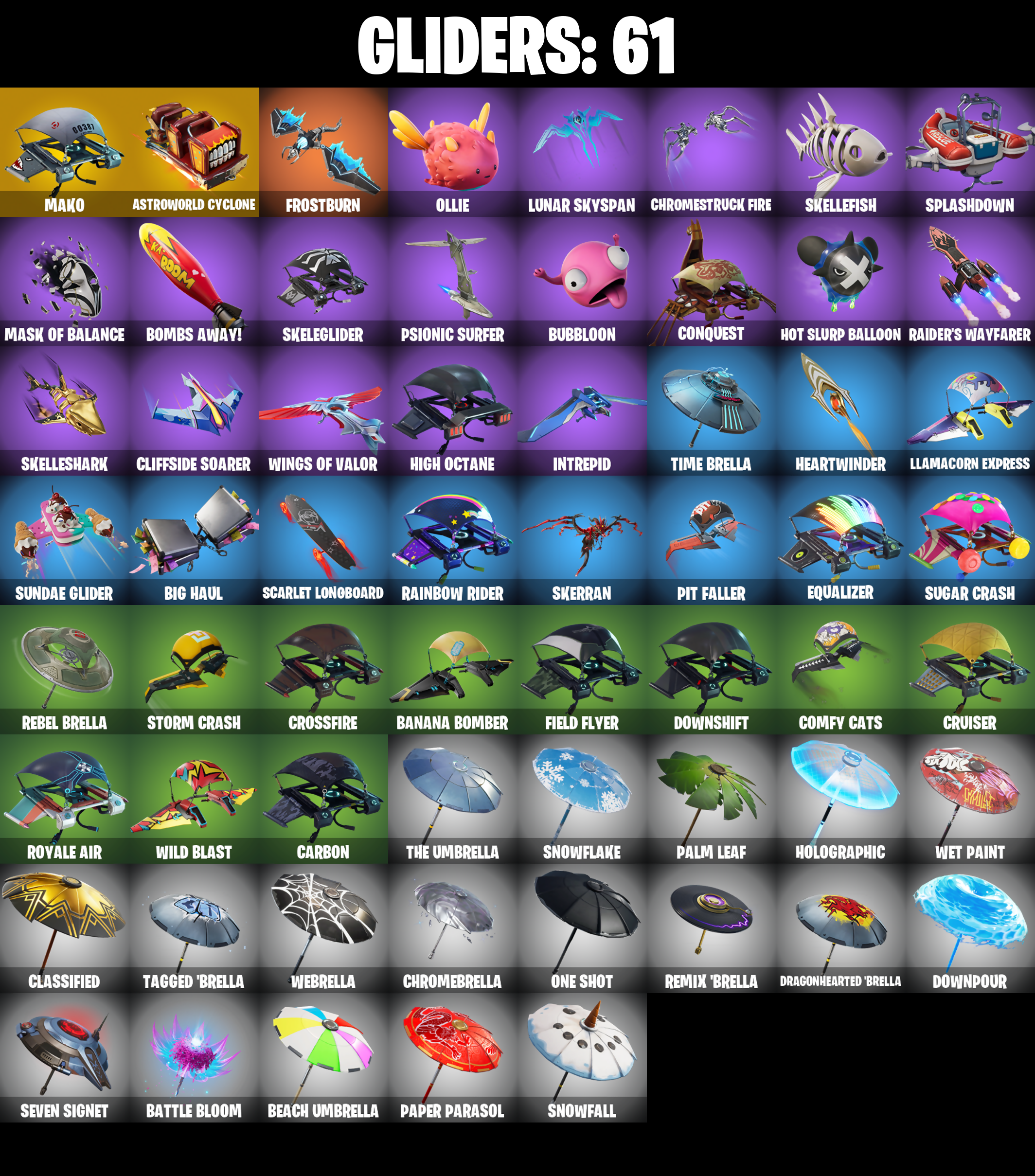 Adira's Battle Flag, Adventure Pack, Agent Peely, Ancestral Bloom, Apocalypse Shroud, Arroyo Pack, Astro, Astroworld Cyclone, Auto Clutch, Backup Blades, Balloon Axe, Banana Bomber, Banana Briefcase, Bananaxe, Bat Royale, Battle Bloom, Battlehawk, Beach Umbrella, Beep Beep, Best Mates, Big Haul, Birthday Cake, Blackheart, Blackheart (Stage 8), Blade Of The Waning Moon, Bogey Bag, Bombs Away!, Brite Bomber, Brutus, Bubloon, Buckets, Bun Bun Bang Bang, Bytes, Bytes (Lone Traveler), Calculated, Call Me, Carbide, Carbide Armor Stage 5, Carbon, Catalyst, Chaos Agent, Chromebrella, Chromestruck Fire, Classified, Clawz Retro, Cliffside Soarer, Cobra, Coin Flip, Comfy Cats, Conquest, Cozy Conch, Crescent Shroom, Crimson Polestar, Crossfire, Crowning Achievement, Cruiser, Crystal Fang, Dance Monkey, Dark Matter, Dark Voyager, Deadpool, Devastator, Do The Split, Downpour, Downshift, Doze Dab, Dragon Radar, Dragon Stance, Dragon's Claw, Dragonhearted 'Brella, Drift, Drift Stage 5, EVA, Electro Shuffle, Elite Agent, Enforcer, Epic Blade Of Floof, Epic Swords Of Wonder, Equalizer, Fabled Cape, Face Palm, Felina, Felina's Claw, Feline Fun, Field Flyer, Firewalker, Fishbone Flayer, Fishstick Janky, Fist Bump, Flashback Breakdown, Flux Silvera, Frostburn, Frozen Axe, Gale Force, Gear Specialist Maya, Gentleman's Dab, Get Griddy, Gilded Scepter, Godzilla's Exo-Spine, Gold Dagger Pack, Gold Midas, Golden King, Golden Nemesis, Golden Scythe, Golf Clap, Goodie Bag, Groove Jam, Grriz, Grrizzy Gooper, Gum Brawler, Hack & Smash, Hadean Gate, Harbinger Armor OmegaRok, Heart's Carver, Heartwinder, Hello Friend, Hench Hauler, High Octane, Holographic, Hope Star, Hot Marat, Hot Slurp Balloon, Hot Stuff, Huntress, Hybrid, Hybrid (Stage 4), Hype, Ice-Blasted Snow Crunchem, Imperial March, Infinite Dab, Intrepid, Iris, Iron Cage, It Is Finished, It's... You?, Jet Signals, Jubilation, Kabag!, Kata-Pack, Knight's Treachery, Laser Focused, Lennox Rose, Lil Split, Lil' Longboat, Liteshow, Llamacorn Express, Lollipopper, Love It!, Lug Axe, Lunar Defender, Lunar Hyperjet, Lunar Skyspan, Mako, Mask of Balance, Meow Skulls, Meowscles, Mercurial, Mission Specialist, Moonwalker, Mr. Daruma, Mutiny, Nanner Bashers, Neon Wings, Night Kama, Nog Ops, Nyanja's Catpak, Offworld Rig, Ollie, Omega, Omegarok, One Shot, Onslaught, Ooze Chamber, Orange Justice, Palm Leaf, Pandemonium, Paper Parasol, Paradigm (Reality-659), Paws & Claws, Peely Whip, Pit Faller, Pony Up, Pool Party, Pop Axe, Popcorn, Positron, Precision, Premiere Poms, Prized Llama, Psionic Surfer, Rage, Raider's Wayfarer, Rainbow Rider, Raven, Rawr, Rearguard, Rebel Brella, Rebel's Rucksack, Redline, Redmask Ranker, Regal Wave, Remix 'Brella, Renegade Lynx, Renegade Rustcat, Respect, Ride The Pony, Rift Edge, Rogue Agent, Rook, Rose Light Daggers, Roundabout, Royale Air, Runway Racer, Rust Bucket, Rust Lord, Salute, Sardeenz!, Sawtooth, Scarlet Longboard, Scratchmark Shredder, Secret Scimitars, Serpentine Summoning, Seven Signet, Shadow Shroud, Show 'Em Off, Side Hustle, Sigil Of The Empire, Skeleglider, Skellefish, Skelleshark, Skerran, Skye, Sledgehammer, Slow Clap, Snap-A-Zoomatic, Snowfall, Snowflake, Solid Scratch, Specialist Pickaxe, Spectra Knight, Spectra Protector, Spectra Slasher, Spinal Slicer, Splashdown, Springy, Squad Leader, Standard Issue, Stealing Wheel, Stinger Pack, Storm Crash, Subjugator, Sugar Crash, Sun Strider, Sundae Glider, Swag Smasher, Swipe It, Tagged 'Brella, Take The Elf, Take The L, Teknique, The Bestiary Chest, The Break Shot, The Gorgonblades, The Nothing's Gift, The Reaper, The Robot, The Takedown, The Umbrella, The Visitor, Time Breaker Lil Split, Time Breaker Renegade Lynx, Time Brella, Tnteeth, Tntina, Tomoki & Katana, Trail Tote, Tri-Ooze Tank, Trusty No. 2, Turbulent Blade, Twin Crossfire, Uplink, Utility Claymore, Valor, Wave, Webrella, Wet Paint, Wild Blast, Wingman, Wings of Valor, Winter's Onslaught, Yay!, You're Awesome, Zoey