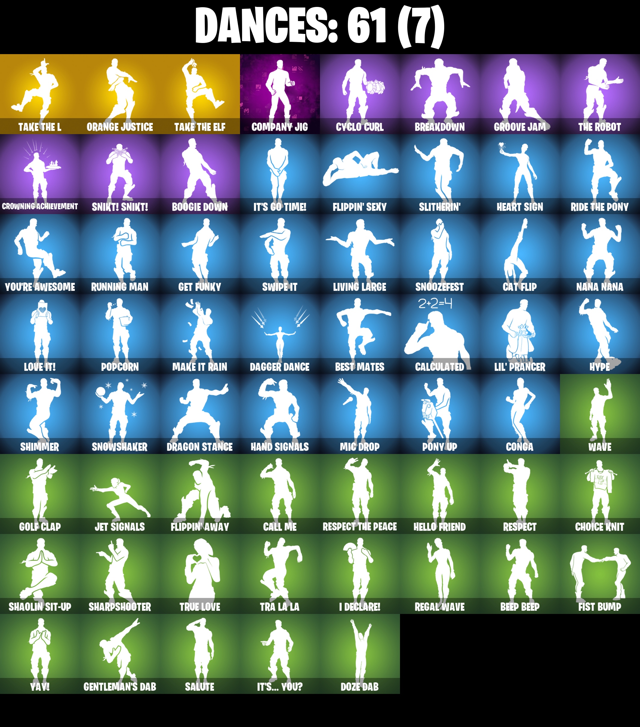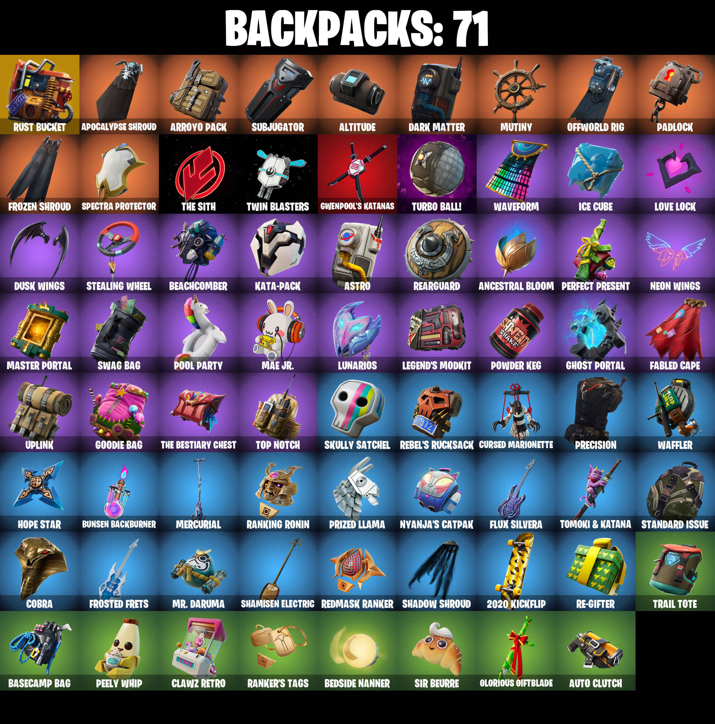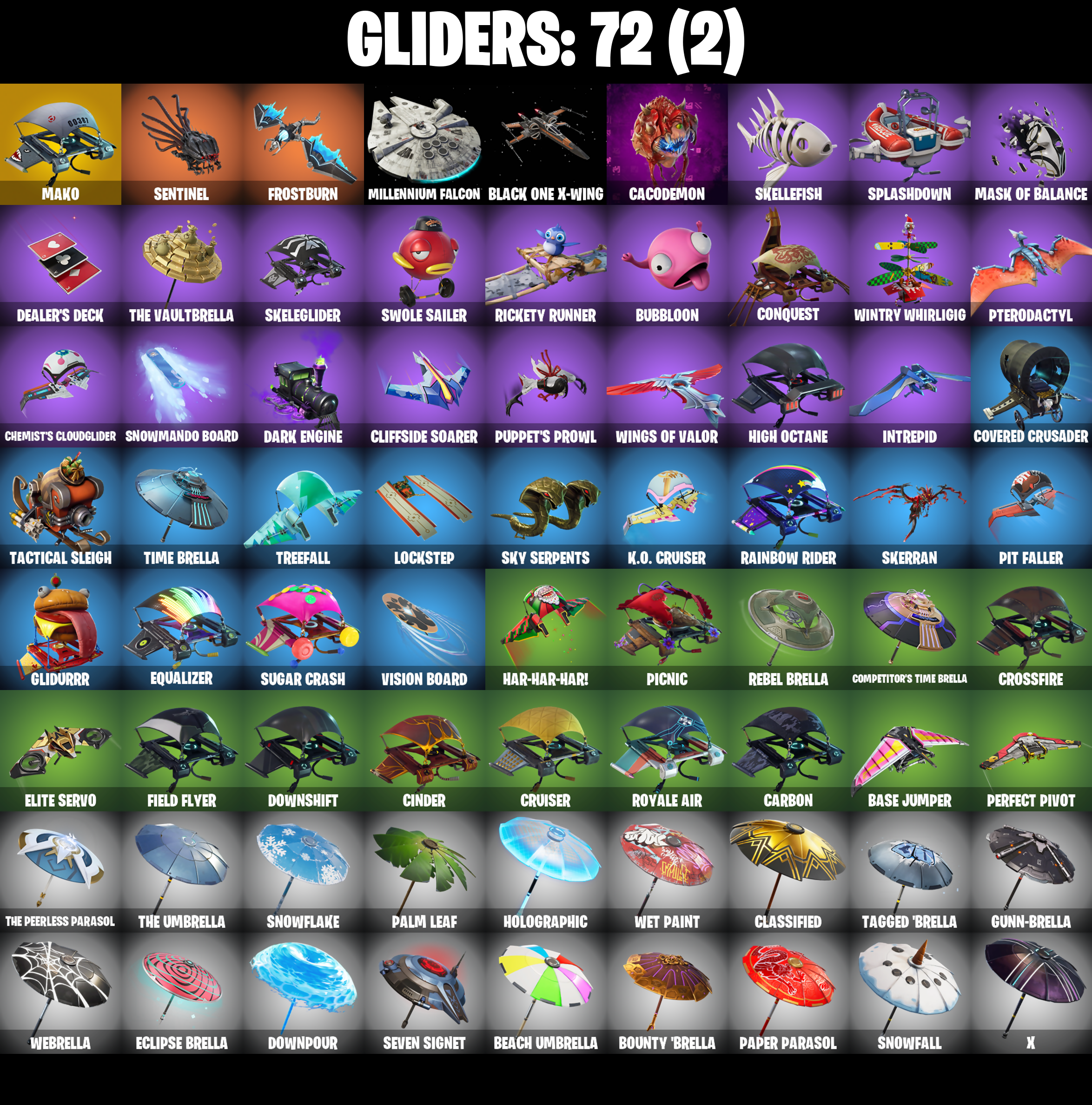 2020 Kickflip, Abominable Axe, Altitude, Ancestral Bloom, Apocalypse Shroud, Arroyo Pack, Astro, Auto Clutch, Backup Blades, Balloon Axe, Bananaxe, Base Jumper, Basecamp Bag, Battlehawk, Beach Umbrella, Beachcomber, Bedside Nanner, Beep Beep, Best Mates, Birthday Basher, Black One X-Wing, Blackheart, Blackheart (Stage 8), Blade Of The Waning Moon, Boogie Down, Boulder Breakers, Bounty ‘Brella, Breakdown, Bubbloon, Bunsen Backburner, Cacodemon, Calamity, Calamity Stage 5, Calculated, Call Me, Carbide, Carbide Armor Stage 5, Carbon, Cat Flip, Chemist's Cloudglider, Choice Knit, Cinder, Classified, Clawz Retro, Cliffside Soarer, Cobra, Company Jig, Competitor's Time Brella, Conga, Conquest, Covered Crusader, Crescent Shroom, Crossfire, Crowning Achievement, Cruiser, Cursed Marionette, Cyclo Curl, DJ Yonder, Dagger Dance, Dark Engine, Dark Matter, Dark Voyager, Dealer's Deck, Downpour, Downshift, Doze Dab, Dragon Stance, Dragon's Claw, Drift, Drift Stage 5, Dumbbell Driver, Dusk, Dusk Wings, Eclipse Brella, Electro Pairing Blades, Elite Agent, Elite Servo, Empire Axe, Enforcer, Equalizer, Eva, Fable, Fabled Cape, Field Flyer, Fist Bump, Flippin' Away, Flippin' Sexy, Flux Silvera, Frostburn, Frosted Frets, Frozen Axe, Frozen Shroud, Gale Force, Gentleman's Dab, Get Funky, Ghost Portal, Giddy-Up, Glidurrr, Glorious Giftblade, Golf Clap, Goodie Bag, Groove Jam, Guiding Glow, Gum Brawler, Gunn-Brella, Gwenpool's Katanas, Hand Signals, Har-Har-Har!, Heart Sign, Hello Friend, High Octane, Holiday Boxy, Holly Hatchets, Holographic, Hope Star, Hot Pokers, Huntress, Hybrid, Hybrid (Stage 4), Hype, I Declare!, Ice Cube, Intrepid, It's Go Time!, It's... You?, Jet Signals, Josie, K.O. Cruiser, Kata-Pack, Knight's Treachery, Krisabelle, Legend's Modkit, Legendary Blade Of Insight, Lil' Prancer, Liteshow, Living Large, Lockpick, Lockstep, Lollipopper, Love It!, Love Lock, Lt. Evergreen, Lug Axe, Lunarios, Lynx, Lynx (Stage 4 - No Ponytail), Mae Jr., Major Mancake, Make It Rain, Mako, Mask of Balance, Master Portal, Mercurial, Mic Drop, Microbot Mallet, Midnight Ops, Millennium Falcon, Mission Specialist, Moonwalker, Mr. Daruma, Mutiny, Nana Nana, Nanner Bashers, Neon Wings, Night Kama, Nyanja's Catpak, Offworld Rig, Ol' Woody, Omega, Onslaught, Orange Justice, Padlock, Palm Leaf, Paper Parasol, Peely, Peely Whip, Peppermint Pick, Perfect Pivot, Perfect Present, Permafrost, Picnic, Pit Faller, Polar Peely, Pony Up, Pool Party, Popcorn, Positron, Powder, Powder (White), Powder Keg, Precision, Premiere Poms, Prized Llama, Pterodactyl, Puppet's Prowl, Ragnarok, Rainbow Rider, Ranker's Tags, Ranking Ronin, Raonaron (No Shoulder Pad), Re-Gifter, Rearguard, Rebel Brella, Rebel's Rucksack, Reckoning, Redline, Redmask Ranker, Regal Wave, Respect, Respect The Peace, Rickety Runner, Ride The Pony, Rift Edge, Rook, Royale Air, Running Man, Runway Racer, Rust Bucket, Rust Lord, Salute, Sawtooth, Scorcher, Scratchmark, Secret Scimitars, Sentinel, Seven Signet, Sgt. Winter, Sgt. Winter Headgear, Shadow Shroud, Shamisen Electric, Shaolin Sit-Up, Sharpshooter, Shimmer, Shooting Starstaff, Shortbread Slicers, Sidewinder, Sir Beurre, Skeleglider, Skellefish, Skerran, Skull Trooper, Skully, Skully (Heart), Skully Satchel, Sky Serpents, Sled Ready Guff, Sledgecracker, Sledgehammer, Slitherin', Smash Up, Snakebite, Snikt! Snikt!, Snoozefest, Snowfall, Snowflake, Snowmando Board, Snowplower, Snowshaker, Sparkling Star, Spectra Protector, Spellwork Scimitar, Spinal Slicer, Splashdown, Squad Leader, Standard Issue, Stealing Wheel, Subjugator, Sugar Crash, Summit Striker, Sun Strider, Swag Bag, Swag Smasher, Sweet Clementine, Swipe It, Swole Sailer, Tactical Sleigh, Tagged ‘Brella, Take The Elf, Take The L, Teknique, The Ace, The Bestiary Chest, The Destroyer's Destroyer, The Imagined Blade, The Peerless Parasol, The Prisoner, The Reaper, The Robot, The Sith, The Takedown, The Umbrella, The Vaultbrella, The Visitor, Time Brella, Tomoki & Katana, Top Notch, Tra La La, Trail Tote, Treefall, Trog, Trog (Tribal), True Love, Trusty No. 2, Turbo Ball!, Turbulent Blade, Twin Blasters, Uplink, Valor, Vision Board, Waffler, Wave, Waveform, Webrella, Wet Paint, Whiplash, Wings of Valor, Winterfest Bushranger, Wintry Whirligig, Wooly Warrior, X, Yay!, You're Awesome, Zenith, Zenith (Stage 4), Zoey