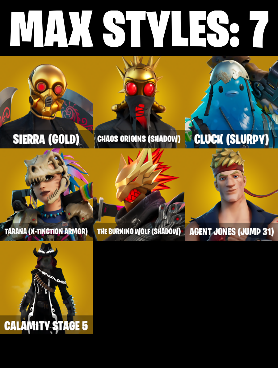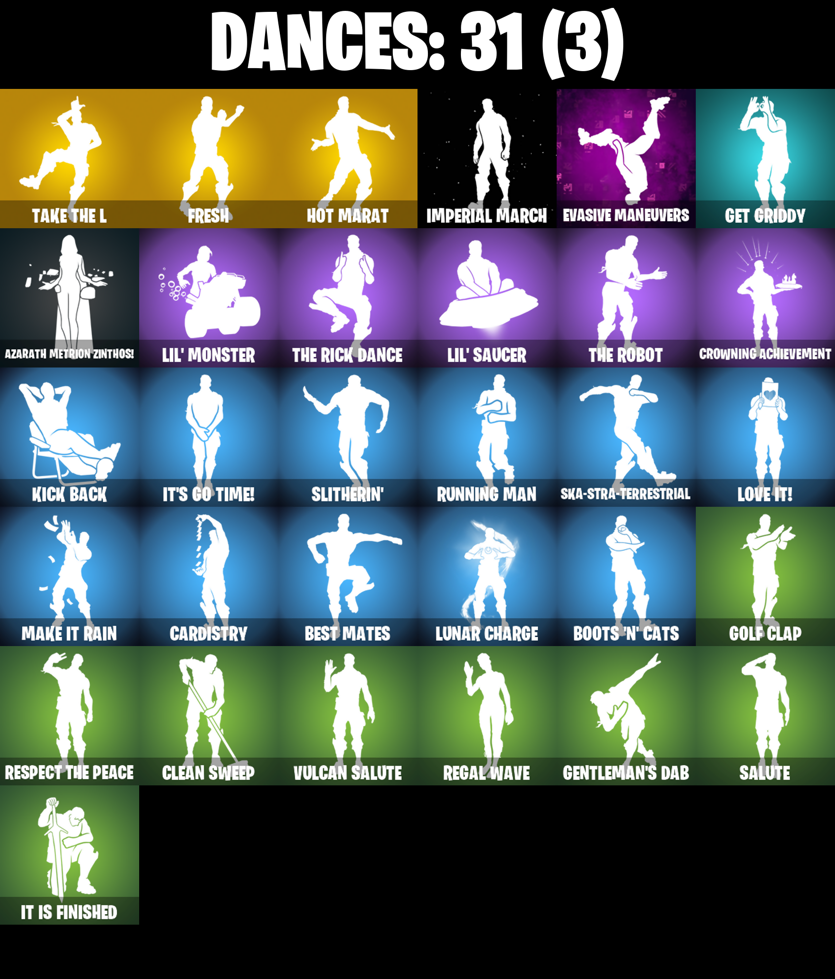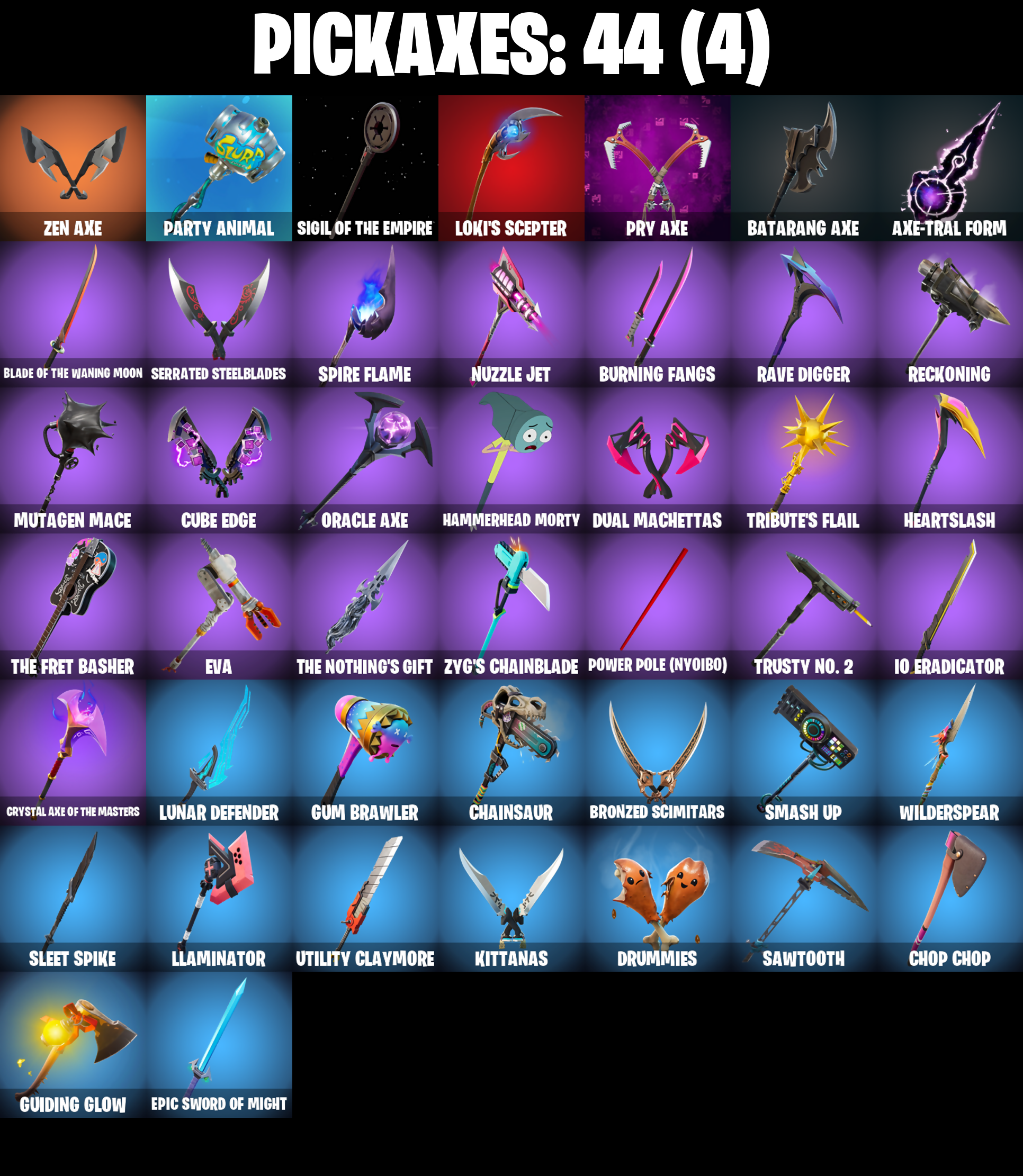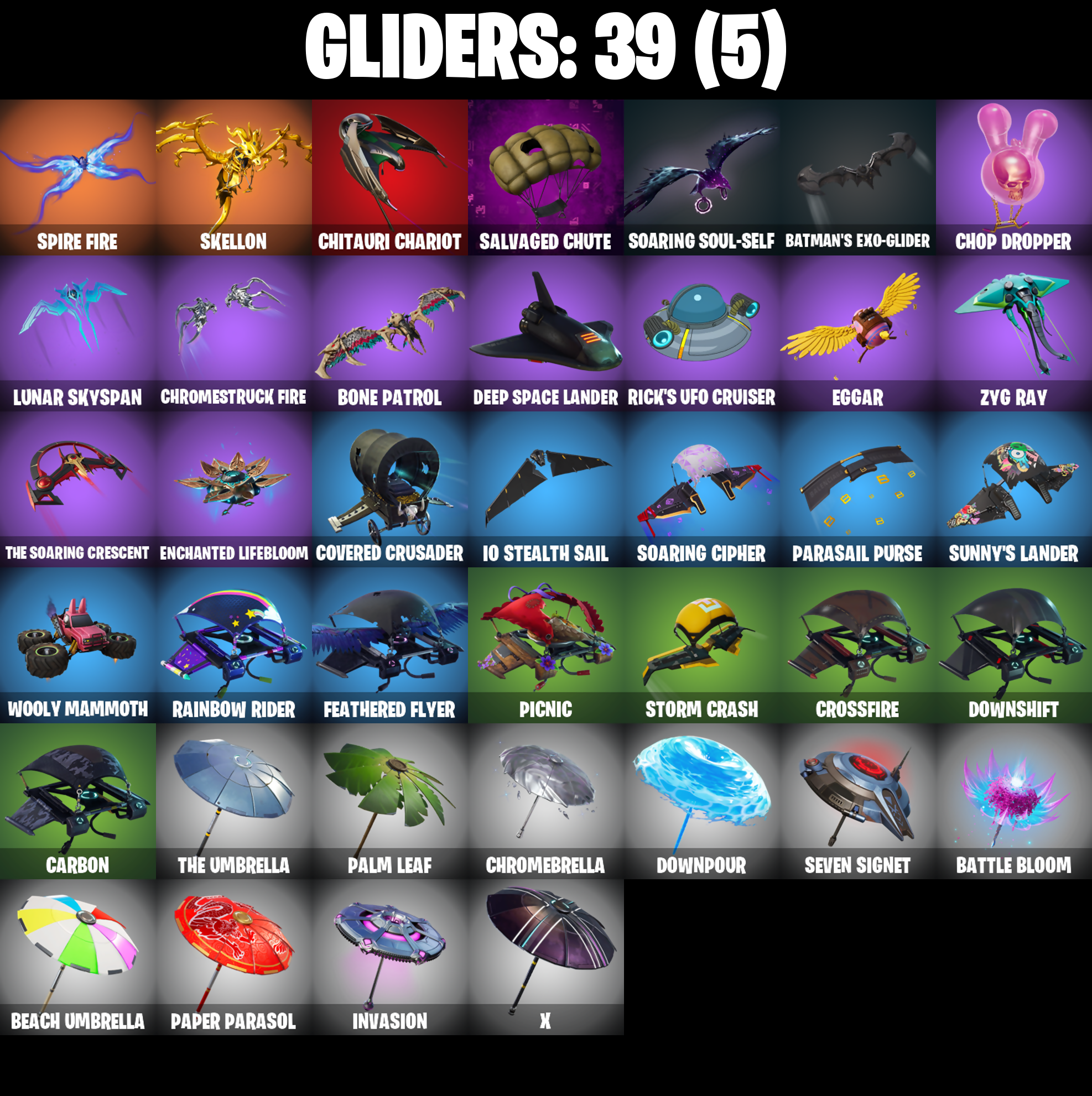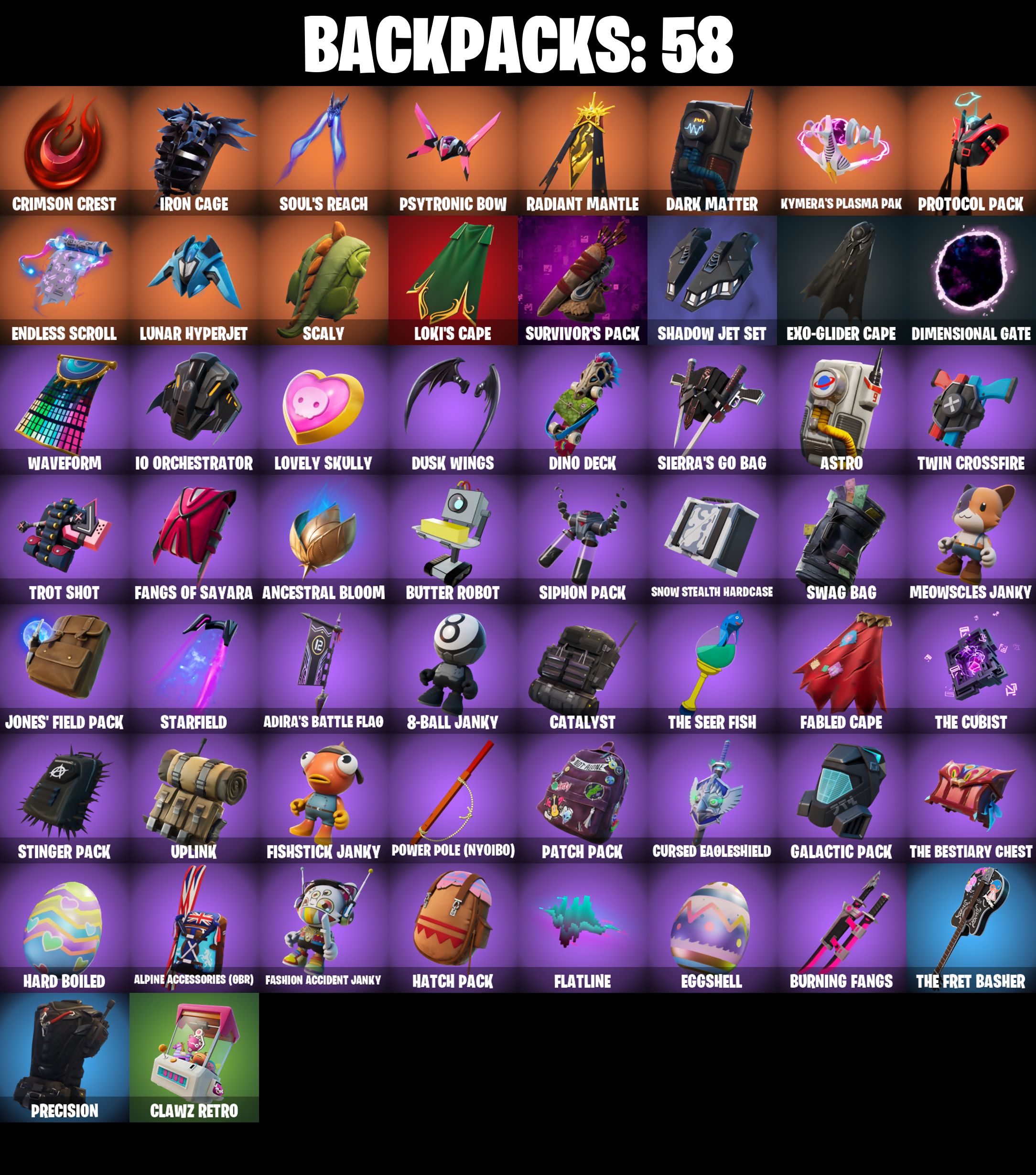 8-Ball Janky, Adira's Battle Flag, Aftermath, Agent Jones, Agent Jones (Jump 31), Alpine Accessories (QBR), Alpine Ace (GBR), Ancestral Bloom, Armored Batman Zero, Astro, Axe-tral Form, Azarath Metrion Zinthos!, Batarang Axe, Batman's Exo-Glider, Battle Bloom, Beach Umbrella, Beerus, Best Mates, Blade of the Waning Moon, Bone Patrol, Boots 'N' Cats, Bronzed Scimitars, Bunny Brawler, Burning Fangs, Butter Robot, Bytes, Calamity, Calamity Stage 5, Carbon, Cardistry, Catalyst, Chainsaur, Chaos Origins, Chaos Origins (Shadow), Chitauri Chariot, Chop Chop, Chop Dropper, Chromebrella, Chromestruck Fire, Clawz Retro, Clean Sweep, Cluck, Cluck (Slurpy), Covered Crusader, Crimson Crest, Crossfire, Crowning Achievement, Crystal Axe of the Masters, Cube Assassin, Cube Edge, Cursed Eagleshield, DJ Yonder, Dark Matter, Dark Voyager, Deep Space Lander, Dimensional Gate, Dino Deck, Doctor Slone, Downpour, Downshift, Drummies, Dual Machettas, Dusk, Dusk Wings, Eggar, Eggshell, Elite Agent, Enchanted Lifebloom, Endless Scroll, Epic Sword of Might, Eva, Evasive Maneuvers, Exo-Glider Cape, Fable, Fabled Cape, Fangs Of Sayara, Fashion Accident Janky, Feathered Flyer, Fishstick Janky, Flatline, Fresh, Galactic Pack, Gentleman's Dab, Get Griddy, Giddy-Up, Golf Clap, Guggimon, Guiding Glow, Gum Brawler, Hammerhead Morty, Hard Boiled, Hatch Pack, Haven, Heartslash, Hot Marat, IO Orchestrator, IO Stealth Sail, Imperial March, Infinity, Invasion, Io Eradicator, Iron Cage, It Is Finished, It's Go Time!, Joey, Jones' Field Pack, Kick Back, Kittanas, Kymera, Kymera's Plasma Pak, Lara Croft, Lil' Monster, Lil' Saucer, Llaminator, Loki Laufeyson, Loki's Cape, Loki's Scepter, Love It!, Lovely Skully, Lt. John Llama, Lunar Charge, Lunar Defender, Lunar Hyperjet, Lunar Skyspan, Make It Rain, Mecha Cuddle Master, Mecha Team Shadow, Meowscles Janky, Mission Specialist, Moonwalker, Mutagen Mace, Nuzzle Jet, Oracle Axe, Oro, Palm Leaf, Paper Parasol, Paradigm (Reality-659), Parasail Purse, Party Animal, Patch Pack, Picnic, Power Pole (Nyoibo), Precision, Protocol Pack, Pry Axe, Psytronic Bow, Rabbit Raider, Radiant Mantle, Rainbow Rider, Rave Digger, Raven, Raz, Rebirth Raven, Reckoning, Regal Wave, Respect The Peace, Rex, Rick Sanchez, Rick's UFO Cruiser, Rogue Agent, Ronin, Running Man, Rust Lord, Salute, Salvaged Chute, Sawtooth, Sayara, Scaly, Serrated Steelblades, Seven Signet, Shadow Jet Set, Shanta, Sierra, Sierra (Gold), Sierra's Go Bag, Sigil of the Empire, Siphon Pack, Ska-Stra-Terrestrial, Skellon, Sleet Spike, Slitherin', Smash Up, Snow Stealth Hardcase, Snow Stealth Slone, Soaring Cipher, Soaring Soul-Self, Son Goku, Soul's Reach, Spire Assassin, Spire Fire, Spire Flame, Starfield, Stinger Pack, Storm Crash, Summer Skye, Sunny, Sunny's Lander, Survivor's Pack, Swag Bag, Take The L, Tarana, Tarana (X-tion Armor), The Ace, The Bestiary Chest, The Burning Wolf, The Burning Wolf (Shadow), The Cubist, The Fret Basher, The Nothing's Gift, The Reaper, The Rick Dance, The Robot, The Seer Fish, The Soaring Crescent, The Umbrella, Tracy Trouble, Tribute's Flail, Trot Shot, Trusty No. 2, Twin Crossfire, Uplink, Utility Claymore, Vulcan Salute, Waveform, Wilderspear, Wooly Mammoth, X, Zen Axe, Zyg, Zyg Ray, Zyg's Chainblade