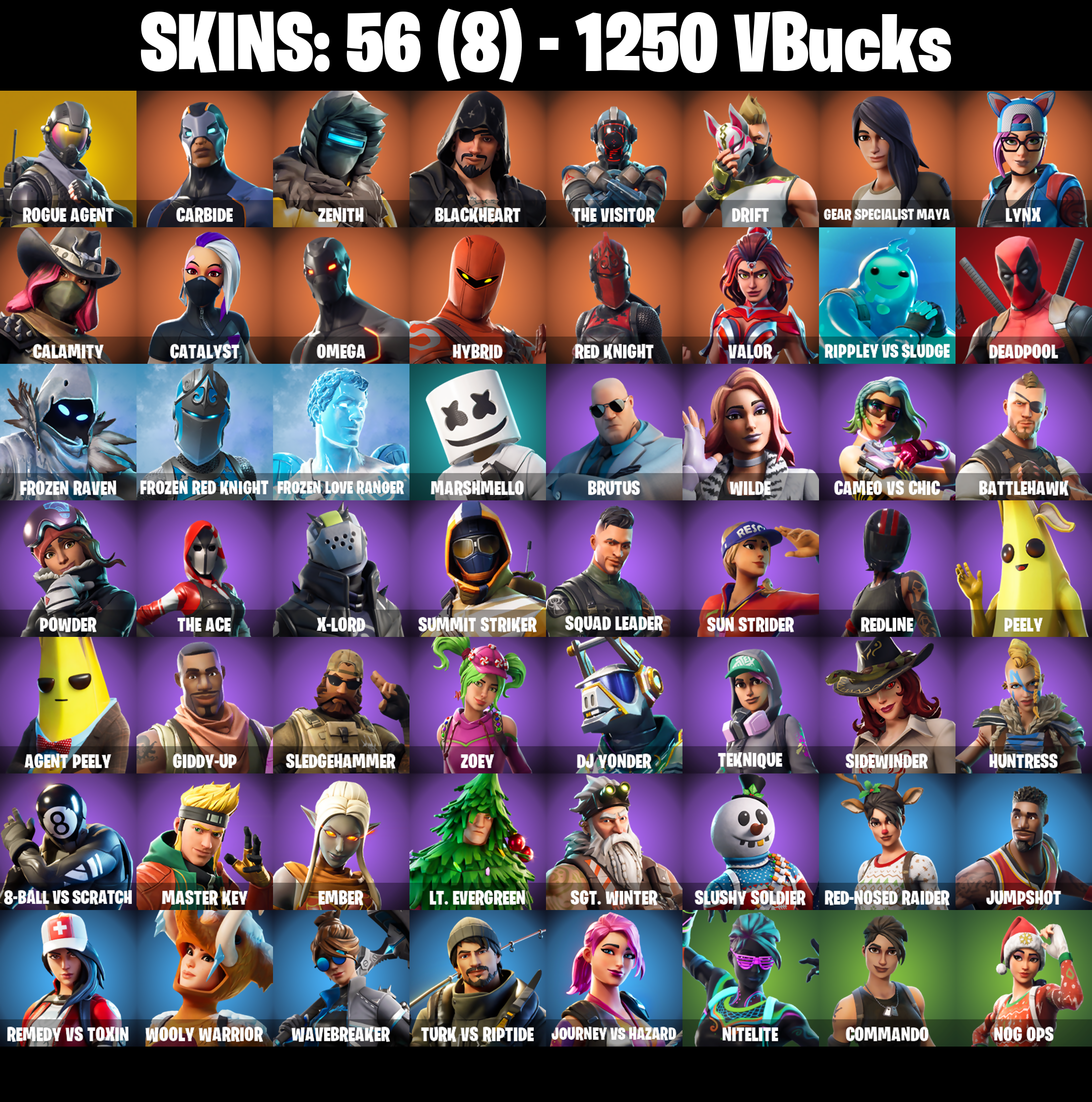 PC/PSN/XBOX |56 skins | Merry Mint Axe | Deadpool | Omega | Orange Justice | Rogue Agent | Drift | Carbide | Peely | Lynx | Valor | Teknique | #B926
