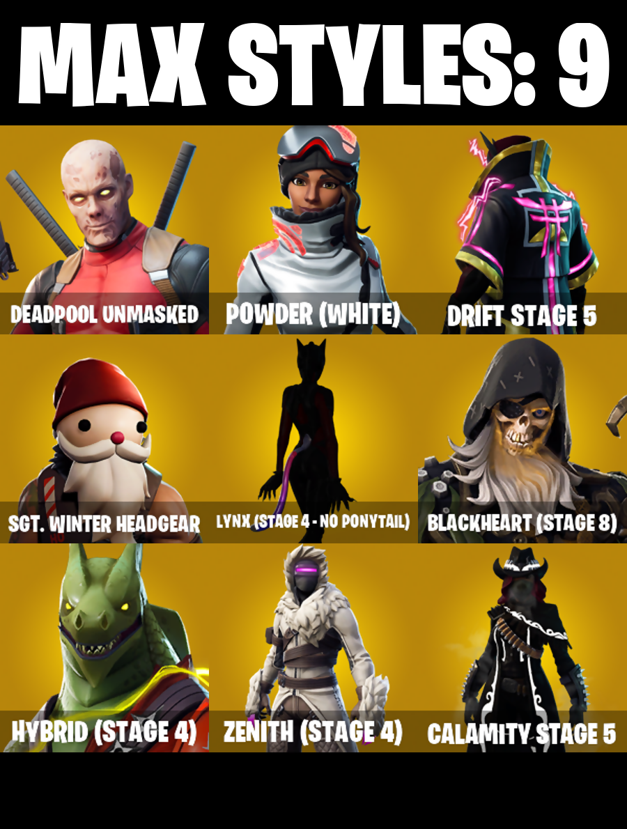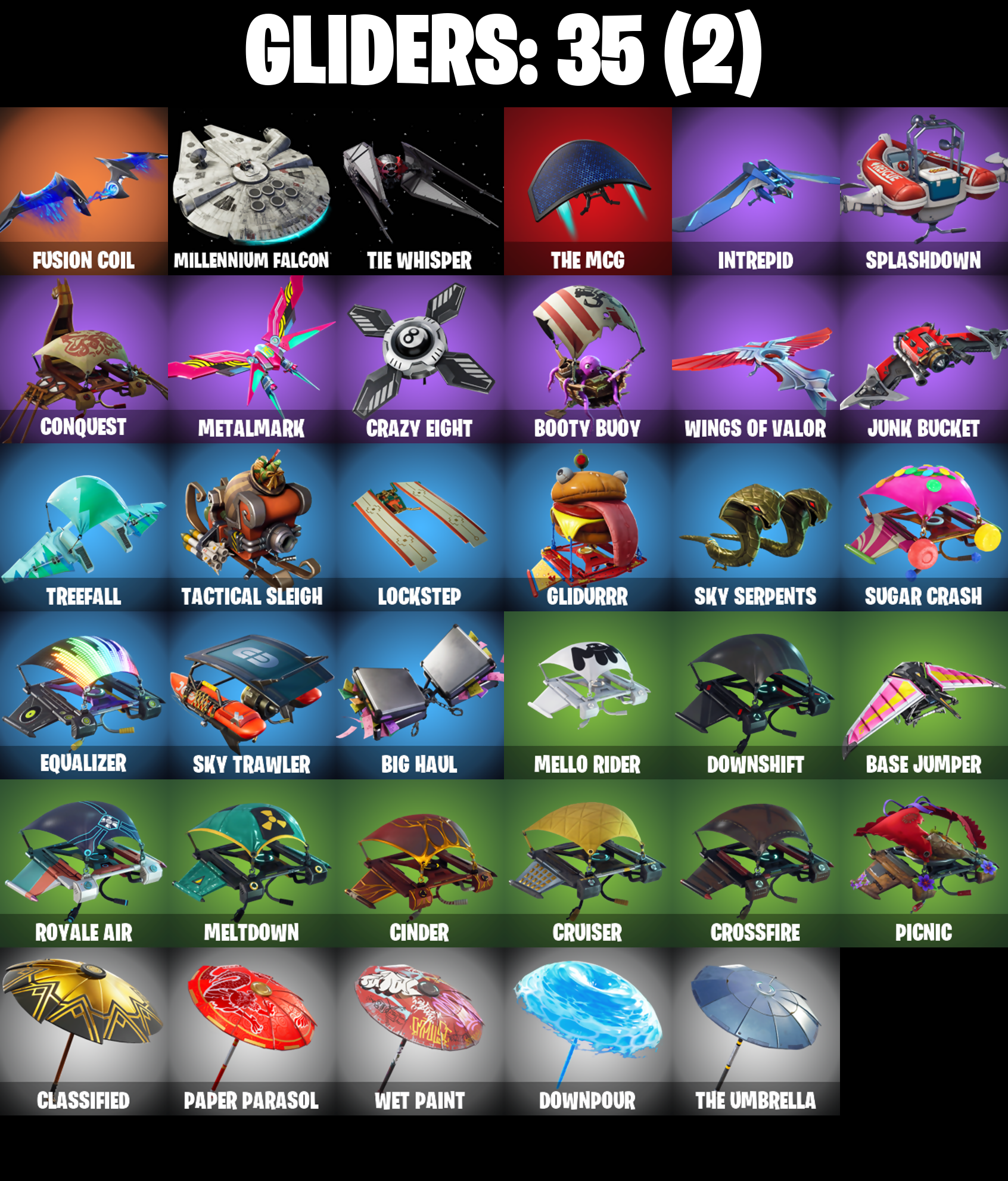 2020 Kickflip, 8-Ball vs Scratch, Abominable Axe, Agent Peely, Altitude, Angler Axes, Antidote, Back Board, Ball Bling, Balloon Axe, Banana Briefcase, Bank Shots, Base Jumper, Basecamp Bag, Basic Basher, Battlehawk, Beachcomber, Big Haul, Blackheart, Blackheart (Stage 8), Blade Bag, Boing!, Booty Buoy, Boulder Breakers, Brutus, Buckets, Calamity, Calamity Stage 5, Calculated, Call Me, Cameo vs Chic, Carbide, Cat Flip, Catalyst, Cinder, Classified, Clawz Retro, Click!, Cobra, Commando, Conga, Conquest, Crazy Eight, Crossfire, Cruiser, DJ Yonder, Dark Side, Deadpool, Deadpool Unmasked, Downpour, Downshift, Dragon Stance, Dragon's Claw, Drift, Drift Stage 5, Droop, Dry Bag, Ember, Equalizer, Fabled Cape, Flippin' Away, Flippin' Sexy, Frozen Iron Cage, Frozen Love Ranger, Frozen Love Wings, Frozen Raven, Frozen Red Knight, Frozen Red Shield, Fusion Coil, Fusion Orb, Gale Force, Gear Specialist Maya, Gentleman's Dab, Giddy-Up, Glidurrr, Golf Clap, Goodie Bag, Groove Jam, Hack & Smash, Hello Friend, Hench Hauler, High Five, Highlight Strikers, Hula Hoopin', Huntress, Hybrid, Hybrid (Stage 4), Hype, Icicle, Intrepid, Job Well Done, Journey vs Hazard, Jubilation, Jumpshot, Junk Bucket, Keep It Mello, Lock It Up, Lockpick, Lockstep, Lollipopper, Lt. Evergreen, Lug Axe, Lynx, Lynx (Stage 4 - No Ponytail), Marsh Walk, Marshmello, Master Key, Master Portal, Medaxe, Mello Rider, Meltdown, Merry Mint Axe, Metalmark, Mic Drop, Millennium Falcon, Mutiny, Nana Nana, Nitelite, Nog Ops, Offworld Rig, Ol' Woody, Omega, Onslaught, Orange Justice, Palette Pack, Paper Parasol, Peely, Peppermint Pick, Perfect Present, Picnic, Pool Party, Popcorn, Positron, Powder, Powder (White), Precision, Prickly Pose, Re-Gifter, Rearguard, Reckoning, Red Knight, Red Shield, Red-Nosed Raider, Redline, Regal Wave, Remedy vs Toxin, Respect, Respect The Peace, Rift Edge, Rippley vs Sludge, Rogue Agent, Royale Air, Rust Bucket, Salute, Scorcher, Scratchmark, Sgt. Winter, Sgt. Winter Headgear, Shaolin Sip, Sharpshooter, Shimmer, Shortbread Slicers, Sidewinder, Sing Along, Sky Serpents, Sky Trawler, Sledgehammer, Slodgehammer, Slow Clap, Slushy Jr., Slushy Soldier, Smash Up, Snakebite, Snoozefest, Snowshaker, Snowy, Splashdown, Squad Leader, Standard Issue, Sugar Crash, Summit Striker, Sun Sprout, Sun Strider, Swag Bag, Swag Smasher, Swell Striker, Swipe It, Tackle Box, Tactical Sleigh, Take The Elf, Teknique, The Ace, The Mcg, The Sith, The Umbrella, The Visitor, Tie Whisper, Top Notch, Trail Tote, Treefall, Turk vs Riptide, Twist, Uplink, Valor, Wavebreaker, Wavy T, Wet Paint, Wiggle, Wilde, Wings Of Valor, Wooly Warrior, X-Lord, You're Awesome, Zany, Zenith, Zenith (Stage 4), Zoey