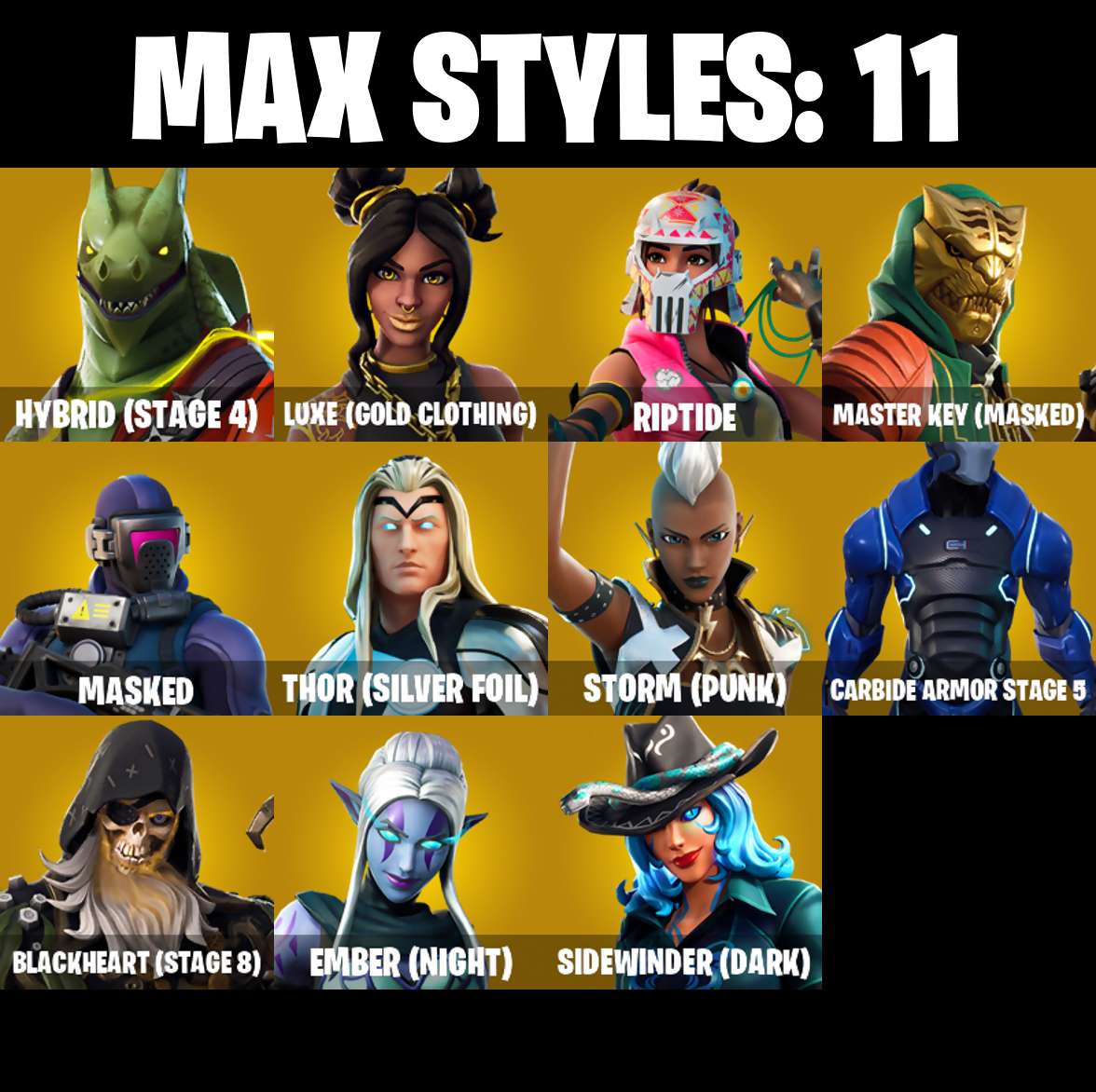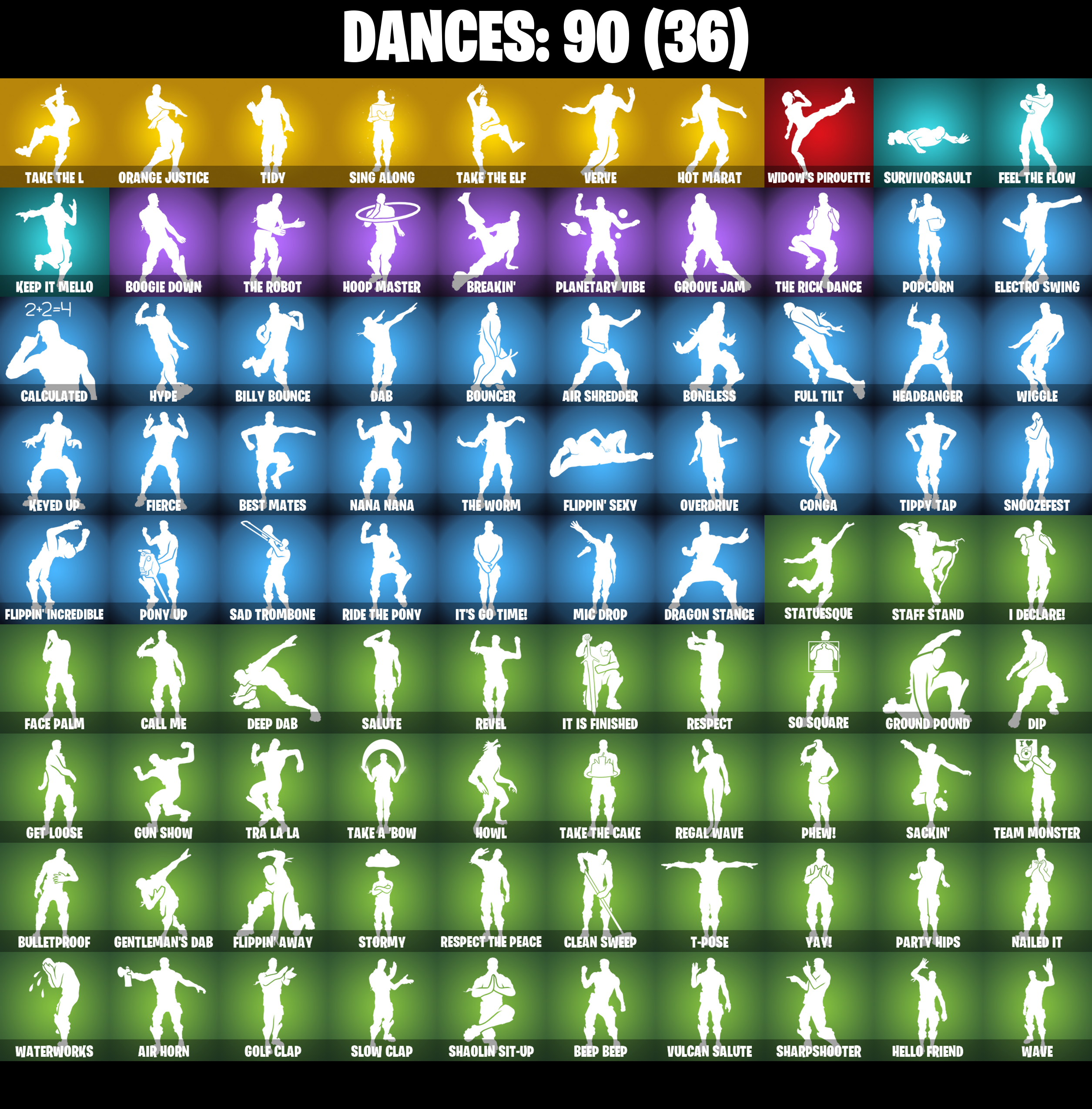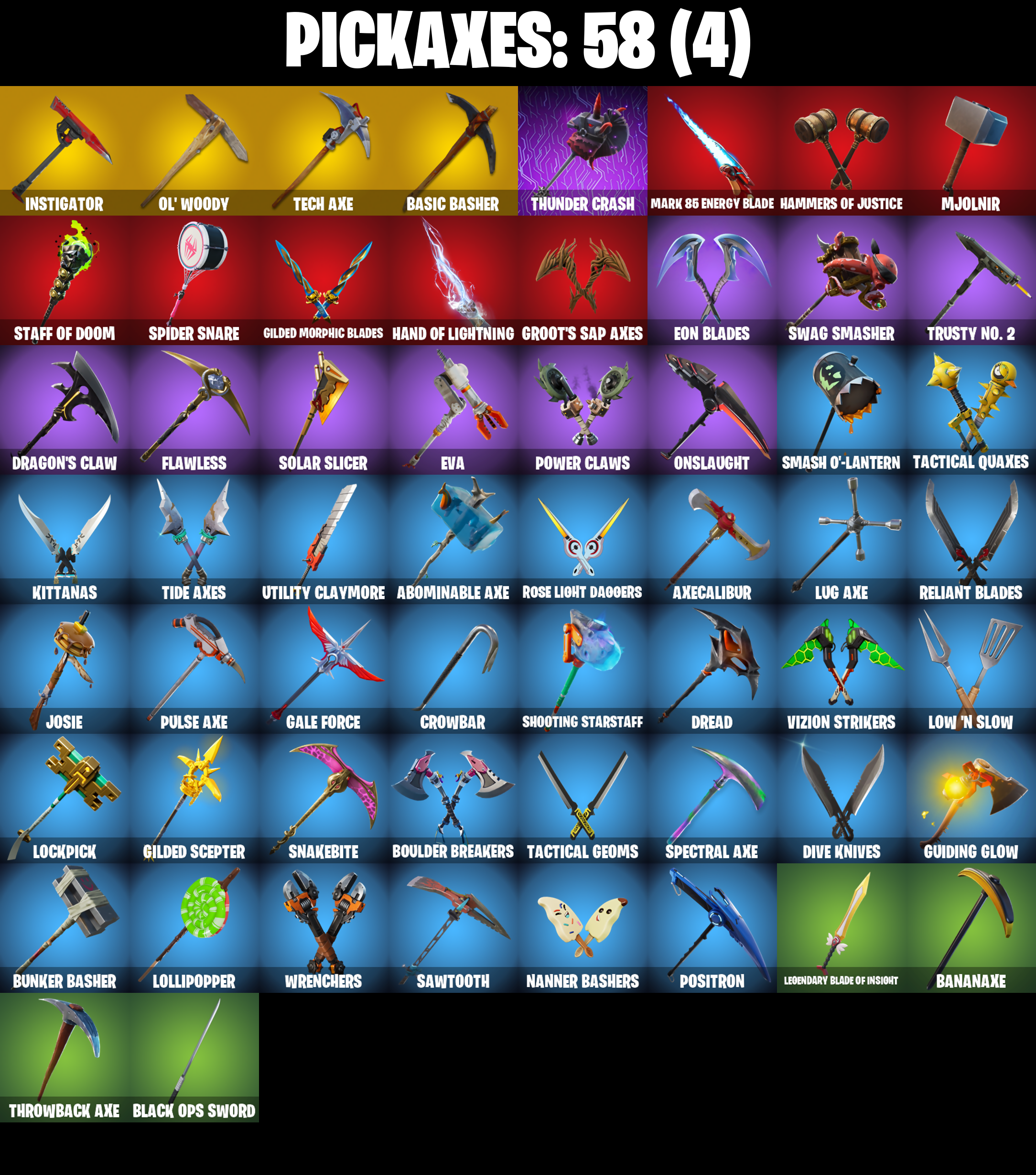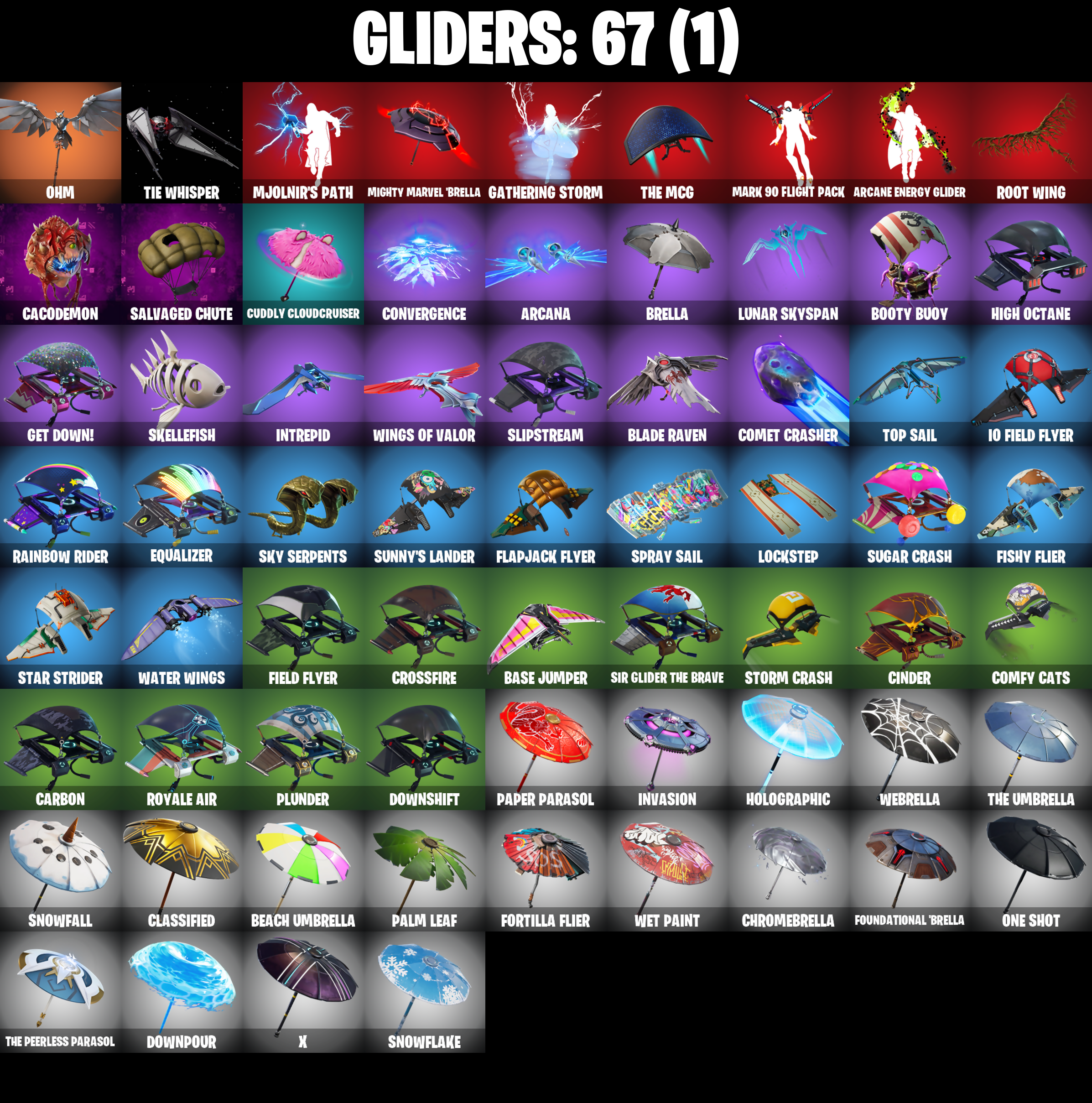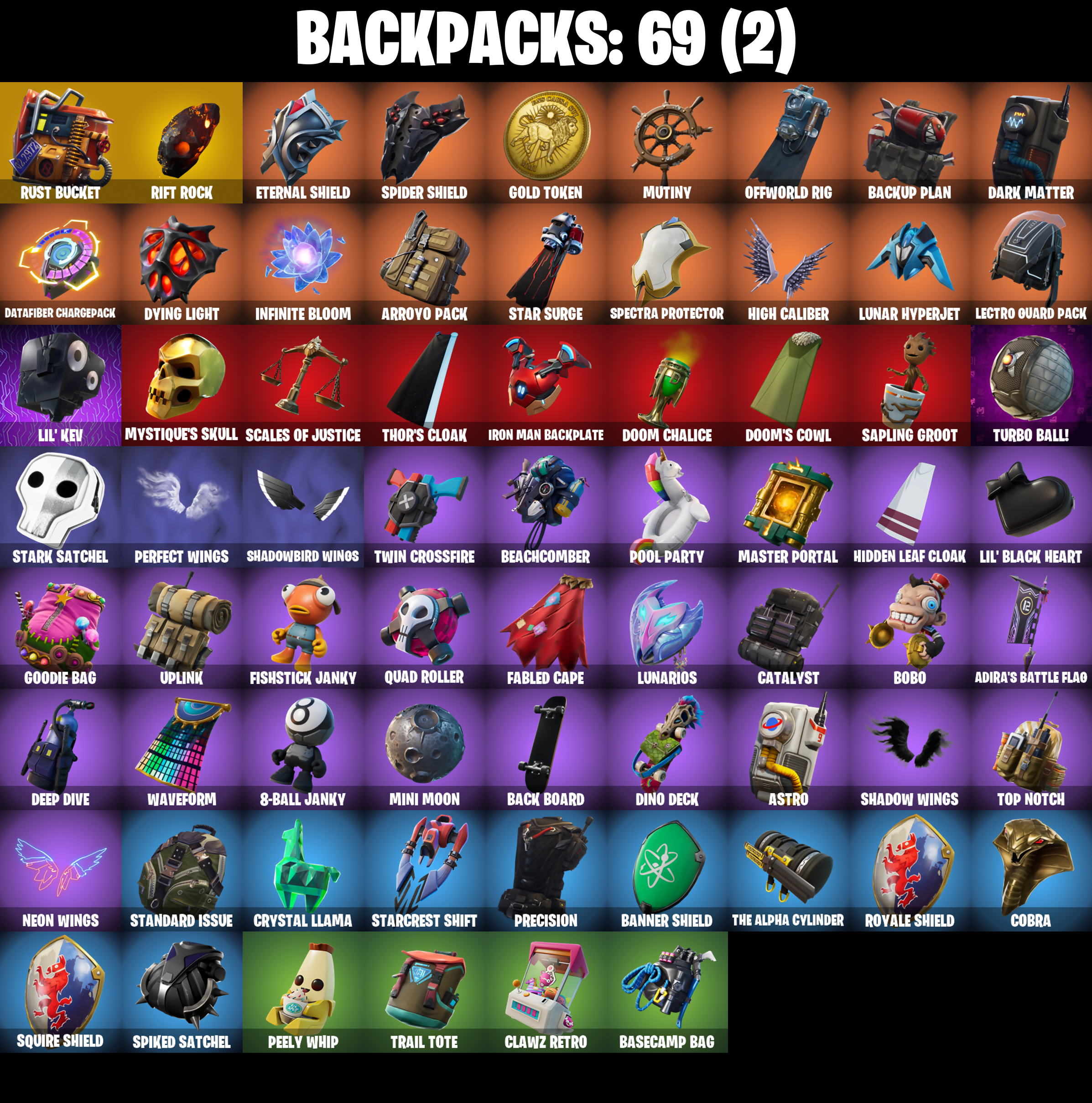 8-Ball Janky, Abominable Axe, Adira's Battle Flag, Air Horn, Air Shredder, Arcana, Arcane Energy Glider, Arroyo Pack, Astro, Axecalibur, Back Board, Backup Plan, Bananaxe, Banner Shield, Base Jumper, Basecamp Bag, Basic Basher, Battlehawk, Beach Umbrella, Beachcomber, Beep Beep, Best Mates, Billy Bounce, Black Ops Sword, Blackheart, Blackheart (Stage 8), Blade Raven, Blue Squire, Bobo, Boneless, Boogie Down, Booty Buoy, Boulder Breakers, Bouncer, Breakin', Brella, Bulletproof, Bullseye, Bunker Basher, Cacodemon, Calculated, Call Me, Carbide, Carbide Armor Stage 5, Carbon, Catalyst, Chromebrella, Cinder, Classified, Clawz Retro, Clean Sweep, Cloaked Shadow, Cobra, Comet Crasher, Comfy Cats, Conga, Convergence, Crossfire, Crowbar, Crystal Llama, Cuddly Cloudcruiser, Dab, Dark Matter, Dark Voyager, Datafiber Chargepack, Deep Dab, Deep Dive, Derby Dynamo, Dino Deck, Dip, Dive Knives, Doctor Doom, Doom Chalice, Doom's Cowl, Downpour, Downshift, Dragon Stance, Dragon's Claw, Dread, Dying Light, Electro Swing, Elite Agent, Ember, Ember (Night), Eon Blades, Equalizer, Eternal Knight, Eternal Shield, Eva, Fabled Cape, Face Palm, Fade, Feel The Flow, Field Flyer, Fierce, Fishstick Janky, Fishy Flier, Flapjack Flyer, Flawless, Flippin' Away, Flippin' Incredible, Flippin' Sexy, Fortilla Flier, Foundational 'Brella, Full Tilt, Gale Force, Gathering Storm, Gentleman's Dab, Get Down!, Get Loose, Gilded Morphic Blades, Gilded Scepter, Gold Token, Golf Clap, Goodie Bag, Groot, Groot's Sap Axes, Groove Jam, Ground Pound, Guiding Glow, Gun Show, Hammers of Justice, Hand of Lightning, Havoc, Headbanger, Hello Friend, Hidden Leaf Cloak, High Caliber, High Octane, Holographic, Hoop Master, Hot Marat, Howl, Hybrid, Hybrid (Stage 4), Hype, I Declare!, Infinite Bloom, Instigator, Intrepid, Invasion, Io Field Flyer, Iron Man Backplate, It Is Finished, It's Go Time!, Jennifer Walters, Josie, Jules, Keep It Mello, Keyed Up, Kit, Kittanas, Lectro Guard Pack, Legendary Blade of Insight, Lil' Black Heart, Lil' Kev, Liteshow, Lockpick, Lockstep, Lollipopper, Low 'N Slow, Lug Axe, Lunar Hyperjet, Lunar Skyspan, Lunarios, Luxe, Luxe (Gold Clothing), Mark 86 Energy Blade, Mark 90 Flight Pack, Masked, Master Key, Master Key (Masked), Master Portal, Mic Drop, Mighty Marvel 'Brella, Min-Joon, Mini Moon, Mission Specialist, Mjolnir, Mjolnir's Path, Moonwalker, Mutiny, Mystique, Mystique's Skull, Nailed It, Nana Nana, Nanner Bashers, Neon Wings, Ocean, Offworld Rig, Ohm, Ol' Woody, Omega, One Shot, Onslaught, Orange Justice, Overdrive, Palm Leaf, Paper Parasol, Par Patroller, Party Hips, Peely, Peely Whip, Perfect Shadow, Perfect Wings, Phew!, Planetary Vibe, Plastic Patroller, Plunder, Pony Up, Pool Party, Popcorn, Positron, Power Claws, Precision, Pulse Axe, Quad Roller, Rainbow Rider, Regal Wave, Reliant Blades, Respect, Respect The Peace, Revel, Ride The Pony, Rift Rock, Riptide, Rogue Agent, Root Wing, Rose Light Daggers, Royale Air, Royale Knight, Royale Shield, Ruin, Rust Bucket, Rust Lord, Sackin', Sad Trombone, Sakura Haruno, Salute, Salvaged Chute, Sapling Groot, Sawtooth, Scales Of Justice, Scuba Jonesy, Shadow Skully, Shadow Wings, Shadowbird, Shadowbird Wings, Shaolin Sit-Up, Sharpshooter, Shooting Starstaff, Sidewinder, Sidewinder (Dark), Sing Along, Siona, Sir Glider The Brave, Skellefish, Sky Serpents, Slipstream, Slow Clap, Smash O'-Lantern, Snakebite, Snoozefest, Snowfall, Snowflake, So Square, Solar Slicer, Spectra Protector, Spectral Axe, Spider Knight, Spider Shield, Spider Snare, Spiked Satchel, Spray Sail, Squad Leader, Squire Shield, Staff Stand, Staff of Doom, Standard Issue, Star Strider, Star Surge, Starcrest Shift, Stark Satchel, Statuesque, Storm, Storm (Punk), Storm Crash, Stormy, Sub Commander, Sugar Crash, Summit Striker, Sunny's Lander, Survivor Salt, Swag Smasher, T-Pose, Tactical Geoms, Tactical Quaxes, Take A 'Bow, Take The Cake, Take The Elf, Take The L, Team Monster, Tech Axe, Teknique, The Alpha Cylinder, The Mcg, The Peerless Parasol, The Reaper, The Rick Dance, The Robot, The Scientist, The Umbrella, The Visitor, The Worm, Thor, Thor (Silver Foil), Thor's Cloak, Throwback Axe, Thunder Crash, Tide Axes, Tidy, Tie Whisper, Tippy Tap, Tony Stark, Top Notch, Top Sail, Tra La La, Trail Tote, Trusty No. 2, Turbo Ball!, Twin Crossfire, Uplink, Utility Claymore, Valor, Verge, Verve, Vizion Strikers, Vulcan Salute, Water Wings, Waterworks, Wave, Waveform, Webrella, Wet Paint, Widow's Pirouette, Wiggle, Wings Of Valor, Wolverine, Wrenchers, X, Yay!, Zoey