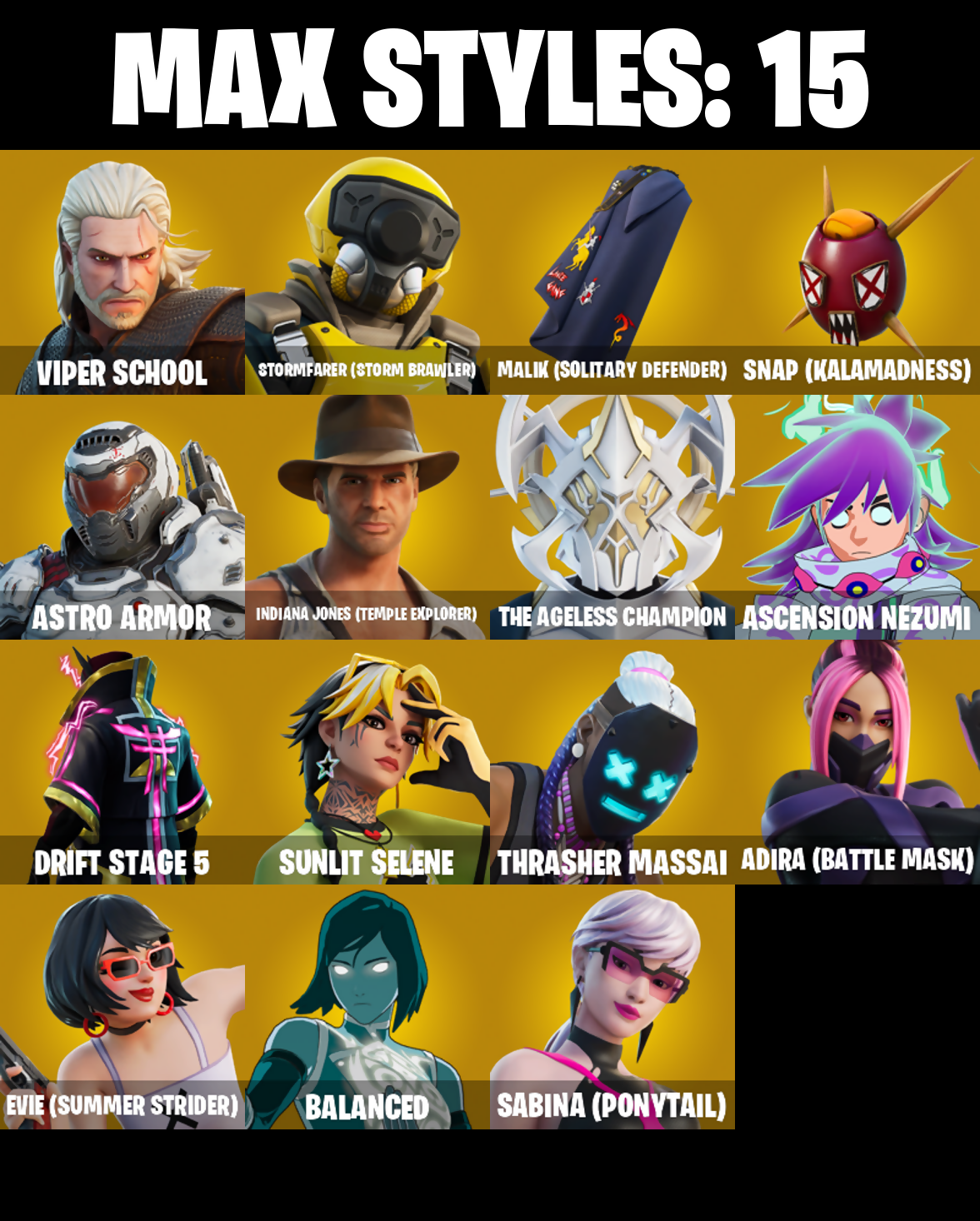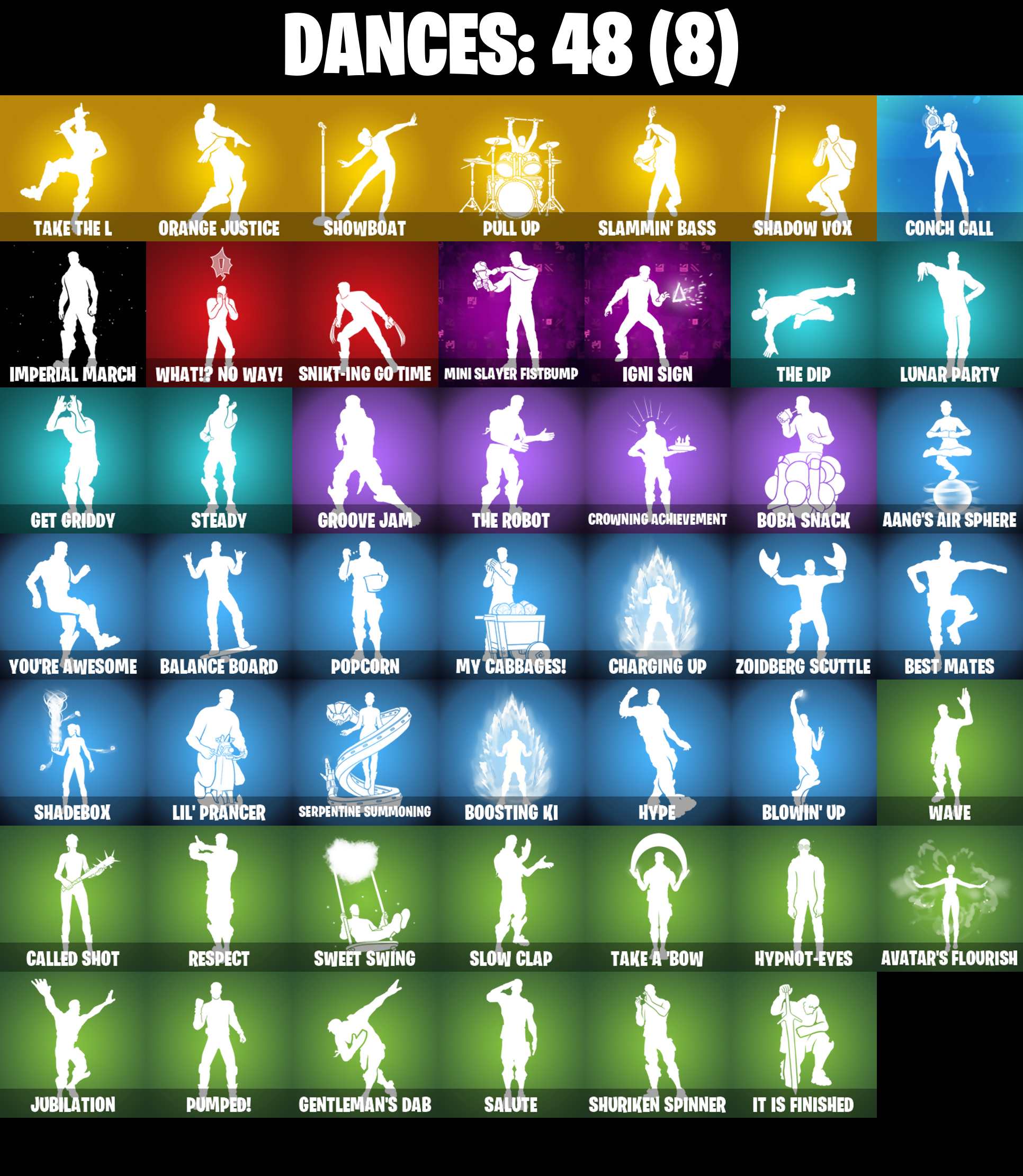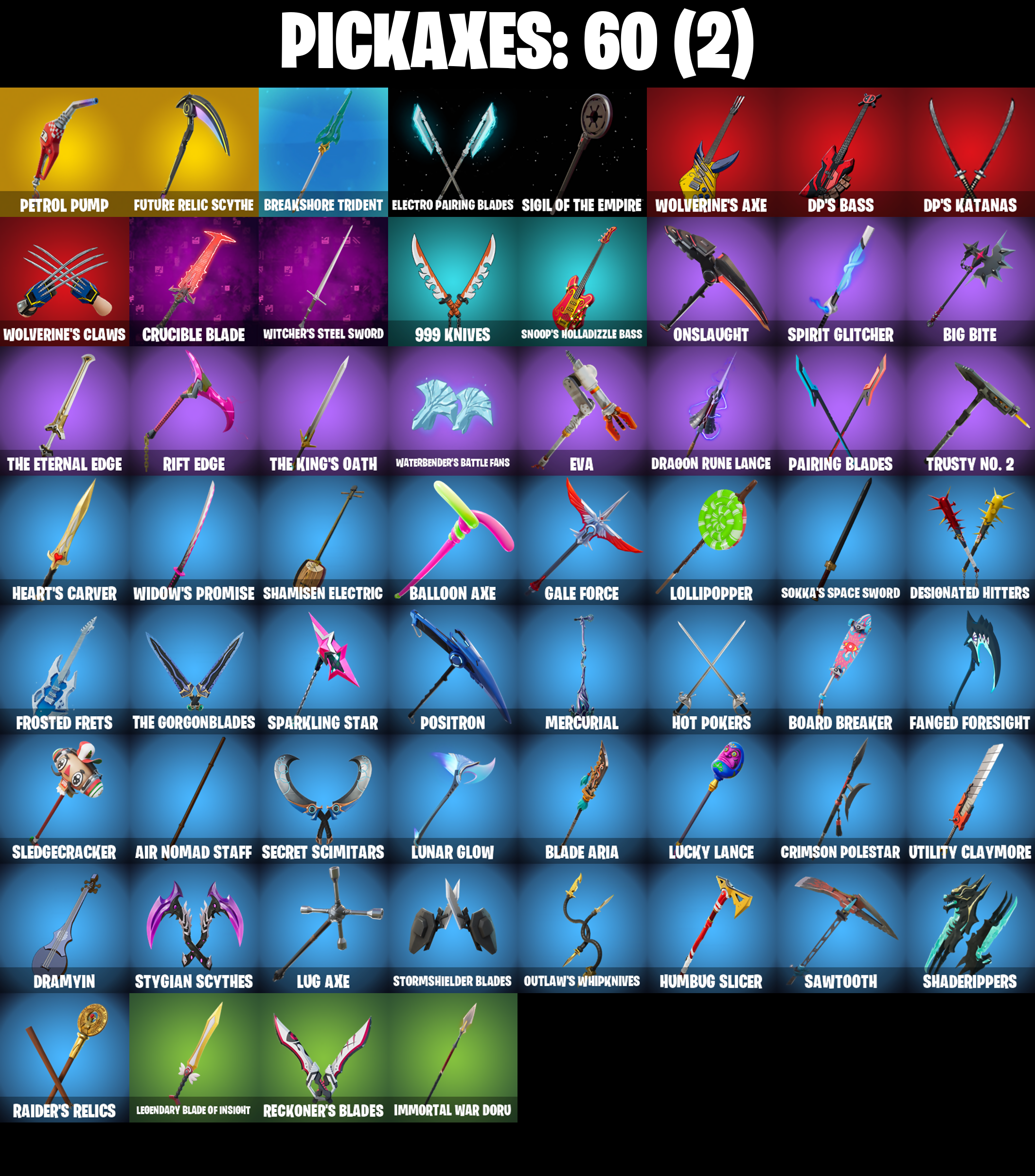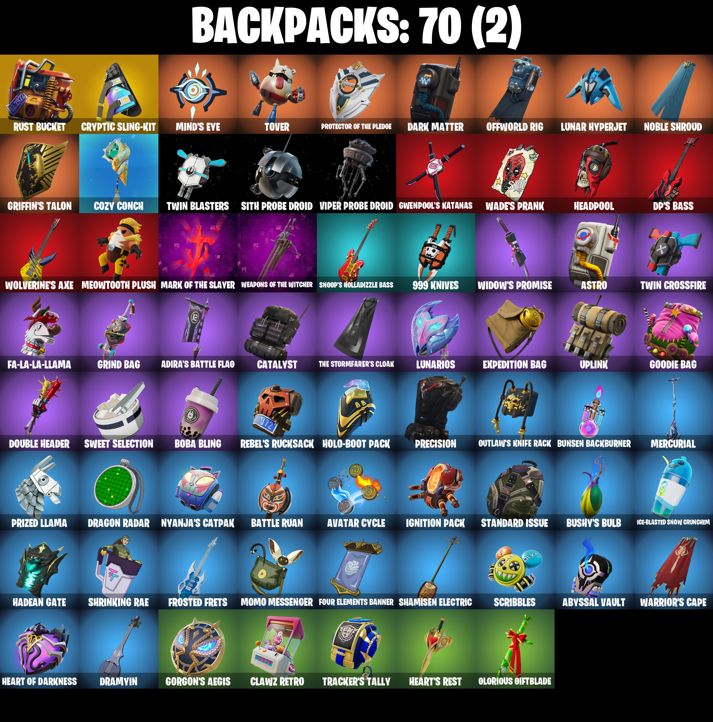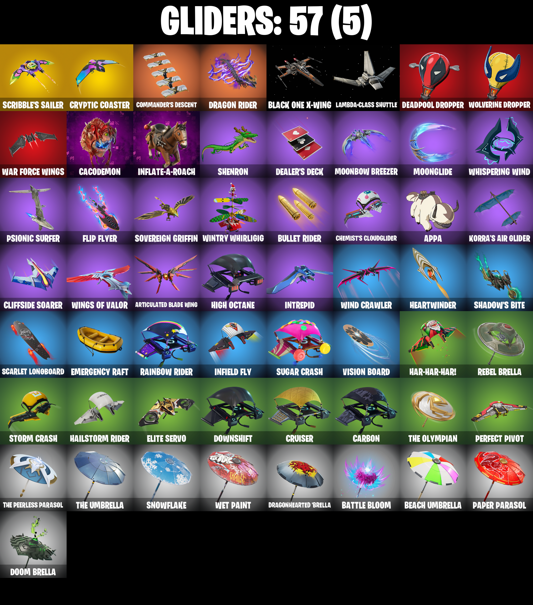 999 Knives, Aang, Aang's Air Sphere, Abyssal Vault, Adira, Adira (Battle Mask), Adira's Battle Flag, Air Nomad Staff, Aphrodite, Appa, Arctic Adeline, Ares, Articulated Blade Wing, Ascension Nezumi, Astro, Astro Armor, Avatar Cycle, Avatar State Aang, Avatar's Flourish, Balance Board, Balanced, Balloon Axe, Battle Bloom, Battle Ruan, Battlehawk, Beach Umbrella, Best Mates, Big Bite, Black One X-Wing, Blade Aria, Blowin' Up, Board Breaker, Boba Bling, Boba Snack, Boosting Ki, Breakshore Trident, Bullet Rider, Bunsen Backburner, Bushy's Bulb, Cacodemon, Called Shot, Carbide, Carbon, Catalyst, Cerberus, Charging Up, Chemist'S Cloudglider, Clawz Retro, Cliffside Soarer, Commander'S Descent, Conch Call, Cozy Conch, Crimson Polestar, Crowning Achievement, Crucible Blade, Cruiser, Cryptic Coaster, Cryptic Sling-Kit, Dark Matter, Dark Voyager, Darth Maul, Darth Vader, Deadpool (Pen & Ink), Deadpool Dropper, Dealer'S Deck, Designated Hitters, Doom Brella, Doom Slayer, Double Header, Downshift, Dp's Bass, Dp's Katanas, Dragon Radar, Dragon Rider, Dragon Rune Lance, Dragonhearted 'Brella, Dramyin, Drift, Drift Stage 5, Dusty, Electro Pairing Blades, Elite Agent, Elite Servo, Emergency Raft, Eva, Evie, Evie (Summer Strider), Expedition Bag, Fa-La-La-Llama, Fanged Foresight, Flip Flyer, Four Elements Banner, Frosted Frets, Future Relic Scythe, Gale Force, Gentleman's Dab, Geralt Of Rivia, Get Griddy, Glorious Giftblade, Goodie Bag, Gorgon's Aegis, Griffin's Talon, Grind Bag, Groove Jam, Gwenpool's Katanas, Hadean Gate, Hailstorm Rider, Har-Har-Har!, Headpool, Heart Of Darkness, Heart's Carver, Heart's Rest, Heartwinder, Helsie, High Octane, Holiday Boxy, Holo-Boot Pack, Hot Pokers, Humbug Slicer, Huntress, Hype, Hypnot-Eyes, Ice-Blasted Snow Crunchem, Igni Sign, Ignition Pack, Immortal War Doru, Imperial March, Indiana Jones, Indiana Jones (Temple Explorer), Infield Fly, Inflate-A-Roach, Intrepid, It Is Finished, Jing, Jubilation, Korra, Korra'S Air Glider, Lambda-Class Shuttle, Legendary Blade Of Insight, Lil' Prancer, Lollipopper, Lucky Lance, Lug Axe, Lunar Glow, Lunar Hyperjet, Lunar Party, Lunarios, Malik, Malik (Solitary Defender), Mark Of The Slayer, Massai, Medusa, Meowtooth Plush, Mercurial, Mind's Eye, Mini Slayer Fistbump, Mission Specialist, Momo Messenger, Moonbow Breezer, Moonglide, Moonwalker, My Cabbages!, Nezumi, Noble Shroud, Nyanja's Catpak, Offworld Rig, Omega, Onslaught, Orange Justice, Outlaw's Knife Rack, Outlaw's Whipknives, Pairing Blades, Paper Parasol, Perfect Pivot, Persephone, Petrol Pump, Popcorn, Poseidon, Positron, Precision, Prized Llama, Protector Of The Pledge, Psionic Surfer, Pull Up, Pumped!, Raider's Relics, Rainbow Rider, Rebel Brella, Rebel's Rucksack, Reckoner's Blades, Redline, Respect, Rift Edge, Rogue Agent, Rust Bucket, Rust Lord, Sabina, Sabina (Ponytail), Salute, Satoru Gojo, Sawtooth, Scarlet Longboard, Scribble's Sailer, Scribbles, Secret Scimitars, Selene, Serpentine Summoning, Shadebox, Shaderippers, Shadow Vox, Shadow'S Bite, Shamisen Electric, Shenron, Showboat, Shrinking Rae, Shuriken Spinner, Sigil Of The Empire, Sith Probe Droid, Slammin' Bass, Slayer Juice Wrld, Sled Ready Guff, Sledgecracker, Slow Clap, Snap, Snap (Kalamadness), Snikt-ing Go Time, Snoop's Holladizzle Bass, Snowflake, Sokka's Space Sword, Sovereign Griffin, Sparkling Star, Spirit Glitcher, Spirit Hunter Saeko, Squad Leader, Standard Issue, Steady, Storm Crash, Stormfarer, Stormfarer (Storm Brawler), Stormshielder Blades, Stygian Scythes, Subzero Cryptic, Sugar Crash, Sunlit Selene, Sweet Selection, Sweet Swing, Take A 'Bow, Take The L, Teknique, The Ageless, The Ageless Champion, The Dip, The Eternal Edge, The Gorgonblades, The King's Oath, The Machinist, The Olympian, The Peerless Parasol, The Reaper, The Robot, The Stormfarer's Cloak, The Umbrella, The Visitor, Thrasher Massai, Tover, Tracker's Tally, Trusty No. 2, Twin Blasters, Twin Crossfire, Uplink, Utility Claymore, Valor, Viper Probe Droid, Viper School, Vision Board, Vivi Chroma, Wade's Prank, War Force Wings, Warrior's Cape, Waterbender's Battle Fans, Wave, Weapons Of The Witcher, Wet Paint, What!? No Way!, Whispering Wind, Widow's Promise, Wind Crawler, Wings Of Valor, Winterfest Bushranger, Wintry Whirligig, Witcher's Steel Sword, Wolverine (Pen & Ink), Wolverine Dropper, Wolverine's Axe, Wolverine's Claws, You're Awesome, Zoey, Zoidberg Scuttle