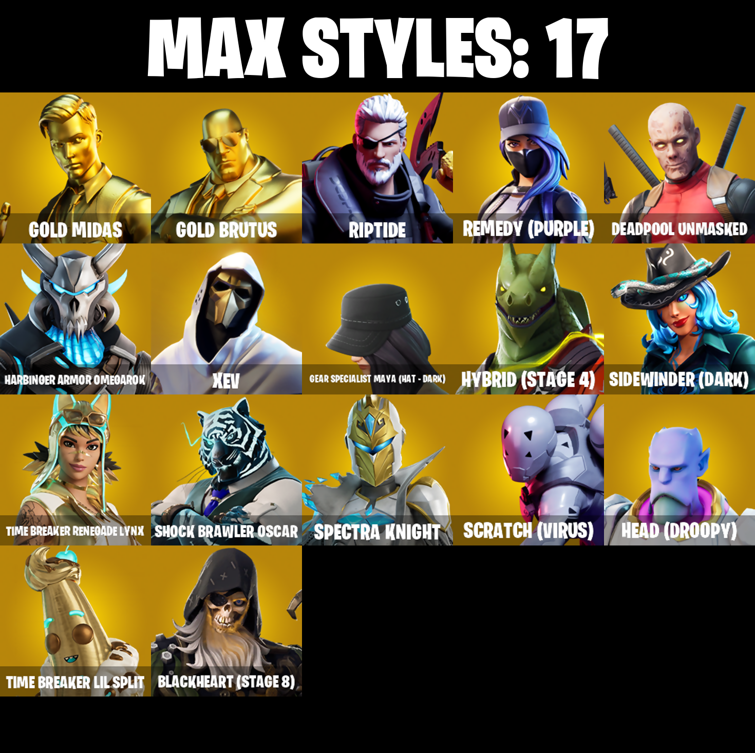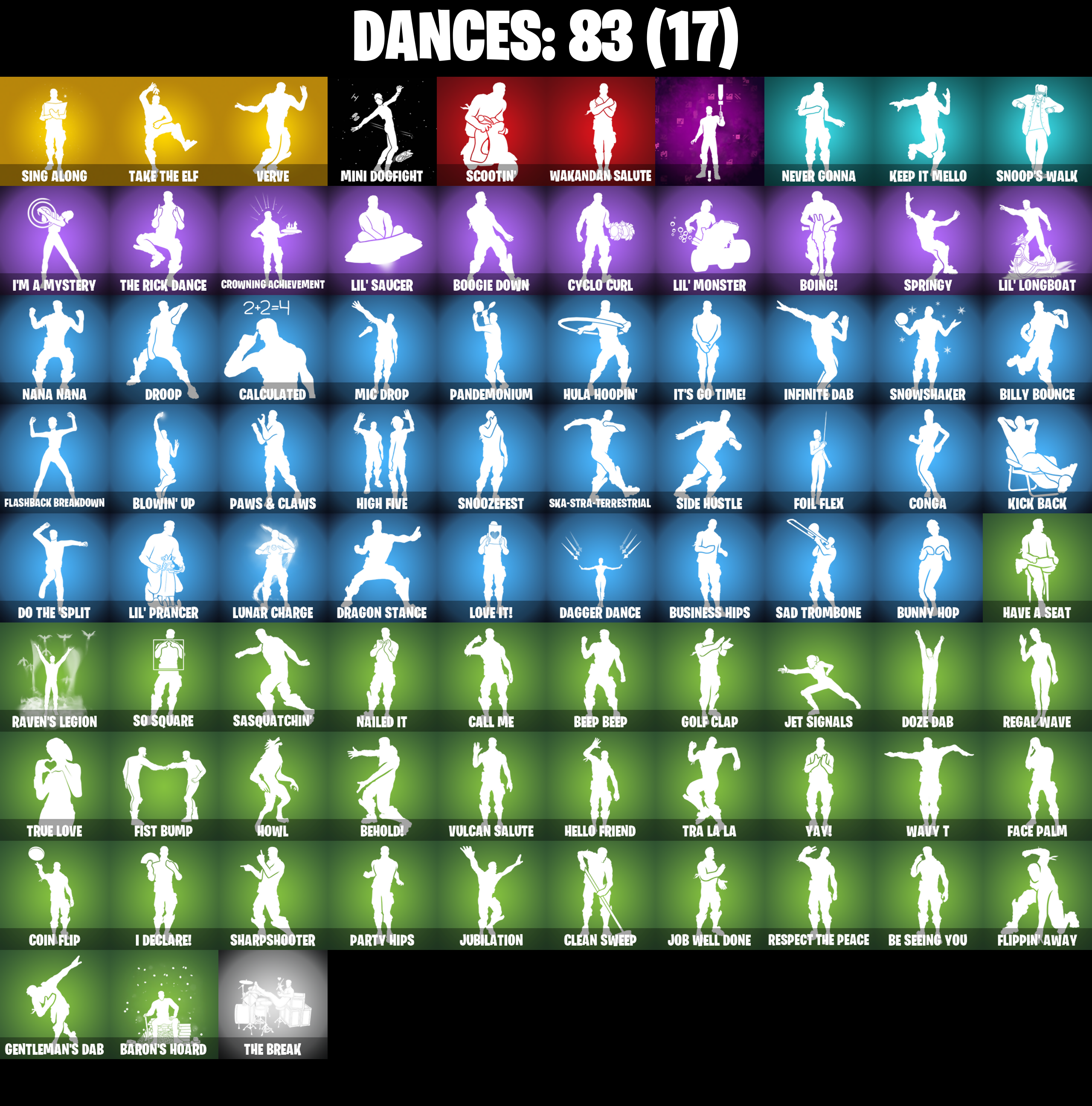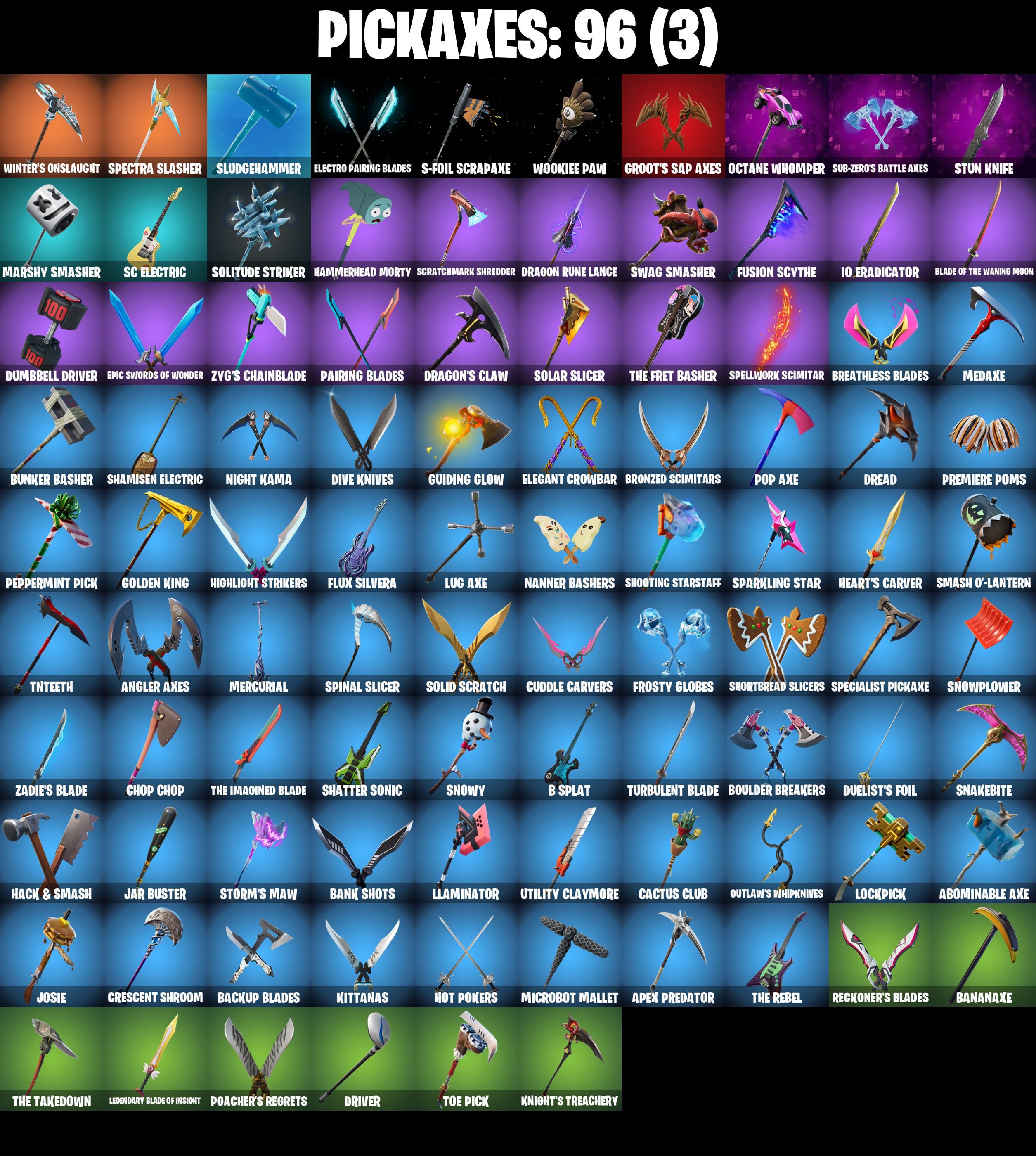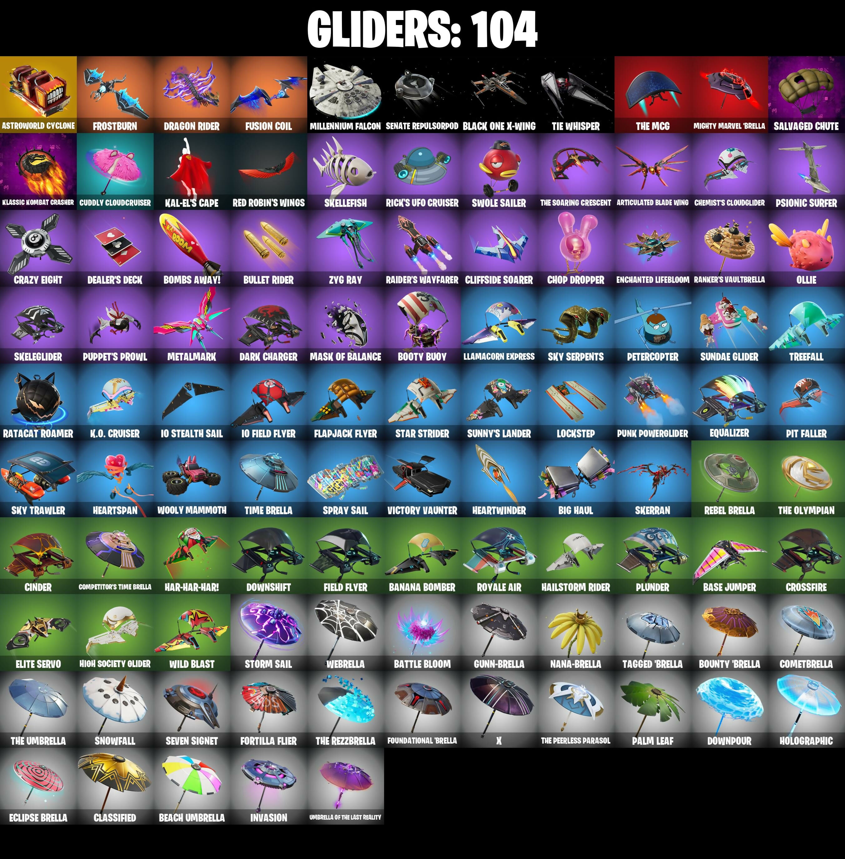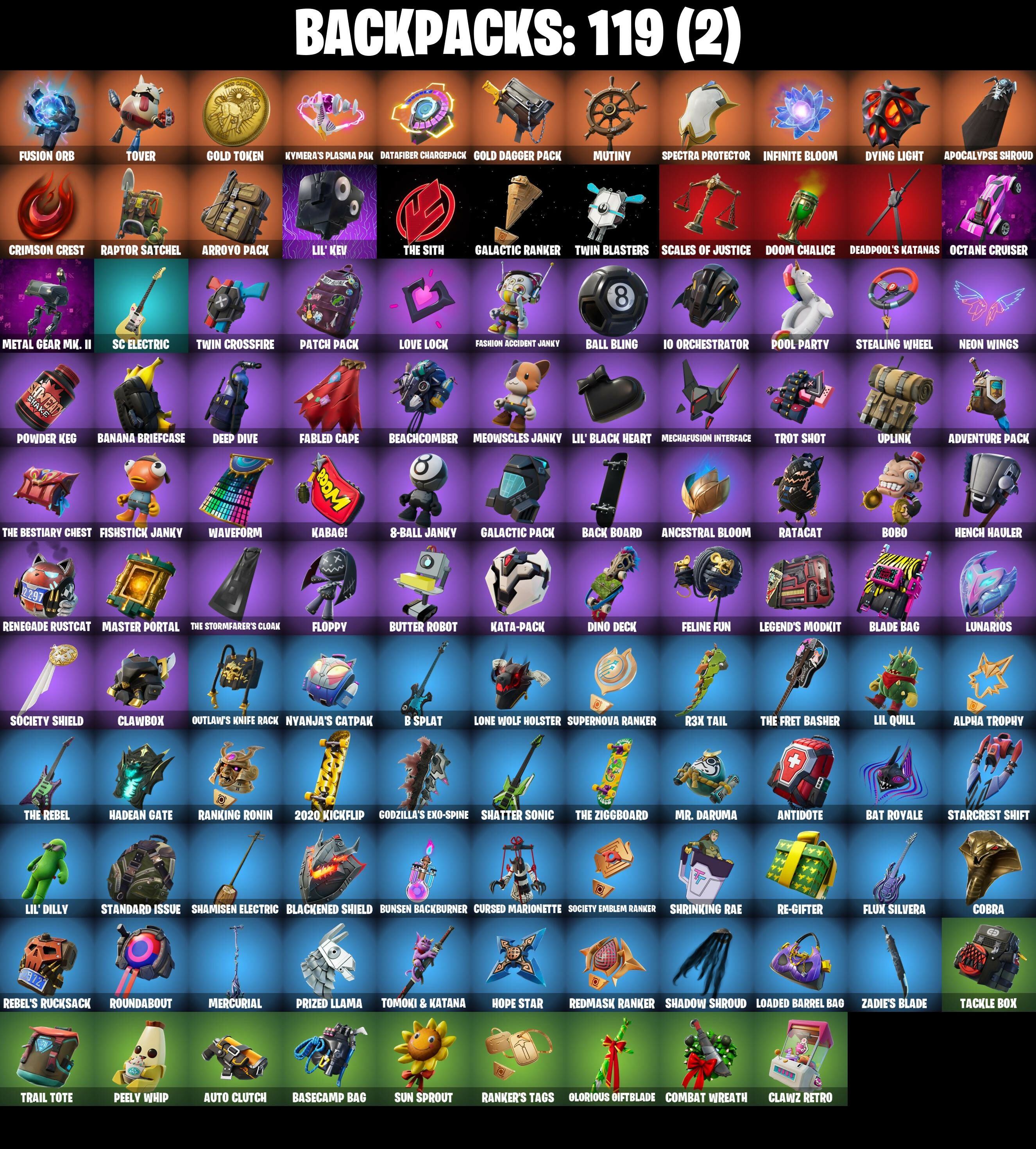 2020 Kickflip, 8-Ball Janky, 8-Ball VS Scratch, Abominable Axe, Adventure Pack, Agent Peely, Alpha Trophy, Ancestral Bloom, Angler Axes, Antidote, Apex Predator, Apocalypse Shroud, Arroyo Pack, Articulated Blade Wing, Astroworld Cyclone, Aura, Auto Clutch, B Splat, Back Board, Backup Blades, Ball Bling, Banana Bomber, Banana Briefcase, Bananaxe, Bank Shots, Baron's Hoard, Base Jumper, Basecamp Bag, Bat Royale, Battle Bloom, Be Seeing You, Beach Umbrella, Beachcomber, Beep Beep, Behold!, Big Haul, Billy Bounce, Black One X-Wing, Blackened Shield, Blackheart, Blackheart (Stage 8), Blade Bag, Blade of the Waning Moon, Blowin' Up, Bobo, Boing!, Bombs Away!, Boogie Down, Booty Buoy, Boulder Breakers, Bounty 'Brella, Breathless Blades, Brite Bomber, Bronzed Scimitars, Bullet Rider, Bunker Basher, Bunny Hop, Bunsen Backburner, Business Hips, Butter Robot, Cactus Club, Calculated, Call Me, Cameo VS Chic, Chemist's Cloudglider, Chop Chop, Chop Dropper, Cinder, Classified, Clawbox, Clawz Retro, Clean Sweep, Cliffside Soarer, Cobra, Coin Flip, Combat Wreath, Cometbrella, Competitor's Time Brella, Conga, Crazy Eight, Crescent Shroom, Crimson Crest, Crossfire, Crowning Achievement, Cuddle Carvers, Cuddly Cloudcruiser, Cursed Marionette, Cyclo Curl, Dagger Dance, Dark Charger, Datafiber Chargepack, Deadpool, Deadpool Unmasked, Deadpool's Katanas, Dealer's Deck, Deep Dive, Dino Deck, Dive Knives, Do The 'Split, Doctor Slone, Doom Chalice, Downpour, Downshift, Doze Dab, Dragon Rider, Dragon Rune Lance, Dragon Stance, Dragon's Claw, Dread, Driver, Droop, Duelist's Foil, Dumbbell Driver, Dusk Knight, Dying Light, Eclipse Brella, Electro Pairing Blades, Elegant Crowbar, Elite Servo, Ember, Enchanted Lifebloom, Epic Swords of Wonder, Equalizer, Evie, Fabled Cape, Face Palm, Fashion Accident Janky, Feline Fun, Field Flyer, Fishstick Janky, Fist Bump, Flapjack Flyer, Flashback Breakdown, Flippin' Away, Floppy, Flux Silvera, Foil Flex, Fortilla Flier, Foundational 'Brella, Frostburn, Frosty Globes, Fusion, Fusion Coil, Fusion Orb, Fusion Scythe, Galactic Pack, Galactic Ranker, Gear Specialist Maya, Gear Specialist Maya (Hat - Dark), Gentleman's Dab, Glorious Giftblade, Glow, Godzilla's Exo-Spine, Gold Brutus, Gold Dagger Pack, Gold Midas, Gold Token, Golden King, Golf Clap, Groot's Sap Axes, Guggimon, Guiding Glow, Gunn-Brella, Hack & Smash, Hadean Gate, Hailstorm Rider, Hammerhead Morty, Har-Har-Har!, Harbinger Armor Omegarok, Have A Seat, Haven, Head (Droopy), Heart's Carver, Heartspan, Heartwinder, Hello Friend, Hench Hauler, High Five, High Society Glider, Highlight Strikers, Holiday Boxy, Holographic, Hope, Hope Star, Hot Pokers, Howl, Hula Hoopin', Hybrid, Hybrid (Stage 4), I Declare!, I'm A Mystery, IO Eradicator, IO Field Flyer, IO Orchestrator, IO Stealth Sail, Infinite Bloom, Infinite Dab, Invasion, Iris, It's Go Time!, Jar Buster, Jet Signals, Job Well Done, Joey, Josie, Journey VS Hazard, Jubilation, K.O. Cruiser, Kabag!, Kal-El's Cape, Kata-Pack, Keep It Mello, Kick Back, Kittanas, Klassic Kombat Crasher, Knight's Treachery, Kymera, Kymera's Plasma Pak, Legendary Blade of Insight, Legends Modkit, Lil Quill, Lil Split, Lil' Black Heart, Lil' Dilly, Lil' Kev, Lil' Longboat, Lil' Monster, Lil' Prancer, Lil' Saucer, Llamacorn Express, Llaminator, Loaded Barrel Bag, Lockpick, Lockstep, Lone Wolf Holster, Love It!, Love Lock, Lt. Evergreen, Lt. John Llama, Lug Axe, Lunar Charge, Lunarios, Marshy Smasher, Mask of Balance, Master Portal, Mechafusion Interface, Medaxe, Meowscles, Meowscles Janky, Mercurial, Metal Gear Mk. II, Metalmart, Mic Drop, Microbot Mallet, Mighty Marvel 'Brella, Millennium Falcon, Mini Dogfight, Mr. Daruma, Mutiny, Nailed It, Nana Nana, Nana-Brella, Nanner Bashers, Neon Wings, Never Gonna, Night Kama, Nisha, Nitehare, Nyanja's Catpak, Octane Cruiser, Octane Whomper, Ollie, Omegarok, Oscar, Outlaw's Knife Rack, Outlaw's Whipknives, Pairing Blades, Palm Leaf, Pandemonium, Party Hips, Patch Pack, Paws & Claws, Peely, Peely Whip, Peppermint Pick, Petercopter, Pit Faller, Plunder, Poacher's Regrets, Pool Party, Pop Axe, Powder Keg, Premiere Poms, Prized Llama, Psionic Surfer, Punk Powerglider, Puppet’s Prowl, R3X Tail, Raider's Wayfarer, Ranker's Tags, Ranker's Vaultbrella, Ranking Ronin, Raptor, Raptor Satchel, Ratacat, Ratacat Roamer, Raven's Legion, Re-Gifter, Rebel Brella, Rebel's Rucksack, Reckoner's Blades, Red Robin's Wings, Redmask Ranker, Regal Wave, Remedy (Purple), Remedy VS Toxin, Renegade Lynx, Renegade Rustcat, Respect The Peace, Rick Sanchez, Rick’s UFO Cruiser, Rippley VS Sludge, Riptide, Ronin, Roundabout, Royale Air, Ruin, Runway Racer, S-Foil Scrapaxe, SC Electric, Sad Trombone, Salvaged Chute, Sasquatchin', Scales Of Justice, Scootin', Scratch (Virus), Scratchmark Shredder, Senate Repulsorpod, Seven Signet, Shadow Shroud, Shamisen Electric, Shanta, Sharpshooter, Shatter Sonic, Shock Brawler Oscar, Shooting Starstaff, Shortbread Slicers, Shrinking Rae, Side Hustle, Sidewinder, Sidewinder (Dark), Sing Along, Ska-stra-terrestrial, Skeleglider, Skellefish, Skerran, Sky Serpents, Sky Trawler, Skye, Sled Ready Guff, Sludgehammer, Smash O'-Lantern, Snakebite, Snap, Snoop's Walk, Snoozefest, Snowfall, Snowplower, Snowshaker, Snowy, So Square, Society Emblem Ranker, Society Shield, Solar Slicer, Solid Scratch, Solid Snake, Solitude Striker, Sparkling Star, Specialist Pickaxe, Spectra Knight, Spectra Protector, Spectra Slasher, Spellwork Scimitar, Spinal Slicer, Spray Sail, Springy, Standard Issue, Star Strider, Starcrest Shift, Stealing Wheel, Storm Sail, Storm's Maw, Stun Knife, Sub-Zero's Battle Axes, Sun Sprout, Sundae Glider, Sunny, Sunny's Lander, Supernova Ranker, Swag Smasher, Swole Sailer, Tackle Box, Tagged 'Brella, Take The Elf, Tart Tycoon, The Bestiary Chest, The Break, The Fret Basher, The Imagined Blade, The McG, The Olympian, The Peerless Parasol, The Rebel, The Rezzbrella, The Rick Dance, The Sith, The Soaring Crescent, The Stormfarer's Cloak, The Takedown,