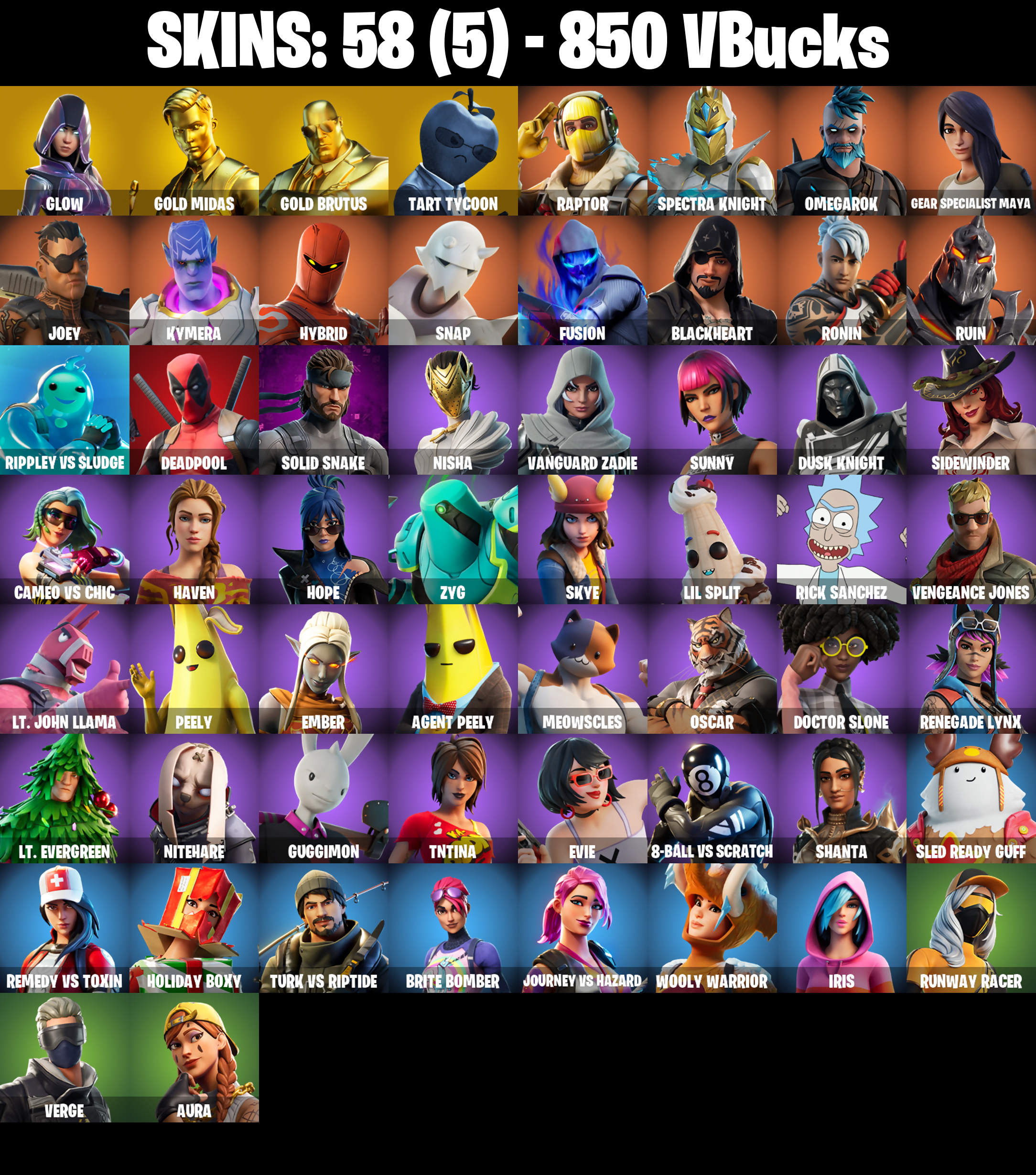 PC/PSN/XBOX |58 skins | Glow | Deadpool | Gold Midas | Gold Brutus | Peely | Fusion | Rick Sanchez | Raptor | Sing Along | Take The Elf | #B1212