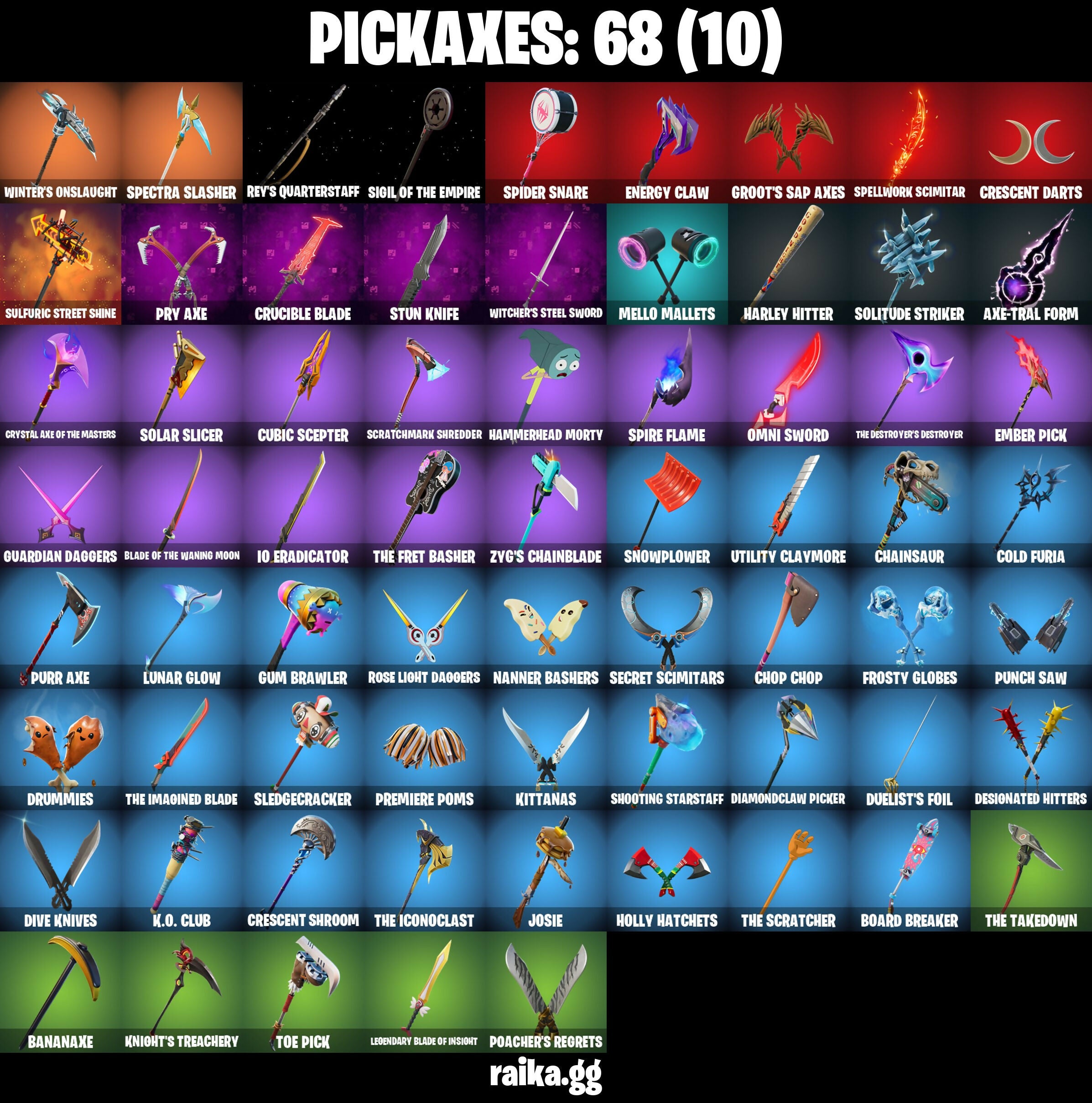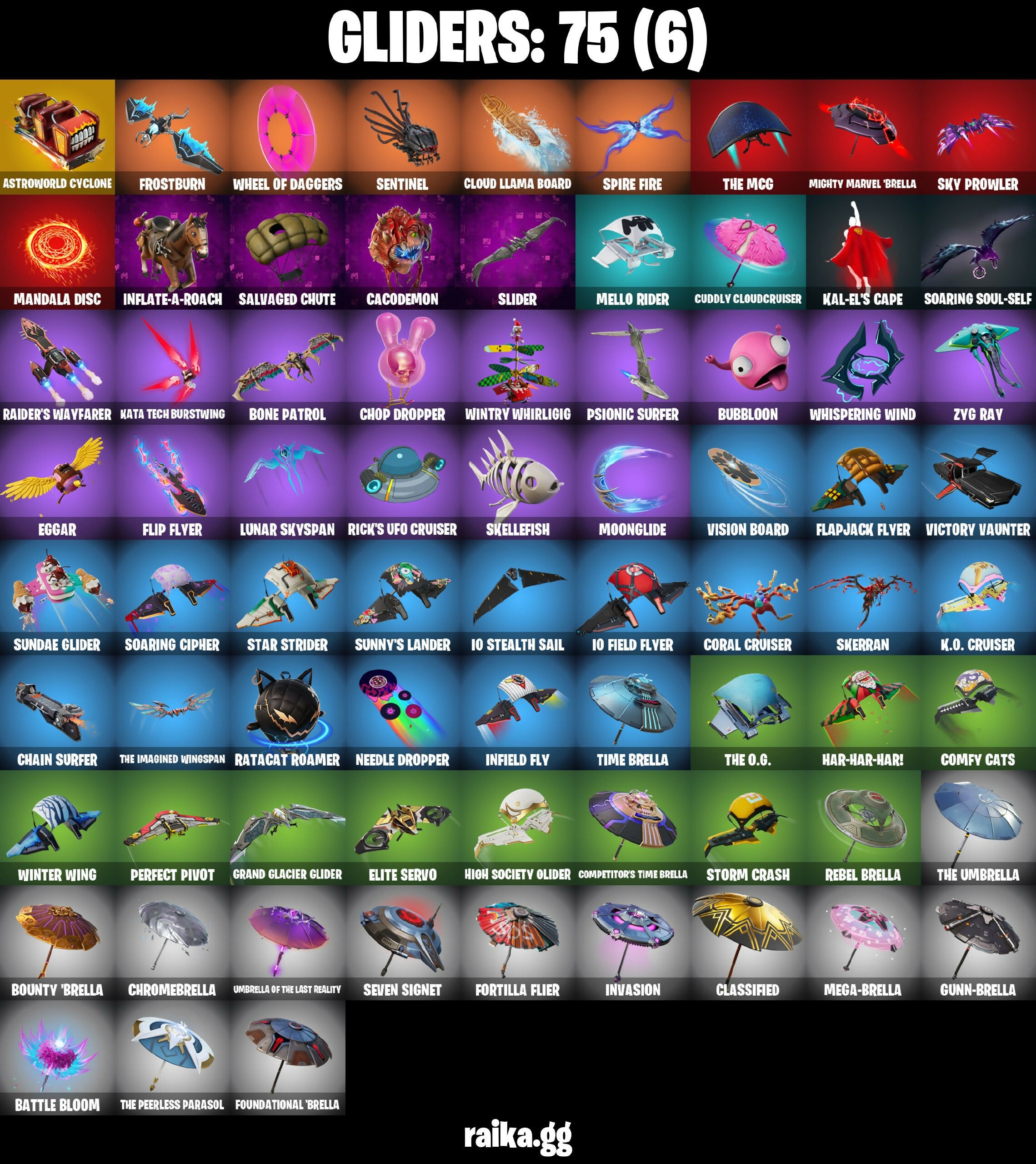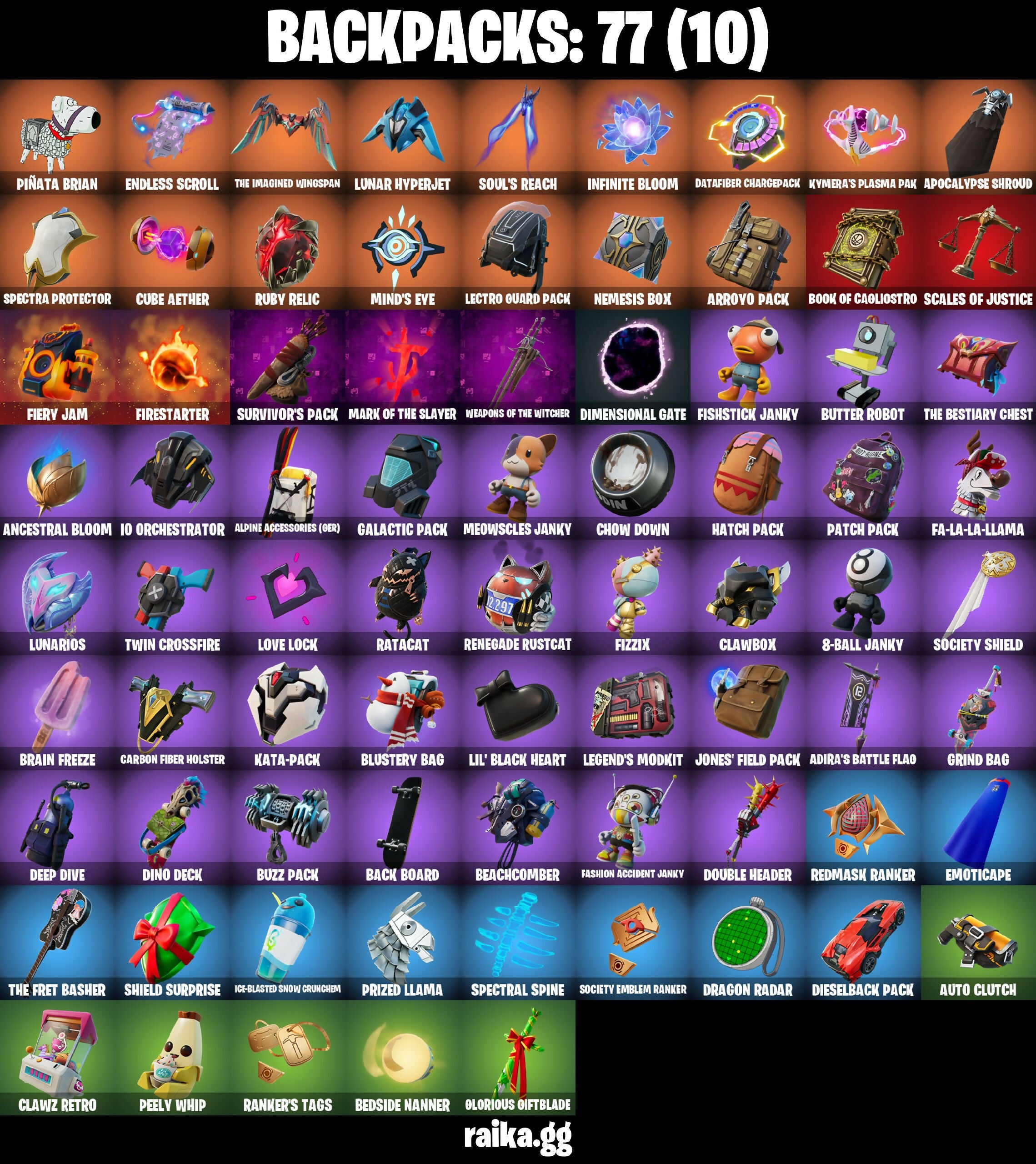 8-Ball Janky, Adira's Battle Flag, Agent Jones (Jump 31), Alpine Accessories (Oer), Alpine Ace (Ger), Amazing Cube, Ancestral Bloom, Apocalypse Shroud, Arctic Adeline, Arroyo Pack, Astro Armor, Astroworld Cyclone, Aura, Auto Clutch, Axe-tral Form, Azarath Metrion Zinthos!, Back Board, Balance Board, Bananaxe, Battle Bloom, Beachcomber, Bean Bag, Bedside Nanner, Beep Beep, Behold!, Blade Of The Waning Moon, Blaze, Blustery Bag, Board Breaker, Bone Patrol, Boogie Down, Book of Caoliostro, Boots 'n' Cats, Bounty 'Brella, Brain Freeze, Bubloon, Burning Ambition Valeria, Butter Robot, Buzz Pack, C'Mere, Cabbie, Cacodemon, Call Me, Carbon Fiber Holster, Cardistry, Chain Surfer, Chainsaur, Choice Knit, Chop Chop, Chop Dropper, Chow Down, Chromebrella, Classified, Clawbox, Clawz Retro, Clean Sweep, Clinical Crosser, Cloud Llama Board, Cluck (Slurpy), Cold Furia, Combat Elite, Comfy Cats, Competitor's Time Brella, Conjure Weapon, Coral Cruiser, Crescent Darts, Crescent Shroom, Crowning Achievement, Crucible Blade, Cryptic, Crystal Axe Of The Masters, Cube Aether, Cubic Scepter, Cuddly Cloudcruiser, Cyclo Curl, Dagger Dance, Datafiber Chargepack, Deep Dive, Designated Hitters, Diamond Throne, Diamondclaw Picker, Dieselback Pack, Dimensional Gate, Dino Deck, Dive Knives, Do The Split, Doctor Slone, Doctor Strange, Doggo, Double Header, Doze Dab, Dragon Radar, Droopy, Drummies, Duelist's Foil, Dusty, Eggar, Elite Servo, Ember Pick, Emoticape, Endless Scroll, Energy Claw, Evasive Maneuvers, Fa-La-La-Llama, Fashion Accident Janky, Fiery Jam, Firestarter, Fishstick Janky, Fizzix, Flapjack Flyer, Flashback Breakdown, Flex On 'Em, Flip Flyer, Flippin' Away, Foil Flex, Fortilla Flier, Foundational 'Brella, Frost Squad, Frostburn, Frosty Globes, Galactic Pack, Get Loose, Good Guy, Grand Glacier Glider, Grind Bag, Groot's Sap Axes, Guardian Daggers, Guggimon, Gum Brawler, Gunn-Brella, Gunnar, Hammerhead Morty, Hang On, Har-Har-Har!, Harbinger Armor Omegaarok, Harley Hitter, Hatch Pack, Headhunter Prime, Heart Sign, Heart-Rizon, High Society Glider, Holiday Boxy, Holly Hatchets, Hope, Howl, I'm A Mystery, IO Eradicator, IO Orchestrator, Ice-Blasted Snow Crunchem, Igni Sign, Imperial March, Infield Fly, Infinite Bloom, Inflate-A-Roach, Invasion, Io Field Flyer, Io Stealth Sail, It Is Finished, It's... You?, Jabba Switchway, Jones' Field Pack, Josie, K.O. Club, K.O. Cruiser, Kal-El's Cape, Kata Tech Burstwing, Kata-Pack, Kick Back, King Flamingo, Kittanas, Knife Sharpener, Knight's Helm, Knight's Treachery, Kymera's Plasma Pak, Lara Croft, Lectro Guard Pack, Legend's Modkit, Legendary Blade Of Insight, Lil' Black Heart, Lil' Longboat, Lil' Prancer, Lil' Saucer, Love It!, Love Lock, Lunar Glow, Lunar Hyperjet, Lunar Party, Lunar Skyspan, Lunarios, Mandala Disc, Mark of the Slayer, Marsh Walk, Marshmello, Mega-Brella, Mello Mallets, Mello Rider, Meowscles Janky, Mighty Marvel 'Brella, Mind's Eye, Mini Slayer Fistbump, Moonglide, My World, Nailed It, Nanner Bashers, Needle Dropper, Nemesis Box, Neymar Jr, Nisha, No Sweat, Olorious Giftblade, Omni Sword, Page Turner, Party Hips, Patch Pack, Peely Whip, Perfect Pivot, Peter Griffin, Pirouette, Piñata Brian, Poacher's Regrets, Popular Vibe, Premiere Poms, Prized Llama, Prowler, Pry Axe, Psionic Surfer, Punch Saw, Purr Axe, Rage Quit, Raider's Wayfarer, Ranker's Tags, Ratacat, Ratacat Roamer, Raz, Rebel Brella, Rebirth Raven, Recon Ranger, Red Card, Redmask Ranker, Renegade Rustcat, Respect The Peace, Revel, Rey's Quarterstaff, Rick Sanchez, Rick's Ufo Cruiser, Rose Light Daggers, Rough Cut Montague, Ruby Relic, Runway Racer, Salvaged Chute, Sandstone Joey, Sasquatchin', Scales of Justice, Scootin' Circles, Scratchmark Shredder, Secret Scimitars, Segway Tour, Sentinel, Seven Signet, Shield Surprise, Shock Brawler Oscar, Shooting Starstaff, Sigil Of The Empire, Sing Along, Ska-Stra-Terrestrial, Skellefish, Skerran, Sky Prowler, Sled Ready Guff, Sledgecracker, Slider, Snikit! Snikit!, Snowmando, Snowplower, So Square, Soaring Cipher, Soaring Soul-Self, Society Emblem Ranker, Society Shield, Solar Slicer, Solid Snake, Solitude Striker, Soul's Reach, Soundwave Series - Hamaki, Spectra Protector, Spectra Slasher, Spectral Spine, Spellwork Scimitar, Spider Snare, Spire Assassin, Spire Fire, Spire Flame, Star Strider, Stealth Silver, Storm Crash, Stun Knife, Sulfuric Street Shine, Sundae Glider, Sunglasses, Sunlit Selene, Sunny, Sunny's Lander, Survivor's Pack, Switchstep, Take A 'Bow, Take The Cake, Tarana (X- Tinction Armor), Tectonic Komplex, The Bestiary Chest, The Destroyer's Destroyer, The Dip, The Fret Basher, The Iconoclast, The Imagined Blade, The Imagined Wingspan, The Mcg, The O.G., The Peerless Parasol, The Rick Dance, The Scratcher, The Takedown, The Umbrella, This Is The Way, Thrasher Massai, Time Breaker Lil Split, Time Breaker Renegade Lynx, Time Brella, Toasty Roast, Toe Pick, True Love, Tsuki 2.0, Twin Crossfire, Umbrella Of The Last Reality, Utility Claymore, Vengeance Jones, Verve, Victory Vaunter, Viper School, Vision Board, Vulcan Salute, Waddle Away, Wakandan Salute, Waterworks, Weapons of the Witcher, Wheel Of Daggers, Whispering Wind, Winter Wing, Winter's Onslaught, Winterfest Bushranger, Wintry Whirligig, Witcher's Steel Sword, Wu-Tang Is Forever, Zyg, Zyg Ray, Zyg's Chainblade, [Insert Laughter Here]