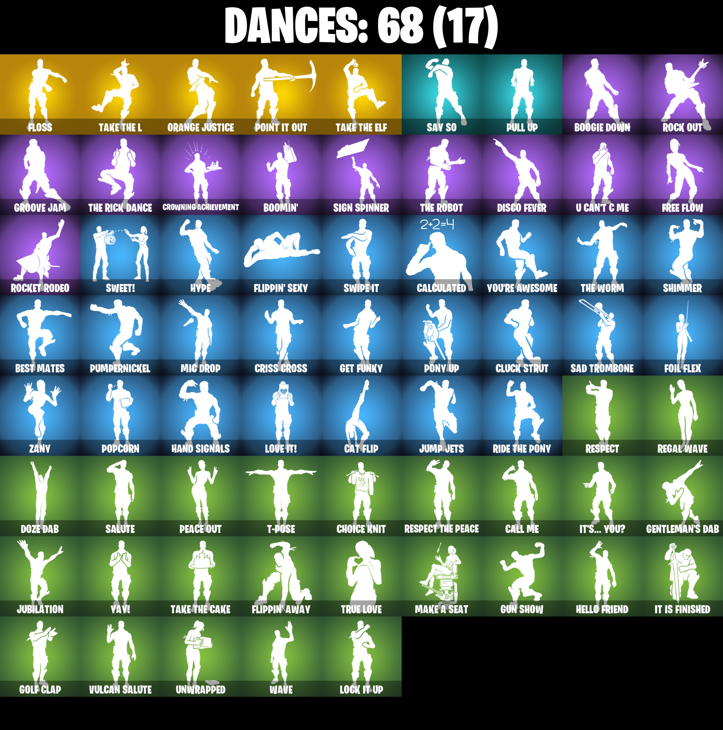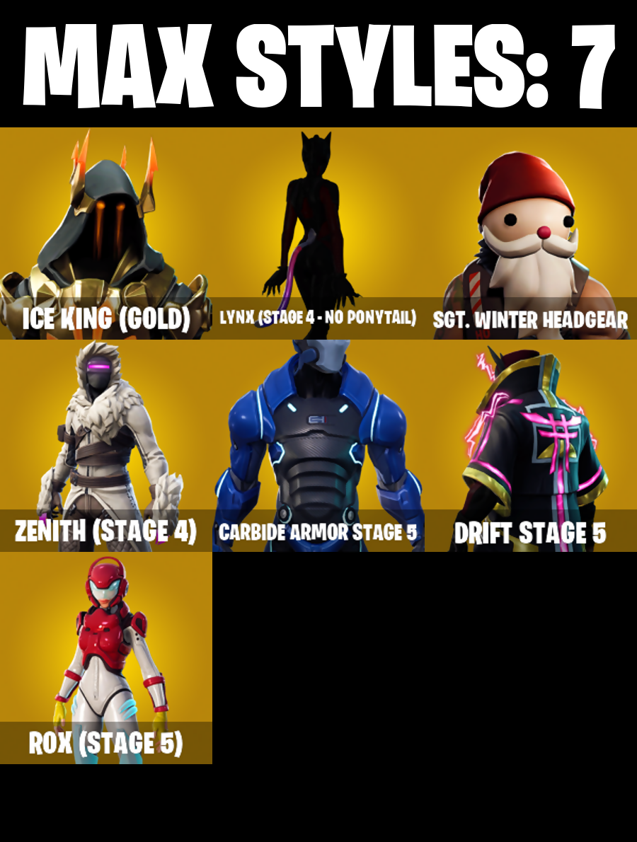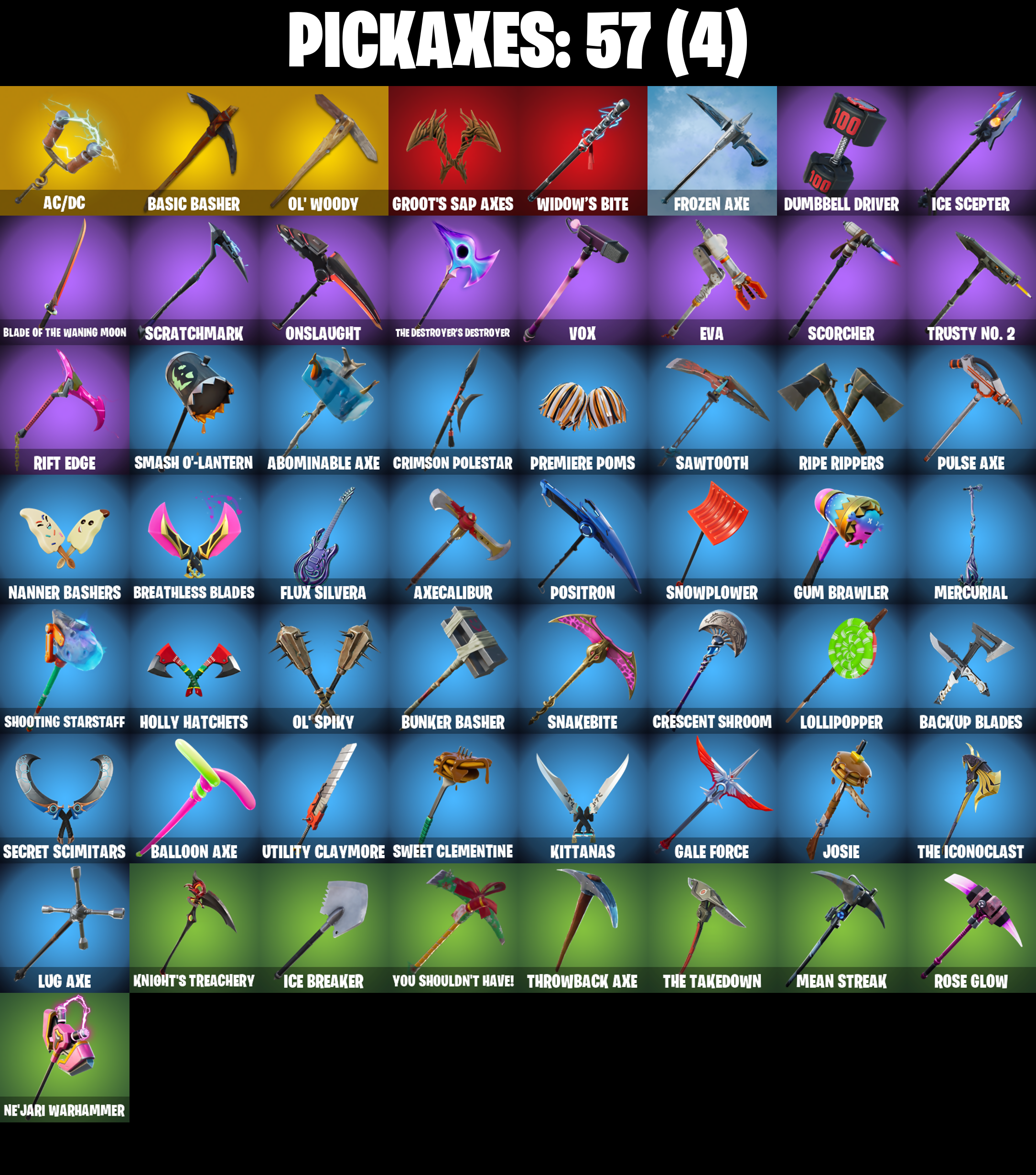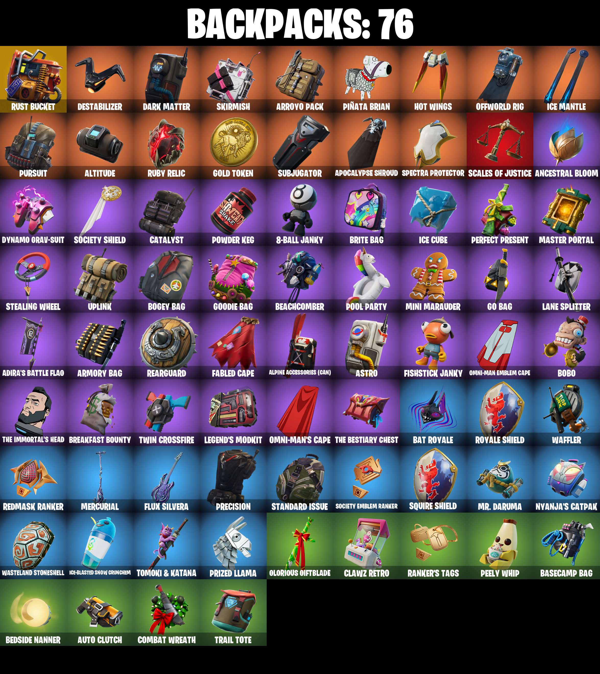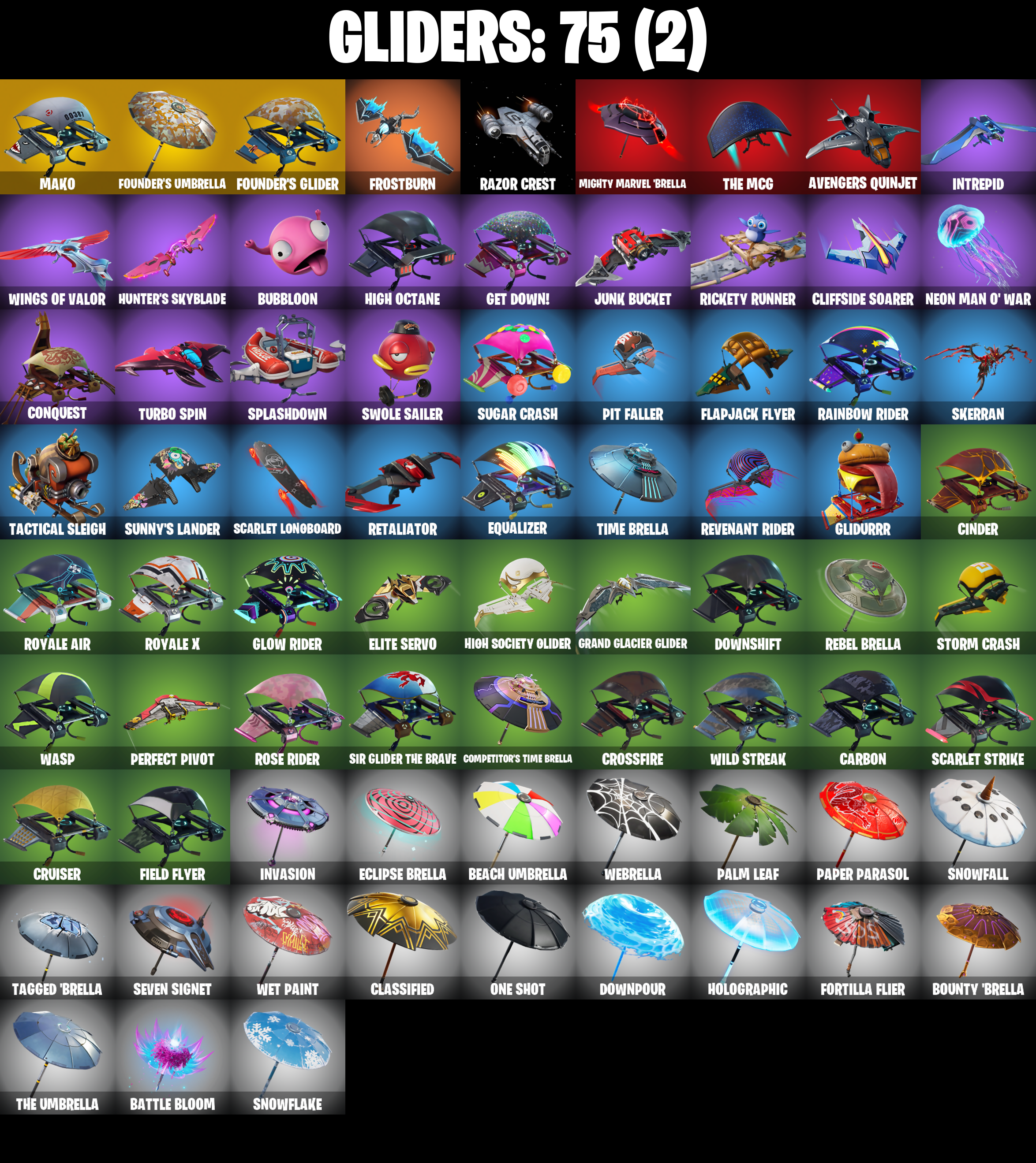 8-Ball Janky, Abominable Axe, Ac/Dc, Adira's Battle Flag, Alpine Accessories (Can), Alpine Ace (Can), Altitude, Ancestral Bloom, Apocalypse Shroud, Armory Bag, Arroyo Pack, Astro, Auto Clutch, Avengers Quinjet, Axecalibur, Backup Blades, Balloon Axe, Bandolier, Basecamp Bag, Basic Basher, Bat Royale, Battle Bloom, Battlehawk, Beach Umbrella, Beachcomber, Bedside Nanner, Best Mates, Blade of the Waning Moon, Blue Squire, Bobo, Bogey Bag, Boogie Down, Boomin', Bounty 'brella, Breakfast Bounty, Breathless Blades, Brite Bag, Brite Gunner, Bubbloon, Bunker Basher, Bunker Jonesy, Calculated, Call Me, Carbide, Carbide Armor Stage 5, Carbon, Cat Flip, Catalyst, Choice Knit, Cinder, Classified, Clawz Retro, Cliffside Soarer, Cluck Strut, Combat Wreath, Competitor's Time Brella, Conquest, Crescent Shroom, Crimson Polestar, Criss Cross, Crossfire, Crowning Achievement, Cruiser, Dark Matter, Dark Voyager, Dazzle, Destabilizer, Disco Fever, Downpour, Downshift, Doze Dab, Drift, Drift Stage 5, Dumbbell Driver, Dynamo Grav-Suit, Eclipse Brella, Elite Agent, Elite Servo, Enforcer, Equalizer, Eva, Fabled Cape, Field Flyer, Fishstick Janky, Flapjack Flyer, Flippin' Away, Flippin' Sexy, Floss, Flux Silvera, Foil Flex, Fortilla Flier, Founder's Glider, Founder's Umbrella, Free Flow, Frostburn, Frozen Axe, Gale Force, Gentleman's Dab, Get Down!, Get Funky, Glidurrr, Glorious Giftblade, Glow Rider, Go Bag, Gold Token, Golf Clap, Goodie Bag, Grand Glacier Glider, Groot's Sap Axes, Groove Jam, Gum Brawler, Gun Show, Hand Signals, Hello Friend, High Octane, High Society Glider, Holiday Boxy, Holly Hatchets, Holographic, Hot Wings, Hunter's Skyblade, Huntress, Hype, Ice Breaker, Ice Cube, Ice King (Gold), Ice Mantle, Ice Scepter, Ice-Blasted Snow Cruncher, Intrepid, Invasion, It Is Finished, It's... You?, Josie, Jubilation, Jump Jets, Junk Bucket, Kittanas, Knight's Treachery, Krisabelle, Lane Splitter, Legend's Modkit, Lock It Up, Lollipopper, Love It!, Lug Axe, Lynx, Lynx (Stage 4 - No Ponytail), Major Mancake, Make a Seat, Mako, Mancake, Mandalorian, Master Portal, Mean Streak, Mercurial, Merry Marauder, Mic Drop, Mighty Marvel 'brella, Mini Marauder, Mission Specialist, Moonwalker, Mr. Daruma, Nanner Bashers, Ne'Jari Warhammer, Neon Man O' War, Nog Ops, Nyanja's Catpak, Oblivion, Offworld Rig, Ol' Spiky, Ol' Woody, Omega, Omni-Man, Omni-Man Emblem Cape, Omni-Man's Cape, One Shot, Onesie, Onslaught, Orange Justice, Overtaker, Palm Leaf, Paper Parasol, Peace Out, Peely Whip, Perfect Pivot, Perfect Present, Pit Faller, Piñata Brian, Point It Out, Polar Peely, Pony Up, Pool Party, Popcorn, Positron, Powder, Powder Keg, Precision, Premiere Poms, Prized Llama, Pull Up, Pulse Axe, Pumpernickel, Pursuit, Rainbow Rider, Ranker's Tags, Razor Crest, Rearguard, Rebel Brella, Redline, Redmask Ranker, Reese, Regal Wave, Respect, Respect the Peace, Retaliator, Revenant Rider, Rickety Runner, Ride the Pony, Rift Edge, Ripe Rippers, Rock Out, Rocket Rodeo, Rogue Agent, Rose Glow, Rose Rider, Rose Team Leader, Rox, Rox (Stage 5), Royale Air, Royale Knight, Royale Shield, Royale X, Ruby Relic, Runway Racer, Rust Bucket, Rust Lord, Sad Trombone, Salute, Sawtooth, Say So, Scales Of Justice, Scarlet Longboard, Scarlet Strike, Scorcher, Scratchmark, Secret Scimitars, Sentinel, Seven Signet, Sgt. Winter, Sgt. Winter Headgear, Shimmer, Shooting Starstaff, Sign Spinner, Sir Glider The Brave, Skerran, Skirmish, Sledgehammer, Smash O'-Lantern, Snakebite, Snowfall, Snowflake, Snowplower, Society Emblem Ranker, Society Shield, Sparkle Specialist, Spectra Protector, Splashdown, Squad Leader, Squire Shield, Standard Issue, Stealing Wheel, Storm Crash, Stratus, Subjugator, Sugar Crash, Sun Strider, Sunny's Lander, Sweet Clementine, Sweet!, Swipe It, Swole Sailer, T-Pose, Tactical Sleigh, Tagged 'brella, Take the Cake, Take the Elf, Take the L, Teknique, The Bestiary Chest, The Destroyer's Destroyer, The Ice King, The Iconoclast, The Immortal's Head, The Mcg, The Reaper, The Rick Dance, The Robot, The Takedown, The Umbrella, The Visitor, The Worm, Throwback Axe, Time Brella, Tomoki & Katana, Trail Tote, Trog, True Love, Trusty No. 2, Turbo Spin, Twin Crossfire, U Can't C Me, Unwrapped, Uplink, Utility Claymore, Valor, Vega, Vox, Vulcan Salute, Waffler, Warpaint, Wasp, Wasteland Stoneshell, Wave, Webrella, Wet Paint, Widow's Bite, Wild Streak, Wingman, Wings Of Valor, Winterfest Bushranger, X-Lord, Yay!, You Shouldn't Have!, You're Awesome, Zany, Zenith, Zenith (Stage 4), Zoey