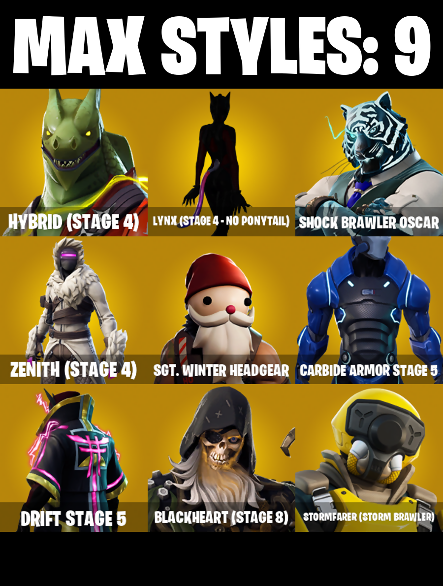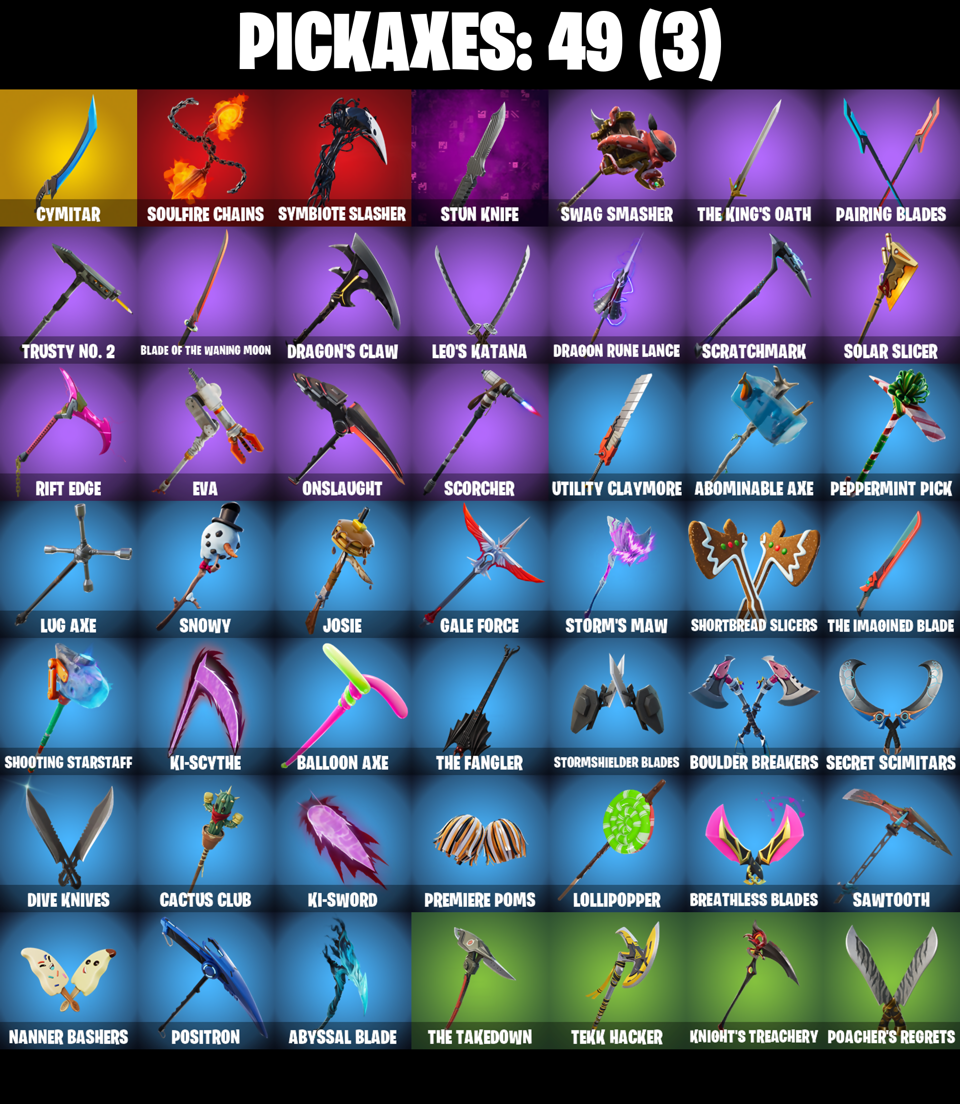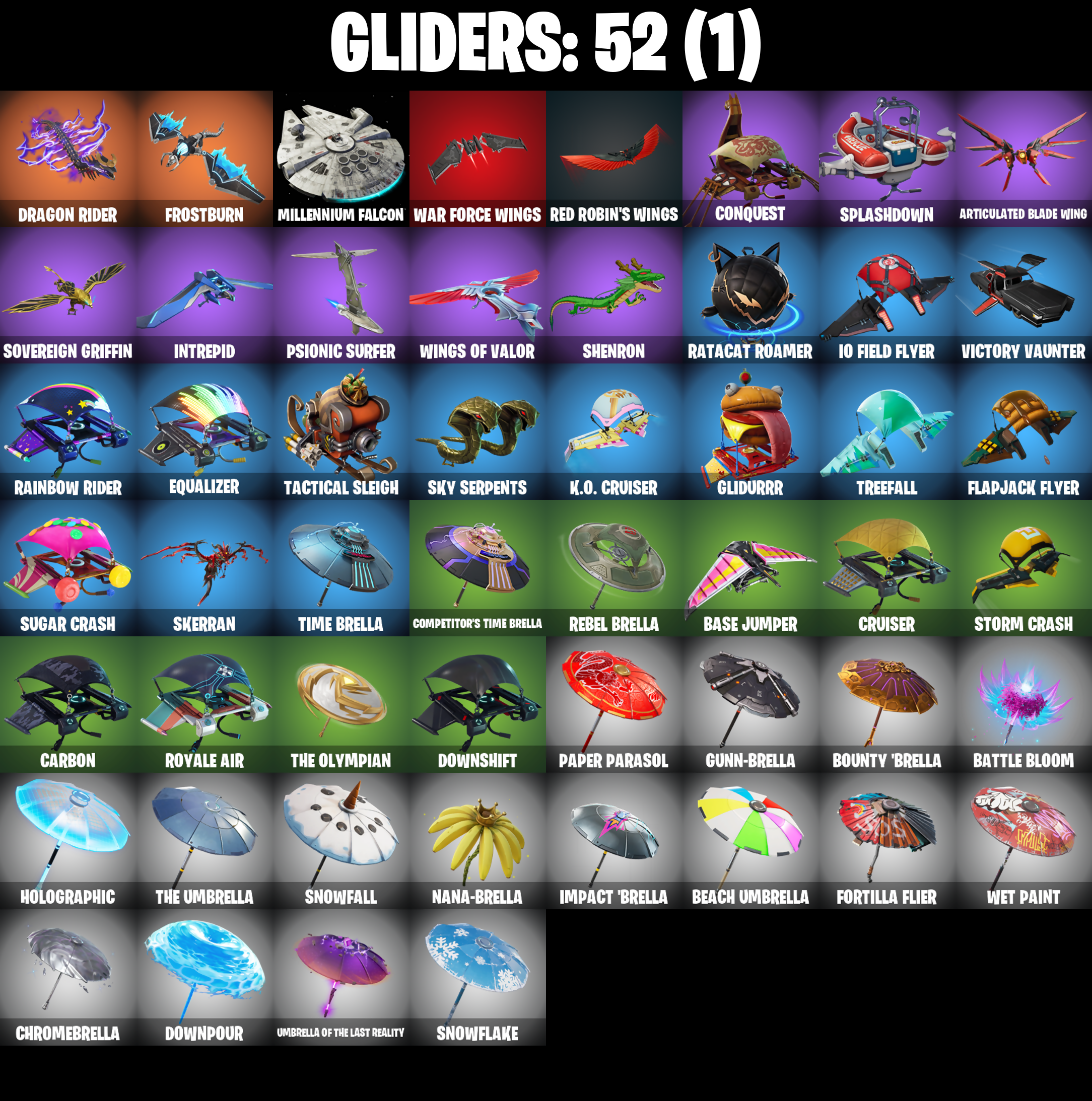 2020 Kickflip, Abominable Axe, Absenz, Abyssal Blade, Adira, Adira's Battle Flag, All Might, Altitude, Ancestral Bloom, Apocalypse Shroud, Articulated Blade Wing, Astro, Auto Clutch, Back Board, Balloon Axe, Base Jumper, Basecamp Bag, Battle Bloom, Battlehawk, Beach Umbrella, Beachcomber, Beef Boss, Ben Rodriguez, Bender Bending Rodriguez, Best Mates, Bhangra Boogie, Bim Bam Boom, Blackheart, Blackheart (Stage 8), Blade Of The Waning Moon, Blowin' Up, Boney Bounce, Boosting Ki, Boulder Breakers, Bounty 'Brella, Breathless Blades, Cactus Club, Calculated, Carbide, Carbide Armor Stage 5, Carbon, Cat Flip, Cell, Cell's Shell, Charging Up, Chow Down, Chromebrella, Clawbox, Clawz Retro, Clean Sweep, Cobalt, Cobra, Combat Wreath, Competitor's Time Brella, Conquest, Crowning Achievement, Cruiser, Cyclo Curl, Cymitar, Dagger Dance, Dark Matter, Dark Voyager, Datafiber Chargepack, Deep Dive, Deep Fried, Dive Knives, Doggo, Dominion, Downpour, Downshift, Doze Dab, Dragon Radar, Dragon Rider, Dragon Rune Lance, Dragon Stance, Dragon's Claw, Drift, Drift Stage 5, Dusk Knight, Elite Agent, Equalizer, Eva, Everybody Loves Me, Evie, Fabled Cape, Feathered Flames, Fire Vortex, Fishstick, Flame Sigil, Flaming Dual Kama, Flapjack Flyer, Flippin' Away, Fortilla Flier, Frostburn, Frying Pan, Gale Force, Gentleman's Dab, Glidurrr, Goku Black, Golf Clap, Goodie Bag, Griffin's Talon, Groove Jam, Gunn-Brella, Gwenpool's Katanas, Hadean Gate, Hello Friend, Holographic, Hope, Horde's War Wheel, Huntress, Hybrid, Hybrid (Stage 4), Hype, I'm A Mystery, IO Field Flyer, Ice-Blasted Snow Crunchem, Impact 'Brella, Incinerator Kuno, Inky Ire, Intrepid, Iron Cage, It Is Finished, It's A Vibe, Josie, Jubilation, Jumbo Popcorn, K.O. Cruiser, Kata-Pack, Ki-Scythe, Ki-Sword, Knight's Treachery, Kurohomura, Last Forever, Legend's Modkit, Leo's Katana, Leo's Saya, Leonardo, Lil Quill, Lil' Black Heart, Lollipopper, Love Lock, Lt. Evergreen, Lug Axe, Lunar Hyperjet, Lynx, Lynx (Stage 4 - No Ponytail), Malcore, Malcore Wings, Malik, Millennium Falcon, Mission Specialist, Molten Ragnarok, Moonwalker, Mutiny, Nailed It, Nana-Brella, Nanner Bashers, Offworld Rig, Omega, Onslaught, Orange Justice, Oscar, Pairing Blades, Paper Parasol, Peely Whip, Peppermint Pick, Perfect Present, Poacher's Regrets, Pony Up, Pool Party, Popcorn, Popular Vibe, Positron, Precision, Premiere Poms, Principal Nezu, Prized Llama, Psionic Surfer, Rainbow Rider, Raise The Roof, Ranker's Tags, Ratacat, Ratacat Roamer, Raven, Ravenpool, Ravenpool's Cage, Re-Gifter, Rearguard, Rebel Brella, Red Robin's Wings, Redline, Regal Wave, Reinforced Backplate, Renzo The Destroyer, Respect, Respect The Peace, Ride The Pony, Rift Edge, Roast Lord, Royale Air, Rust Bucket, Rust Lord, Ryu, Saltwater Satchel, Salute, Satoru Gojo, Sawtooth, Scorcher, Scout Regiment Salute, Scratchmark, Secret Scimitars, Sgt. Winter, Sgt. Winter Headgear, Shaolin Sip, Sharpshooter, Shenron, Shimmer, Shock Brawler Oscar, Shooting Starstaff, Shortbread Slicers, Shredder, Skerran, Sky Serpents, Sledgehammer, Snap, Snowfall, Snowflake, Snowshaker, Snowy, So Square, Solar Slicer, Soulfire Chains, Sovereign Griffin, Spectra Protector, Splashdown, Squad Leader, Standard Issue, Steady, Storm Crash, Storm's Maw, Stormfarer, Stormfarer (Storm Brawler), Stormshielder Blades, Stun Knife, Sugar Crash, Sultura, Summit Striker, Sun Strider, Supernova Ranker, Swag Smasher, Sweet Selection, Swipe It, Symbiote Slasher, Tactical Sleigh, Take The Elf, Take The L, Tekk Hacker, Tekk Pack, Teknique, Tendril Tote, The Fangler, The Giant Chicken, The Imagined Blade, The King's Oath, The Olympian, The Reaper, The Renegade, The Robot, The Sith, The Squabble, The Stormfarer's Cloak, The Takedown, The Umbrella, The Visitor, Time Brella, Tire Fire, Top Notch, Tover, Trail Tote, Training Bag, Treefall, Trusty No. 2, Twin Crossfire, Umbrella of the Last Reality, Uplink, Utility Claymore, Valor, Vengeance Jones, Venom, Victory Vaunter, War Force Wings, Wave, Wet Paint, Wings of Valor, Without You, Wooly Warrior, Xenomorph, Xenomorph Tail, Yay!, You're A Winner, You're Awesome, Zenith, Zenith (Stage 4), Zoey