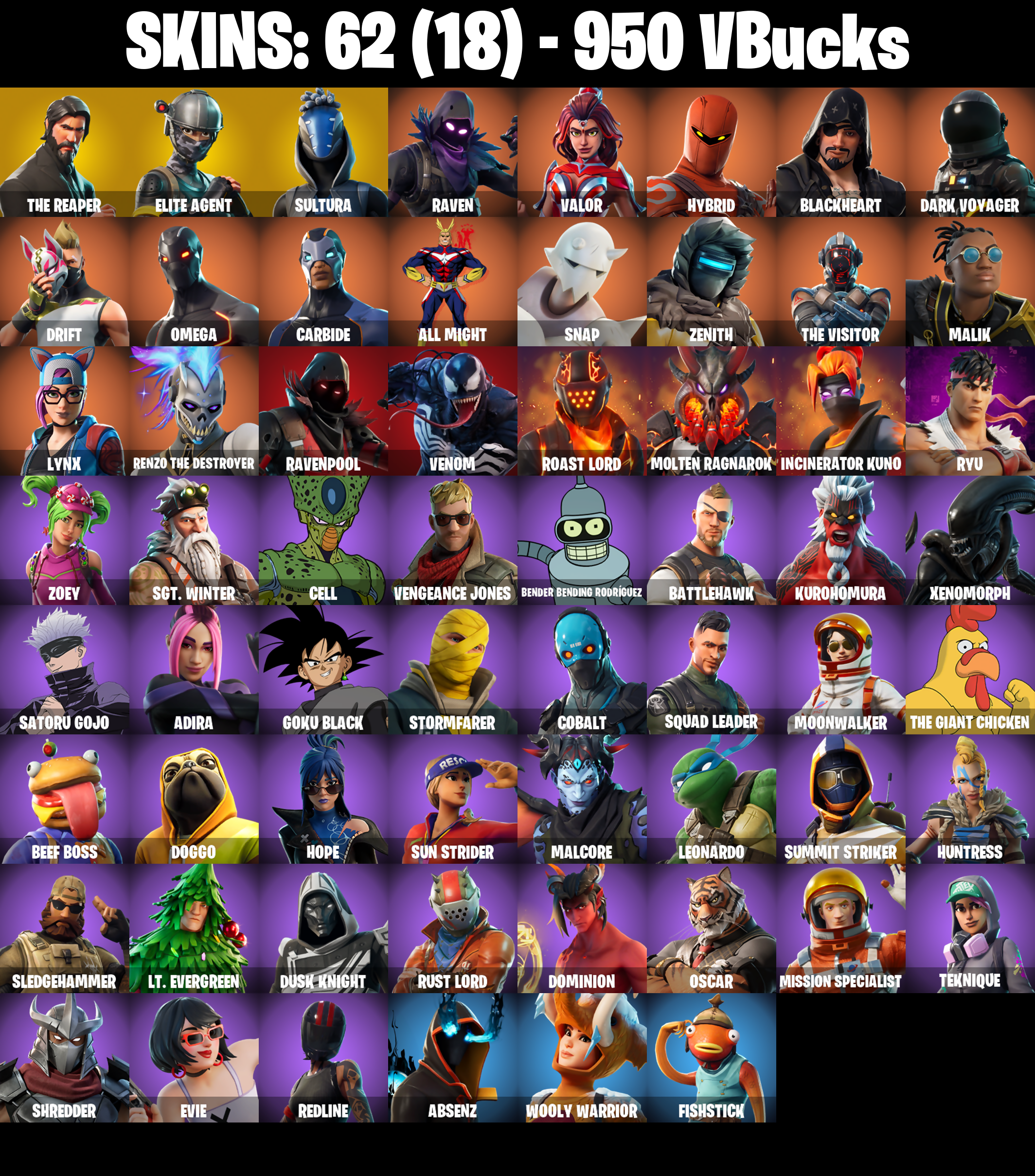 PC/PSN/XBOX |62 skins | Ryu | Satoru Gojo | The Reaper | Elite Agent | Omega | Take The L | Orange Justice | Dark Voyager | Drift | Carbide | #B1059