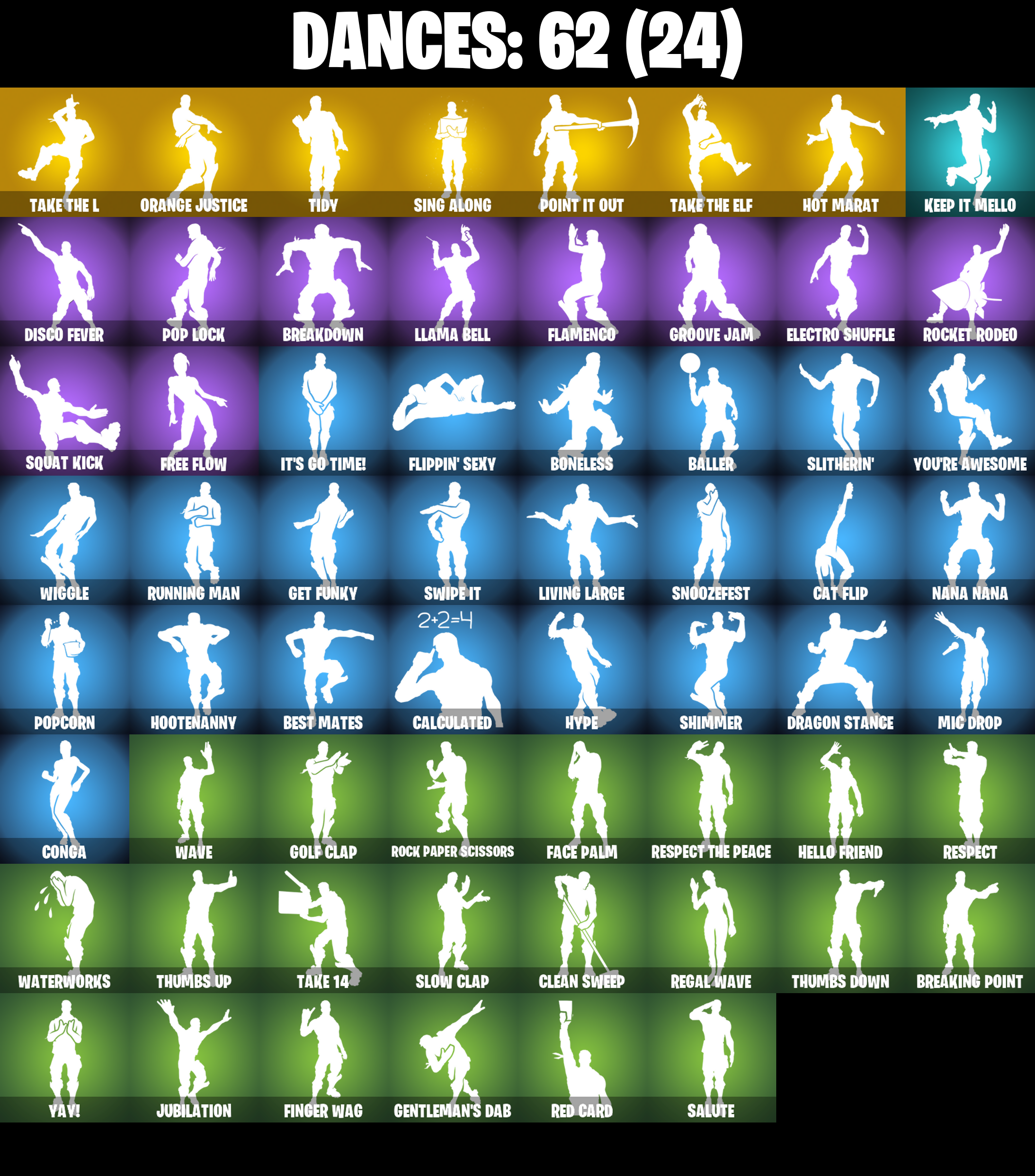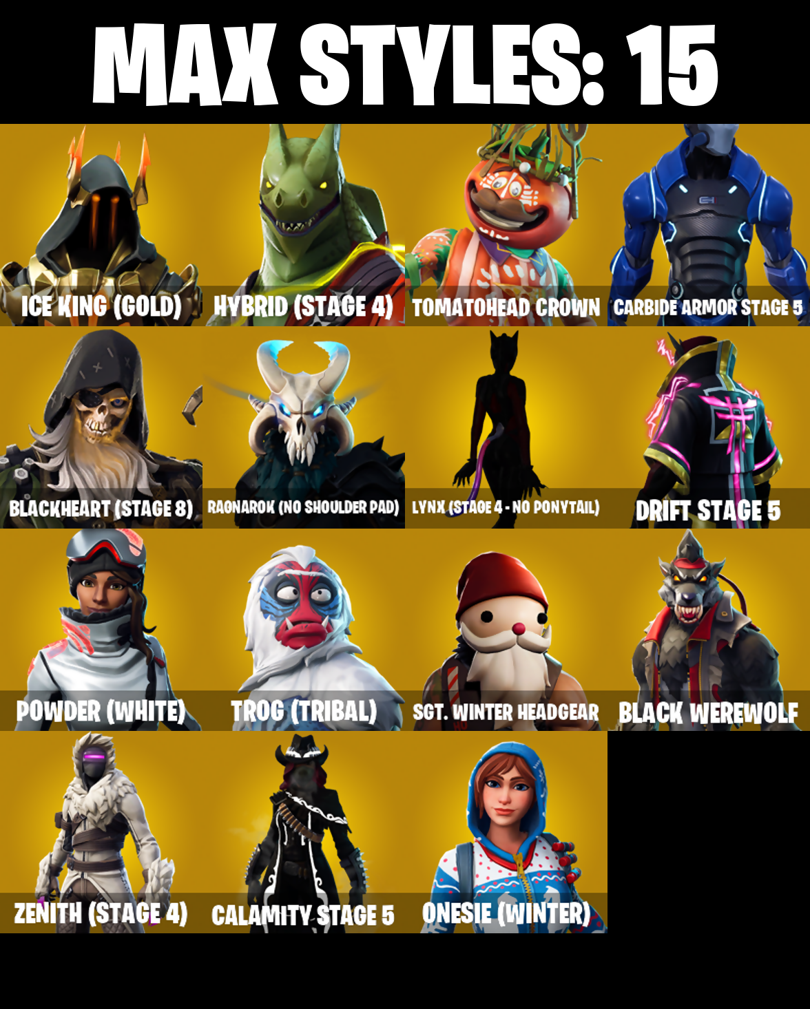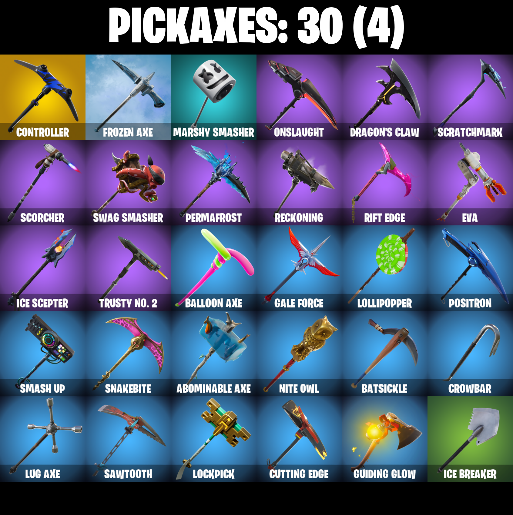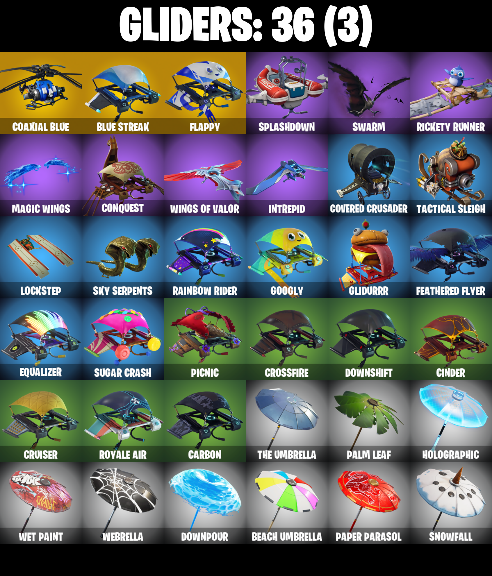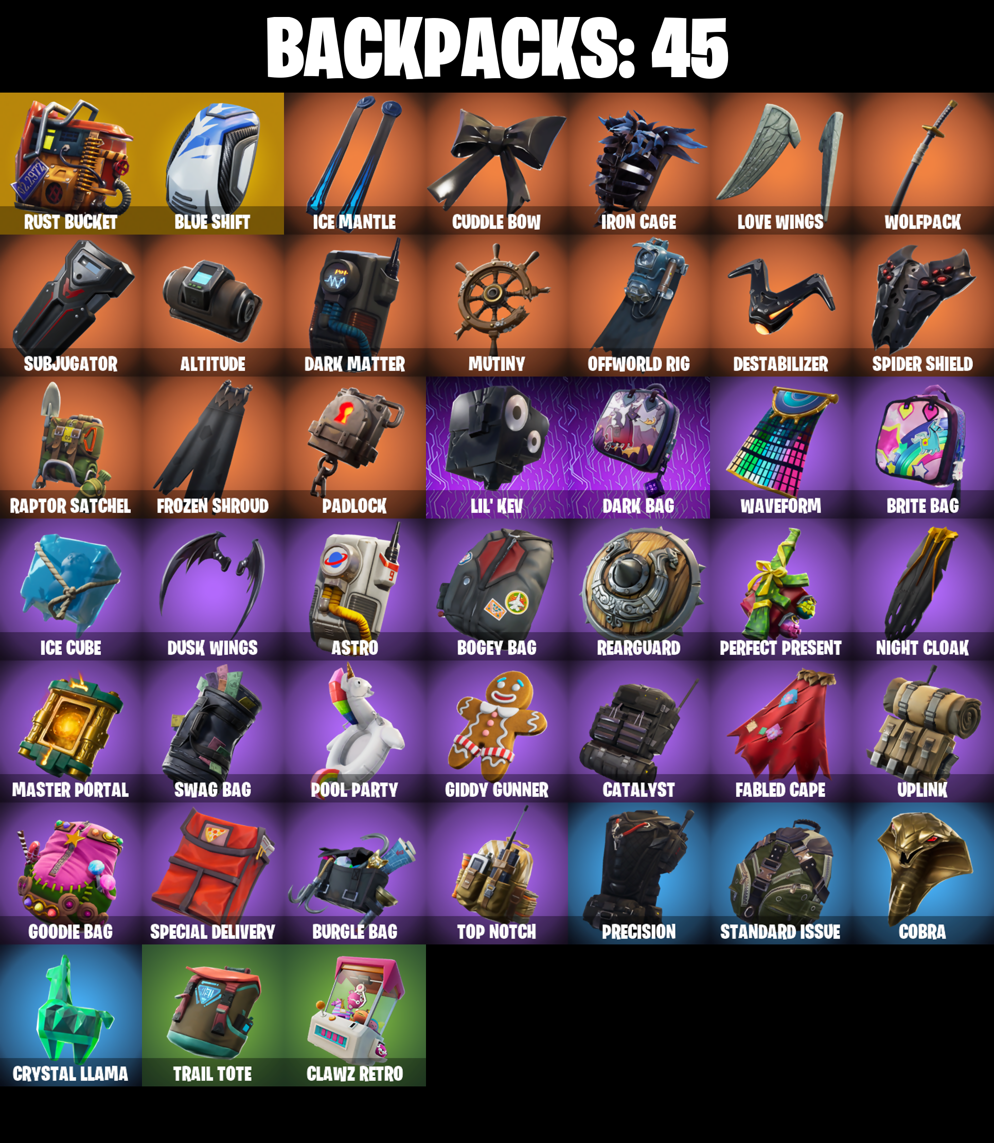 Abominable Axe, Altitude, Astro, Baller, Balloon Axe, Batsickle, Battlehawk, Beach Umbrella, Best Mates, Black Werewolf, Blackheart, Blackheart (Stage 8), Blue Shift, Blue Streak, Blue Striker, Blue Team Leader, Bogey Bag, Boneless, Breakdown, Breaking Point, Brite Bag, Brite Bomber, Brite Gunner, Burgle Bag, Calamity, Calamity Stage 5, Calculated, Carbide, Carbide Armor Stage 5, Carbon, Cat Flip, Catalyst, Cinder, Clawz Retro, Clean Sweep, Coaxial Blue, Cobra, Commando, Conga, Conquest, Controller, Covered Crusader, Crossfire, Crowbar, Cruiser, Crystal Llama, Cuddle Bow, Cuddle Team Leader, Cutting Edge, DJ Yonder, Dark Bag, Dark Bomber, Dark Matter, Dark Voyager, Destabilizer, Dire, Disco Fever, Downpour, Downshift, Dragon Stance, Dragon's Claw, Drift, Drift Stage 5, Dusk, Dusk Wings, Electro Shuffle, Elite Agent, Enforcer, Equalizer, Eva, Fable, Fabled Cape, Face Palm, Feathered Flyer, Finger Wag, Flamenco, Flappy, Flippin' Sexy, Free Flow, Frozen Axe, Frozen Shroud, Gale Force, Gentleman's Dab, Get Funky, Giddy Gunner, Giddy-Up, Ginger Gunner, Glidurrr, Golf Clap, Goodie Bag, Googly, Groove Jam, Guiding Glow, Hello Friend, Holographic, Hootenanny, Hot Marat, Huntress, Hybrid, Hybrid (Stage 4), Hype, Ice Breaker, Ice Cube, Ice King (Gold), Ice Mantle, Ice Scepter, Intrepid, Iron Cage, It's Go Time!, Jubilation, Keep It Mello, Lil' Kev, Living Large, Llama Bell, Lockpick, Lockstep, Lollipopper, Love Ranger, Love Wings, Lug Axe, Lynx, Lynx (Stage 4 - No Ponytail), Magic Wings, Marshy Smasher, Master Portal, Mic Drop, Mission Specialist, Moonwalker, Mutiny, Nana Nana, Night Cloak, Nightshade, Nite Owl, Nitelite, Nog Ops, Oblivion, Offworld Rig, Omega, Onesie, Onesie (Winter), Onslaught, Orange Justice, Padlock, Palm Leaf, Paper Parasol, Peely, Perfect Present, Permafrost, Picnic, Point It Out, Pool Party, Pop Lock, Popcorn, Positron, Powder, Powder (White), Precision, Ragnarok, Ragnarok (No Shoulder Pad), Rainbow Rider, Rapscallion, Raptor, Raptor Satchel, Raven, Rearguard, Reckoning, Red Card, Redline, Regal Wave, Respect, Respect The Peace, Rickety Runner, Rift Edge, Rock Paper Scissors, Rocket Rodeo, Rogue Agent, Rook, Royale Air, Running Man, Rust Bucket, Rust Lord, Salute, Sawtooth, Scorcher, Scratchmark, Sgt. Winter, Sgt. Winter Headgear, Shimmer, Sidewinder, Sing Along, Sky Serpents, Sledgehammer, Slitherin', Slow Clap, Smash Up, Snakebite, Snoozefest, Snowfall, Special Delivery, Spider Knight, Spider Shield, Splashdown, Squad Leader, Squat Kick, Standard Issue, Subjugator, Sugar Crash, Summit Striker, Sun Strider, Swag Bag, Swag Smasher, Swarm, Swipe It, Tactical Sleigh, Take 14, Take The Elf, Take The L, Teknique, The Ace, The Ice King, The Prisoner, The Umbrella, The Visitor, Thumbs Down, Thumbs Up, Tidy, Tomatohead, Tomatohead Crown, Top Notch, Trail Tote, Triple Threat, Trog, Trog (Tribal), Trusty No. 2, Uplink, Valor, Waterworks, Wave, Waveform, Webrella, Wet Paint, Whiplash, Wiggle, Wingman, Wings of Valor, Wolfpack, Yay!, You're Awesome, Zenith, Zenith (Stage 4), Zoey