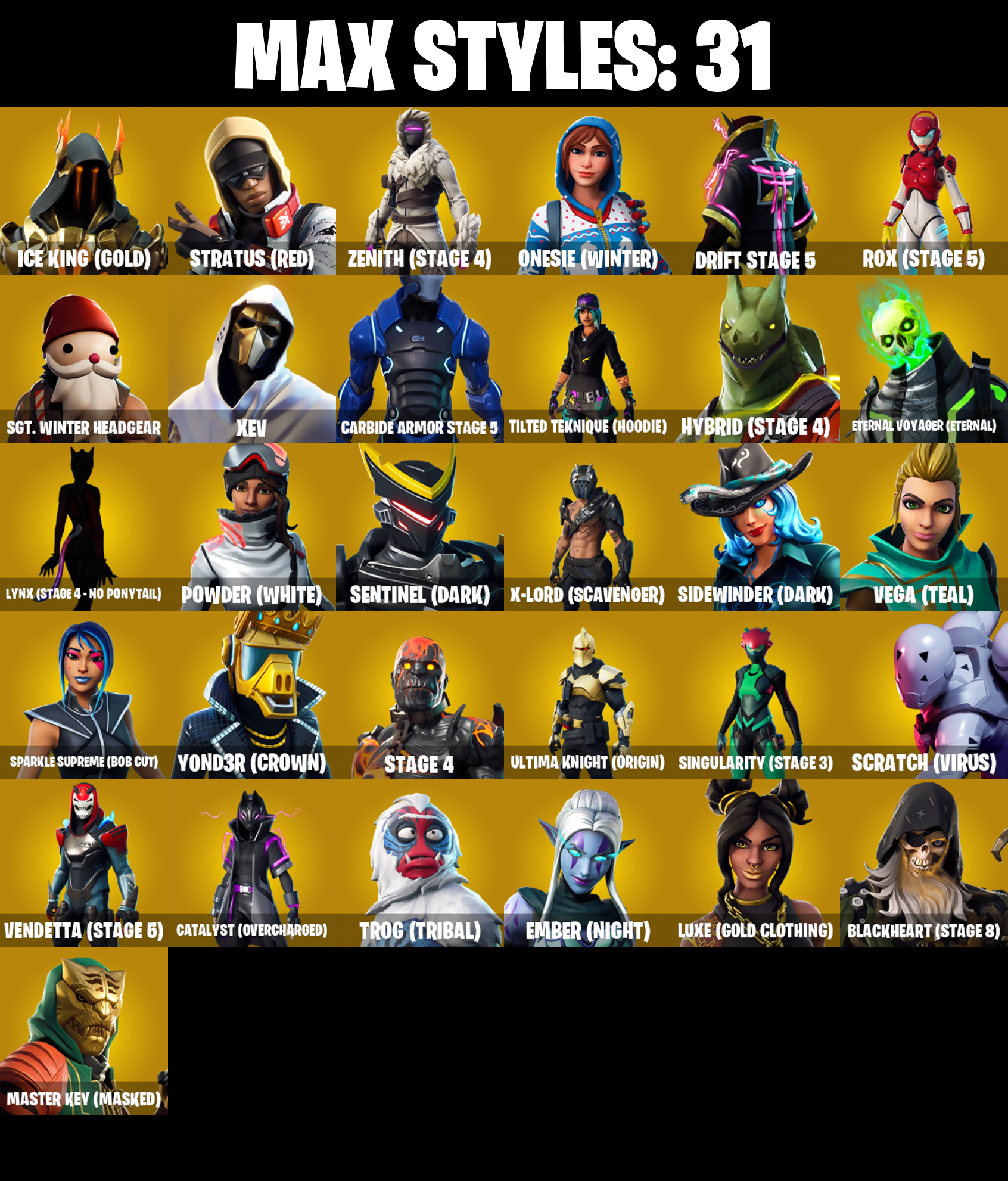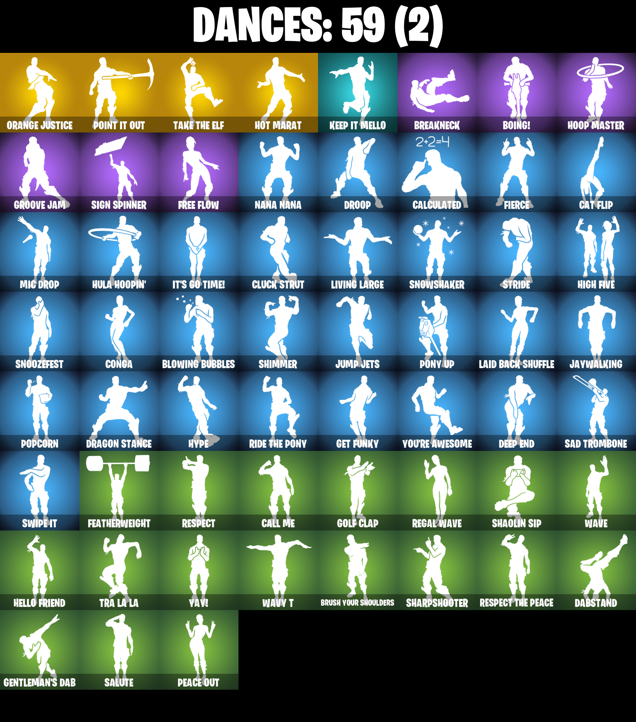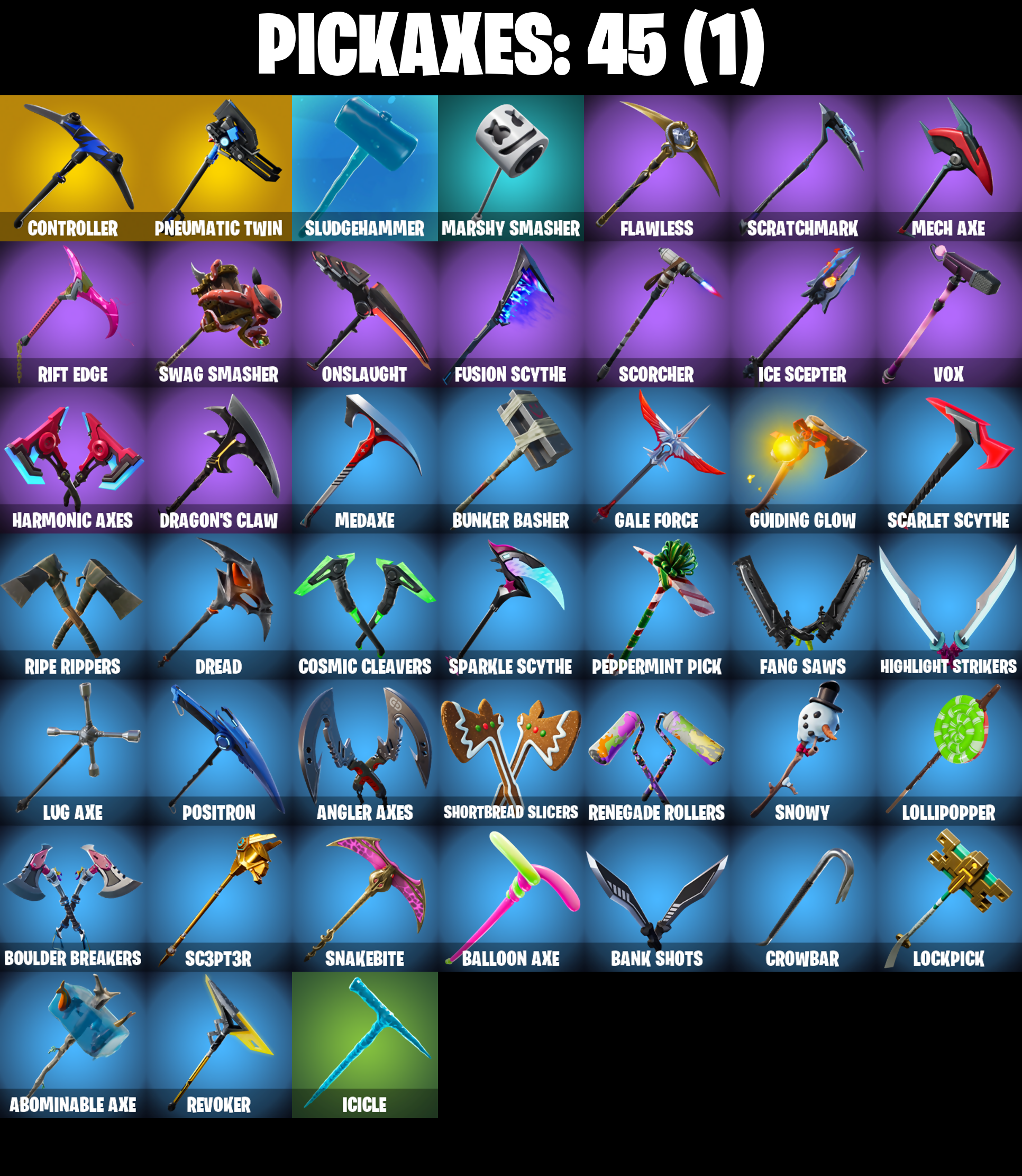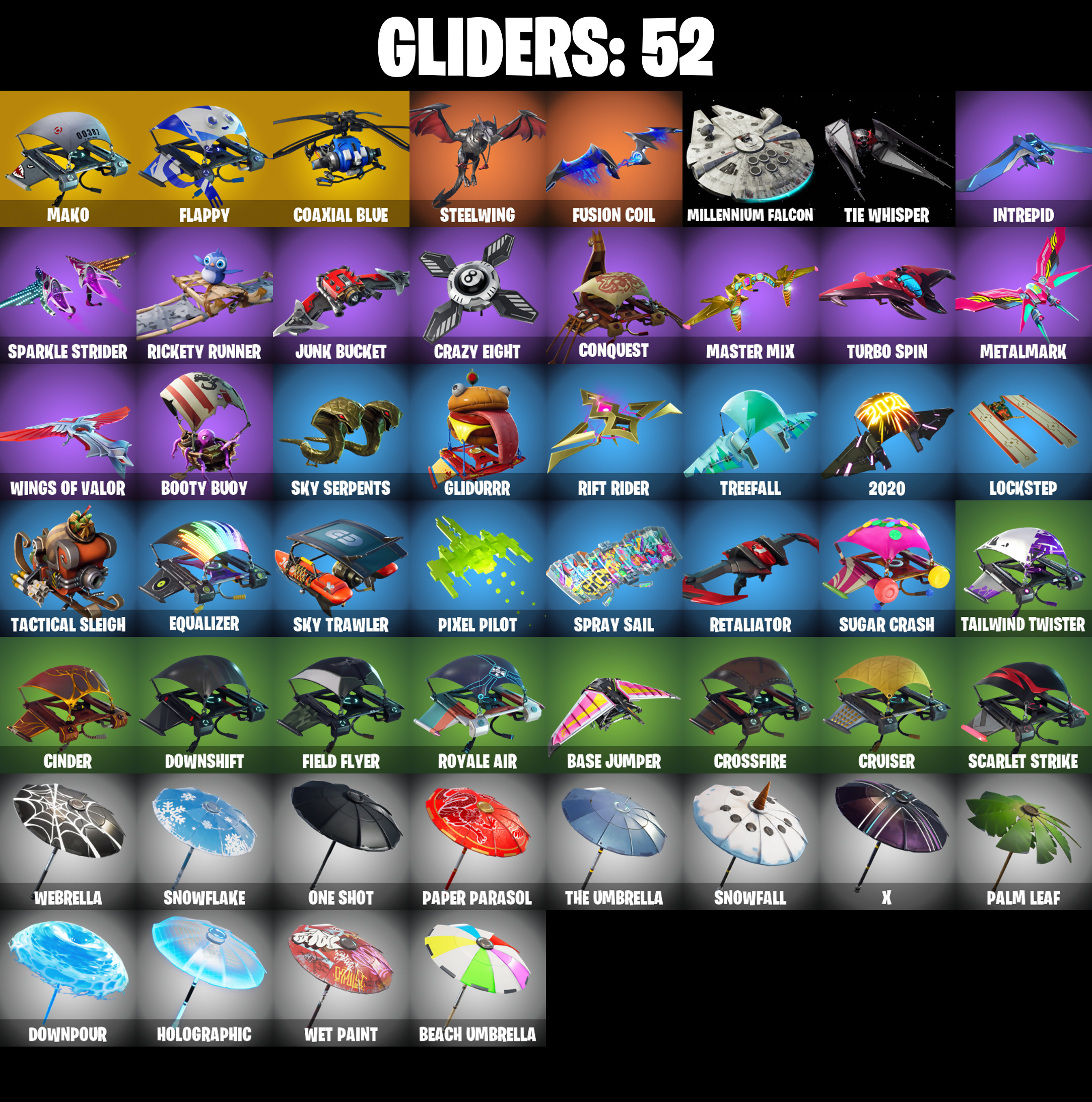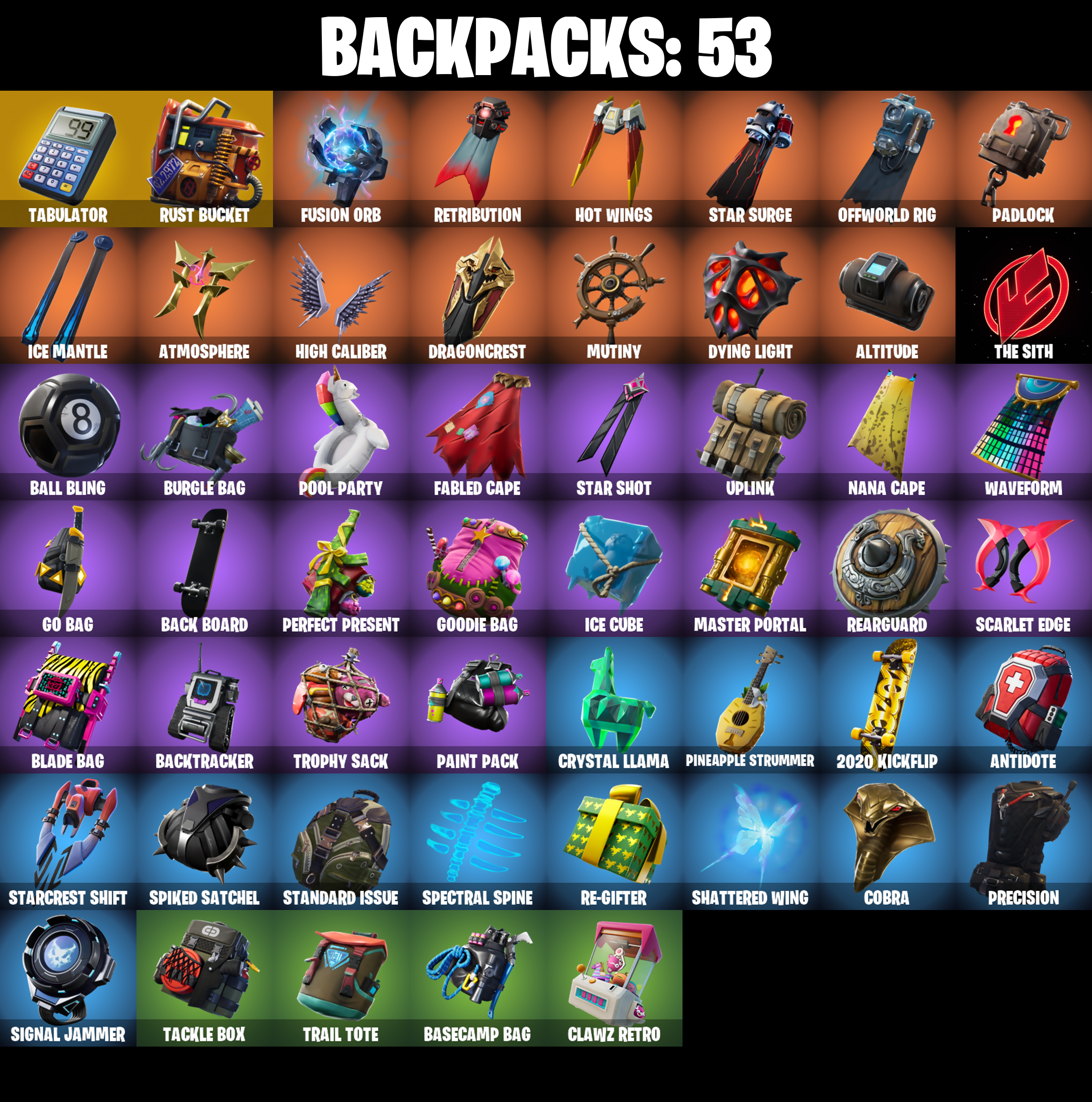 2020, 2020 Kickflip, 8-Ball Vs Scratch, Abominable Axe, Altitude, Angler Axes, Antidote, Atmosphere, Back Board, Backtracker, Ball Bling, Balloon Axe, Bank Shots, Base Jumper, Basecamp Bag, Battlehawk, Beach Umbrella, Blackheart, Blackheart (Stage 8), Blade Bag, Blowing Bubbles, Boing!, Booty Buoy, Boulder Breakers, Breakneck, Breakpoint, Brush Your Shoulders, Bullseye, Bunker Basher, Bunker Jonesy, Burgle Bag, Calculated, Call Me, Cameo Vs Chic, Carbide, Carbide Armor Stage 5, Cat Flip, Catalyst, Catalyst (Overcharged), Cinder, Clawz Retro, Cluck Strut, Coaxial Blue, Cobra, Conga, Conquest, Controller, Cosmic Cleavers, Crazy Eight, Crossfire, Crowbar, Cruiser, Cryptic, Crystal Llama, Dabstand, Deep End, Demi, Downpour, Downshift, Dragon Stance, Dragon's Claw, Dragoncrest, Dread, Dream, Drift, Drift Stage 5, Droop, Dying Light, Ember, Ember (Night), Equalizer, Eternal Voyager, Eternal Voyager (Eternal), Fabled Cape, Fang Saws, Featherweight, Field Flyer, Fierce, Flappy, Flawless, Free Flow, Fusion, Fusion Coil, Fusion Orb, Fusion Scythe, Gale Force, Gentleman's Dab, Get Funky, Glidurrr, Go Bag, Golf Clap, Goodie Bag, Groove Jam, Guiding Glow, Harmonic Axes, Hello Friend, High Caliber, High Five, Highlight Strikers, Holographic, Hoop Master, Hot Marat, Hot Wings, Hula Hoopin', Huntress, Hybrid, Hybrid (Stage 4), Hype, Ice Cube, Ice King (Gold), Ice Mantle, Ice Scepter, Icicle, Intrepid, It's Go Time!, Jaywalking, Journey Vs Hazard, Jump Jets, Junk Bucket, Keep It Mello, Laguna, Laid Back Shuffle, Liteshow, Living Large, Lockpick, Lockstep, Lollipopper, Lt. Evergreen, Lug Axe, Luxe, Luxe (Gold Clothing), Lynx, Lynx (Stage 4 - No Ponytail), Mako, Marked Marauder, Marshy Smasher, Master Key, Master Key (Masked), Master Mix, Master Portal, Mech Axe, Medaxe, Metalmark, Mic Drop, Millennium Falcon, Mutiny, Nana Cape, Nana Nana, Offworld Rig, Omega, One Shot, Onesie, Onesie (Winter), Onslaught, Orange Justice, Padlock, Paint Pack, Palm Leaf, Paper Parasol, Peace Out, Peely, Peppermint Pick, Perfect Present, Pineapple Strummer, Pixel Pilot, Pneumatic Twin, Point It Out, Pony Up, Pool Party, Popcorn, Positron, Powder, Powder (White), Precision, Prodigy, Rapscallion, Re-Gifter, Rearguard, Recon Ranger, Redline, Regal Wave, Remedy Vs Toxin, Renegade Rollers, Respect, Respect The Peace, Retaliator, Retribution, Revoker, Rickety Runner, Ride The Pony, Rift Edge, Rift Rider, Ripe Rippers, Rippley Vs Sludge, Rox, Rox (Stage 5), Royale Air, Ruin, Rust Bucket, Sad Trombone, Salute, Sc3pt3r, Scarlet Edge, Scarlet Scythe, Scarlet Strike, Scorcher, Scratch (Virus), Scratchmark, Sentinel, Sentinel (Dark), Sgt. Winter, Sgt. Winter Headgear, Shaolin Sip, Sharpshooter, Shattered Wing, Shimmer, Shortbread Slicers, Sidewinder, Sidewinder (Dark), Sign Spinner, Signal Jammer, Singularity, Singularity (Stage 3), Sky Serpents, Sky Trawler, Sledgehammer, Sludgehammer, Snakebite, Snoozefest, Snowfall, Snowflake, Snowshaker, Snowy, Sparkle Scythe, Sparkle Strider, Sparkle Supreme, Sparkle Supreme (Bob Cut), Spectral Spine, Spiked Satchel, Spray Sail, Squad Leader, Stage 4, Standard Issue, Star Shot, Star Surge, Starcrest Shift, Steelwing, Stratus, Stratus (Red), Stride, Sugar Crash, Sun Strider, Swag Smasher, Swipe It, Tabulator, Tackle Box, Tactical Sleigh, Tailwind Twister, Take The Elf, Teknique, The Ice King, The Prisoner, The Sith, The Umbrella, The Visitor, Tie Whisper, Tilted Teknique, Tilted Teknique (Hoodie), Tra La La, Trail Tote, Treefall, Trog, Trog (Tribal), Trophy Sack, Turbo Spin, Turk Vs Riptide, Ultima Knight, Ultima Knight (Origin), Uplink, Valor, Vega, Vega (Teal), Vendetta, Vendetta (Stage 6), Vox, Wave, Waveform, Wavy T, Webrella, Wet Paint, Wings Of Valor, Wooly Warrior, X, X-Lord, X-Lord (Scavenger), Xev, Y0nd3r, Yay!, Yond3r (Crown), You're Awesome, Zenith, Zenith (Stage 4), Zoey