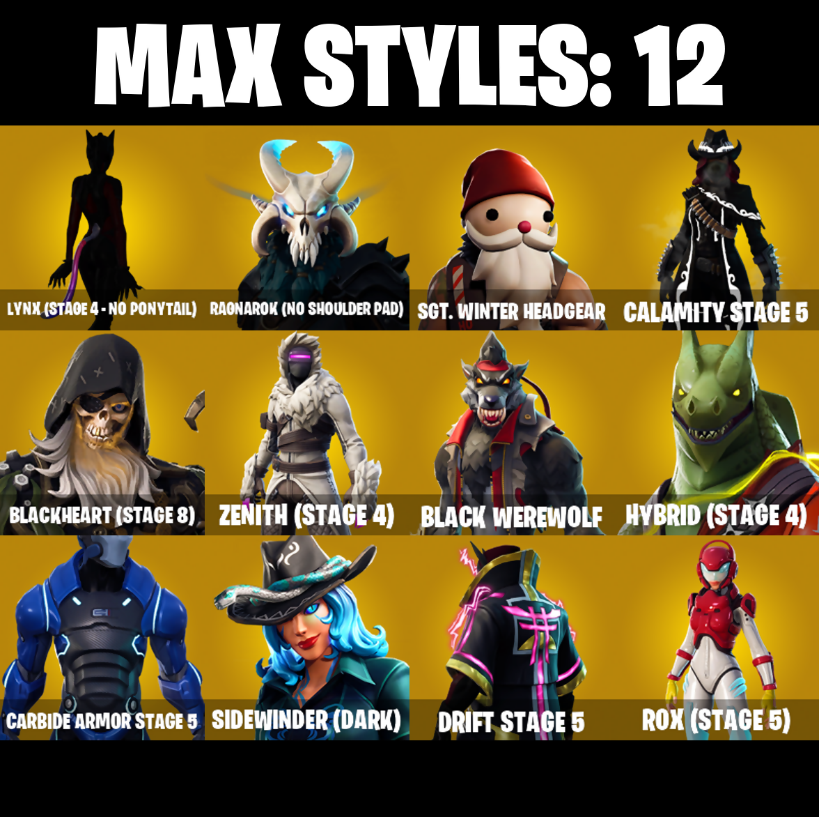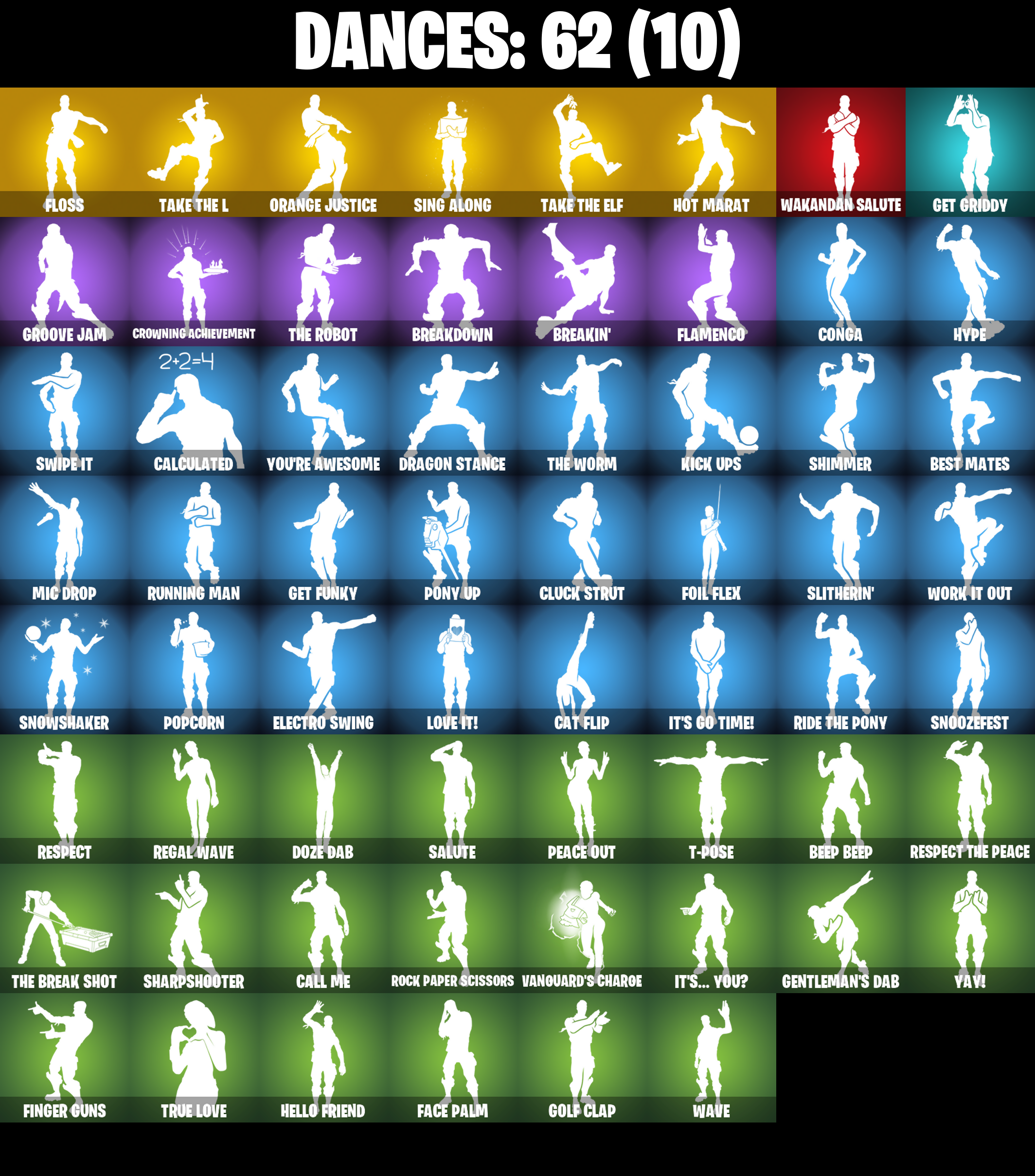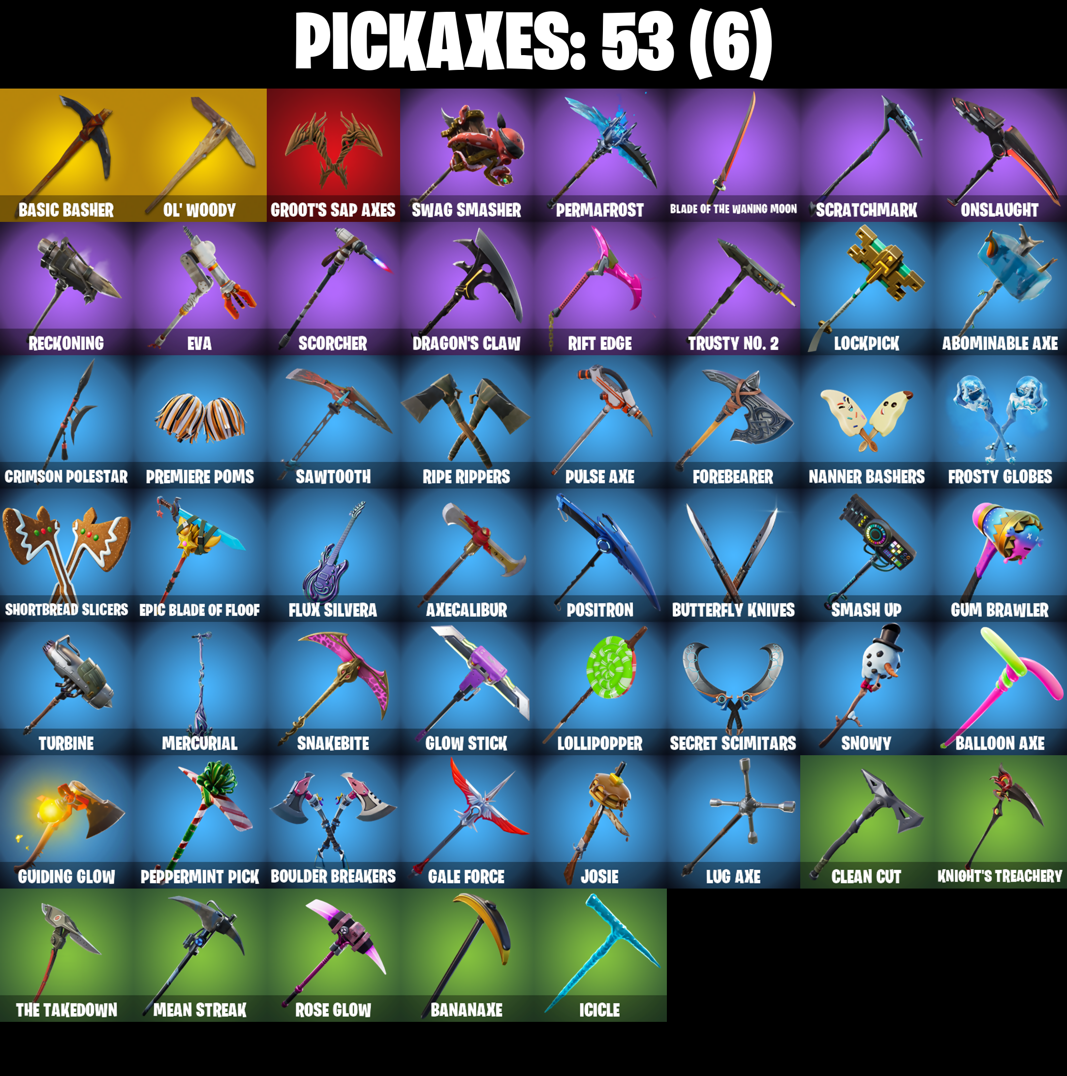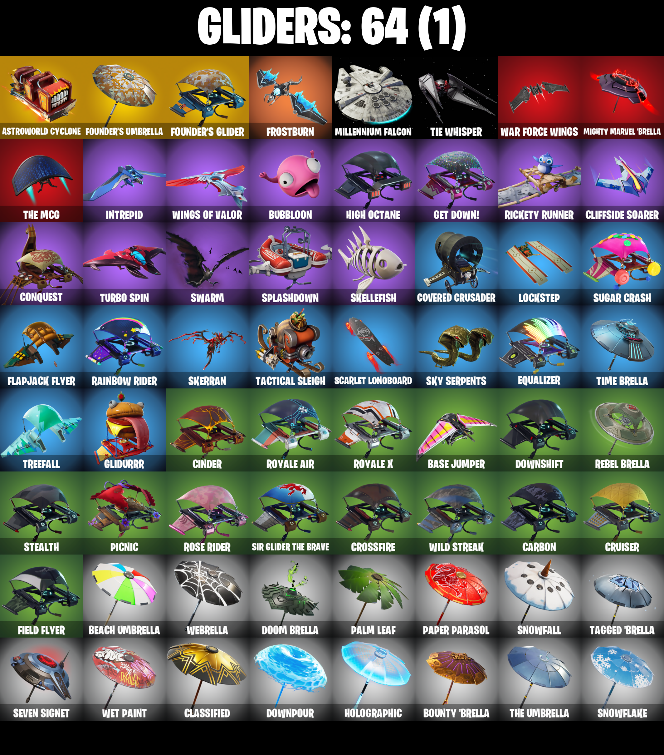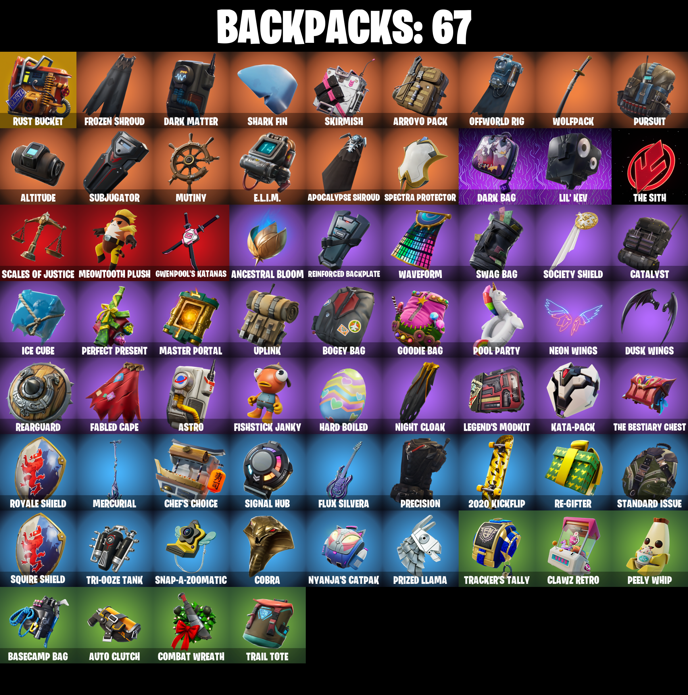 2020 Kickflip, A.I.M., Abominable Axe, Altitude, Ancestral Bloom, Apocalypse Shroud, Arroyo Pack, Astro, Astroworld Cyclone, Auto Clutch, Axecalibur, Balloon Axe, Bananaxe, Base Jumper, Basecamp Bag, Basic Basher, Battlehawk, Beach Umbrella, Beep Beep, Best Mates, Black Werewolf, Blackheart, Blackheart (Stage 8), Blade Of The Waning Moon, Blue Squire, Bogey Bag, Boulder Breakers, Bounty 'Brella, Breakdown, Breakin', Bubbloon, Bunker Jonesy, Butterfly Knives, Calamity, Calamity Stage 5, Calculated, Call Me, Carbide, Carbide Armor Stage 5, Carbon, Cat Flip, Catalyst, Chef's Choice, Chomp Sr., Cinder, Classified, Clawz Retro, Clean Cut, Cliffside Soarer, Cluck Strut, Cobalt, Cobra, Combat Wreath, Conga, Conquest, Covered Crusader, Crimson Polestar, Crossfire, Crowning Achievement, Cruiser, DJ Yonder, Dark Bag, Dark Bomber, Dark Matter, Dark Voyager, Dire, Doom Brella, Downpour, Downshift, Doze Dab, Dragon Stance, Dragon's Claw, Drift, Drift Stage 5, Dusk, Dusk Wings, E.L.I.M., Electro Swing, Elite Agent, Enforcer, Epic Blade Of Floof, Equalizer, Eva, Fable, Fabled Cape, Face Palm, Field Flyer, Finger Guns, Fishstick Janky, Flamenco, Flapjack Flyer, Floss, Flux Silvera, Foil Flex, Forebearer, Founder's Glider, Founder's Umbrella, Frostburn, Frosty Globes, Frozen Shroud, Gale Force, Gentleman's Dab, Get Down!, Get Funky, Get Griddy, Giddy-Up, Glidurrr, Glow Stick, Golf Clap, Goodie Bag, Groot's Sap Axes, Groove Jam, Guiding Glow, Gum Brawler, Gwenpool's Katanas, Hard Boiled, Hello Friend, High Octane, Holographic, Hot Marat, Huntress, Hybrid, Hybrid (Stage 4), Hype, Ice Cube, Icicle, Intrepid, It's Go Time!, It's... You?, Josie, Kata-Pack, Kick Ups, Knight's Treachery, Legend's Modkit, Lil' Kev, Liteshow, Lockpick, Lockstep, Lollipopper, Love It!, Lt. Evergreen, Lug Axe, Lynx, Lynx (Stage 4 - No Ponytail), Master Portal, Mean Streak, Meowtooth Plush, Mercurial, Mic Drop, Mighty Marvel 'Brella, Millennium Falcon, Mission Specialist, Moonwalker, Mutiny, Nanner Bashers, Neon Wings, Night Cloak, Nightshade, Nyanja's Catpak, Offworld Rig, Ol' Woody, Omega, Onesie, Onslaught, Orange Justice, Palm Leaf, Paper Parasol, Peace Out, Peely, Peely Whip, Peppermint Pick, Perfect Present, Permafrost, Picnic, Plastic Patroller, Pony Up, Pool Party, Popcorn, Positron, Powder, Precision, Premiere Poms, Prized Llama, Pulse Axe, Pursuit, Rabbit Raider, Ragnarok, Ragnarok (No Shoulder Pad), Rainbow Rider, Re-Gifter, Rearguard, Rebel Brella, Reckoning, Redline, Regal Wave, Reinforced Backplate, Respect, Respect The Peace, Rickety Runner, Ride The Pony, Rift Edge, Ripe Rippers, Rock Paper Scissors, Rogue Agent, Rook, Rose Glow, Rose Rider, Rose Team Leader, Rox, Rox (Stage 5), Royale Air, Royale Knight, Royale Shield, Royale X, Running Man, Rust Bucket, Rust Lord, Salute, Sawtooth, Scales of Justice, Scarlet Longboard, Scorcher, Scorpion, Scratchmark, Secret Scimitars, Sentinel, Seven Signet, Sgt. Winter, Sgt. Winter Headgear, Shark Fin, Sharpshooter, Shimmer, Shortbread Slicers, Sidewinder, Sidewinder (Dark), Signal Hub, Sing Along, Sir Glider The Brave, Skellefish, Skerran, Skirmish, Sky Serpents, Sledgehammer, Slitherin', Smash Up, Snakebite, Snap-A-Zoomatic, Snoozefest, Snowfall, Snowflake, Snowshaker, Snowy, Society Shield, Sparkle Specialist, Spectra Protector, Splashdown, Squad Leader, Squire Shield, Standard Issue, Stealth, Subjugator, Sugar Crash, Sun Strider, Sushi Master, Swag Bag, Swag Smasher, Swarm, Swipe It, T-Pose, Tactical Sleigh, Tagged 'Brella, Take The Elf, Take The L, Teknique, The Ace, The Bestiary Chest, The Break Shot, The McG, The Reaper, The Robot, The Sith, The Takedown, The Umbrella, The Visitor, The Worm, Tie Whisper, Time Brella, Tracker's Tally, Trail Tote, Treefall, Tri-Ooze Tank, Trog, True Love, Trusty No. 2, Turbine, Turbo Spin, Uplink, Valor, Vanguard's Charge, Wakandan Salute, War Force Wings, Warpaint, Wave, Waveform, Waypoint, Webrella, Wet Paint, Wild Streak, Wingman, Wings Of Valor, Wolfpack, Wooly Warrior, Work It Out, X-Lord, Yay!, You're Awesome, Zenith, Zenith (Stage 4), Zoey