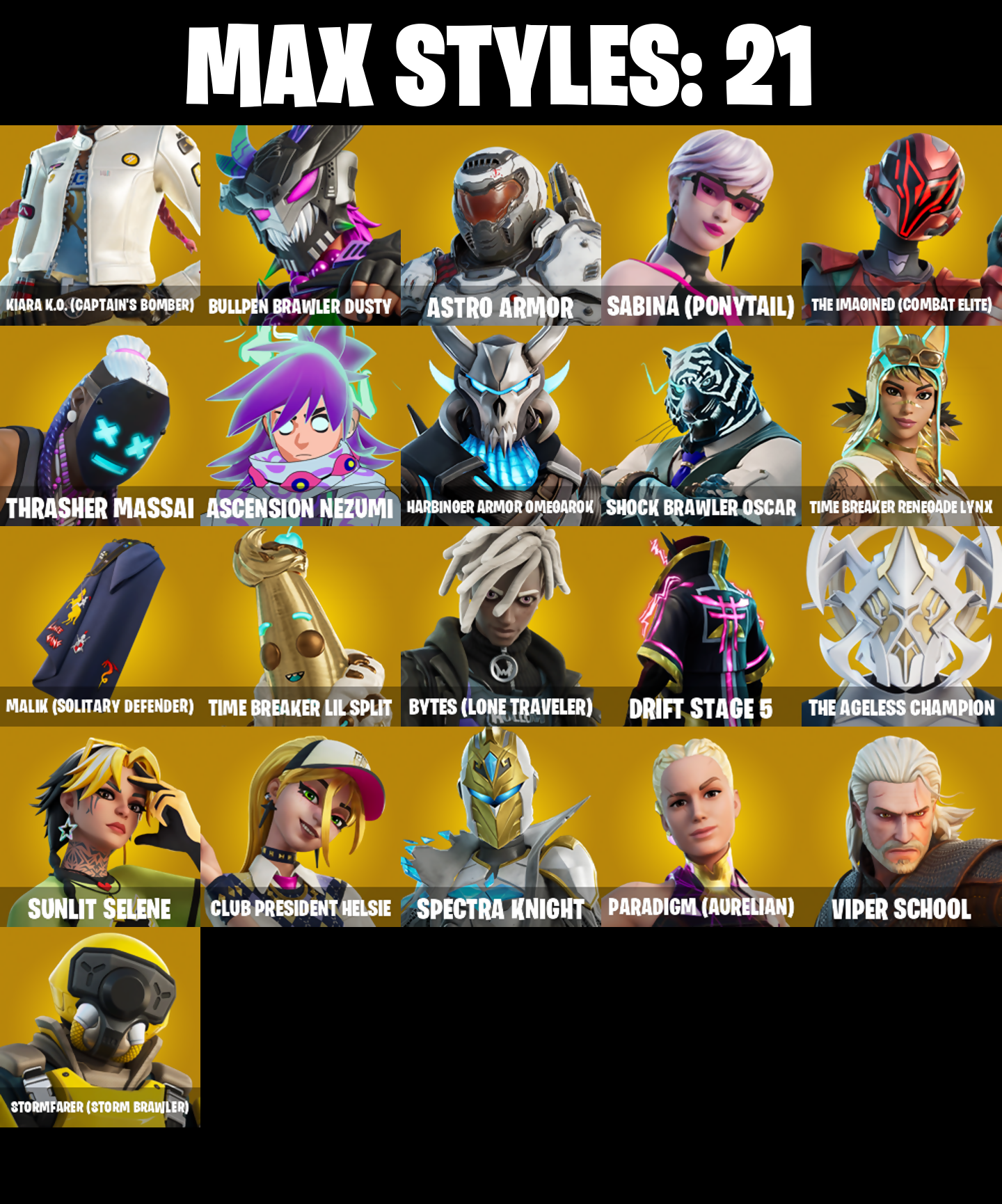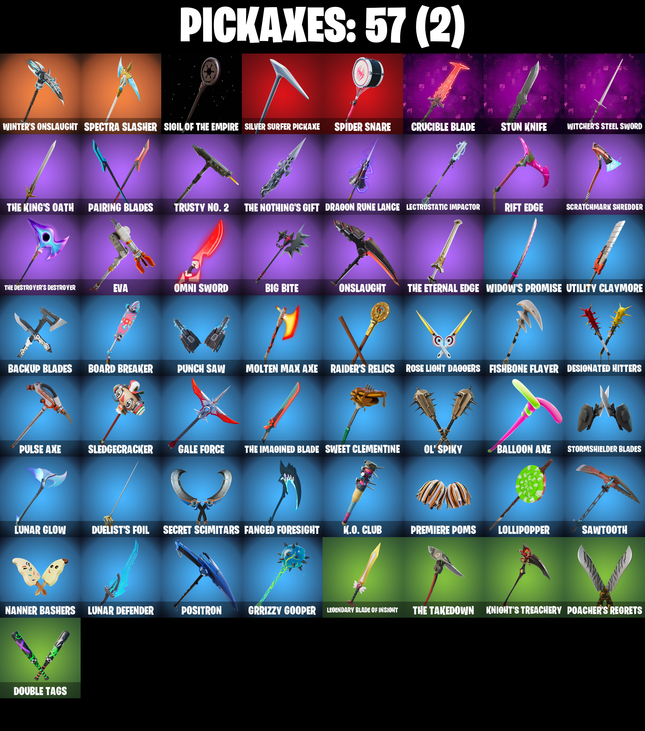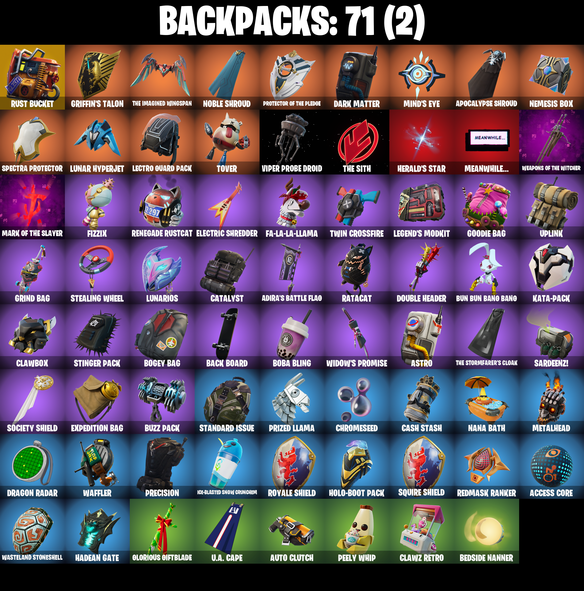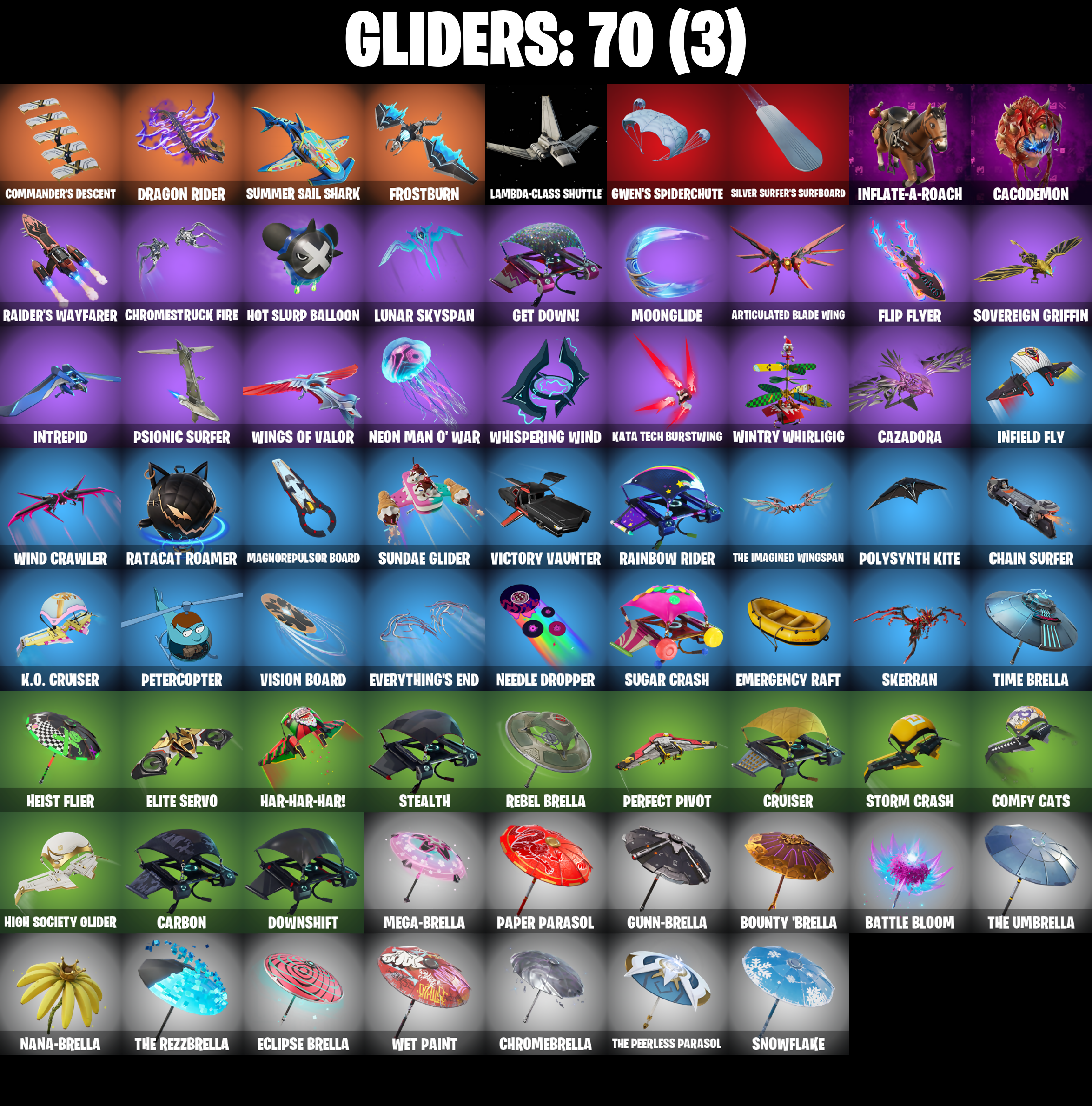 Access Core, Adira, Adira's Battle Flag, Apocalypse Shroud, Arachrobatics, Arctic Adeline, Articulated Blade Wing, Ascension Nezumi, Astro, Astro Armor, Auto Clutch, Back Board, Backup Blades, Balance Board, Balloon Axe, Battle Bloom, Battlehawk, Bedside Nanner, Best Mates, Bhangra Boogie, Big Bite, Blowin' Up, Blue Squire, Board Breaker, Boba Bling, Boba Snack, Bogey Bag, Bounty 'brella, Bullpen Brawler Dusty, Bun Bun Bang Bang, Buzz Pack, Bytes, Bytes (Lone Traveler), Cacodemon, Called Shot, Carbide, Carbon, Cash Stash, Catalyst, Cazadora, Chain Surfer, Chrome Punk, Chromebrella, Chromeseed, Chromestruck Fire, Clawbox, Clawz Retro, Club President Helsie, Comfy Cats, Commander's Descent, Crowning Achievement, Crucible Blade, Cruiser, Curling Iron, Cyclo Curl, Dark Matter, Dark Voyager, Darth Vader, Designated Hitters, Do The 'Split, Doom Slayer, Double Header, Double Tags, Downshift, Doze Dab, Dragon Radar, Dragon Rider, Dragoon Rune Lance, Drift, Drift Stage 5, Drippin' Flavor, Duelist's Foil, Dusty, Eclipse Brella, Electric Shredder, Elite Agent, Elite Servo, Emergency Raft, Eva, Everything's End, Evie, Expedition Bag, Fa-La-La-Llama, Fanged Foresight, Finger Guns, Fishbone Flayer, Fizzix, Flashback Breakdown, Flip Flyer, Foil Flex, Frostburn, Gale Force, Gentleman's Dab, Geralt of Rivia, Get Down!, Glorious Giftblade, Golf Clap, Goodie Bag, Griffin's Talon, Grind Bag, Groove Jam, Grriz, Grrizzy Gooper, Gunn-Brella, Gunnar, Gwen's Spiderchute, Hadean Gate, Har-Har-Har!, Harbinger Armor Omegarok, Heist Flier, Helsie, Herald's Star, High Society Glider, Holiday Boxy, Holo-Boot Pack, Hope, Hot Slurp Balloon, Huntress, Hype, Hypnot-Eyes, I Need You To Concentrate, I'm A Mystery, Ice-Blasted Snow Cruncher, Igni Sign, Imperial March, Indiana Jones, Infield Fly, Inflate-A-Roach, Intrepid, It Is Finished, Jubilation, K.O. Club, K.O. Cruiser, Kata Tech Burstwing, Kata-Pack, Kiara K.O., Kiara K.O. (Captain's Bomber), Knight's Treachery, Lambda-Class Shuttle, Laser Focused, Lectro Guard Pack, Lectrostatic Impactor, Legend's Modkit, Legendary Blade Of Insight, Lennox Rose, Lil Split, Lil' Longboat, Lil' Prancer, Lollipopper, Lunar Defender, Lunar Glow, Lunar Hyperjet, Lunar Party, Lunar Skyspan, Lunarios, Magnorepulsor Board, Major Mancake, Make A Seat, Malik, Malik (Solitary Defender), Mark of the Slayer, Massai, Meanwhile..., Mega-Brella, Meow Skulls, Metalhead, Mind's Eye, Mini Slayer Fistbump, Mission Specialist, Molten Max Axe, Moonglide, Moonwalker, Nana Bath, Nana-Brella, Nanner Bashers, Needle Dropper, Nemesis Box, Neon Man O' War, Nezumi, Nisha, Noble Shroud, Ol' Spiky, Omega, Omegarok, Omg I Love It, Omni Sword, Onslaught, Orange Justice, Oscar, Pairing Blades, Paper Parasol, Paradigm (Aurelian), Paradigm (Reality-659), Peely Whip, Perfect Pivot, Petercopter, Poacher's Regrets, Polysynth Kite, Pony Up, Popcorn, Positron, Precision, Premiere Poms, Prized Llama, Protector of the Pledge, Psionic Surfer, Pulse Axe, Punch Saw, Raider's Relics, Raider's Wayfarer, Rainbow Rider, Ratacat, Ratacat Roamer, Rebel Brella, Redline, Redmask Ranker, Regal Wave, Renegade Lynx, Renegade Rustcat, Respect, Respect The Peace, Ride The Pony, Rift Edge, Rogue Agent, Rose Light Daggers, Royale Knight, Royale Shield, Runway Racer, Rust Bucket, Rust Lord, Sabina, Sabina (Ponytail), Salute, SardeeNz!, Sawtooth, Scratchmark Shredder, Secret Scimitars, Segway Tour, Selene, Shock Brawler Oscar, Shuriken Spinner, Sigil Of The Empire, Silver Surfer, Silver Surfer Pickaxe, Silver Surfer's Surfboard, Skerran, Sled Ready Guff, Sledgecracker, Snap, Snikt! Snikt!, Snowflake, Social Climber, Society Shield, Solid Snake, Sovereign Griffin, Spectra Knight, Spectra Protector, Spectra Slasher, Spider Snare, Spider-Gwen, Squad Leader, Squire Shield, Standard Issue, Steady, Stealing Wheel, Stealth, Stinger Pack, Storm Crash, Stormfarer, Stormfarer (Storm Brawler), Stormshielder Blades, Stun Knife, Sugar Crash, Summer Sail Shark, Sundae Glider, Sunlit Selene, Sweet Clementine, Take A 'Bow, Take The L, Teknique, The Ageless, The Ageless Champion, The Destroyer's Destroyer, The Dip, The Eternal Edge, The Imagined, The Imagined Blade, The Imagined Wingspan, The Imqined (Combat Elite), The King's Oath, The Nothing's Gift, The Peerless Parasol, The Reaper, The Rezzbrella, The Robot, The Sith, The Stormfarer's Cloak, The Takedown, The Umbrella, The Worm, Thrasher Massai, Time Breaker Lil Split, Time Breaker Renegade Lynx, Time Brella, Tover, Trusty No. 2, Tsuki 2.0, Twin Crossfire, Twyn, U.A. Cape, Uplink, Utility Claymore, Valor, Vengeance Jones, Victory Vaunter, Viper Probe Droid, Viper School, Vision Board, Waffler, Wasteland Stoneshell, Wave, Weapons of the Witcher, Wet Paint, Whispering Wind, Widow's Promise, Wind Crawler, Wingman, Wings of Valor, Winter's Onslaught, Winterfest Bushranger, Wintry Whirligig, Witcher's Steel Sword, Zoey