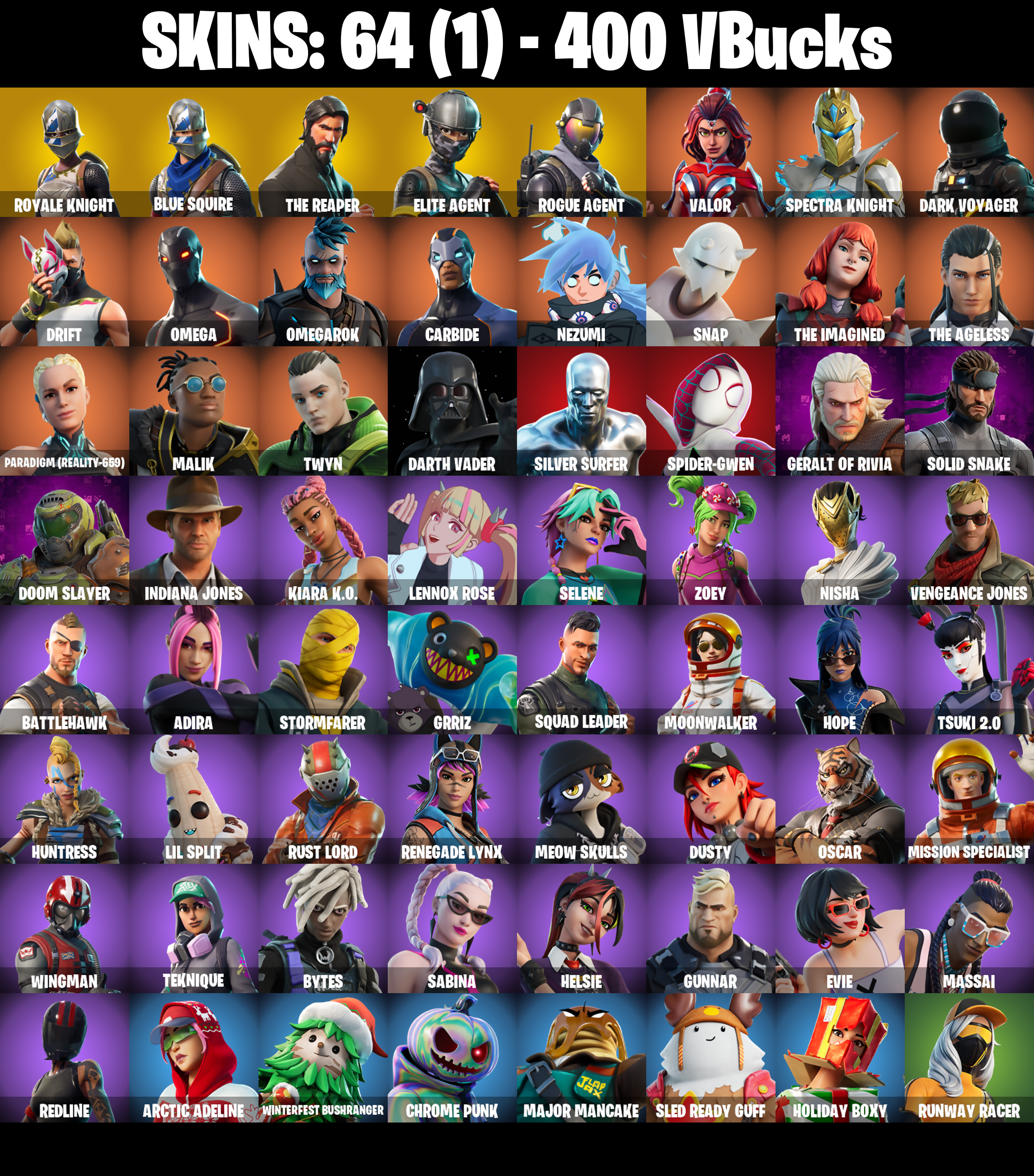 PC/PSN/XBOX |64 skins | Royale Knight | Blue Squire | The Reaper | Elite Agent | Spider-Gwen | Omega | Take The L | Orange Justice | #B1038