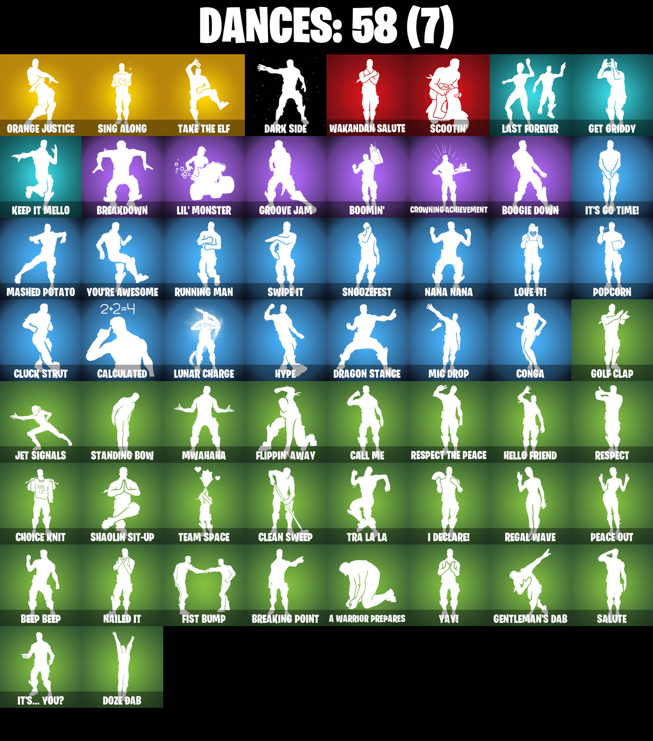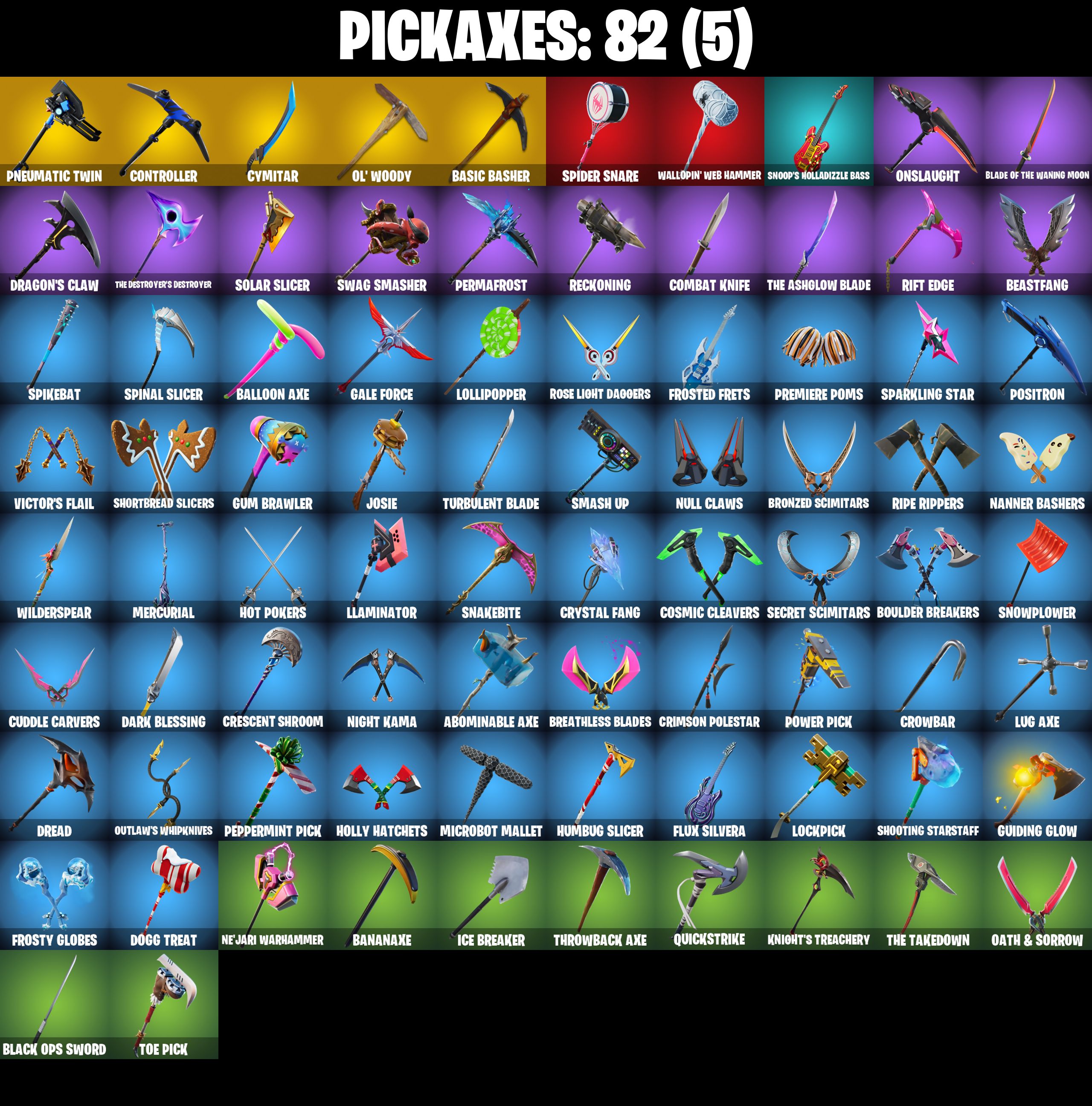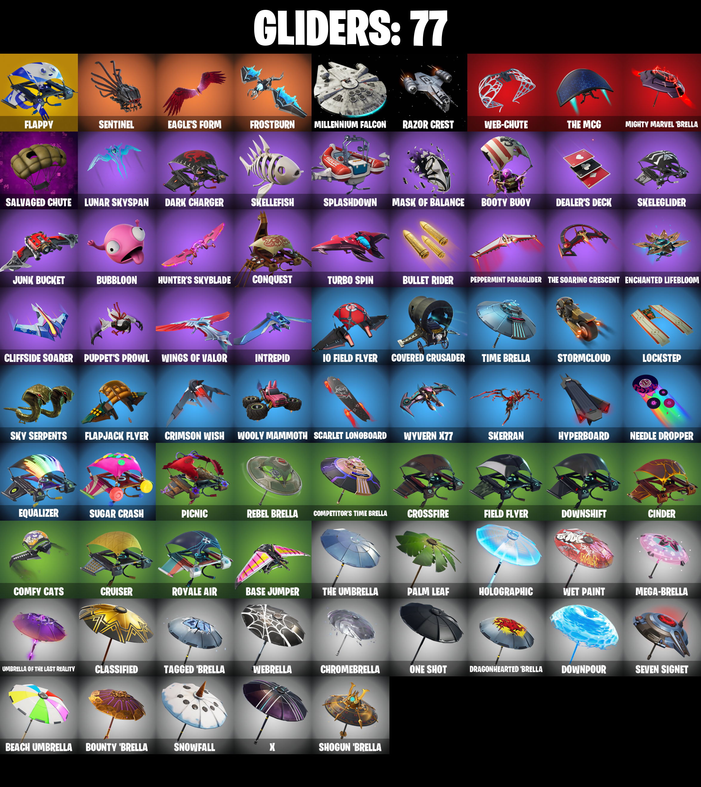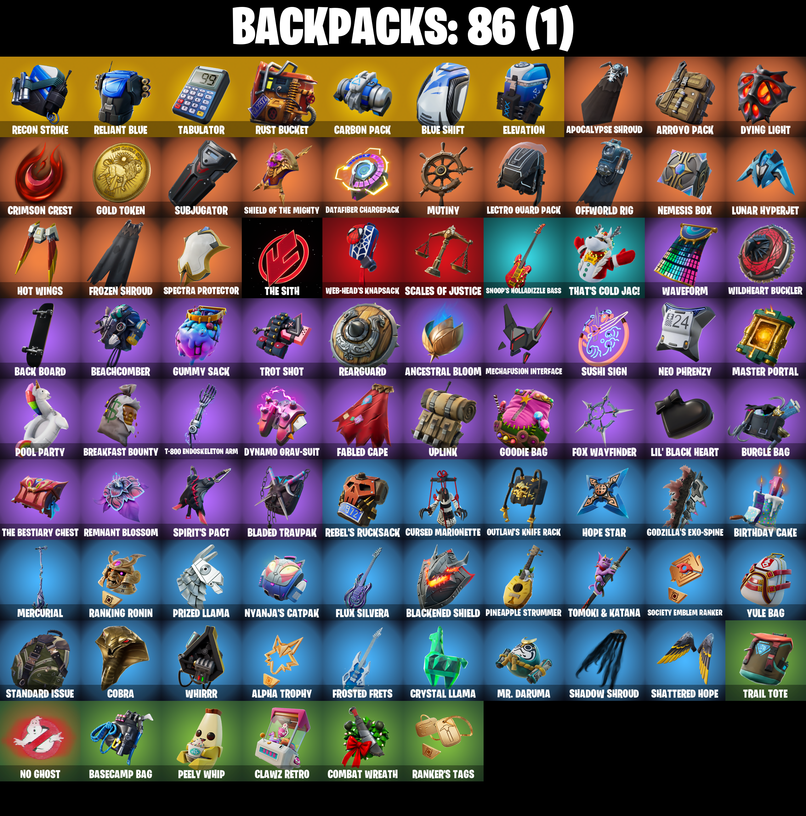 A Warrior Prepares, Abominable Axe, Alpha Trophy, Ancestral Bloom, Apocalypse Shroud, Arroyo Pack, Back Board, Balloon Axe, Bananaxe, Base Jumper, Basecamp Bag, Basic Basher, Battlehawk, Beach Umbrella, Beachcomber, Beastfang, Beep Beep, Birthday Cake, Black Ops Sword, Blackened Shield, Blackheart, Blackheart (Stage 8), Blade of the Waning Moon, Bladed Travpak, Blue Shift, Blue Striker, Boogie Down, Boomin', Booty Buoy, Boulder Breakers, Bounty 'Brella, Breakdown, Breakfast Bounty, Breaking Point, Breathless Blades, Bronzed Scimitars, Bubloon, Bullet Rider, Bunker Jonesy, Burgle Bag, Calamity, Calamity Stage 5, Calculated, Call Me, Carbide, Carbon Commando, Carbon Pack, Catalyst, Choice Knit, Chromebrella, Cinder, Classified, Clawz Retro, Clean Sweep, Cliffside Soarer, Cloud Striker, Cluck Strut, Cobra, Combat Knife, Combat Wreath, Comfy Cats, Competitor's Time Brella, Conga, Conquest, Controller, Cosmic Cleavers, Covered Crusader, Crescent Shroom, Crimson Crest, Crimson Polestar, Crimson Wish, Crossfire, Crowbar, Crowning Achievement, Cruiser, Crystal Fang, Crystal Llama, Cuddle Carvers, Cursed Marionette, Cymitar, D'ark, DJ Yonder, Dark Blessing, Dark Charger, Dark Side, Datafier Chargepack, Dealer's Deck, Dogg Treat, Downpour, Downshift, Doze Dab, Dragon Stance, Dragon's Claw, Dragonhearted 'Brella, Dread, Drift, Drift Stage 5, Dying Light, Dynamo Grav-Suit, Eagle's Form, Elevation, Ember, Ember (Night), Enchanted Lifebloom, Enforcer, Equalizer, Fabled Cape, Field Flyer, Fist Bump, Flapjack Flyer, Flappy, Flippin' Away, Flux Silvera, Fox Wayfinder, Frostburn, Frosted Frets, Frosty Globes, Frozen Shroud, Gale Force, Gentleman's Dab, Get Griddy, Giddy-Up, Godzilla's Exo-Spine, Gold Token, Golf Clap, Goodie Bag, Groove Jam, Guiding Glow, Gum Brawler, Gumbo, Gummy Sack, Harlowe, Haven, Hello Friend, Holly Hatchets, Holographic, Hope Star, Hot Pokers, Hot Wings, Humbug Slicer, Hunter's Skyblade, Huntress, Hybrid, Hybrid (Stage 4), Hype, Hyperboard, I Declare!, IO Field Flyer, Ice Breaker, Intrepid, It's Go Time!, It's... You?, Jet Signals, Josie, Junk Bucket, Keep It Mello, Knight's Treachery, Kondor, Krisabelle, Laguna, Last Forever, Lectro Guard Pack, Lexa, Lil' Black Heart, Lil' Monster, Llaminator, Lockpick, Lockstep, Lollipopper, Love It!, Lt. John Llama, Lug Axe, Lunar Charge, Lunar Hyperjet, Lunar Skyspan, Mancake, Mandalorian, Mashed Potato, Mask Of Balance, Master Key, Master Portal, Mave, Mave (Reactive Hair Off), Mechafusion Interface, Mega-Brella, Menace, Menace (Challenger Menace - Flame), Mercurial, Mic Drop, Microbot Mallet, Mighty Marvel 'Brella, Millennium Falcon, Mr. Daruma, Mutiny, Mwahaha, Nailed It, Nana Nana, Nanner Bashers, Ne'Jari Warhammer, Needle Dropper, Nemesis Box, Neo Phrenzy, Neo Versa, Night Kama, No Ghost, Null Claws, Nyanja's Catpak, Oath & Sorrow, Offworld Rig, Ol' Woody, Omega, One Shot, Onslaught, Orange Justice, Outlaw's Knife Rack, Outlaw's Whipknives, Palm Leaf, Peace Out, Peely, Peely Whip, Peppermint Paraglider, Peppermint Pick, Permafrost, Picnic, Pineapple Strummer, Pneumatic Twin, Point Patroller, Poised Playmaker, Polar Peely, Pool Party, Popcorn, Positron, Power Pick, Predator, Premiere Poms, Prized Llama, Prodigy, Puppet's Prowl, Quickstrike, Ragnarok, Ranker's Tags, Ranking Ronin, RaonaroK (No Shoulder Pad), Rapscallion, Razor Crest, Rearguard, Rebel Brella, Rebel's Rucksack, Reckoning, Recon Strike, Redline, Reese, Regal Wave, Reliant Blue, Remnant Blossom, Respect, Respect The Peace, Rift Edge, Ripe Rippers, Robo-Kevin, Ronin, Ronin (Cape), Rook, Rose Light Daggers, Rox, Rox (Stage 5), Royale Air, Ruin, Running Man, Rust Bucket, Salute, Salvaged Chute, Santa Dogg, Sarah Connor, Scales of Justice, Scarlet Longboard, Scootin', Secret Scimitars, Sentinel, Seven Signet, Shadow Shroud, Shanta, Shaolin Sit-Up, Shattered Hope, Shield of the Mighty, Shogun 'Brella, Shooting Starstaff, Shortbread Slicers, Sidewinder, Sidewinder (Dark), Sing Along, Skeleglider, Skellefish, Skerran, Sky Serpents, Sledgehammer, Smash Up, Snakebite, Snoop's Holladizzle Bass, Snoozefest, Snowfall, Snowplower, Society Emblem Ranker, Solar Slicer, Sparkling Star, Spectra Protector, Spider Snare, Spider-Man, Spikebat, Spinal Slicer, Spirit's Pact, Splashdown, Squad Leader, Standard Issue, Standing Bow, Stormcloud, Subjugator, Sugar Crash, Sultura, Sun Strider, Sushi Sign, Swag Smasher, Swipe It, T-800 Endoskeleton Arm, Tabulator, Tagged 'Brella, Take The Elf, Team Space, Teknique, That's Cold Jac!, The Ashglow Blade, The Bestiary Chest, The Destroyer's Destroyer, The Mcg, The Sith, The Soaring Crescent, The Takedown, The Umbrella, The Visitor, Throwback Axe, Time Brella, Toe Pick, Tomoki & Katana, Tra La La, Trail Tote, Trilogy, Trot Shot, Turbo Spin, Turbulent Blade, Umbrella Of The Last Reality, Uplink, Valor, Victor's Flail, Wakandan Salute, Wallopin' Web Hammer, Waveform, Web-Chute, Web-Head's Knapsack, Webrella, Wet Paint, Whirrr, Wilderspear, Wildheart Buckler, Wings Of Valor, Wooly Mammoth, Wyvern X77, X, X-Lord, Yay!, You're Awesome, Yule Bag, Yulejacket, Yuletide Ranger, Zoey