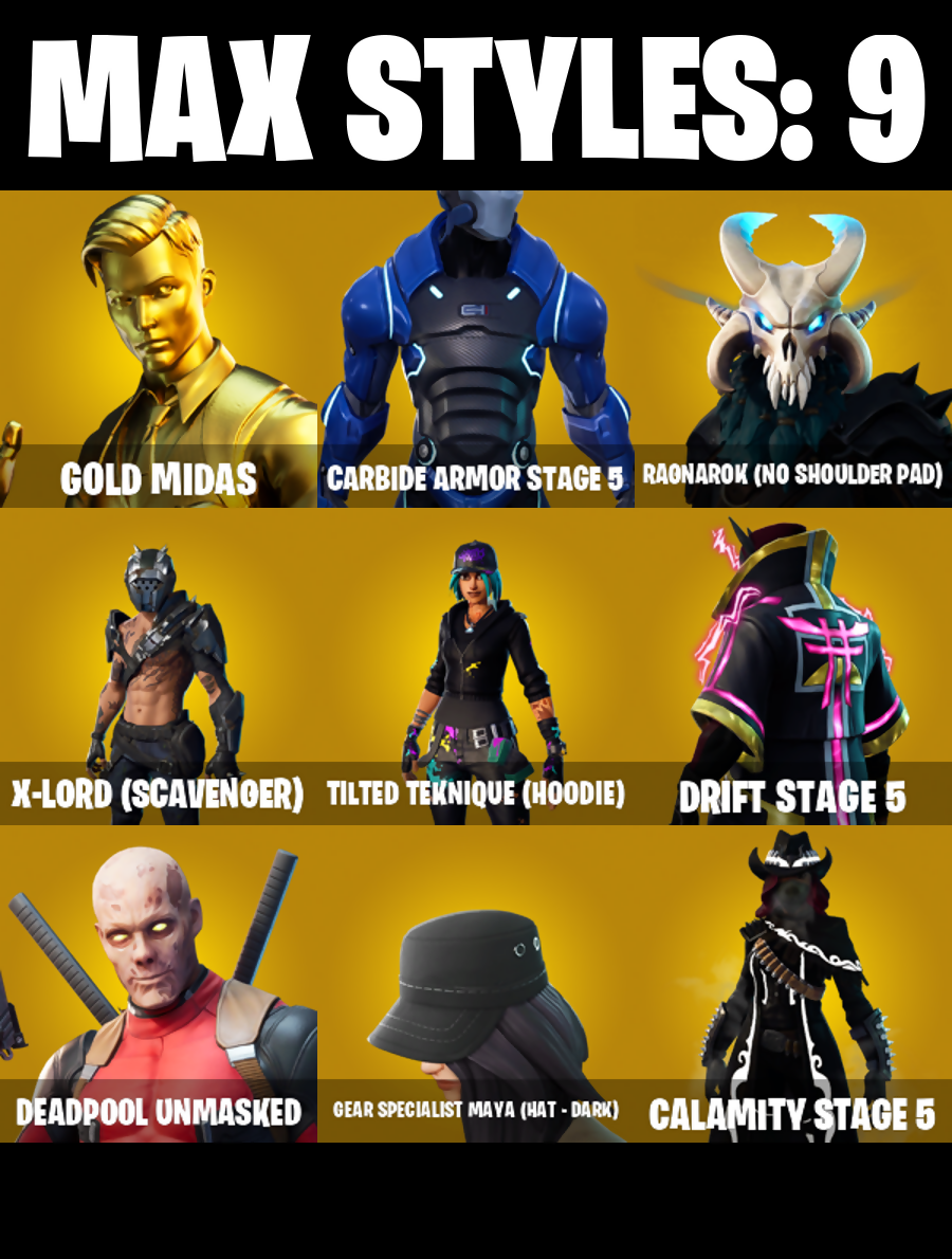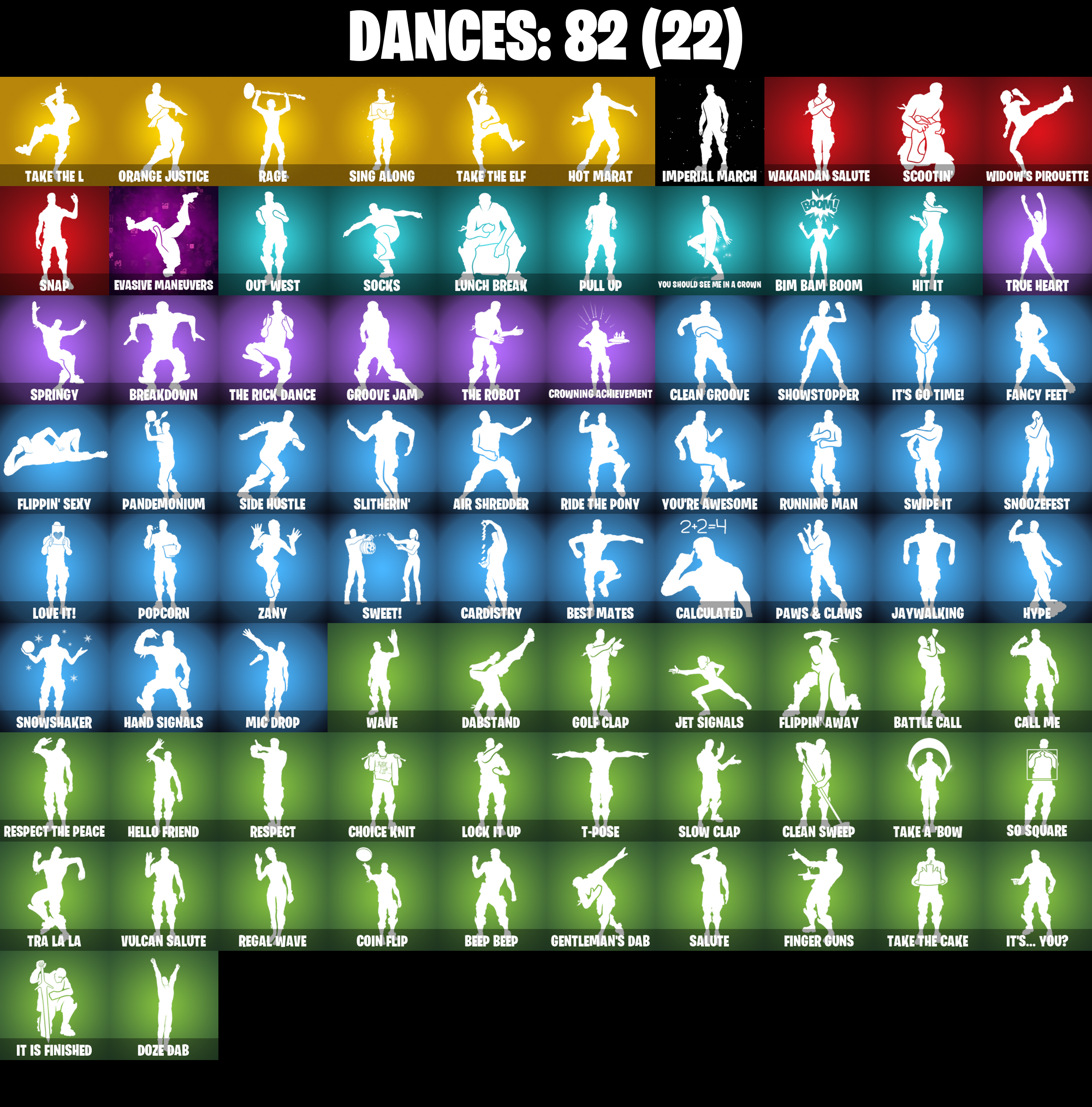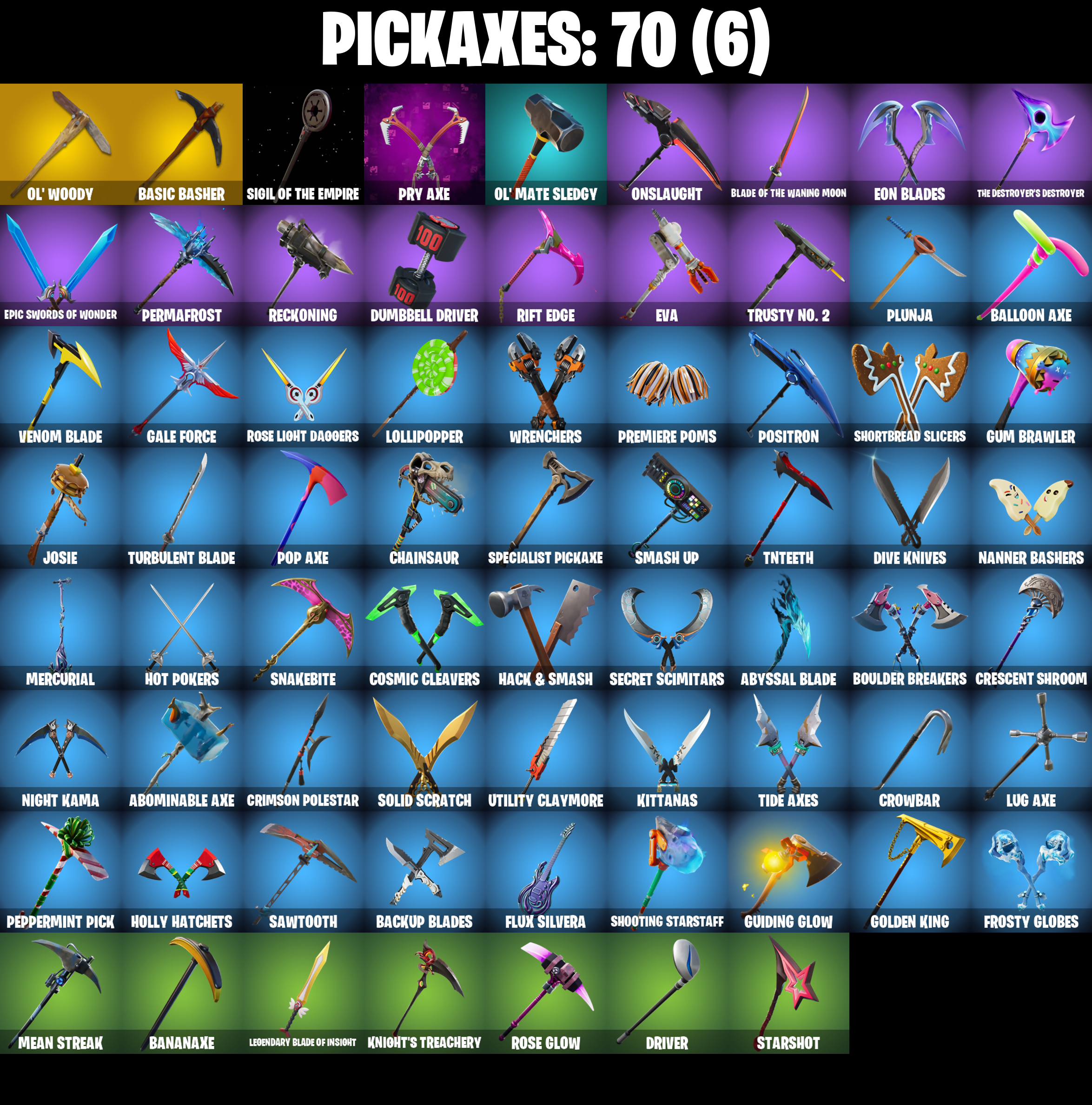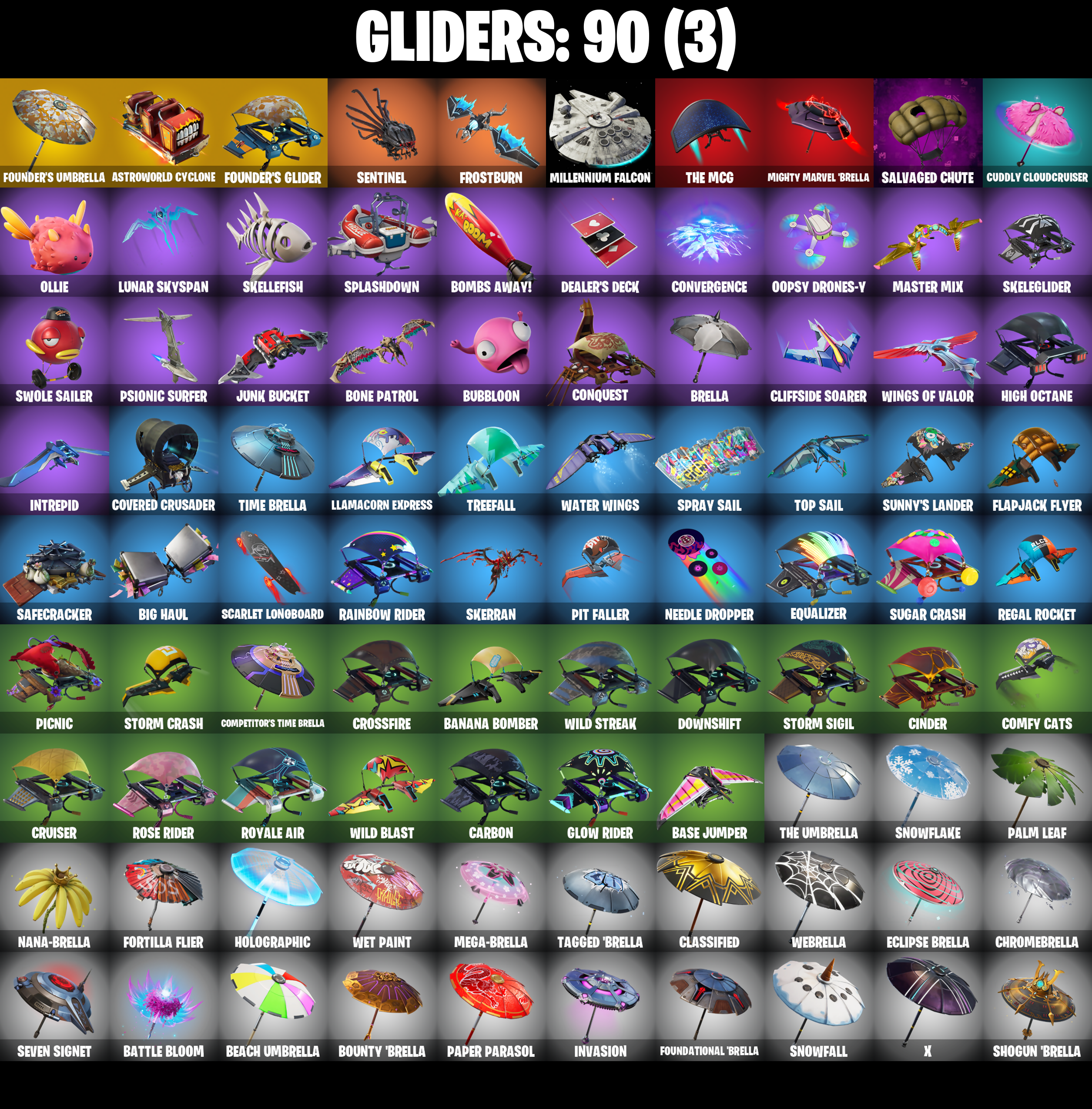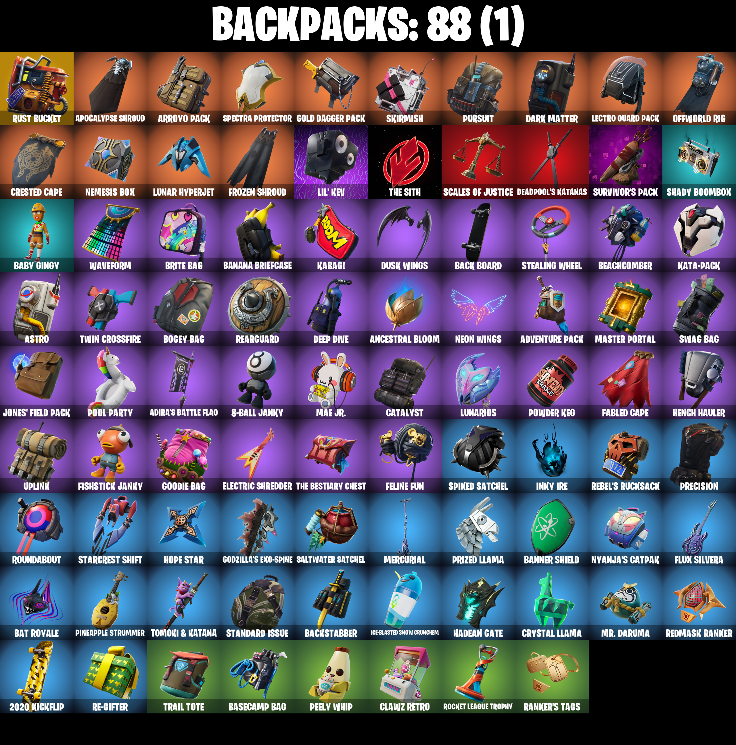 2020 Kickflip, 8-Ball Janky, Abominable Axe, Absenz, Abyssal Blade, Adira's Battle Flag, Adventure Pack, Agent Jones, Agent Peely, Air Shredder, Ancestral Bloom, Apocalypse Shroud, Arroyo Pack, Assault Trooper, Astro, Astroworld Cyclone, Baby Gingy, Back Board, Backstabber, Backup Blades, Balloon Axe, Banana Bomber, Banana Briefcase, Bananaxe, Banner Shield, Base Jumper, Basecamp Bag, Basic Basher, Bat Royale, Battle Bloom, Battle Call, Battle Hound, Battlehawk, Beach Umbrella, Beachcomber, Beep Beep, Best Mates, Big Haul, Bim Bam Boom, Blade Of The Waning Moon, Bogey Bag, Bombs Away!, Bone Patrol, Boulder Breakers, Bounty 'brella, Breakdown, Brella, Brite Bag, Brite Gunner, Brutus, Bubloon, Calamity, Calamity Stage 5, Calculated, Call Me, Carbide, Carbide Armor Stage 5, Carbon, Cardistry, Catalyst, Chainsaur, Choice Knit, Chromebrella, Cinder, Classified, Clawz Retro, Clean Groove, Clean Sweep, Cliffside Soarer, Coin Flip, Comfy Cats, Commando, Competitor's Time Brella, Conquest, Convergence, Cosmic Cleavers, Covered Crusader, Crescent Shroom, Crested Cape, Crimson Polestar, Crossfire, Crowbar, Crowning Achievement, Cruiser, Crystal Llama, Cuddly Cloudcruiser, DJ Yonder, Dabstand, Dark Matter, Dark Voyager, Deadpool, Deadpool Unmasked, Deadpool's Katanas, Dealer's Deck, Deep Dive, Dive Knives, Downshift, Doze Dab, Drift, Drift Stage 5, Driver, Dumbbell Driver, Dusk, Dusk Wings, Eclipse Brella, Electric Shredder, Elite Agent, Eon Blades, Epic Swords Of Wonder, Equalizer, Eva, Evasive Maneuvers, Fable, Fabled Cape, Fade, Fancy Feet, Feline Fun, Finger Guns, Fishstick, Fishstick Janky, Flapjack Flyer, Flippin' Away, Flippin' Sexy, Flux Silvera, Fortilla Flier, Foundational 'brella, Founder's Glider, Founder's Umbrella, Frostburn, Frosty Globes, Frozen Shroud, Gale Force, Gear Specialist Maya, Gear Specialist Maya (Hat - Dark), Gentleman's Dab, Giddy-Up, Glow Rider, Godzilla's Exo-Spine, Gold Dagger Pack, Gold Midas, Golden King, Golf Clap, Goodie Bag, Groove Jam, Guiding Glow, Gum Brawler, Hack & Smash, Hadean Gate, Hand Signals, Hello Friend, Hench Hauler, High Octane, Hit It, Holly Hatchets, Holographic, Hope Star, Hot Marat, Hot Pokers, Huntress, Hype, Ice-Blasted Snow Crunchem, Imperial March, Inky Ire, Intrepid, Invasion, Iris, It Is Finished, It's Go Time!, It's... You?, Jaywalking, Jet Signals, Jones' Field Pack, Josie, Jules, Junk Bucket, Kabag!, Kata-Pack, Kittanas, Knight's Treachery, Laguna, Lara Croft, Lazarbeam, Lectro Guard Pack, Legendary Blade Of Insight, Lil' Kev, Llamacorn Express, Lock It Up, Lollipopopper, Love It!, Lt. Evergreen, Lug Axe, Lunar Hyperjet, Lunar Skyspan, Lunarios, Lunch Break, Mae Jr., Master Mix, Master Portal, Mean Streak, Mega-Brella, Meowscles, Mercurial, Mic Drop, Mighty Marvel 'brella, Millennium Falcon, Mission Specialist, Moonwalker, Mr. Daruma, Nana-Brella, Nanner Bashers, Needle Dropper, Nemesis Box, Neon Wings, Night Kama, Nyanja's Catpak, Ocean, Offworld Rig, Ol' Mate Sledgy, Ol' Woody, Ollie, Omega, Onslaught, Oopsy Drones-y, Orange Justice, Out West, Palm Leaf, Pandemonium, Paper Parasol, Paws & Claws, Peely Whip, Peppermint Pick, Permafrost, Picnic, Pineapple Strummer, Pit Faller, Plunja, Poised Playmaker, Pool Party, Pop Axe, Popcorn, Positron, Powder Keg, Precision, Premiere Poms, Prized Llama, Pry Axe, Psionic Surfer, Pull Up, Pursuit, Rage, Ragnarok, Ragnarok (No Shoulder Pad), Rainbow Rider, Ranker's Tags, Re-Gifter, Rearguard, Rebel's Rucksack, Reckoning, Red Jade, Redline, Redmask Ranker, Regal Rocket, Regal Wave, Respect, Respect The Peace, Ride The Pony, Rift Edge, Rocket League Trophy, Rogue Agent, Rook, Rose Glow, Rose Light Daggers, Rose Rider, Rose Team Leader, Roundabout, Royale Air, Running Man, Rust Bucket, Rust Lord, Safecracker, Saltwater Satchel, Salute, Salvaged Chute, Sawtooth, Scales Of Justice, Scarlet Longboard, Scootin', Scuba Jonesy, Secret Scimitars, Sentinel, Seven Signet, Shady Boombox, Shogun 'brella, Shooting Starstaff, Shortbread Slicers, Showstopper, Side Hustle, Sigil Of The Empire, Sing Along, Skeleglider, Skellefish, Skerran, Skirmish, Skye, Sledgehammer, Slim Shady, Slitherin', Slow Clap, Smash Up, Snakebite, Snap, Snoozefest, Snorkel Ops, Snowfall, Snowflake, Snowshaker, So Square, Socks, Solid Scratch, Specialist Pickaxe, Spectra Protector, Spiked Satchel, Splashdown, Spray Sail, Springy, Squad Leader, Standard Issue, Starcrest Shift, Starshot, Stealing Wheel, Storm Crash, Storm Sigil, Sugar Crash, Sun Strider, Sunny's Lander, Survivor's Pack, Swag Bag, Sweet!, Swipe It, Swole Sailer, T-Pose, Tagged 'brella, Take A Bow, Take The Cake, Take The Elf, Take The L, Tarana, Teknique, The Ace, The Bestiary Chest, The Destroyer's Destroyer, The Mcg, The Reaper, The Rick Dance, The Robot, The Sith, The Umbrella, The Visitor, Tide Axes, Tilted Teknique, Tilted Teknique (Hoodie), Time Brella, Tnteeth, Tntina, Tomoki & Katana, Top Sail, Tra La La, Trail Tote, Treefall, True Heart, Trusty No. 2, Turbulent Blade, Twin Crossfire, Uplink, Utility Claymore, Valor, Venom Blade, Vulcan Salute, Wakandan Salute, Warpaint, Water Wings, Wave, Waveform, Webrella, Wet Paint, Widow's Pirouette, Wild Blast, Wild Streak, Wingman, Wings Of Valor, Wooly Warrior, Wrenchers, X, X-Lord, X-Lord (Scavenger), Yellowjacket, You Should See Me In A Crown, You're Awesome, Zany, Zoey
