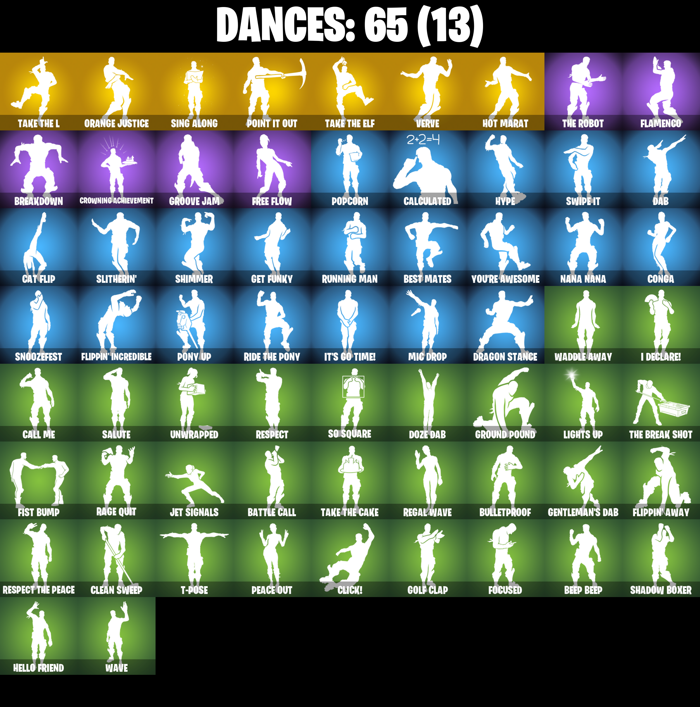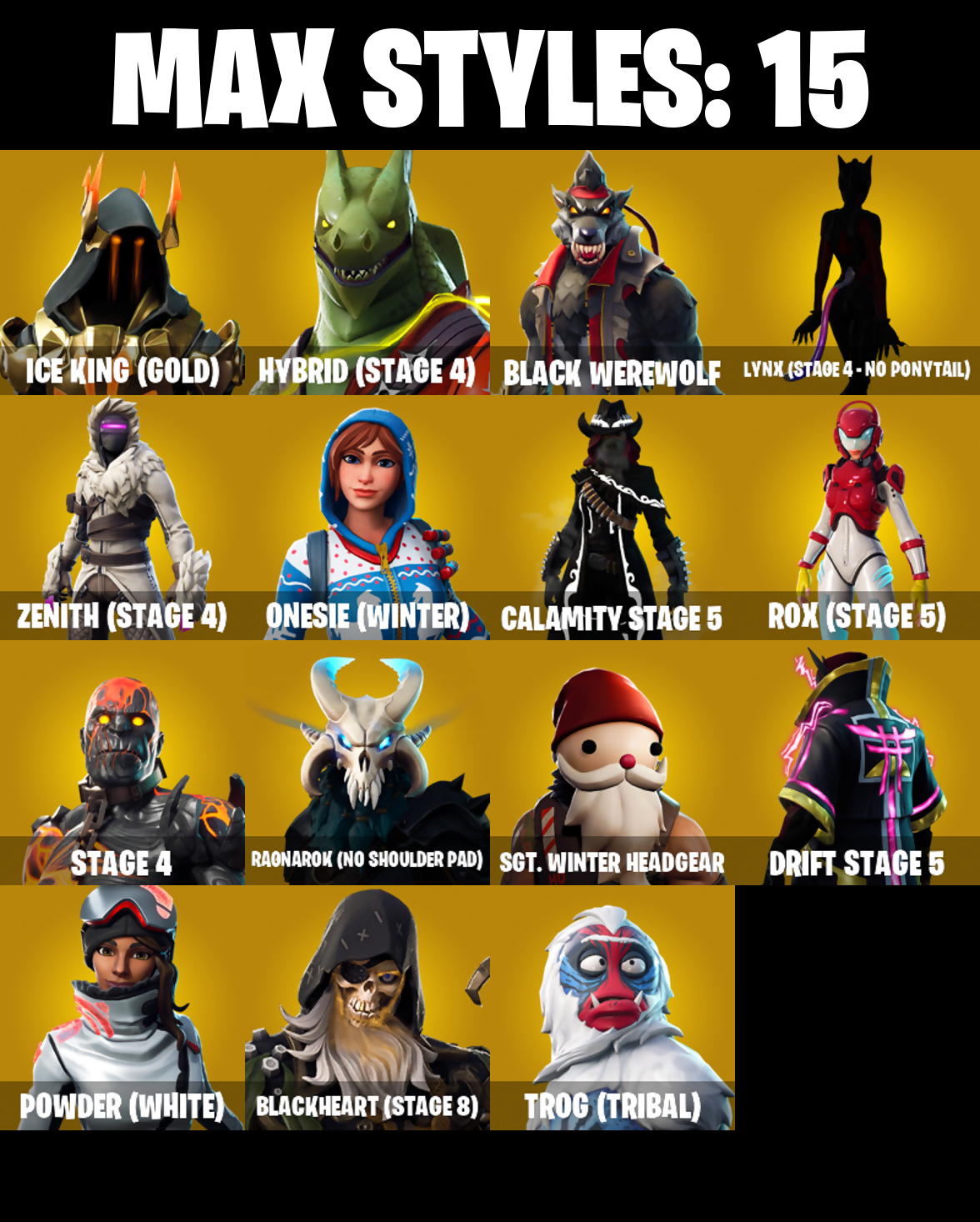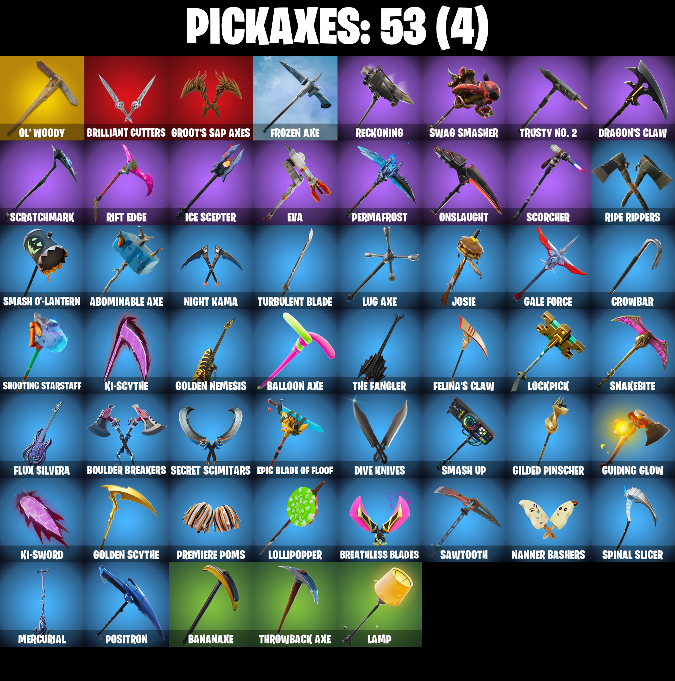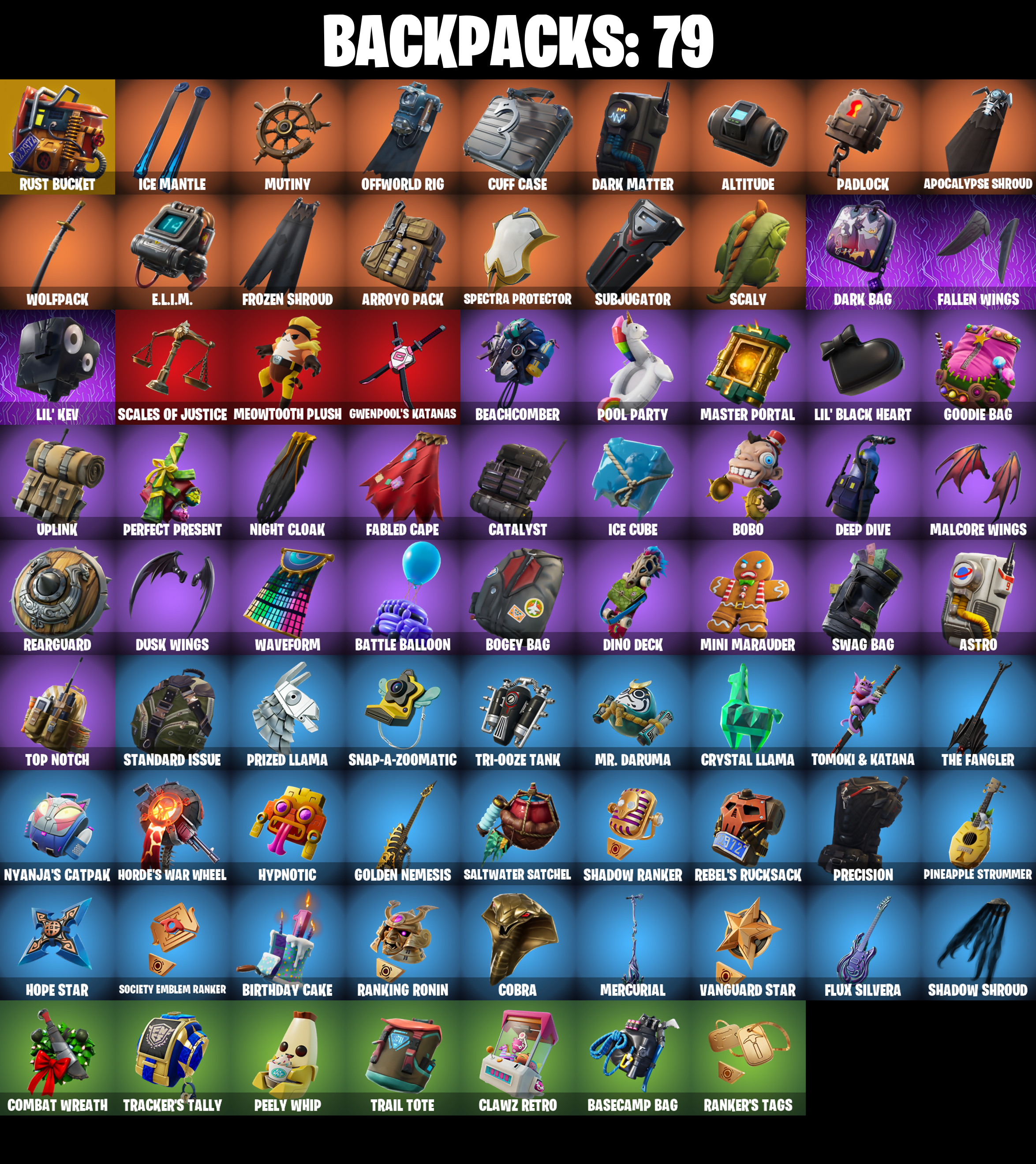 A.I.M., Abominable Axe, Altitude, Apocalypse Shroud, Arroyo Pack, Astro, Astroworld Cyclone, Balloon Axe, Bananaxe, Base Jumper, Basecamp Bag, Battle Balloon, Battle Call, Battlehawk, Beach Umbrella, Beachcomber, Beep Beep, Best Mates, Birthday Cake, Black Werewolf, Blackheart, Blackheart (Stage 8), Bobo, Bogey Bag, Boulder Breakers, Bounty 'Brella, Breakdown, Breathless Blades, Brilliant Cutters, Bulletproof, Bullseye, Calamity, Calamity Stage 5, Calculated, Call Me, Carbide, Carbon, Cat Flip, Catalyst, Cinder, Classified, Clawz Retro, Clean Sweep, Click!, Cliffside Soarer, Cobra, Combat Wreath, Competitor's Time Brella, Conga, Conquest, Covered Crusader, Crossfire, Crowbar, Crowning Achievement, Cruiser, Crystal Llama, Cuff Case, DJ Yonder, Dab, Dark Bag, Dark Bomber, Dark Matter, Dark Voyager, Deep Dive, Dino Deck, Dire, Dive Knives, Downpour, Downshift, Doze Dab, Dragon Stance, Dragon's Claw, Drift, Drift Stage 5, Dusk, Dusk Wings, E.L.I.M., Elite Agent, Ember, Enforcer, Epic Blade of Floof, Equalizer, Eva, Fable, Fabled Cape, Fallen Love Ranger, Fallen Wings, Felina, Felina's Claw, Finesse Finisher, Fishstick, Fist Bump, Flamenco, Flapjack Flyer, Flippin' Away, Flippin' Incredible, Flux Silvera, Focused, Fortilla Flier, Free Flow, Frozen Axe, Frozen Shroud, Gale Force, Gentleman's Dab, Get Funky, Giddy-Up, Gilded Pinscher, Glidurr, Goku Black, Golden Nemesis, Golden Scythe, Golf Clap, Goodie Bag, Groot's Sap Axes, Groove Jam, Ground Pound, Guiding Glow, Gwenpool's Katanas, Heartspan, Hello Friend, High Octane, Hope Star, Horde's War Wheel, Hot Marat, Huntress, Hybrid, Hybrid (Stage 4), Hype, Hypnotic, I Declare!, Ice Cube, Ice King (Gold), Ice Mantle, Ice Scepter, Intrepid, It's Go Time!, Jet Signals, Josie, Ki-Scythe, Ki-Sword, Laguna, Lamp, Lights Up, Lil' Black Heart, Lil' Kev, Lockpick, Lockstep, Lollipopper, Lug Axe, Lynx, Lynx (Stage 4 - No Ponytail), Malcore, Malcore Wings, Mask Of Balance, Master Portal, Meowtooth Plush, Mercurial, Merry Marauder, Mezmer, Mic Drop, Mighty Marvel 'Brella, Mini Marauder, Mission Specialist, Moonwalker, Mr. Daruma, Mutiny, Nana Nana, Nanner Bashers, Night Cloak, Night Kama, Nightshade, Nyanja's Catpak, Offworld Rig, Ol' Woody, Omega, Onesie, Onesie (Winter), Onslaught, Orange Justice, Padlock, Palm Leaf, Paper Parasol, Peace Out, Peekaboo, Peely, Peely Whip, Perfect Present, Permafrost, Picnic, Pineapple Strummer, Point It Out, Pony Up, Pool Party, Popcorn, Positron, Powder, Powder (White), Precision, Premiere Poms, Prized Llama, Rage Quit, Ragnarok, Rainbow Rider, Ranker's Tags, Ranking Ronin, Raonarak (No Shoulder Pad), Rearguard, Rebel Brella, Rebel's Rucksack, Reckoning, Redline, Regal Wave, Remix 'Brella, Respect, Respect The Peace, Rex, Rickety Runner, Ride The Pony, Rift Edge, Ripe Rippers, Rogue Agent, Rook, Rox, Rox (Stage 5), Royale Air, Running Man, Rust Bucket, Rust Lord, Saltwater Satchel, Salute, Salvaged Chute, Sawtooth, Scales Of Justice, Scaly, Scorcher, Scratchmark, Secret Scimitars, Sentinel, Sgt. Winter, Sgt. Winter Headgear, Shadow Boxer, Shadow Ranker, Shadow Shroud, Shimmer, Shooting Starstaff, Sidewinder, Sing Along, Skeleglider, Skellefish, Skelleshark, Sky Serpents, Sledgehammer, Slitherin', Smash O'-Lantern, Smash Up, Snakebite, Snap-A-Zoomatic, Snoozefest, Snowfall, So Square, Society Emblem Ranker, Spectra Protector, Spinal Slicer, Splashdown, Squad Leader, Stage 4, Stalwart Sweeper, Standard Issue, Subjugator, Sugar Crash, Summit Striker, Sun Strider, Swag Bag, Swag Smasher, Swarm, Swipe It, T-Pose, Tactical Sleigh, Tagged 'Brella, Take The Cake, Take The Elf, Take The L, Teknique, The Ace, The Break Shot, The Fangler, The Ice King, The Mcg, The Prisoner, The Reaper, The Robot, The Umbrella, The Visitor, Throwback Axe, Time Brella, Tomoki & Katana, Top Notch, Tracker's Tally, Trail Tote, Tri-Ooze Tank, Trog, Trog (Tribal), Trusty No. 2, Turbulent Blade, Unwrapped, Uplink, Valor, Vanguard Star, Verve, Waddle Away, War Force Wings, Wave, Waveform, Webrella, Wet Paint, Wild Card, Wingman, Wings Of Valor, Wolfpack, X, You're Awesome, Yuletide Ranger, Zenith, Zenith (Stage 4), Zoey