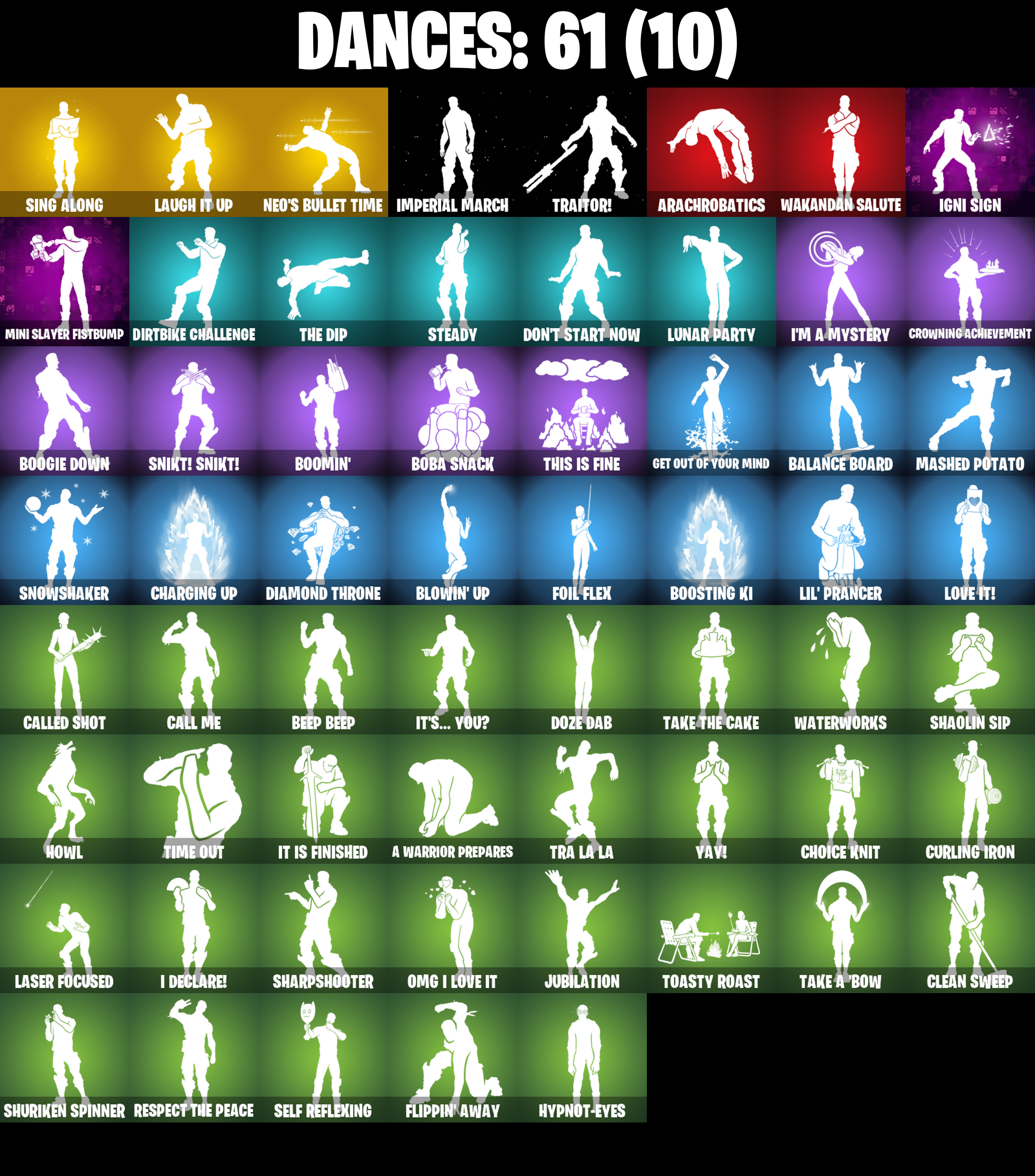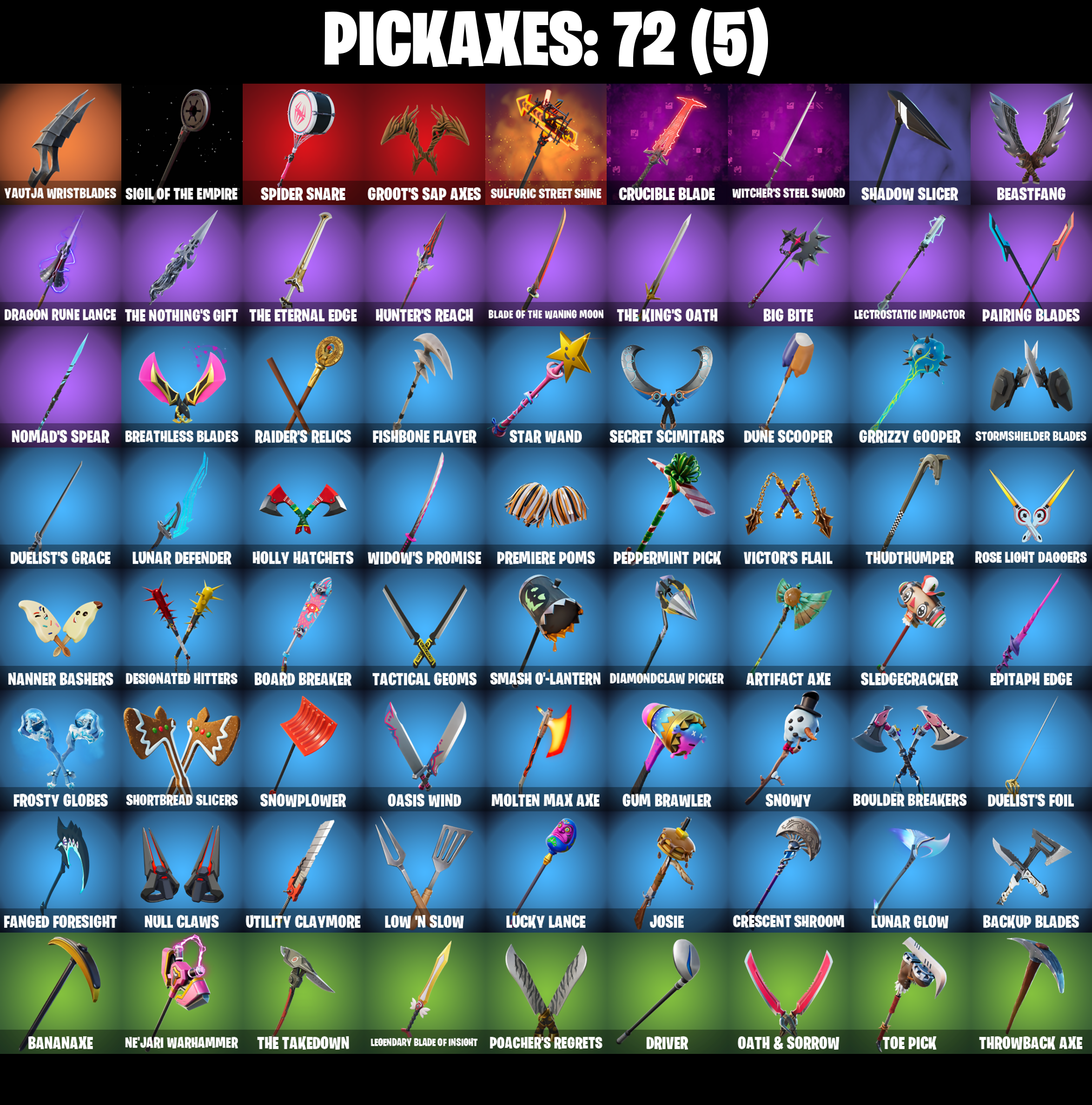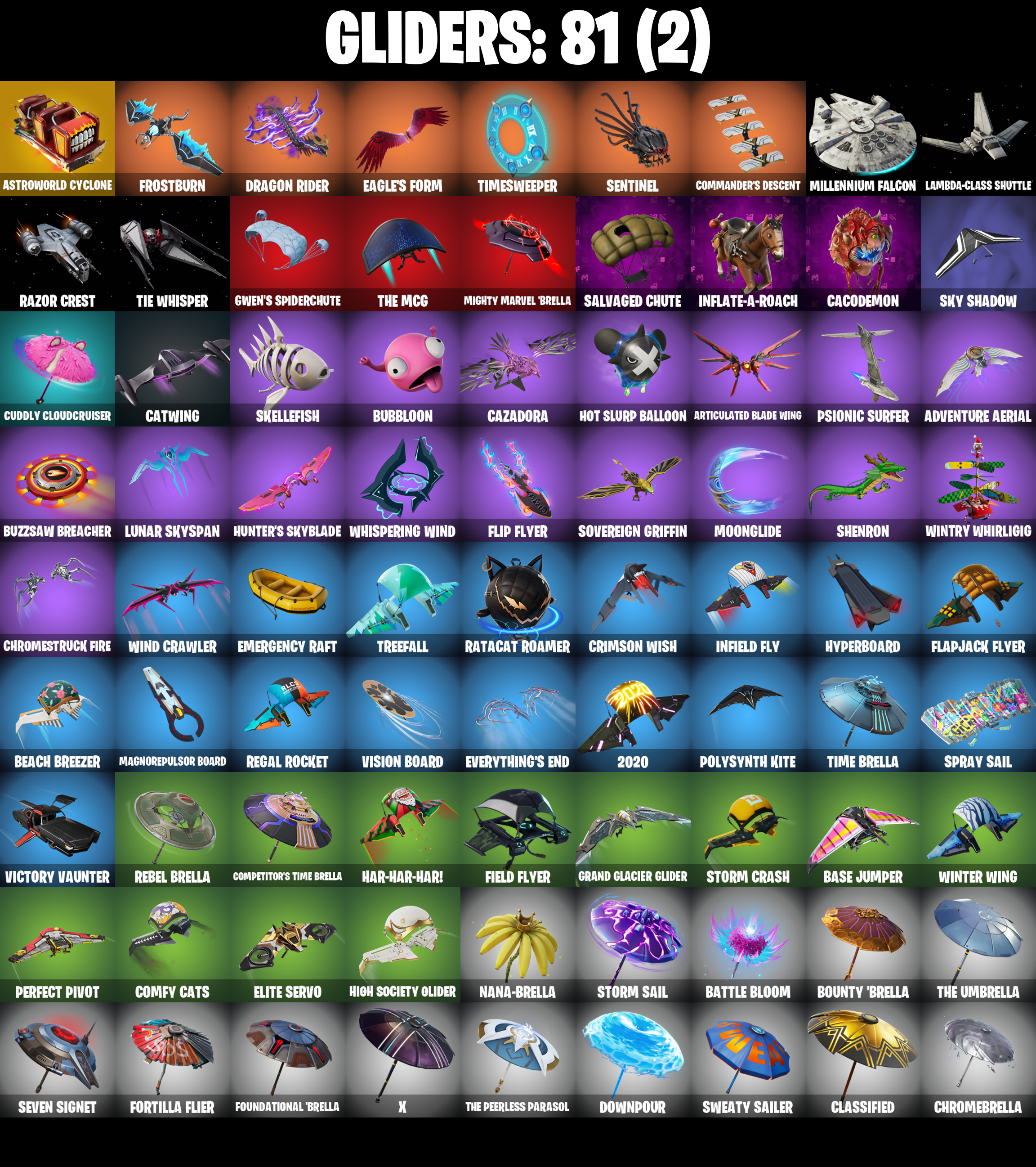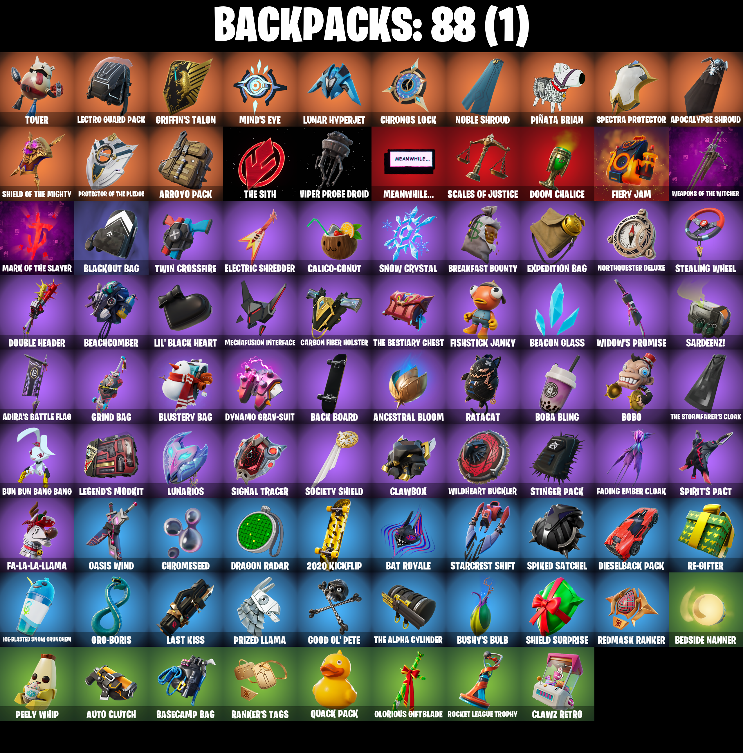 2020, 2020 Kickflip, A Warrior Prepares, Adira, Adira (Battle Mask), Adira's Battle Flag, Adventure Aerial, Ancestral Bloom, Apocalypse Shroud, Arachrobatics, Arctic Adeline, Arroyo Pack, Articulated Blade Wing, Artifact Axe, Ascension Nezumi, Aspen, Astro Armor, Astroworld Cyclone, Auto Clutch, Back Board, Backup Blades, Balance Board, Bananaxe, Base Jumper, Basecamp Bag, Bat Royale, Battle Bloom, Beach Breezer, Beachcomber, Beacon Glass, Beastfang, Bedside Nanner, Beep Beep, Big Bite, Blackout Bag, Blade Of The Waning Moon, Blizzabelle, Blowin' Up, Blustery Bag, Board Breaker, Boba Bling, Boba Snack, Bobo, Boogie Down, Boomin', Boosting Ki, Boulder Breakers, Bounty 'Brella, Breakfast Bounty, Breathless Blades, Bubbloon, Bullseye, Bun Bun Bang Bang, Bushy's Bulb, Buzzsaw Breacher, Bytes, Bytes (Lone Traveler), Cacodemon, Calico-Conut, Call Me, Called Shot, Carbon Fiber Holster, Catwing, Cazadora, Charging Up, Choice Knit, Chrome Punk, Chromebrella, Chromeseed, Chromestruck Fire, Chronos Lock, Classified, Clawbox, Clawz Retro, Clean Sweep, Comfy Cats, Commander's Descent, Competitor's Time Brella, Cozy Commander, Crescent Shroom, Crimson Wish, Crowning Achievement, Crucible Blade, Cuddly Cloudcruiser, Curling Iron, Darth Vader, Designated Hitters, Diamond Throne, Diamondclaw Picker, Dieselback Pack, Dirtbike Challenge, Don't Start Now, Doom Chalice, Doom Slayer, Double Header, Downpour, Doze Dab, Dragon Radar, Dragon Rider, Dragon Rune Lance, Driver, Duelist's Foil, Duelist's Grace, Dune Scooper, Dusty, Dynamo Grav-Suit, Eagle's Form, Electric Shredder, Elite Servo, Emergency Raft, Epitaph Edge, Era, Everything's End, Evie, Evie (Summer Strider), Expedition Bag, Fa-La-La-Llama, Fading Ember Cloak, Fanged Foresight, Field Flyer, Fiery Jam, Fishbone Flayer, Fishstick Janky, Flapjack Flyer, Flip Flyer, Flippin' Away, Foil Flex, Fortilla Flier, Foundational 'Brella, Frost Squad, Frostburn, Frosty Globes, Geralt of Rivia, Get Out Of Your Mind, Glorious Giftblade, Good Ol' Pete, Grand Glacier Glider, Griffin's Talon, Grind Bag, Grizzly Gooper, Groot's Sap Axes, Grriz, Grriz (Wild Beary Grriz), Guff Gringle, Gum Brawler, Gwen's Spiderchute, Har-Har-Har!, Helsie, High Society Glider, Holiday Boxy, Holly Hatchets, Hope, Hot Slurp Balloon, Howl, Hunter's Reach, Hunter's Skyblade, Hyperboard, Hypnot-Eyes, I Declare!, I'm A Mystery, Ice-Blasted Snow Crunchem, Igni Sign, Imperial March, Indiana Jones, Infield Fly, Inflate-A-Roach, It Is Finished, It's... You?, Josie, Jubilation, Kondor, Krisabelle, Lambda-Class Shuttle, Laser Focused, Last Kiss, Laugh It Up, Lectro Guard Pack, Lectrostatic Impactor, Legend's Modkit, Legendary Blade Of Insight, Lennox Rose, Lexa, Lexa (Warstrike), Lil' Black Heart, Lil' Prancer, Love It!, Low 'N Slow, Lt. Evergreen, Lucky Lance, Lunar Defender, Lunar Glow, Lunar Hyperjet, Lunar Party, Lunar Skyspan, Lunarios, Magnorepulsor Board, Malik, Malik (Solitary Defender), Mancake, Mandalorian, Mark of the Slayer, Mashed Potato, Massai, Mave, Mave (Reactive Hair Off), Meanwhile..., Mechafusion Interface, Menace, Menace (Challenger Menace - Flame), Meow Skulls, Mighty Marvel 'Brella, Millennium Falcon, Min-Joon, Mind's Eye, Mini Slayer Fistbump, Molten Max Axe, Montague, Moonglide, Nana-Brella, Nanner Bashers, Ne'Jari Warhammer, Neo's Bullet Time, Nezumi, Nisha, Noble Shroud, Nog Ops, Nomad's Spear, Northquester Deluxe, Null Claws, Oasis Wind, Oath & Sorrow, Omg I Love It, Oro-Boris, Oscar, Pairing Blades, Paradigm (Aurelian), Paradigm (Reality-659), Peely Whip, Peppermint Pick, Perfect Pivot, Piñata Brian, Poacher's Regrets, Polar Peely, Polysynth Kite, Predator, Premiere Poms, Prized Llama, Protector of the Pledge, Psionic Surfer, Purradise Meowscles, Quack Pack, Raider's Relics, Ranker's Tags, Ratacat, Ratacat Roamer, Razor Crest, Re-Gifter, Rebel Brella, Redmask Ranker, Reese, Regal Rocket, Relik, Respect The Peace, Rian, Rocket League Trophy, Rose Light Daggers, Ruby Shadows, Runway Racer, Sabina, Sabina (Ponytail), Salvaged Chute, Sardeenz!, Scales of Justice, Secret Scimitars, Selene, Self Reflexing, Sentinel, Seven Signet, Shadow Slicer, Shaolin Sip, Sharpshooter, Shenron, Shield Surprise, Shield of the Mighty, Shortbread Slicers, Shuriken Spinner, Sigil Of The Empire, Signal Tracer, Sing Along, Siren, Skellefish, Sky Shadow, Sled Ready Guff, Sledgecracker, Smash O'-Lantern, Snap, Snap (Kalamadness), Snikt! Snikt!, Snow Crystal, Snowmando, Snowplower, Snowshaker, Snowy, Society Shield, Sovereign Griffin, Spectra Protector, Spider Snare, Spider-Gwen, Spiked Satchel, Spirit's Pact, Spray Sail, Star Wand, Starcrest Shift, Steady, Stealing Wheel, Stinger Pack, Storm Crash, Storm Sail, Stormfarer, Stormfarer (Storm Brawler), Stormshielder Blades, Sulfuric Street Shine, Sunlit Selene, Swamp Stalker, Sweaty Sailer, Tactical Geoms, Take A 'Bow, Take The Cake, Tectonic Komplex, The Ageless, The Ageless Champion, The Alpha Cylinder, The Bestiary Chest, The Dip, The Eternal Edge, The Herald, The Herald (Burning Ember), The King's Oath, The McG, The Nothing's Gift, The Peerless Parasol, The Sith, The Stormfarer's Cloak, The Takedown, The Umbrella, This Is Fine, Thrasher Massai, Throwback Axe, Thudthumper, Tie Whisper, Time Brella, Time Out, Timesweeper, Toasty Roast, Toe Pick, Tover, Tra La La, Trace, Traitor!, Treefall, Twin Crossfire, Twyn, Utility Claymore, Vengeance Jones, Veronika, Victor's Flail, Victory Vaunter, Viper Probe Droid, Viper School, Vision Board, Wakandan Salute, Waterworks, Weapons of the Witcher, Whispering Wind, Widow's Promise, Wildheart Buckler, Wind Crawler, Winter Wing, Winterfest Bushranger, Wintry Whirligig, Witcher's Steel Sword, Wooly Warrior, X, Xander, Yautja Wristblades, Yay!