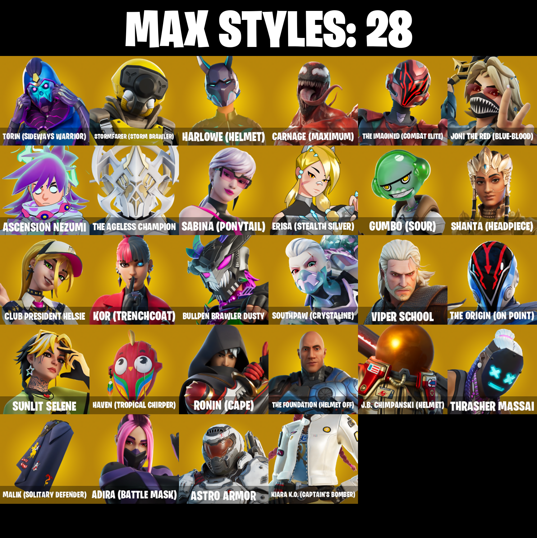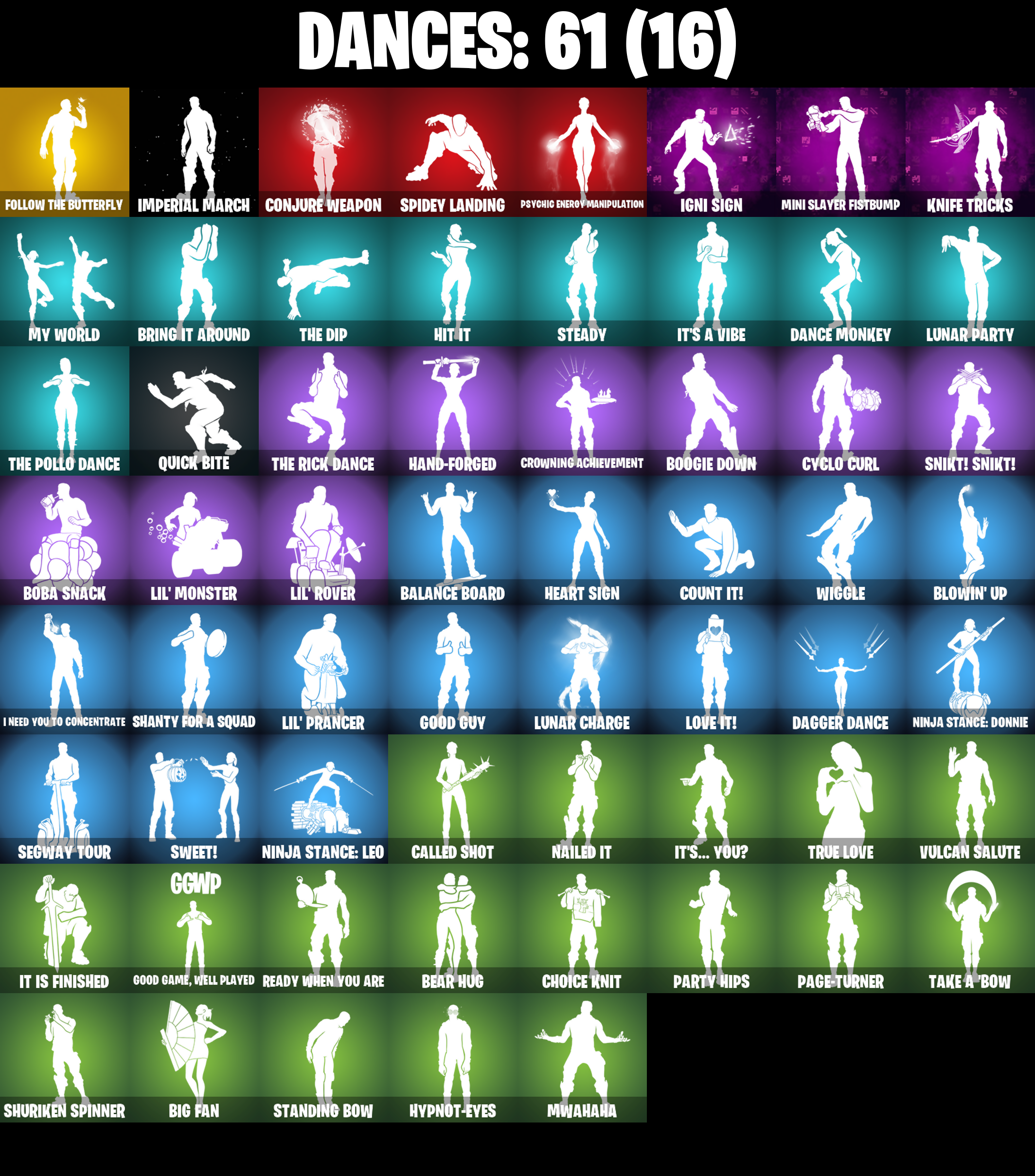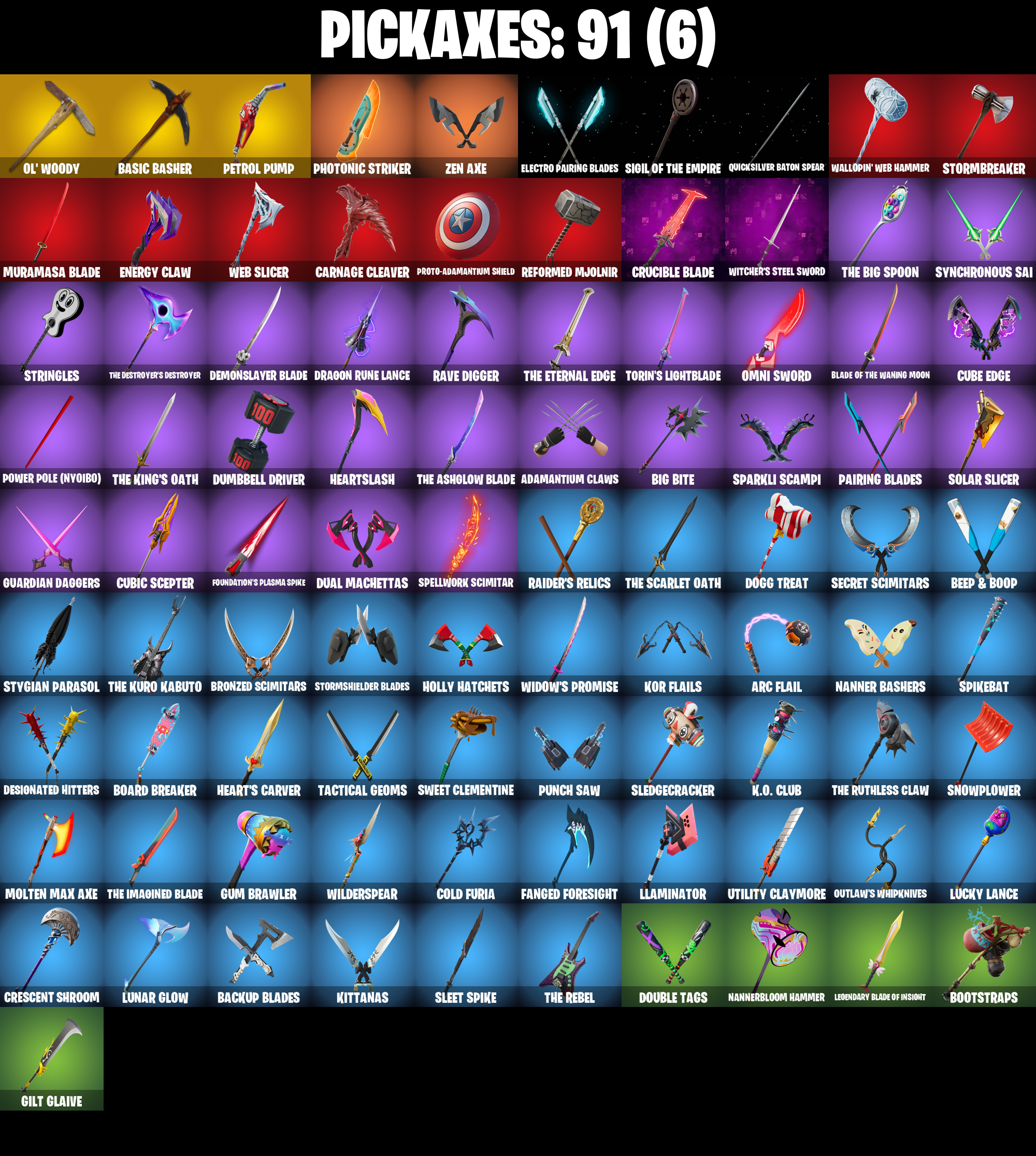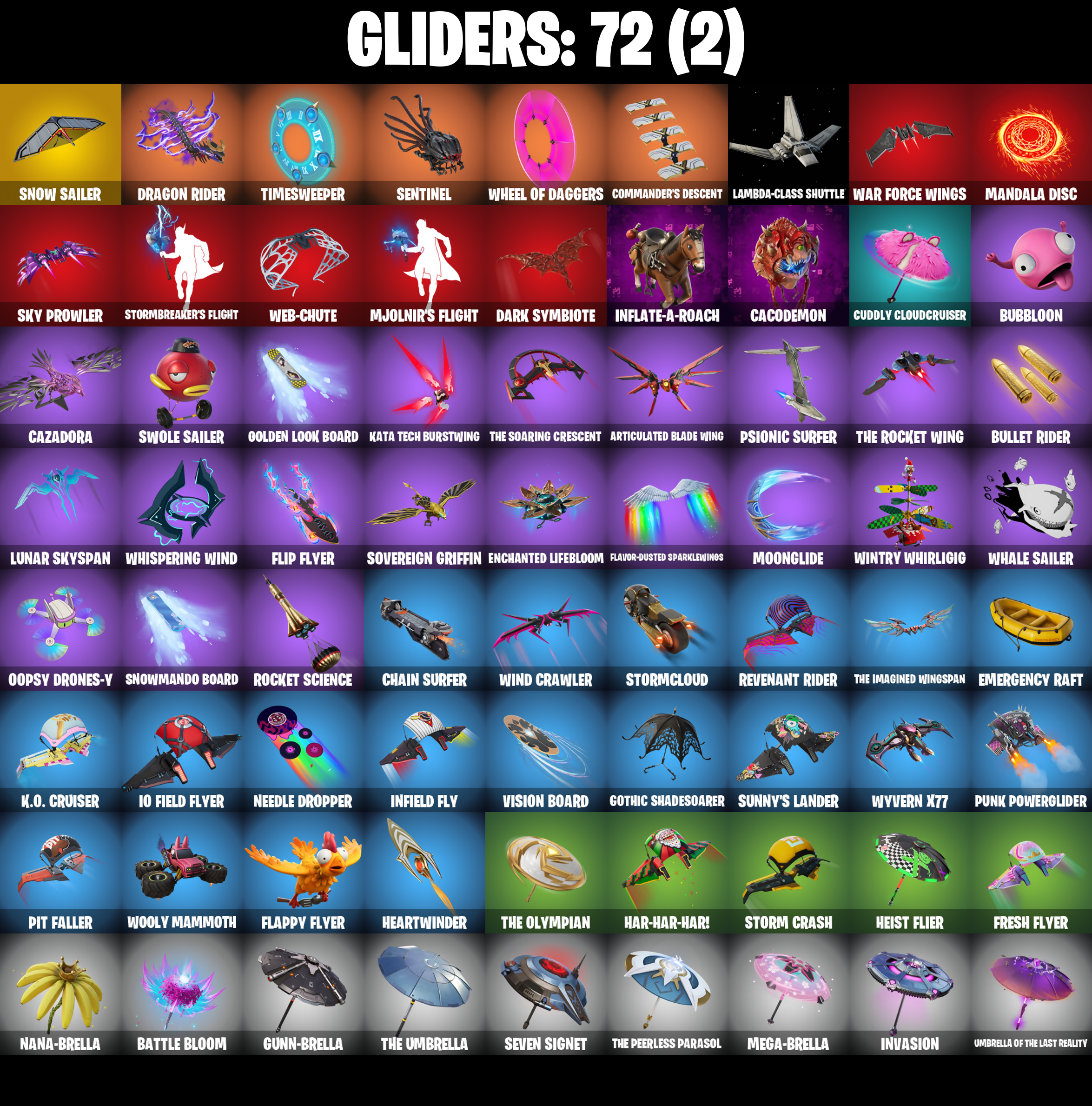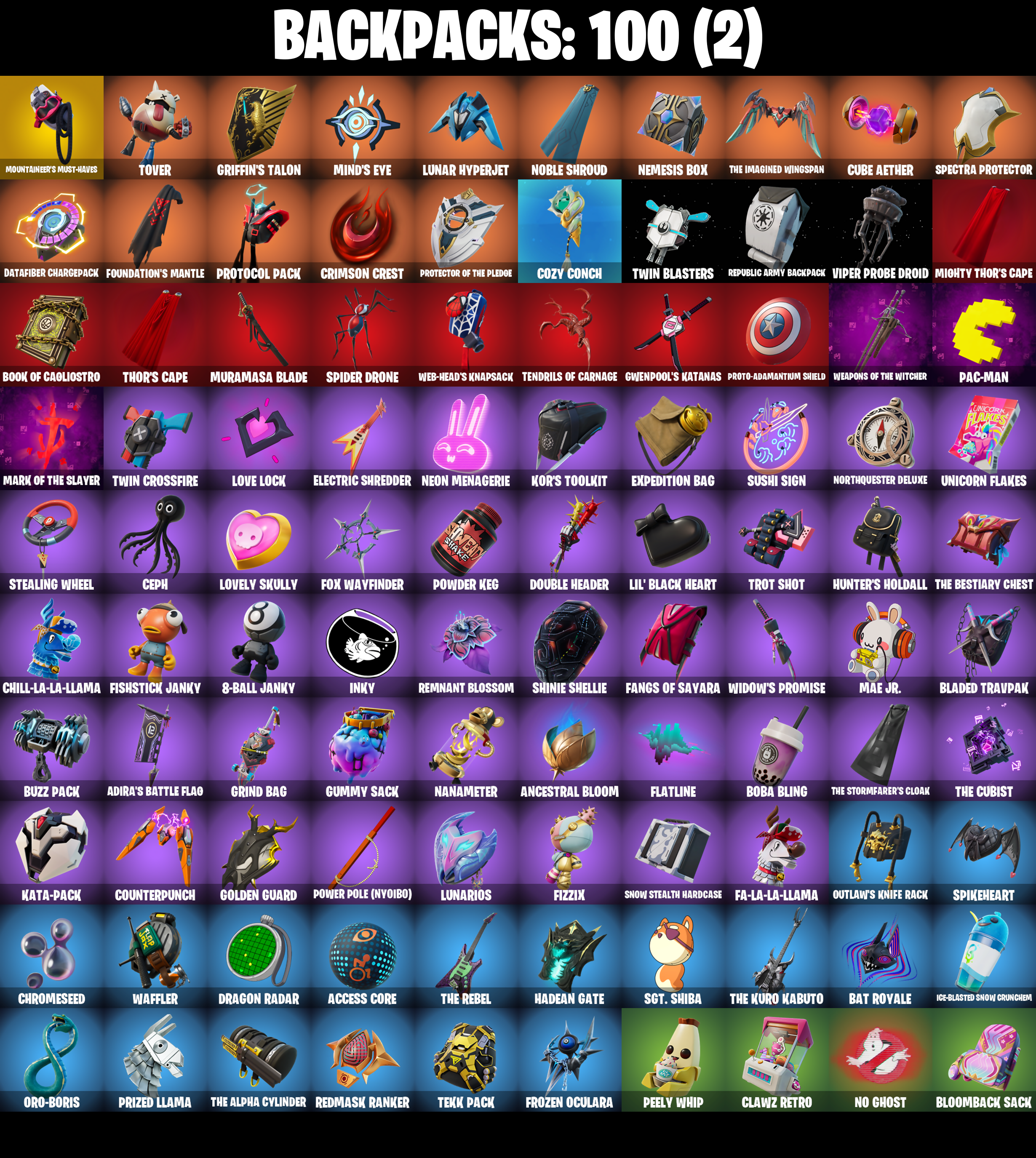 10 Field Flyer, 8-Ball Janky, Access Core, Adamantium Claws, Adira, Adira (Battle Mask), Adira's Battle Flag, Aftermath, Ancestral Bloom, Arc Flail, Arctic Adeline, Articulated Blade Wing, Ascension Nezumi, Astro Armor, Backup Blades, Balance Board, Basic Basher, Bat Royale, Battle Bloom, Bear Hug, Beep & Boop, Big Bite, Big Fan, Blade of the Waning Moon, Bladed Travpak, Blizzard Bomber, Bloomback Sack, Blowin' Up, Board Breaker, Boba Bling, Boba Snack, Boogie Down, Book of Caoliostro, Bootstraps, Bring It Around, Bronzed Scimitars, Bubbloon, Bullet Rider, Bullpen Brawler Dusty, Buzz Pack, Cacodemon, Called Shot, Captain America, Carnage, Carnage (Maximum), Carnage Cleaver, Cazadora, Ceph, Chain Surfer, Charlotte, Chill-La-La-Llama, Choice Knit, Chromeseed, Clawz Retro, Club President Helsie, Cold Furia, Commander's Descent, Conjure Weapon, Count It!, Counterpunch, Cozy Conch, Crescent Shroom, Crimson Crest, Crowning Achievement, Crucible Blade, Cube Aether, Cube Assassin, Cube Edge, Cubic Scepter, Cuddly Cloudcruiser, Cyclo Curl, Dagger Dance, Dance Monkey, Dark Symbiote, Darth Vader, Datafiber Chargepack, Demonslayer Blade, Designated Hitters, Doctor Strange, Dogg Treat, Doom Slayer, Double Header, Double Tags, Dragon Radar, Dragon Rider, Dragon Rune Lance, Dual Machettas, Dumbbell Driver, Dusty, Electric Shredder, Electro Pairing Blades, Emergency Raft, Enchanted Lifebloom, Energy Claw, Erisa, Erisa (Stealth Silver), Evie, Expedition Bag, Ezio Auditore, Fa-La-La-Llama, Fabio Sparklemane, Fanged Foresight, Fangs of Sayara, Fishstick Janky, Fizzix, Flappy Flyer, Flatline, Flavor-Dusted Sparklewings, Flip Flyer, Follow The Butterfly, Foundation's Mantle, Foundation's Plasma Spike, Fox Wayfinder, Fresh Flyer, Frozen Oculara, Geralt Of Rivia, Gildhart, Gilt Glaive, Golden Guard, Golden Look Board, Good Game, Well Played, Good Guy, Gothic Shadesoarer, Griffin's Talon, Grind Bag, Guardian Daggers, Gum Brawler, Gumbo, Gumbo (Sour), Gummy Sack, Gunn-Brella, Gunnar, Gwenpool's Katanas, Hadean Gate, Hand-Forged, Har-Har-Har!, Harley Quinn, Harlowe, Harlowe (Helmet), Haven, Haven (Tropical Chirper), Heart Sign, Heart's Carver, Heartslash, Heartwinder, Heist Flier, Helsie, Hit It, Holly Hatchets, Hunter's Holdall, Hypnot-Eyes, I Need You To Concentrate, Ice-Blasted Snow Crunchem, Igni Sign, Imperial March, Indiana Jones, Infield Fly, Inflate-A-Roach, Inky, Invasion, It Is Finished, It's A Vibe, It's... You?, J.B. Chimpanski, J.B. Chimpanski (Helmet), Joni The Red, Joni The Red (Blue-Blood), K.O. Club, K.O. Cruiser, Kata Tech Burstwing, Kata-Pack, Kiara K.O., Kiara K.O. (Captain's Bomber), Kittanas, Knife Tricks, Kor, Kor (Trenchcoat), Kor Flails, Kor's Toolkit, Krisabelle, Lambda-Class Shuttle, Legendary Blade of Insight, Lil' Black Heart, Lil' Monster, Lil' Prancer, Lil' Rover, Llaminator, Love It!, Love Lock, Lovely Skully, Lt. John Llama, Lucky Lance, Lumi Jellie, Lunar Charge, Lunar Glow, Lunar Hyperjet, Lunar Party, Lunar Skyspan, Lunarios, Mae Jr., Major Mancake, Malik, Malik (Solitary Defender), Mandala Disc, Mark of the Slayer, Massai, Mega-Brella, Mighty Thor, Mighty Thor's Cape, Min-Joon, Mina Park, Mind's Eye, Mini Slayer Fistbump, Mjolnir's Flight, Molten Max Axe, Moonglide, Mountaineer's Must-Haves, Muramasa Blade, Mwahaha, My World, Nailed It, Nana-Brella, Nanameter, Nanner Bashers, Nannerbloom Hammer, Needle Dropper, Nemesis Box, Neon Menagerie, Nezumi, Ninja Stance: Donnie, Ninja Stance: Leo, No Ghost, Noble Shroud, Northquester Deluxe, Ol' Woody, Omni Sword, Oopsy Drones-V, Oro-Boris, Outlaw's Knife Rack, Outlaw's Whipknives, Pac-Man, Page-Turner, Pairing Blades, Party Hips, Peely Whip, Petrol Pump, Phaedra, Photonic Striker, Pit Faller, Polar Peely, Powder Keg, Power Pole (Nyoibo), Prized Llama, Protector of the Pledge, Proto-Adamantium Shield, Protocol Pack, Prowler, Psionic Surfer, Psychic Energy Manipulation, Punch Saw, Punk Powerglider, Quick Bite, Quicksilver Baton Spear, Raider's Relics, Rave Digger, Ready When You Are, Redmask Ranker, Reformed Mjolnir, Remnant Blossom, Republic Army Backpack, Revenant Rider, Rocket Science, Ronin, Ronin (Cape), Sabina, Sabina (Ponytail), Sayara, Secret Scimitars, Segway Tour, Selene, Sentinel, Seven Signet, Sgt. Shiba, Shanta, Shanta (Headpiece), Shanty For A Squad, Shinie Shellie, Shuriken Spinner, Sigil of the Empire, Sky Prowler, Sled Ready Guff, Sledgecracker, Sleet Spike, Snap, Snikt! Snikt!, Snow Sailer, Snow Stealth Hardcase, Snow Stealth Slone, Snowmando Board, Snowplower, Solar Slicer, Son Goku, Southpaw, Southpaw (Crystalline), Sovereign Griffin, Sparkli Scampi, Spectra Protector, Spellwork Scimitar, Spider Drone, Spider-Man, Spider-Man Zero, Spidey Landing, Spikebat, Spikeheart, Standing Bow, Steady, Stealing Wheel, Storm Crash, Stormbreaker, Stormbreaker's Flight, Stormcloud, Stormfarer, Stormfarer (Storm Brawler), Stormshielder Blades, Stringles, Stygian Parasol, Sunlit Selene, Sunny's Lander, Sushi Sign, Sweet Clementine, Sweet!, Swole Sailer, Synchronous Sai, Tactical Geoms, Take A 'Bow, Tekki Pack, Tendrils of Carnage, The Ageless, The Ageless Champion, The Alpha Cylinder, The Ashglow Blade, The Bestiary Chest, The Big Spoon, The Cubist, The Destroyer's Destroyer, The Dip, The Eternal Edge, The Foundation, The Foundation (Helmet Off), The Imagined, The Imagined (Combat Elite), The Imagined Blade, The Imagined Wingspan, The King's Oath, The Kuro Kabuto, The Olympian, The Origin, The Origin (On Point), The Peerless Parasol, The Pollo Dance, The Rebel, The Rick Dance, The Rocket Wing, The Ruthless Claw, The Scarlet Oath, The Soaring Crescent, The Stormrafer's Cloak, The Umbrella, Thor Odinson, Thor's Cape, Thrasher Massai, Timesweeper, Tinseltoes, Toona Fish, Torin, Torin (Sideways Warrior), Torin's Lightblade, Tover, Tracy Trouble, Trot Shot, True Love, Tsuki 2.0, Twin Blasters, Twin Crossfire, Umbrella of the Last Reality, Underworld Desdemona, Unicorn Flakes, Utility Claymore, Viper Probe Droid, Viper School, Vision Board, 