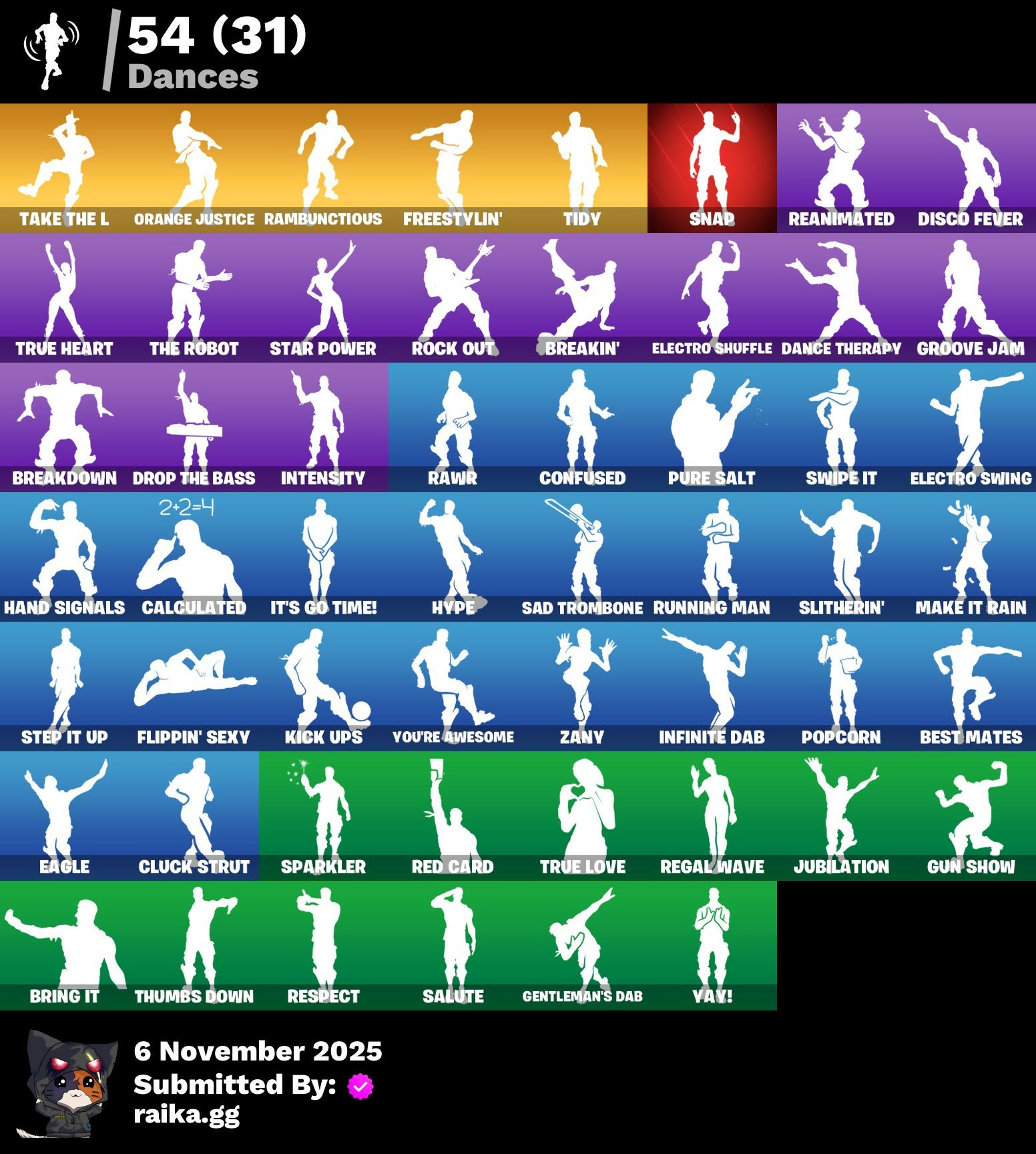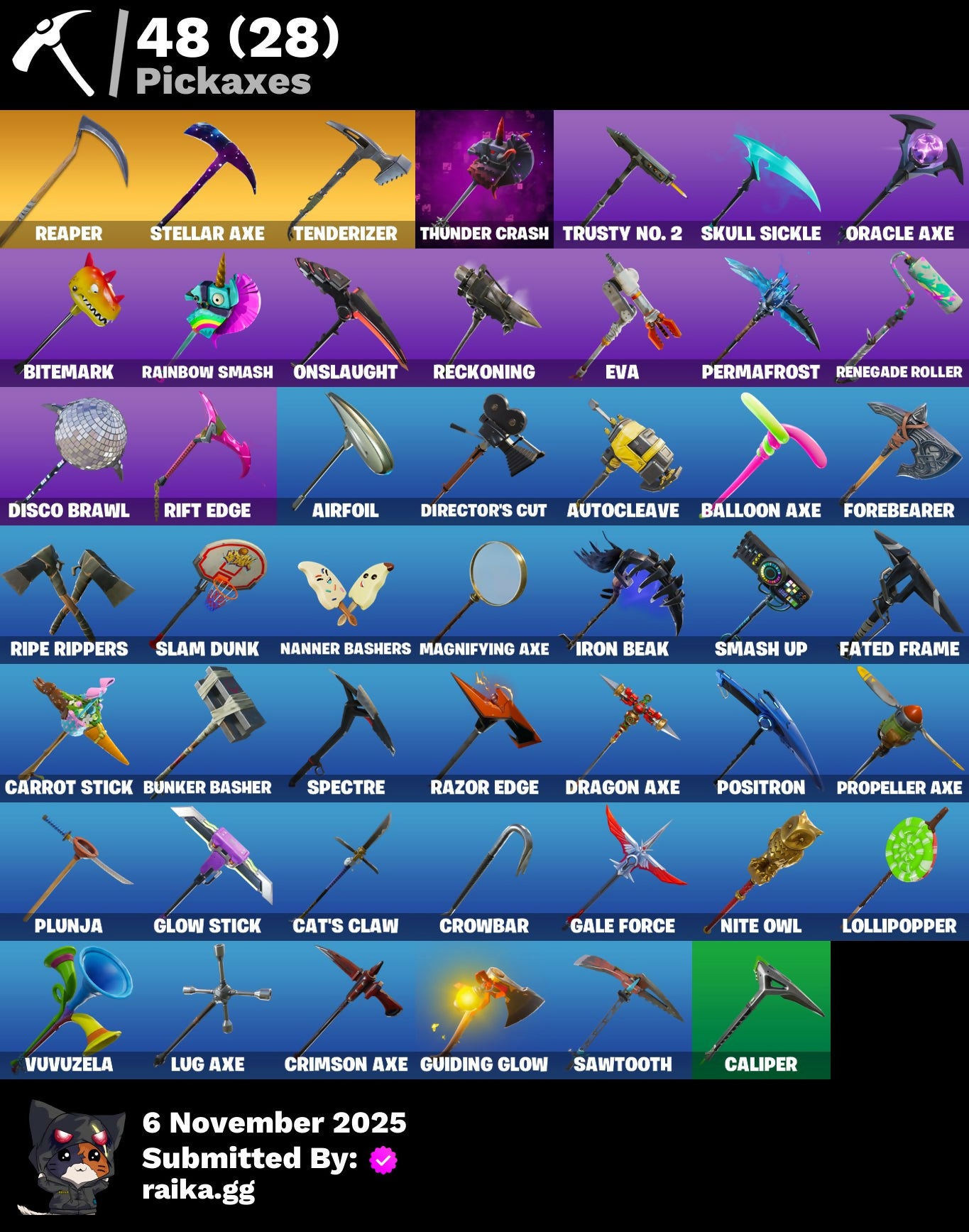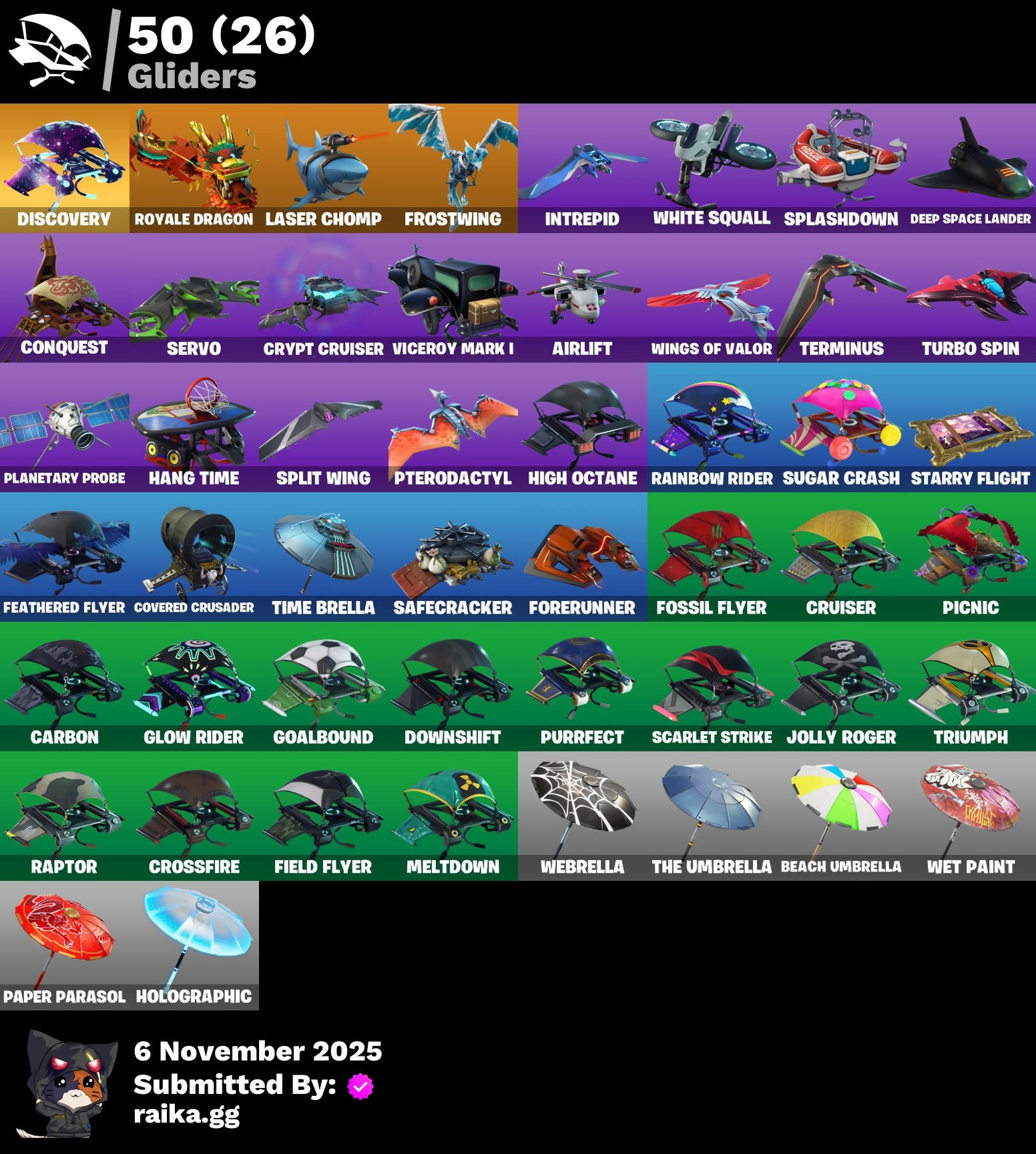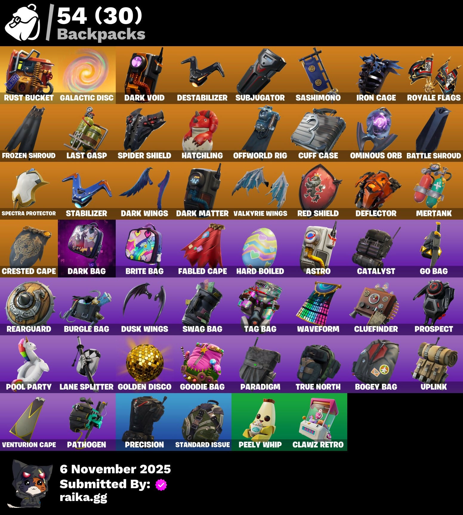 Abstrakt, Airfoil, Airlift, Archetype, Astro, Autocleave, Balloon Axe, Battle Hound, Battle Shroud, Battlehawk, Beach Umbrella, Best Mates, Bitemark, Bogey Bag, Breakdown, Breakin', Bring It, Brite Bag, Brite Gunner, Bunker Basher, Bunker Jonesy, Burgle Bag, Calamity, Calculated, Caliper, Carbide, Carbon, Carrot Stick, Cat's Claw, Catalyst, Clawz Retro, Cluck Strut, Cluefinder, Confused, Conquest, Covered Crusader, Crested Cape, Crimson Axe, Criterion, Crossfire, Crowbar, Cruiser, Crypt Cruiser, Cuff Case, DJ Yonder, Dance Therapy, Dark Bag, Dark Bomber, Dark Matter, Dark Vanguard, Dark Void, Dark Voyager, Dark Wings, Deep Space Lander, Deflector, Destabilizer, Director's Cut, Disco Brawl, Disco Fever, Discovery, Downshift, Dragon Axe, Drift, Drop The Bass, Dusk Wings, Eagle, Electro Shuffle, Electro Swing, Elite Agent, Enforcer, Eva, Fable, Fabled Cape, Fate, Fated Frame, Feathered Flyer, Field Flyer, Finesse Finisher, Flippin' Sexy, Forebearer, Forerunner, Fossil Flyer, Freestylin', Frostwing, Frozen Shroud, Funk Ops, Galactic Disc, Galaxy, Gale Force, Gentleman's Dab, Giddy-Up, Glow Rider, Glow Stick, Go Bag, Goalbound, Golden Disco, Goodie Bag, Groove Jam, Guiding Glow, Gun Show, Hand Signals, Hang Time, Hard Boiled, Hatchling, High Octane, Holographic, Huntress, Hype, Infinite Dab, Intensity, Intrepid, Iron Beak, Iron Cage, It's Go Time!, Jolly Roger, Jubilation, Kick Ups, Lane Splitter, Laser Chomp, Last Gasp, Lollipopper, Lug Axe, Magnifying Axe, Make It Rain, Meltdown, Mertank, Mission Specialist, Moisty Merman, Moonwalker, Musha, Nanner Bashers, Nite Owl, Nitelite, Noir, Oblivion, Offworld Rig, Omega (Stage 5), Omen, Ominous Orb, Onslaught, Oracle Axe, Orange Justice, Overtaker, Paper Parasol, Paradigm, Pathogen, Peely Whip, Permafrost, Picnic, Planetary Probe, Plunja, Pool Party, Popcorn, Positron, Precision, Propeller Axe, Prospect, Pterodactyl, Pure Salt, Purrfect, Rabbit Raider, Ragnarok, Rainbow Rider, Rainbow Smash, Rambunctious, Rapscallion, Raptor, Ravage, Raven, Rawr, Razor Edge, Reanimated, Reaper, Rearguard, Reckoning, Red Card, Red Knight, Red Shield, Redline, Regal Wave, Renegade Roller, Respect, Rift Edge, Ripe Rippers, Rock Out, Rogue Agent, Rook, Rox, Royale Dragon, Royale Flags, Running Man, Rust Bucket, Rust Lord, Sad Trombone, Safecracker, Salute, Sashimono, Sawtooth, Scarlet Strike, Sentinel, Servo, Shadow Ops, Skull Sickle, Skull Trooper, Sky Stalker, Slam Dunk, Sledgehammer, Slitherin', Smash Up, Snap, Sparkler, Spectra Protector, Spectre, Spider Knight, Spider Shield, Splashdown, Split Wing, Squad Leader, Stabilizer, Standard Issue, Star Power, Starry Flight, Stellar Axe, Step It Up, Subjugator, Sugar Crash, Sun Strider, Swag Bag, Swipe It, Tag Bag, Take The L, Teknique, Tenderizer, Terminus, The Ace, The Reaper, The Robot, The Umbrella, The Visitor, Thumbs Down, Thunder Crash, Tidy, Time Brella, Toxic Trooper, Trailblazer, Tricera Ops, Triple Threat, Triumph, True Heart, True Love, True North, Trusty No. 2, Turbo Spin, Uplink, Valkyrie, Valkyrie Wings, Valor, Vega, Venturion, Venturion Cape, Vertex, Viceroy Mark I, Vuvuzela, Waveform, Webrella, Wet Paint, White Squall, Wild Card, Wingman, Wings of Valor, Wukong, Yay!, You're Awesome, Zany, Zoey