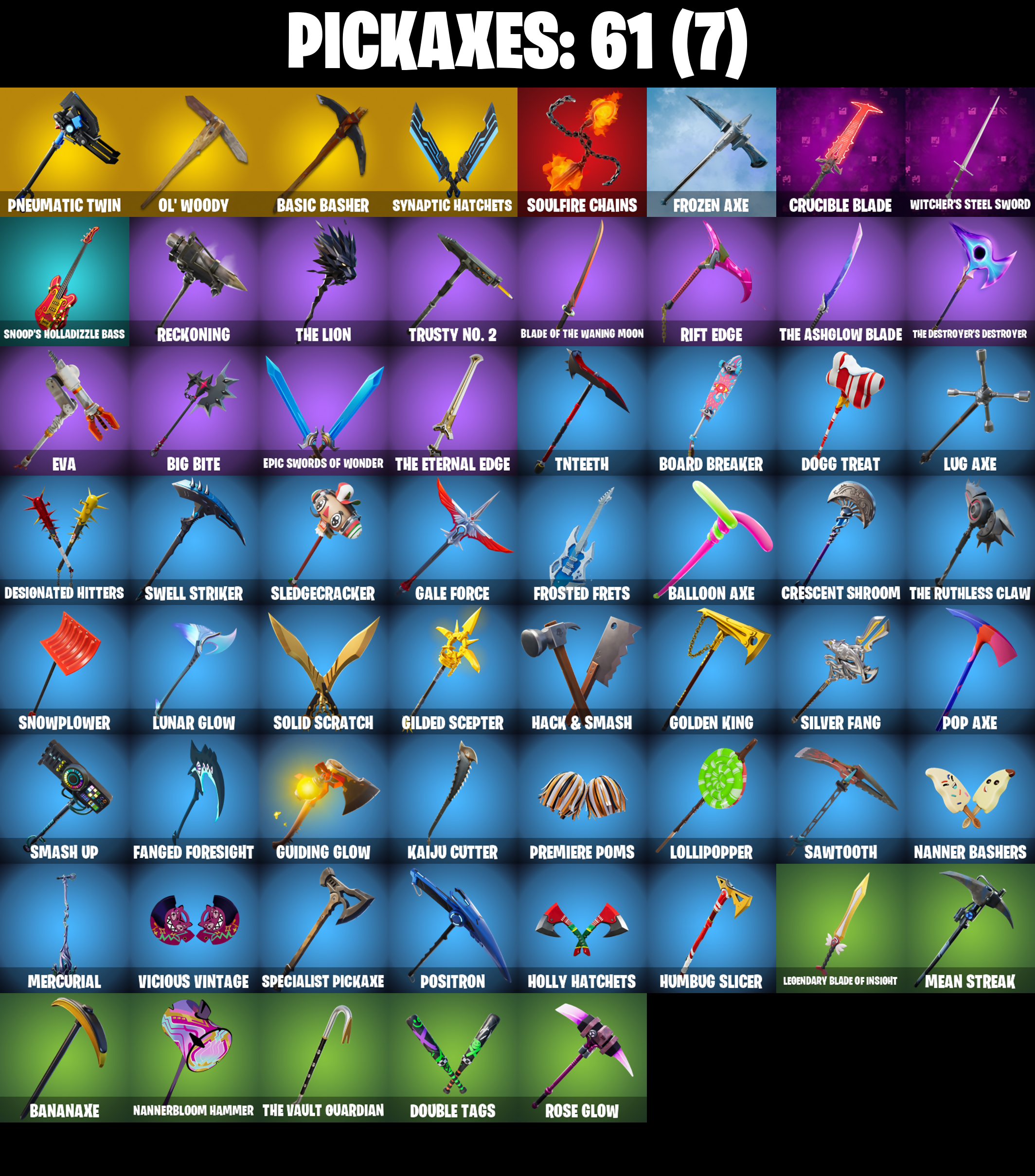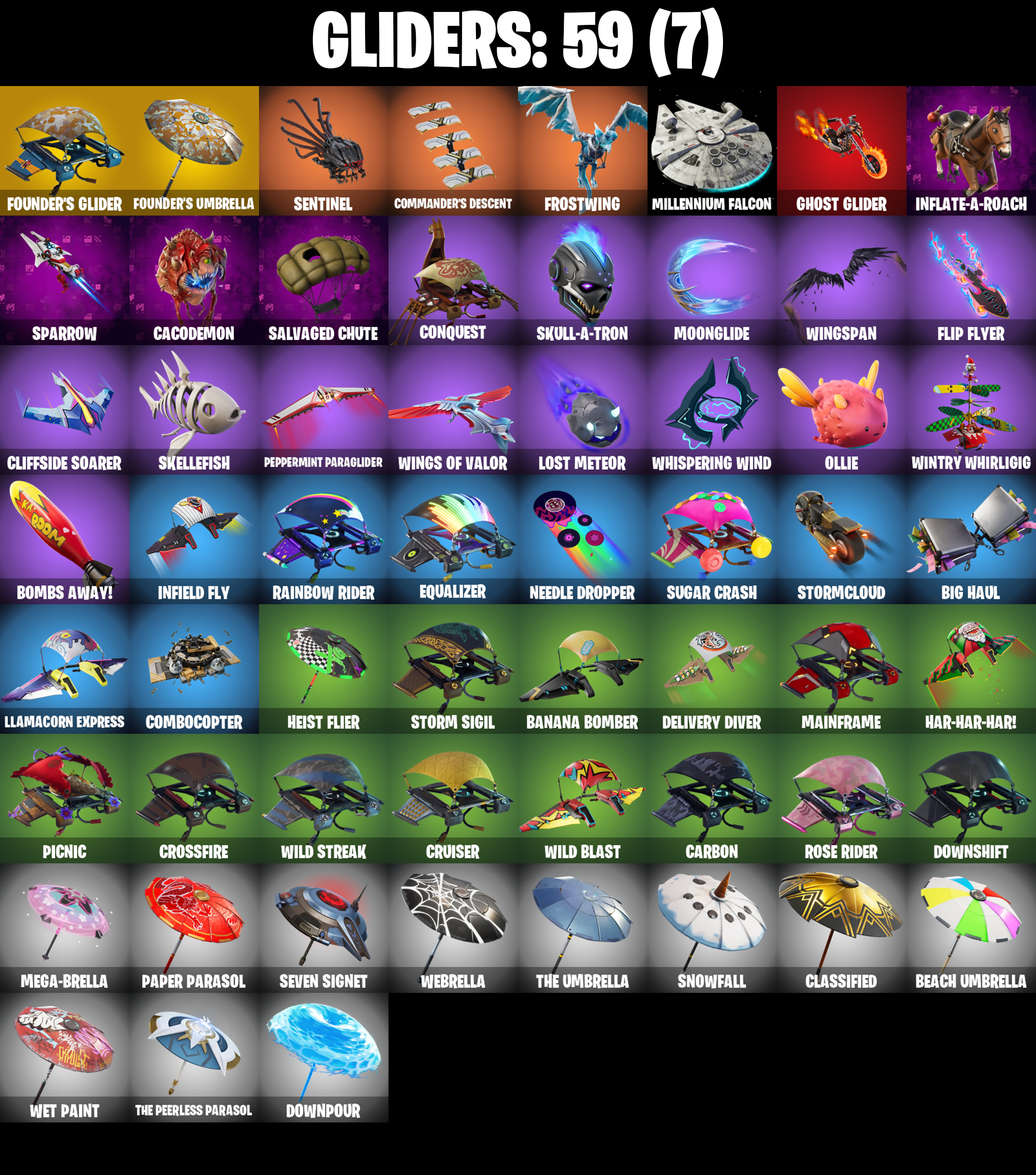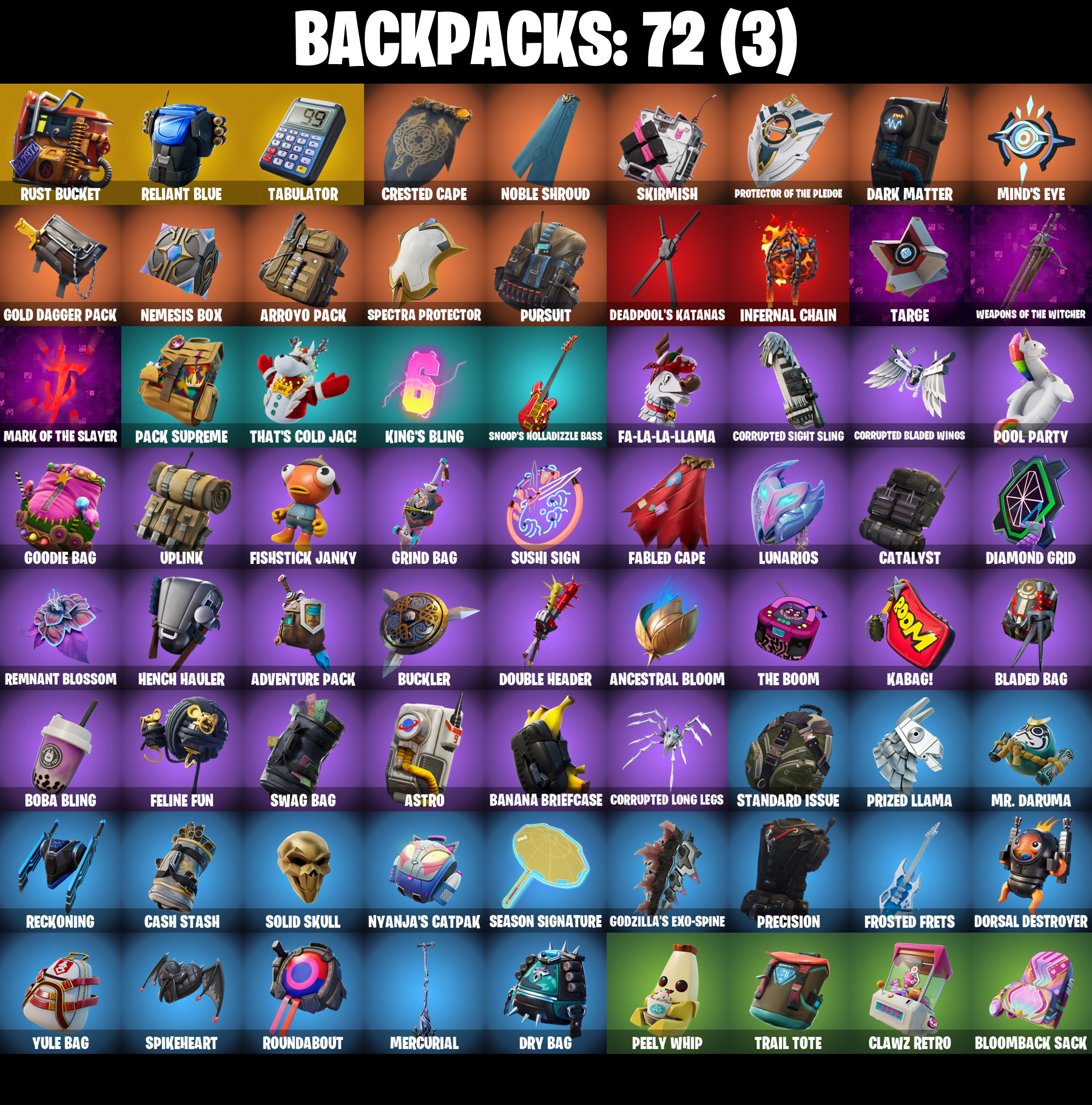 Adventure Pack, Agent Peely, Ancestral Bloom, Arctic Adeline, Arroyo Pack, Ascension Nezumi, Astro, Astro Armor, Balance Board, Baller, Balloon Axe, Banana Bomber, Banana Briefcase, Bananaxe, Basic Basher, Battle Hound, Battlehawk, Beach Umbrella, Beep Beep, Best Mates, Big Bite, Big Haul, Blade of the Waning Moon, Bladed Bag, Bloomback Sack, Board Breaker, Boba Bling, Boba Snack, Bombs Away!, Boogie Down, Brutus, Buckler, Bullpen Brawler Dusty, Cacodemon, Calamity, Calamity Stage 5, Call Me, Called Shot, Carbide, Carbon, Cash Stash, Catalyst, Chef's Special, Chicken, Choice Knit, Circuit Breaker, Classified, Clawz Retro, Clean Sweep, Cliffside Soarer, Club President Helsie, Coin Flip, Combocopter, Commander Zavala, Commander's Descent, Conquest, Contract Giller, Corrupted Arachne, Corrupted Bladed Wings, Corrupted Insight, Corrupted Long Legs, Corrupted Shogun, Corrupted Sight Sling, Crescent Shroom, Crested Cape, Crossfire, Crowning Achievement, Crucible Blade, Cruiser, DJ Yonder, Dance Off, Dark Matter, Dark Voyager, Deadpool, Deadpool Unmasked, Deadpool's Katanas, Delivery Diver, Designated Hitters, Diamond Grid, Dogg Treat, Doom Slayer, Dorsal Destroyer, Double Header, Double Tags, Downpour, Downshift, Dribblin', Drift, Drift Stage 5, Dry Bag, Dusty, Epic Swords of Wonder, Equalizer, Eva, Expressionism, Fa-La-La-Llama, Fabled Cape, Fanged Foresight, Fast Break, Fearless Flusher, Feline Fun, Fishstick Janky, Fixer, Flip Flyer, Flippin' Sexy, Founder's Glider, Founder's Umbrella, Fresh, Frosted Frets, Frostwing, Frozen Axe, Galaxian, Gale Force, Gear Specialist Maya, Gear Specialist Maya (Hat - Dark), Gentleman's Dab, Geralt Of Rivia, Ghost Glider, Ghost Rider, Giddy-Up, Gilded Scepter, Godzilla's Exo-Spine, Gold Blooded Ace, Gold Blooded Ace (Cold Blooded Ace), Gold Dagger Pack, Golden King, Golf Clap, Goodie Bag, Grind Bag, Guiding Glow, Hack & Smash, Har-Har-Har!, Heist Flier, Helsie, Hench Hauler, Highland Warrior, Holly Hatchets, Hootenanny, Humbug Slicer, Huntress, Hype, Hypnot-Eyes, I Need You To Concentrate, Igni Sign, Imani, Imperial Stormtrooper, Infernal Chain, Infield Fly, Inflate-a-Roach, Investigate, Iris, Kabag!, Kaiju Cutter, King's Bling, Krisabelle, Lebron James, Legendary Blade of Insight, Lil' Prancer, Liteshow, Llamacorn Express, Llion, Lollipopper, Lost Meteor, Lug Axe, Lunar Glow, Lunar Party, Lunarios, Mainframe, Make It Rain, Mark of the Slayer, Massai, Mean Streak, Mega-Brella, Meowscles, Mercurial, Midas, Millennium Falcon, Mina Park, Mind's Eye, Mini Slayer Fistbump, Mission Specialist, Moonglide, Moonwalker, Mr. Daruma, Mystica, Nanner Bashers, Nannerbloom Hammer, Needle Dropper, Nemesis Box, Nezumi, Noble Shroud, Nyanja's Catpak, Ol' Woody, Ollie, Orange Justice, Pack Supreme, Pandemonium, Paper Parasol, Pass Rush Ranger, Patch Patroller, Paws & Claws, Peely Whip, Peppermint Paraglider, Picnic, Pneumatic Twin, Polar Peely, Pool Party, Pop Axe, Popcorn, Positron, Precision, Premiere Poms, Prized Llama, Prodigy, Protector of the Pledge, Pursuit, Rainbow Rider, Reckoning, Red Card, Red Strike, Redline, Regal Wave, Reliant Blue, Remnant Blossom, Renzo The Destroyer, Respect, Respect The Peace, Ride The Pony, Rift Edge, Rock Out, Rogue Agent, Rose Glow, Rose Rider, Rose Team Leader, Roundabout, Rust Bucket, Rust Lord, Salute, Salvaged Chute, Sawtooth, Season Signature, Selene, Sentinel, Seven Signet, Side Hustle, Silver Fang, Skellefish, Skirmish, Skull-A-Tron, Skye, Sled Ready Guff, Sledgecracker, Smash Up, Snoop's Holladizzle Bass, Snowfall, Snowplower, Solid Scratch, Solid Skull, Soulfire Chains, Sparrow, Specialist Pickaxe, Spectra Protector, Spikeheart, Springy, Standard Issue, Storm Sigil, Stormcloud, Sugar Crash, Sunlit Selene, Sushi Sign, Swag Bag, Swag Shot, Sweet Shot, Swell Striker, Synaptic Hatchets, Tabulator, Take The Elf, Take The L, Targe, Teknique, That's Cold Jac!, The Ace, The Ageless, The Ageless Champion, The Ashglow Blade, The Boom, The Destroyer's Destroyer, The Eternal Edge, The Lion, The Peerless Parasol, The Ruthless Claw, The Silencer, The Umbrella, The Vault Guardian, Thrasher Massai, Thunder, Tnteeth, Tntina, Trail Tote, Trilogy, Trusty No. 2, Tune Squad Lebron, Uplink, Vicious Vintage, Viper School, Warpaint, Wave, Wavebreaker, Weapons of the Witcher, Webrella, Wet Paint, Whispering Wind, Wild Blast, Wild Streak, Wings Of Valor, Wingspan, Wintry Whirligig, Witcher's Steel Sword, Wu-Tang Is Forever, You're Awesome, Yule Bag, Yulejacket, Zoey