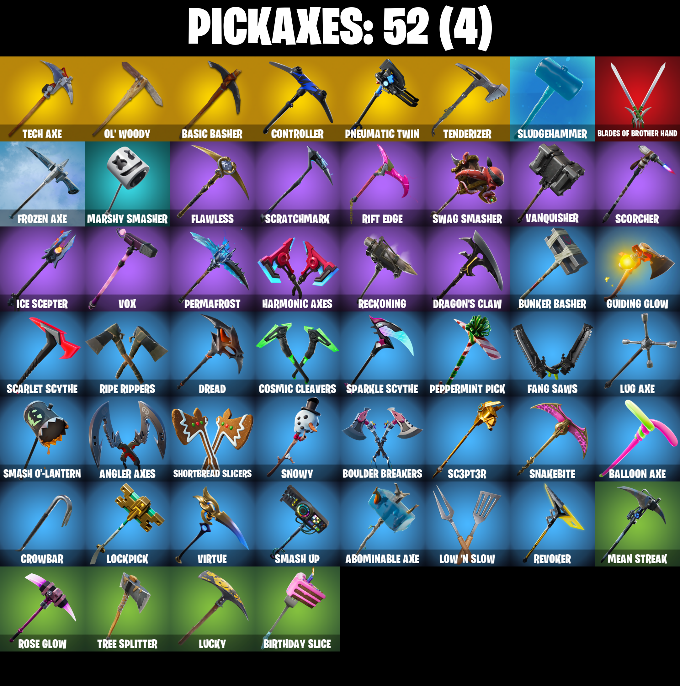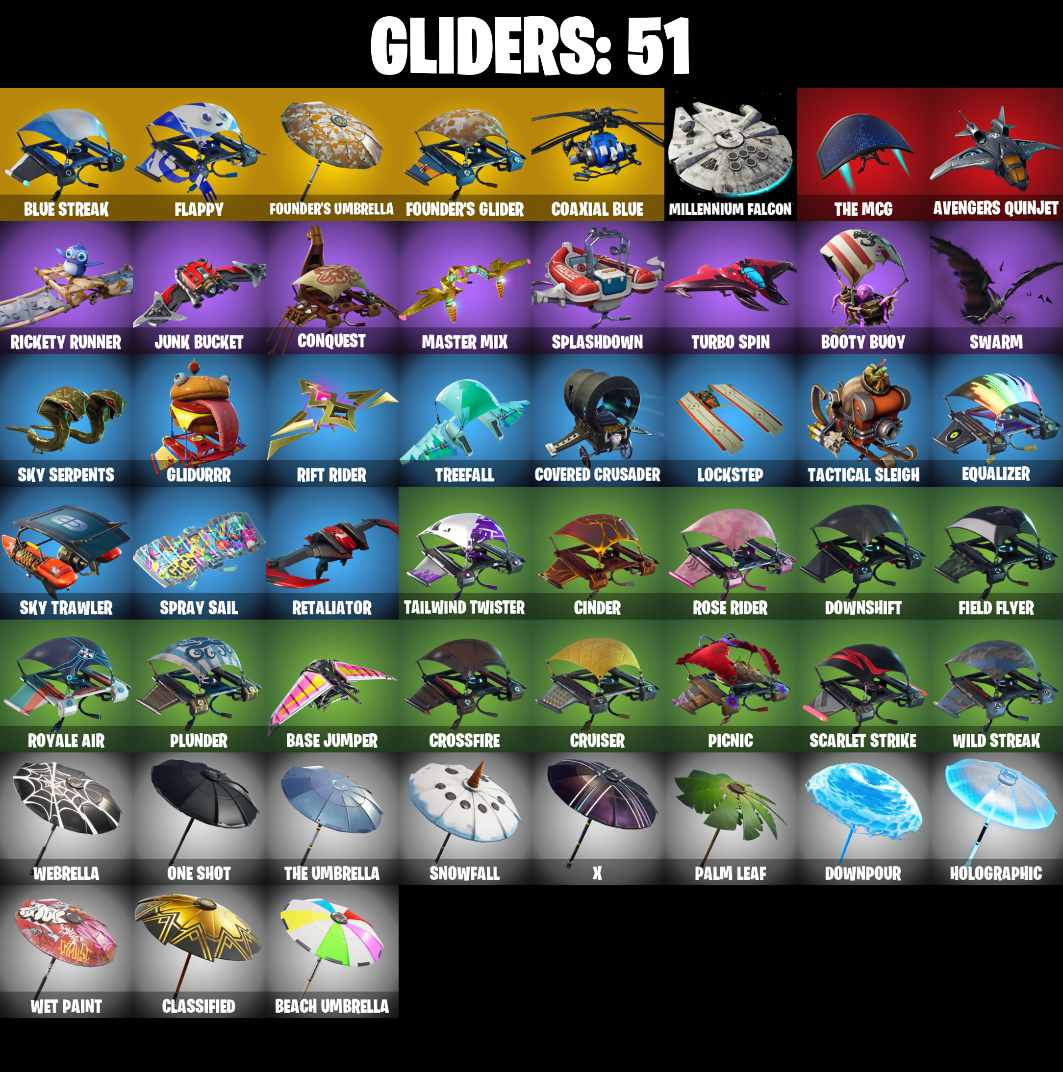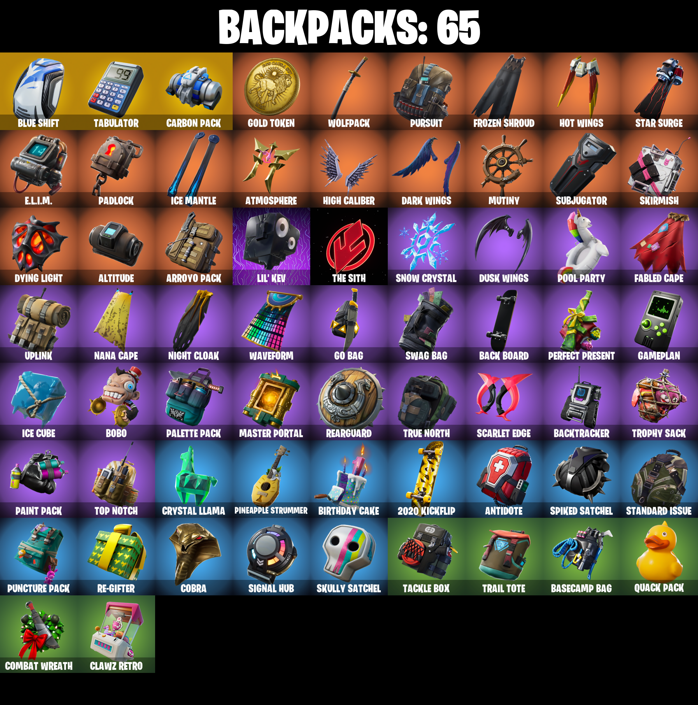 2020 Kickflip, A.I.M., Abominable Axe, Altitude, Angler Axes, Antidote, Arroyo Pack, Atmosphere, Avengers Quinjet, Back Board, Backtracker, Balloon Axe, Base Jumper, Basecamp Bag, Basic Basher, Beach Umbrella, Birthday Cake, Birthday Slice, Black Werewolf, Blackheart, Blackheart (Stage 8), Blades Of Brother Hand, Blowing Bubbles, Blue Shift, Blue Streak, Blue Striker, Blue Team Leader, Bobo, Booty Buoy, Boulder Breakers, Breakdown, Bunker Basher, Bunker Jonesy, Bunnymoon, Calamity, Calamity Stage 5, Calculated, Call Me, Carbon Commando, Carbon Pack, Cat Flip, Catalyst, Cinder, Classified, Clawz Retro, Cluck Strut, Coaxial Blue, Cobra, Combat Wreath, Commando, Conga, Conquest, Controller, Cosmic Cleavers, Covered Crusader, Crossfire, Crowbar, Cruiser, Crystal Llama, Dabstand, Dark Wings, Deep End, Demi, Demogorgon, Dire, Dj Yonder, Downpour, Downshift, Dragon Stance, Dragon's Claw, Dread, Drift, Drift Stage 5, Droop, Dusk, Dusk Wings, Dying Light, E.L.I.M., Eagle, Ember, Enforcer, Equalizer, Fable, Fabled Cape, Fang Saws, Field Flyer, Fierce, Flamenco, Flappy, Flawless, Founder's Glider, Founder's Umbrella, Free Flow, Freestylin', Frozen Axe, Frozen Shroud, Gameplan, Gentleman's Dab, Get Funky, Giddy-Up, Glidurrr, Go Bag, Gold Token, Golf Clap, Ground Pound, Guiding Glow, Harmonic Axes, Hello Friend, High Caliber, High Five, Holographic, Hoop Master, Hot Marat, Hot Wings, Howl, Huntress, Hybrid, Hybrid (Stage 4), Ice Cube, Ice King (Gold), Ice Mantle, Ice Scepter, It's Go Time!, Jaywalking, Journey Vs Hazard, Jump Jets, Junk Bucket, Keep It Mello, Laguna, Lil' Kev, Lockpick, Lockstep, Low 'N Slow, Lt. Evergreen, Lucky, Lug Axe, Luxe, Luxe (Gold Clothing), Lynx, Lynx (Stage 4 - No Ponytail), Marshmello, Marshy Smasher, Master Key, Master Key (Masked), Master Mix, Master Portal, Mayhem, Mean Streak, Mic Drop, Millennium Falcon, Mutiny, Nana Cape, Nana Nana, Night Cloak, Nightshade, Ol' Woody, One Shot, Onesie, Onesie (Winter), Padlock, Paint Pack, Palette Pack, Palm Leaf, Peace Out, Peely, Peppermint Pick, Perfect Present, Permafrost, Picnic, Pineapple Strummer, Plunder, Pneumatic Twin, Point It Out, Pool Party, Powder, Powder (White), Prodigy, Puncture Pack, Pursuit, Quack Pack, Ragnarok, Ragnarok (No Shoulder Pad), Ravage, Re-gifter, Rearguard, Reckoning, Redline, Regal Wave, Remedy Vs Toxin, Respect The Peace, Retaliator, Revoker, Rickety Runner, Ride The Pony, Rift Edge, Rift Rider, Ripe Rippers, Rippley Vs Sludge, Rocket Spinner, Rook, Rose Glow, Rose Rider, Rose Team Leader, Rox, Rox (Stage 5), Royale Air, Ruin, Running Man, SC3PT3R, Sad Trombone, Scarlet Defender, Scarlet Edge, Scarlet Scythe, Scarlet Strike, Scorcher, Scratchmark, Sentinel, Sgt. Winter, Sgt. Winter Headgear, Shimmer, Shortbread Slicers, Sidewinder, Sidewinder (Dark), Sign Spinner, Signal Hub, Singularity, Skirmish, Skully, Skully (Heart), Skully Satchel, Sky Serpents, Sky Trawler, Sledgehammer, Slitherin', Slow Clap, Sludgehammer, Smash O'-Lantern, Smash Up, Smooth Moves, Snakebite, Snoozefest, Snow Crystal, Snowfall, Snowshaker, Snowy, Sparkle Scythe, Spiked Satchel, Splashdown, Spray Sail, Stage 4, Standard Issue, Star Surge, Stratus, Stride, Subjugator, Summit Striker, Sun Strider, Swag Bag, Swag Smasher, Swarm, Swipe It, Tabulator, Tackle Box, Tactical Sleigh, Tailwind Twister, Take The Elf, Tech Axe, Tenderizer, The Ace, The Ice King, The McG, The Prisoner, The Sith, The Umbrella, Tilted Teknique, Tilted Teknique (Hoodie), Top Notch, Tra La La, Trail Tote, Trailblazer, Tree Splitter, Treefall, Trog, Trog (Tribal), Trophy Sack, True Love, True North, Turbo Spin, Turk Vs Riptide, Uplink, Vanquisher, Vega, Vega (Teal), Virtue, Vox, Warpaint, Waterworks, Waveform, Wavy T, Waypoint, Webrella, Welcome!, Wet Paint, Wild Streak, Wilde, Wolfpack, Wooly Warrior, X, X-Lord, X-Lord (Scavenger), Yay!, Yond3r, You're Awesome, Zany, Zenith, Zenith (Stage 4)